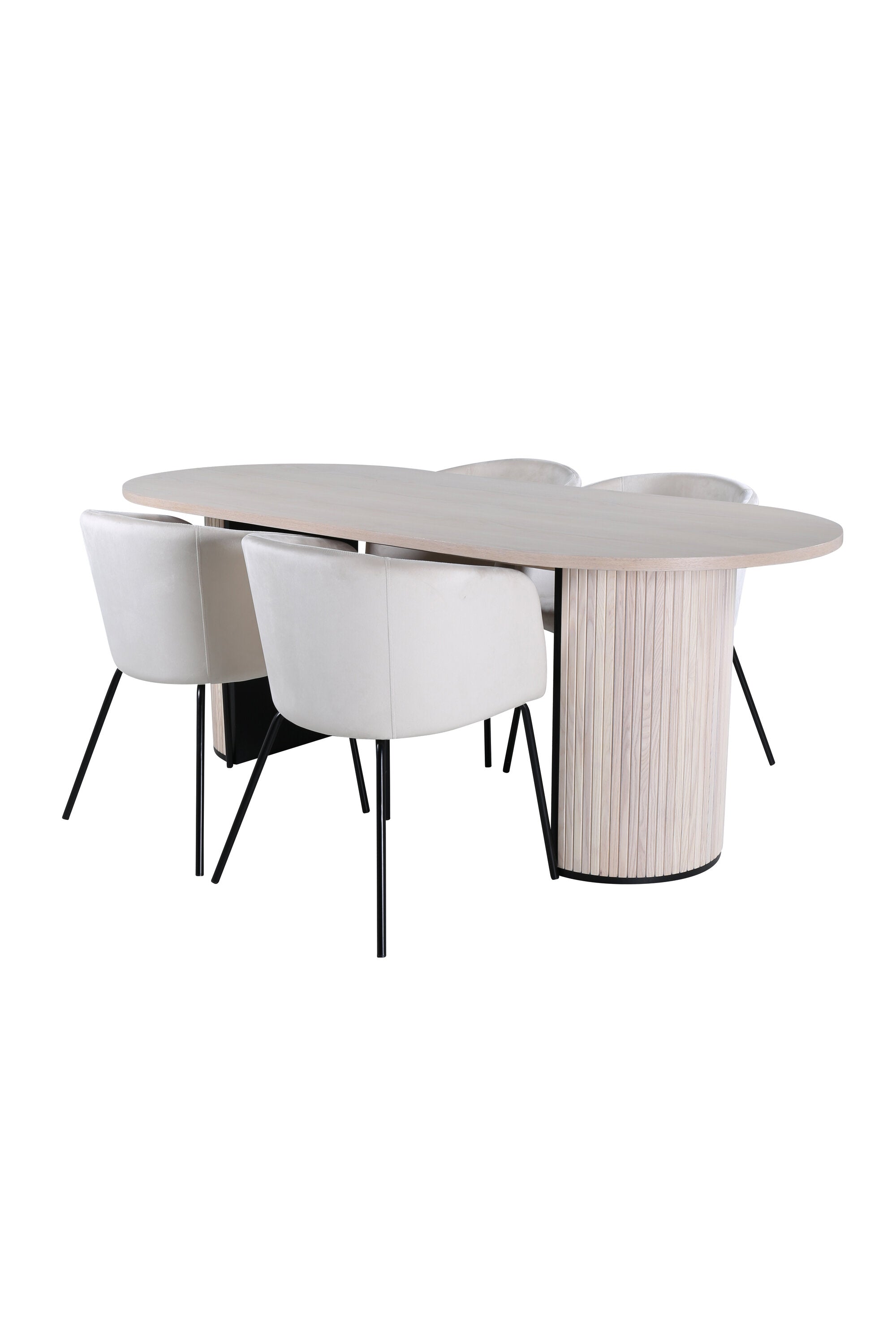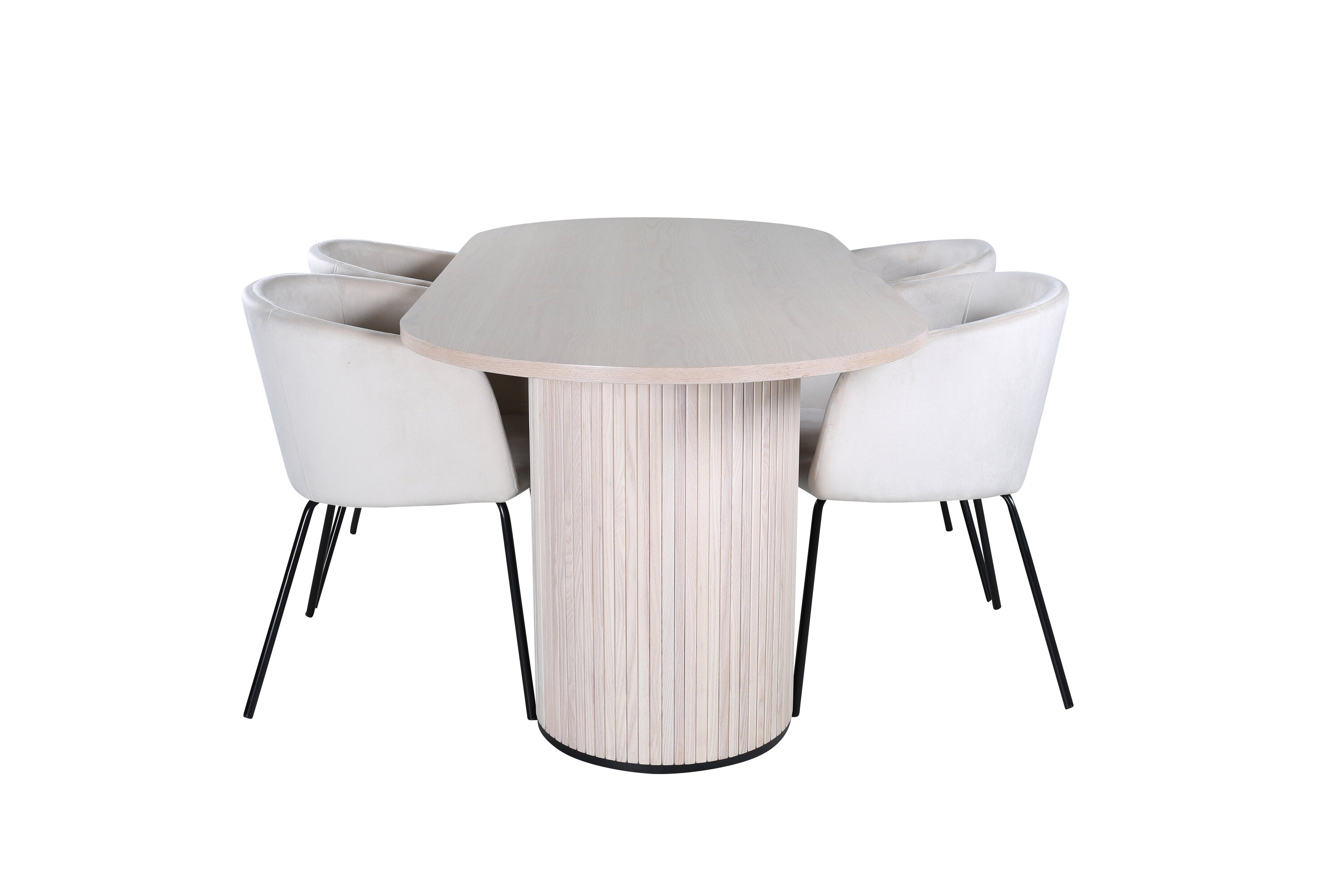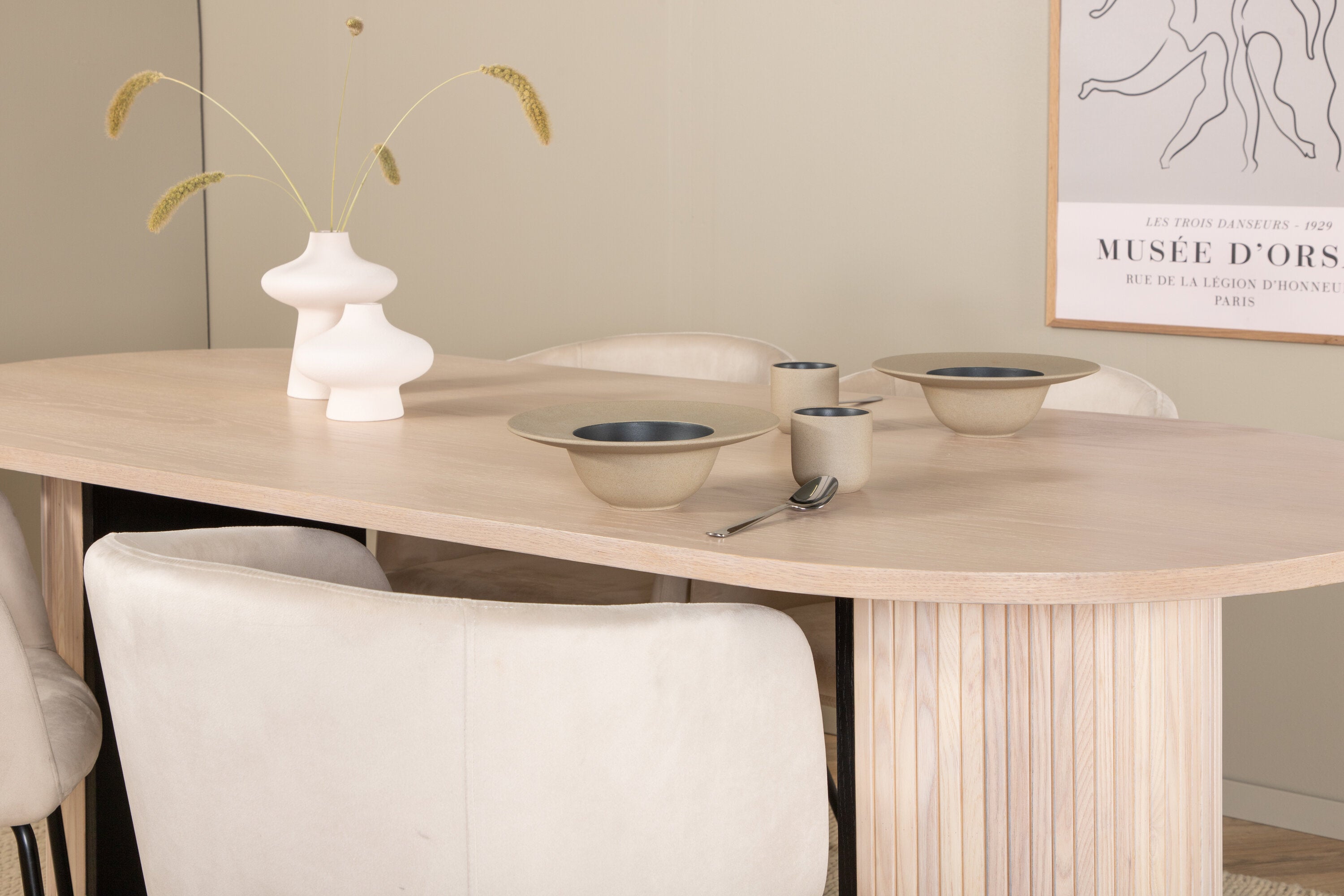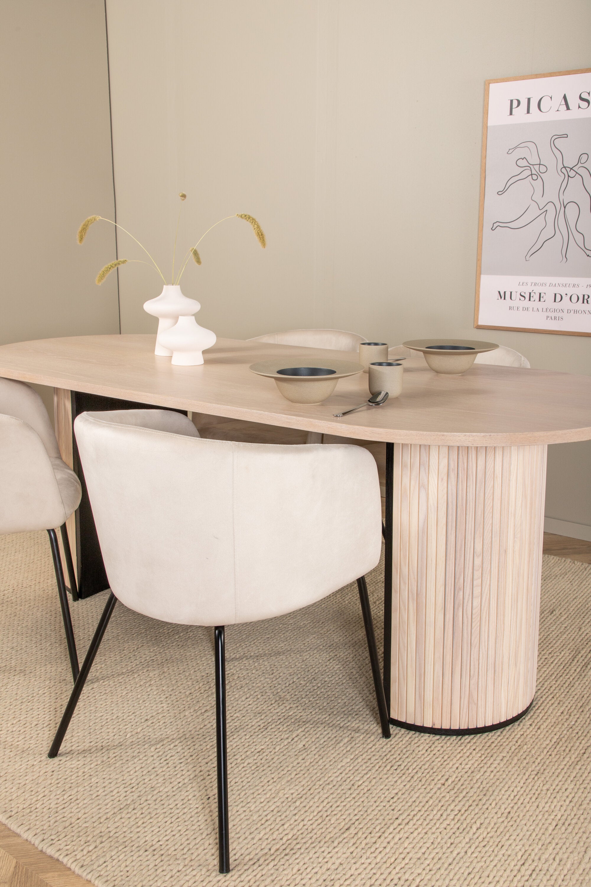 Bianca vytváří stylový poutač, který zaujme! Tento oválný jídelní stůl v omítnuté bílé barvě má ​​moderní design se stolní deskou z kostěné bílé MDF s dýhou a robustním rámem ze dřeva a MDF v žebrovaném provedení, který působí stabilním dojmem. Rozměry stolu: Délka: 200 cm, Šířka: 90 cm, Výška: 75 cm. V kombinaci se 4 našimi stylovými jídelními židlemi Berit v příjemném designu. Židle se zaměřují na pohodlí s měkkým sedákem z béžové sametové látky a stylovými úzkými nohami židle z černého železa. Rozměry židle: výška: 78 cm, výška sedáku: 49 cm, šířka: 55 cm, hloubka: 55 cm