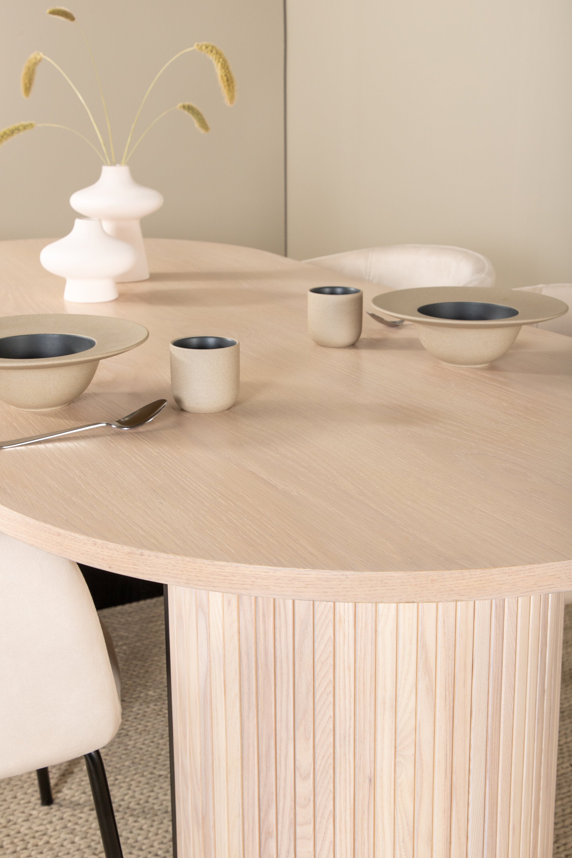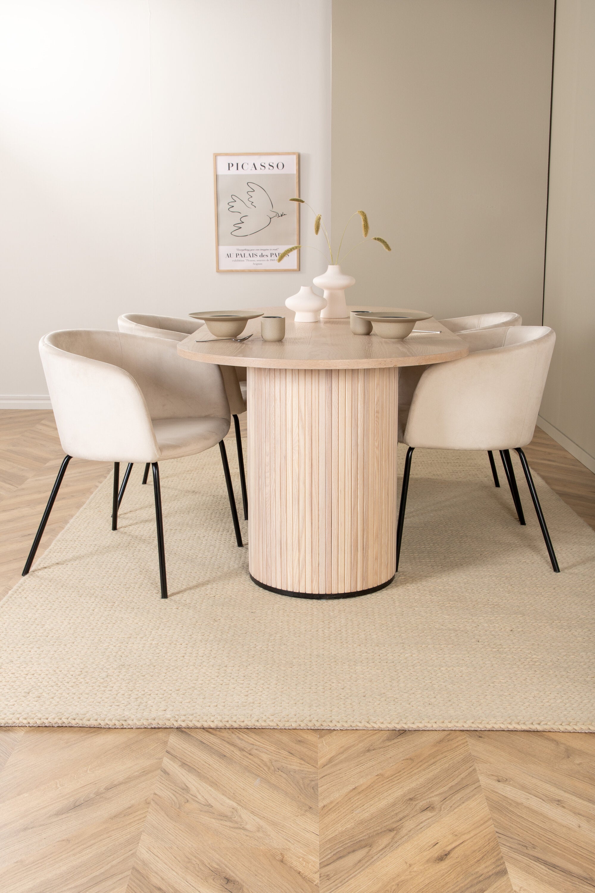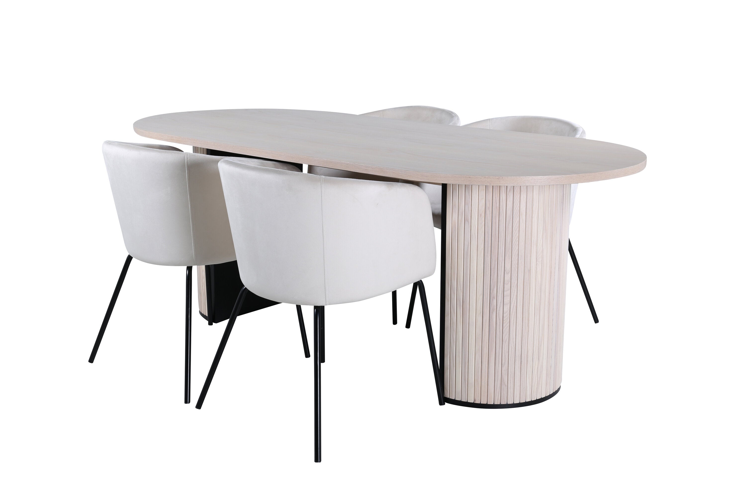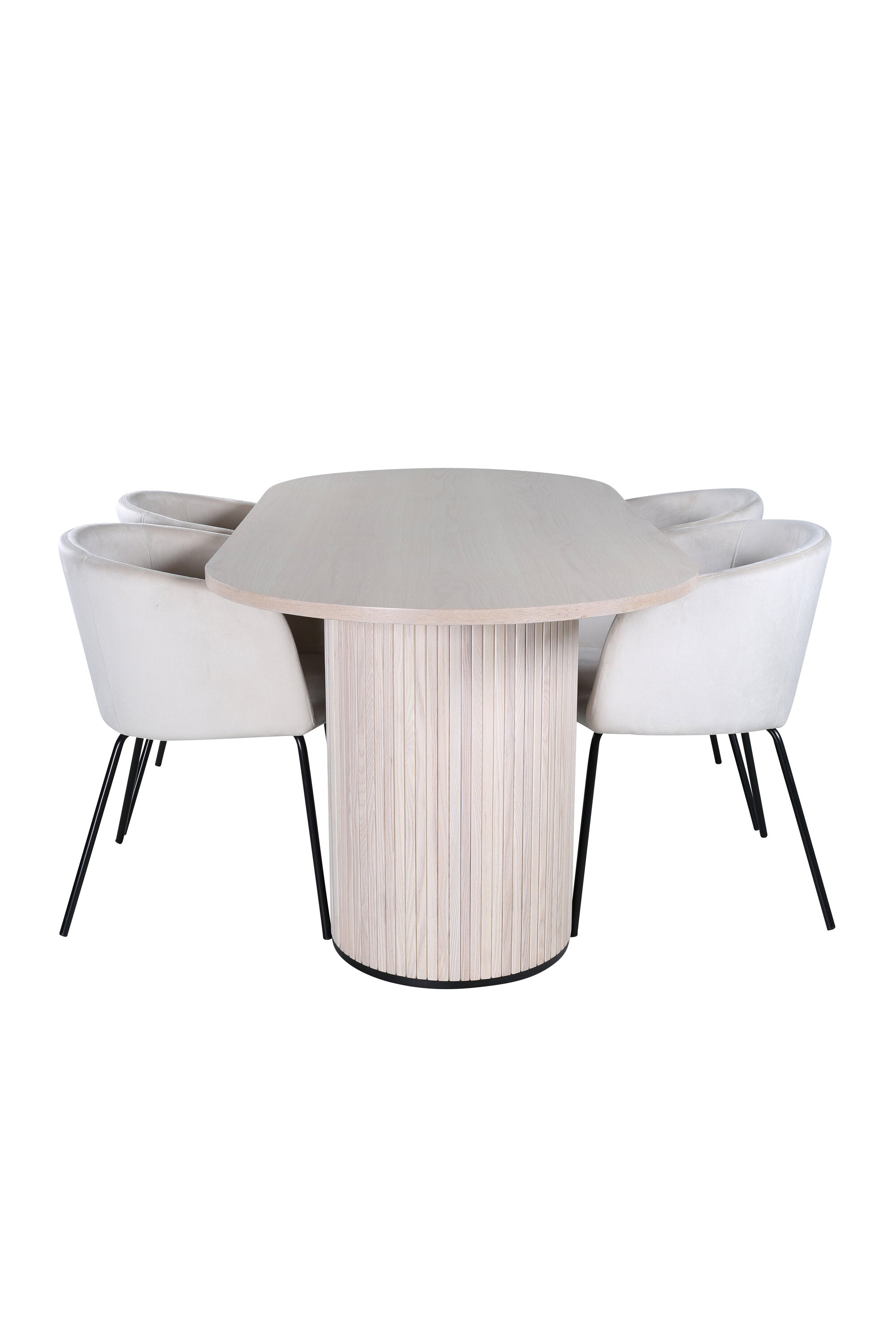 Bianca vytváří stylový poutač, který zaujme! Tento oválný jídelní stůl v omítnuté bílé barvě má ​​moderní design se stolní deskou z kostěné bílé MDF s dýhou a robustním rámem ze dřeva a MDF v žebrovaném provedení, který působí stabilním dojmem. Rozměry stolu: Délka: 200 cm, Šířka: 90 cm, Výška: 75 cm. V kombinaci se 4 našimi stylovými jídelními židlemi Berit v příjemném designu. Židle se zaměřují na pohodlí s měkkým sedákem z béžové sametové látky a stylovými úzkými nohami židle z černého železa. Rozměry židle: výška: 78 cm, výška sedáku: 49 cm, šířka: 55 cm, hloubka: 55 cm