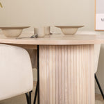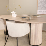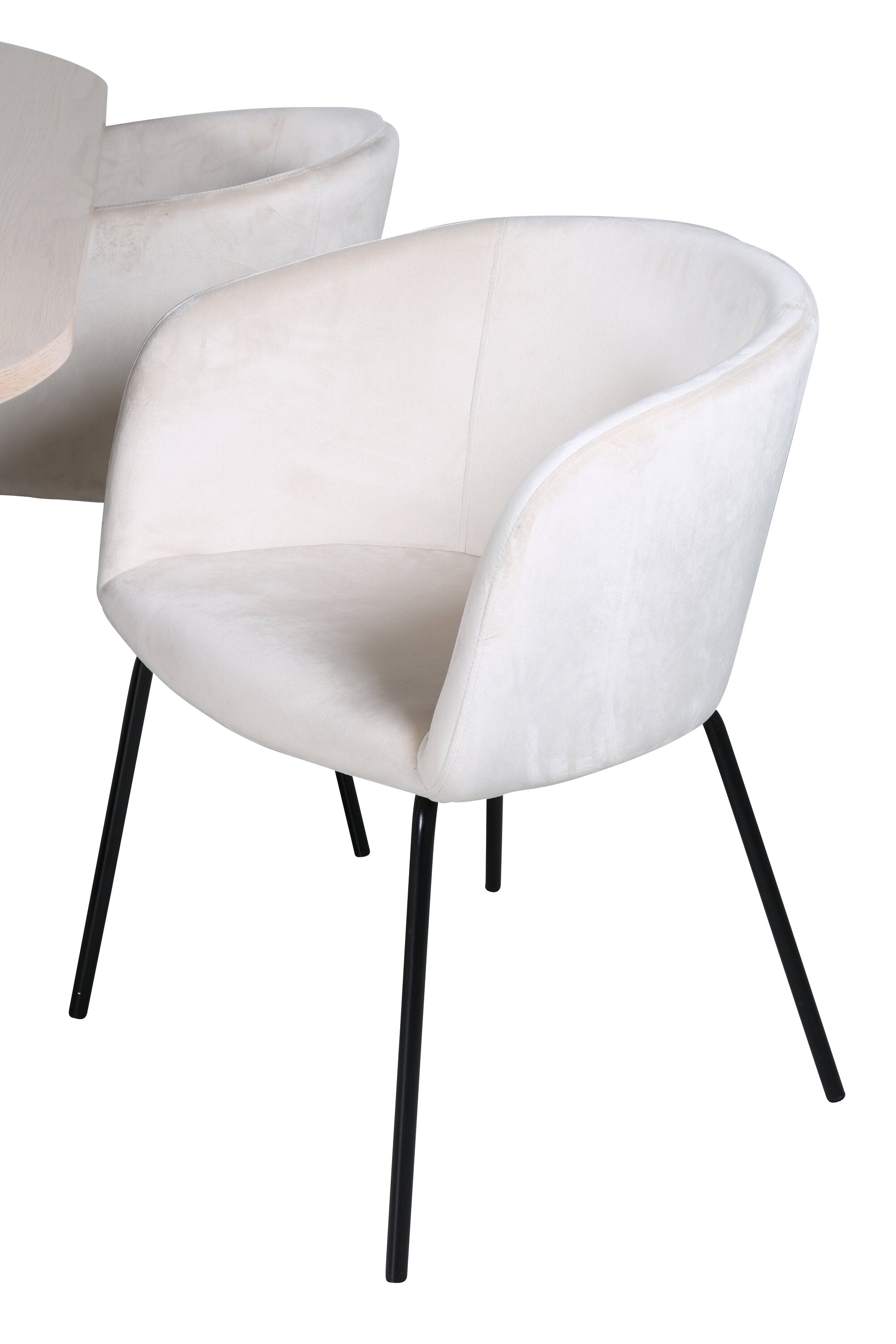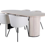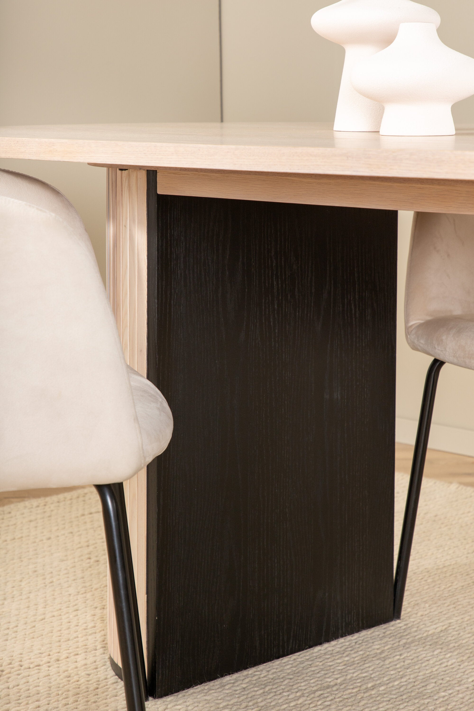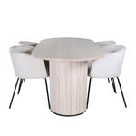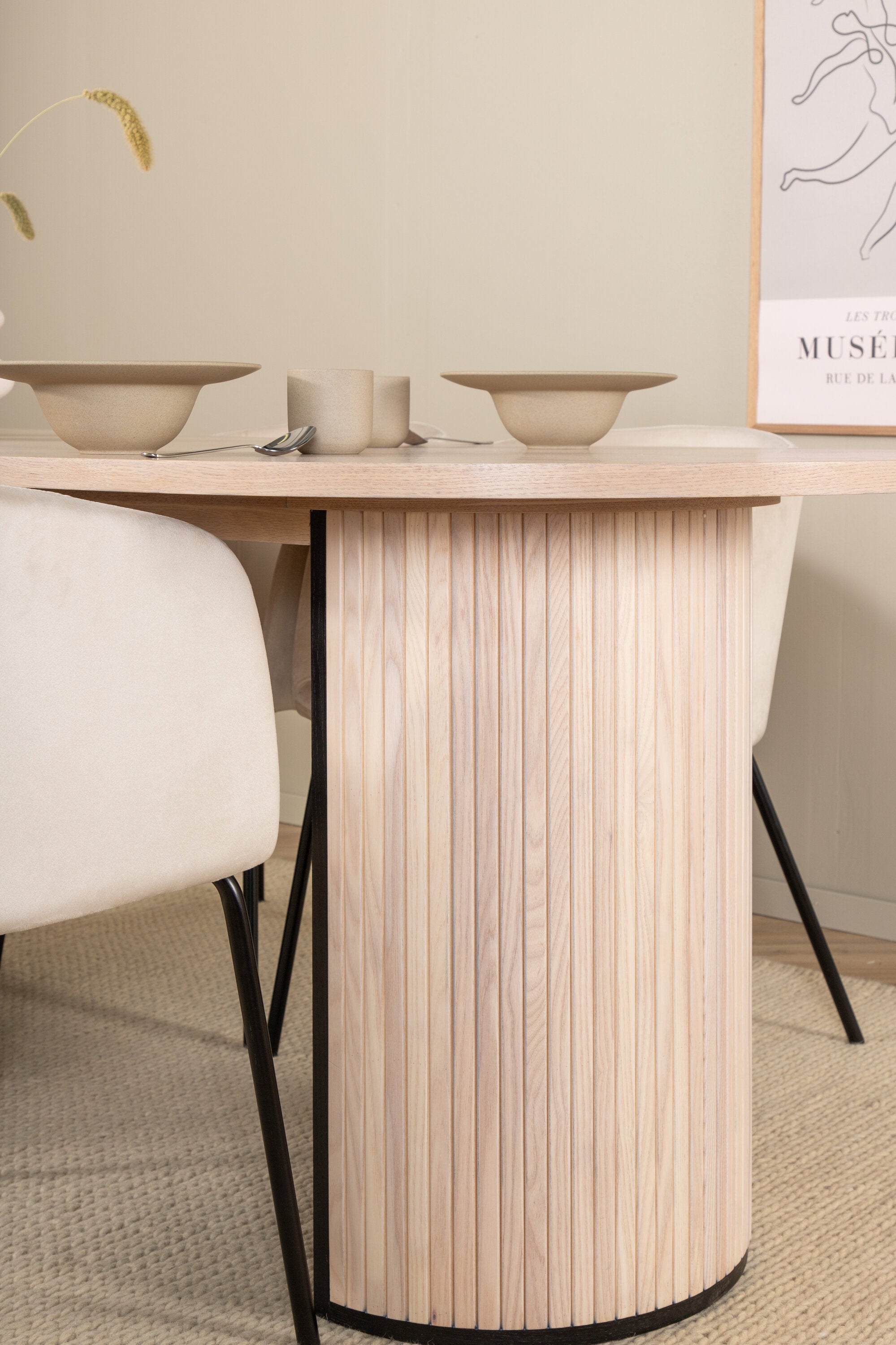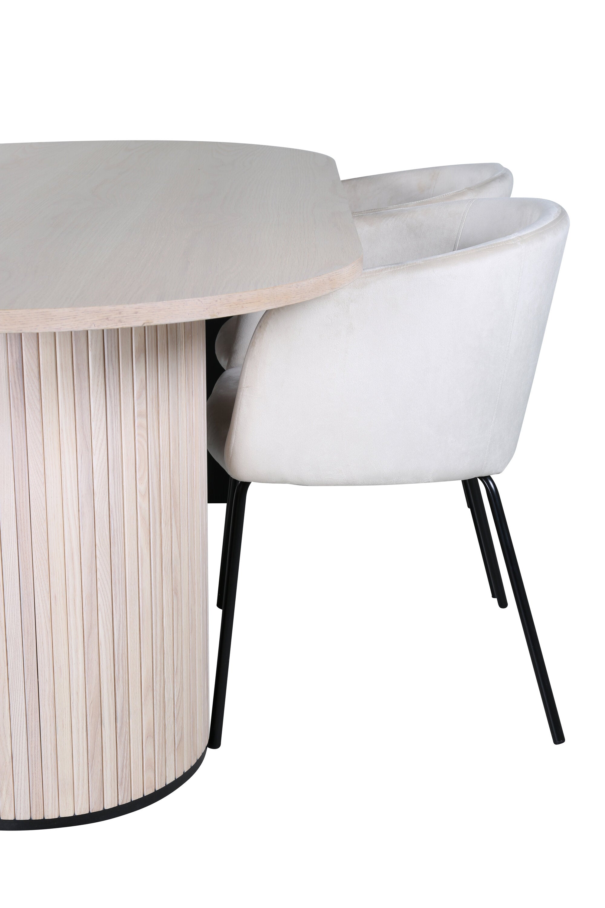 Bianca vytváří stylový poutač, který zaujme! Tento oválný jídelní stůl v omítnuté bílé barvě má ​​moderní design se stolní deskou z kostěné bílé MDF s dýhou a robustním rámem ze dřeva a MDF v žebrovaném provedení, který působí stabilním dojmem. Rozměry stolu: Délka: 200 cm, Šířka: 90 cm, Výška: 75 cm. V kombinaci se 4 našimi stylovými jídelními židlemi Berit v příjemném designu. Židle se zaměřují na pohodlí s měkkým sedákem z béžové sametové látky a stylovými úzkými nohami židle z černého železa. Rozměry židle: výška: 78 cm, výška sedáku: 49 cm, šířka: 55 cm, hloubka: 55 cm