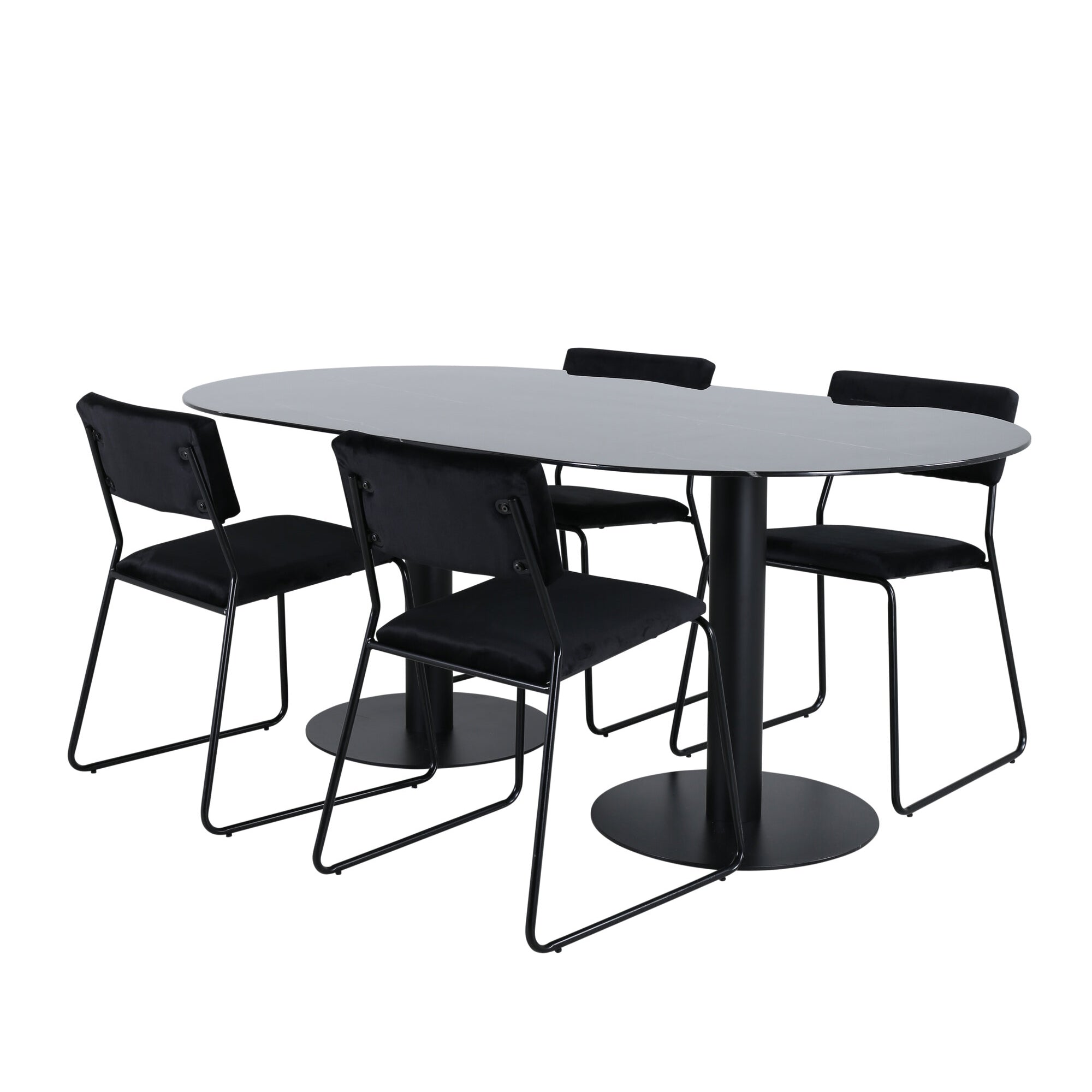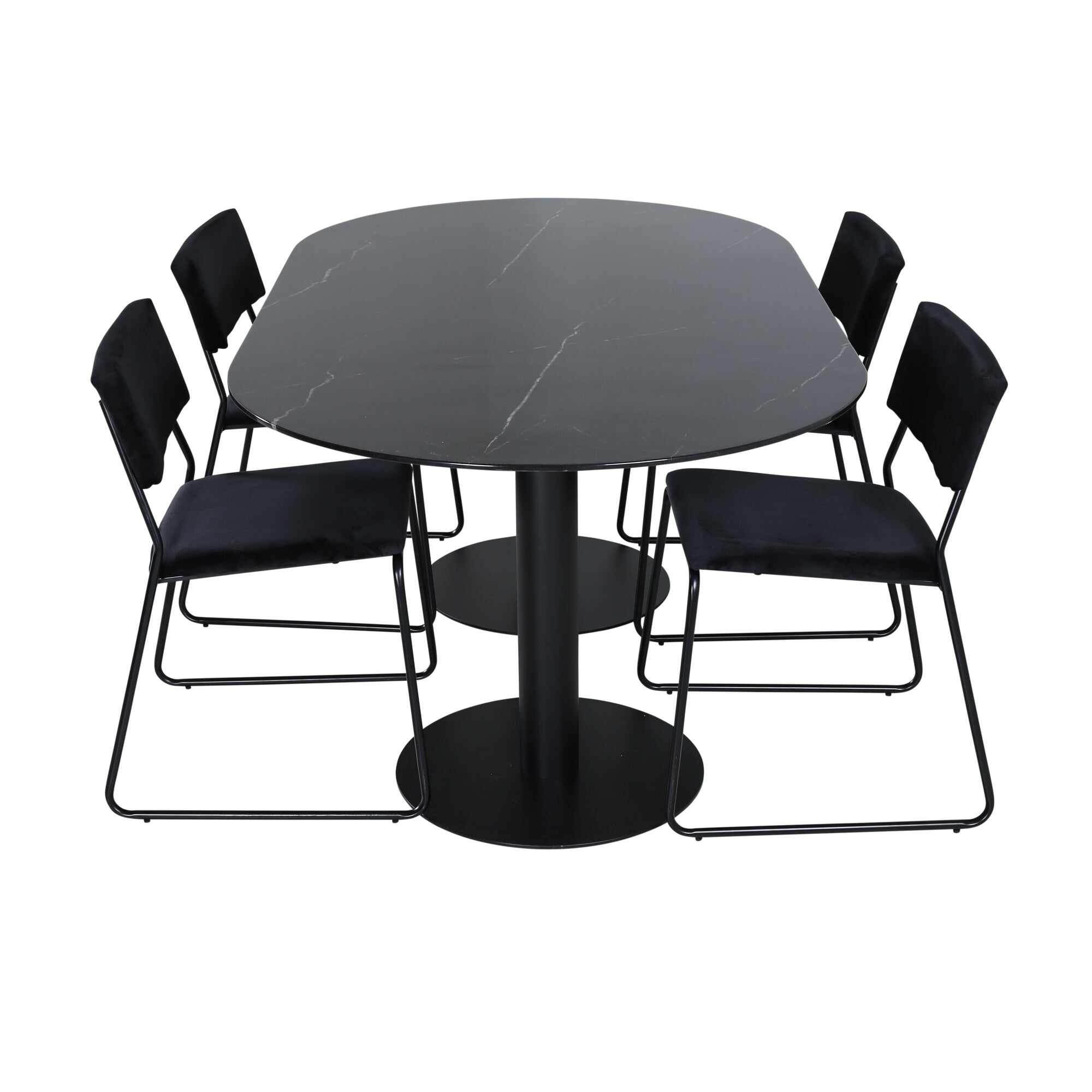 Pillan oválný jídelní stůl , černé černé sklo mramor + židle Kenth , černý černý samet_4