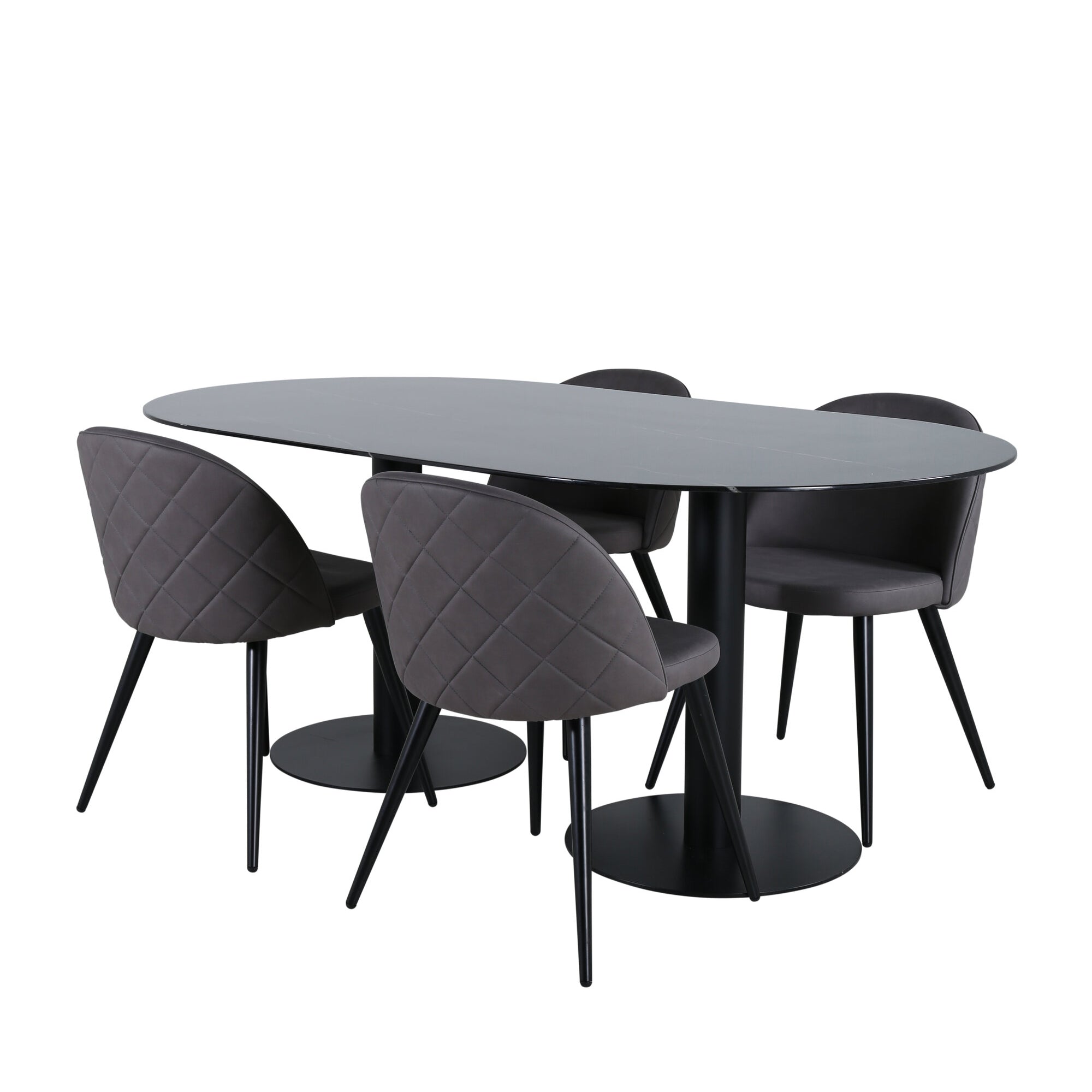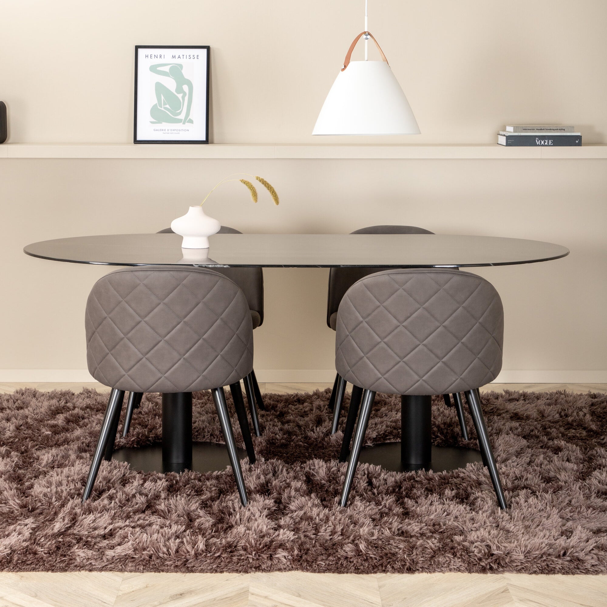 Oválný jídelní stůl Pillan – černá/černá sklo mramor + židle se sametovými stehy – černá/šedá mikrovlákno_4