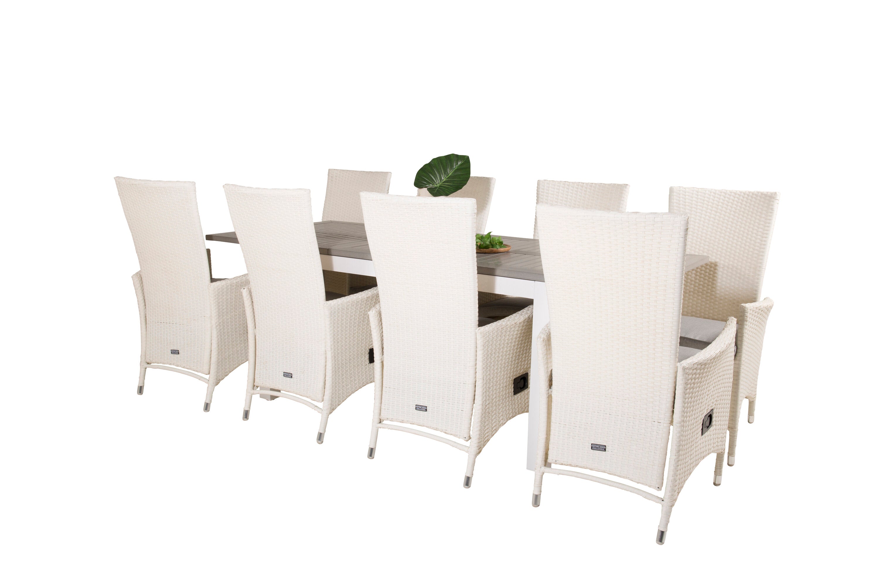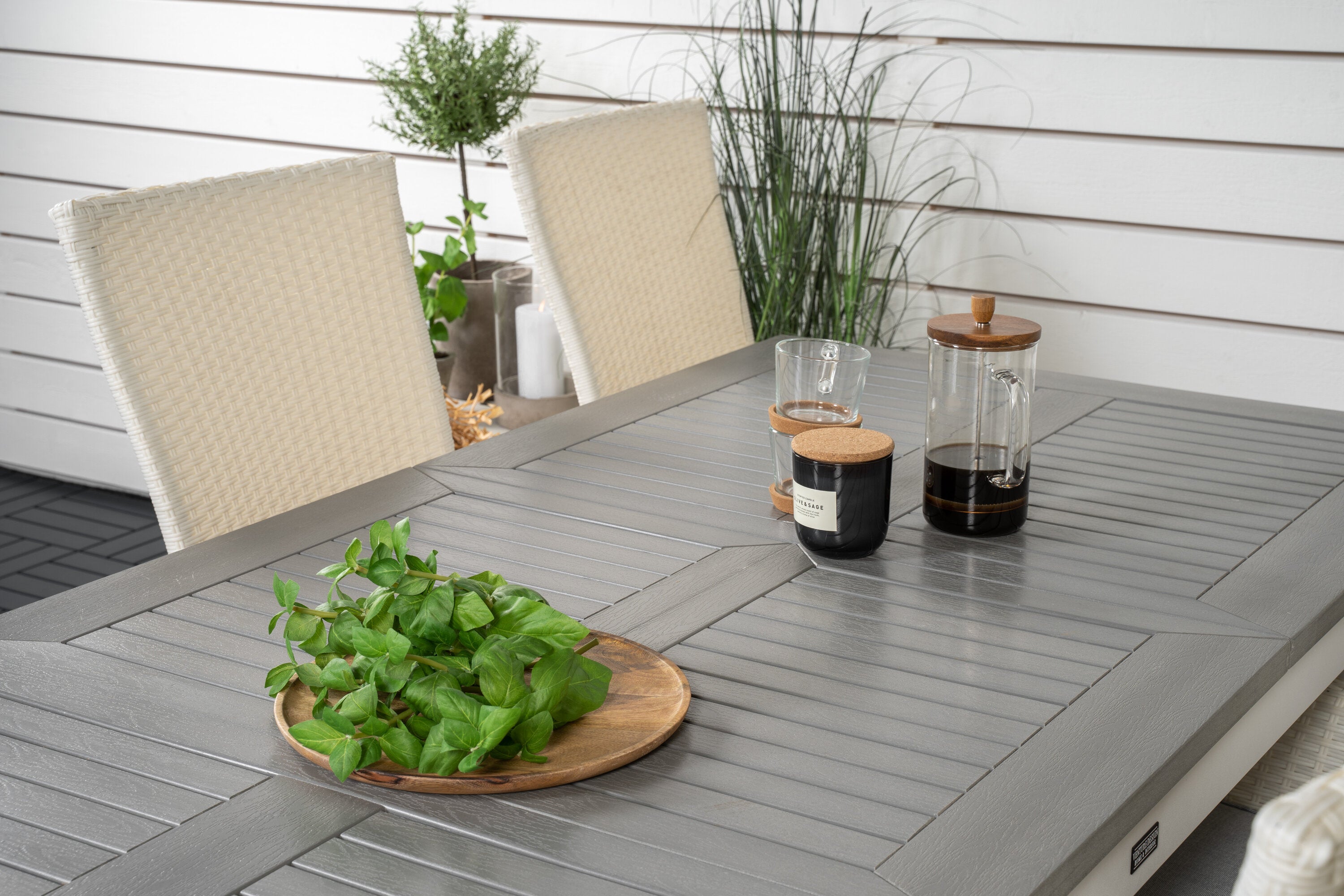 Jídelní stůl Albany v klasickém stylu. Ke stolu přichází naše oblíbené jídelní židle Padova, kombinace, která na terase vytváří hřejivý, přirozený pocit. Rozšiřte svá pozvání na večeři a vyhněte se obavám, že budou všichni ubytováni.