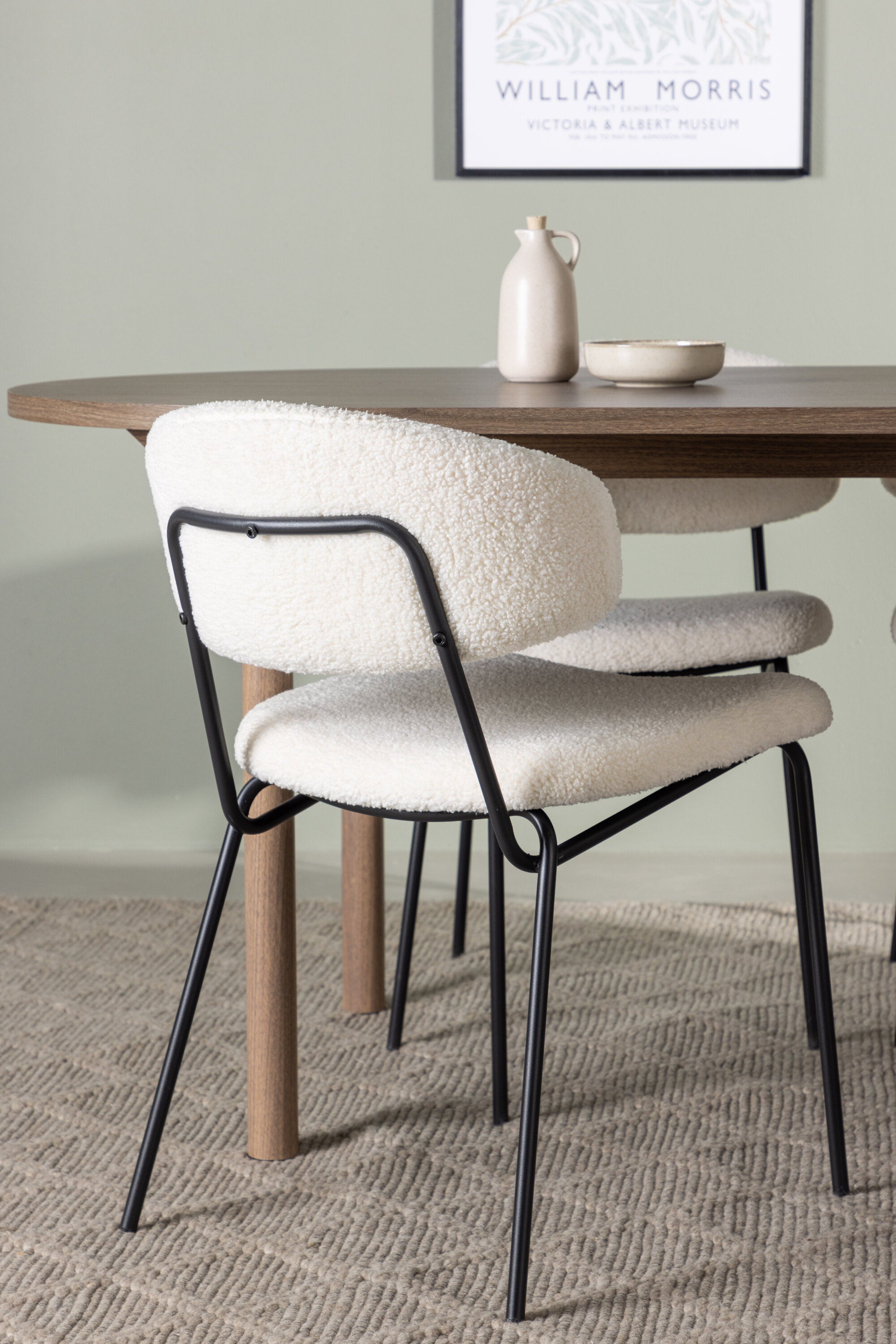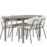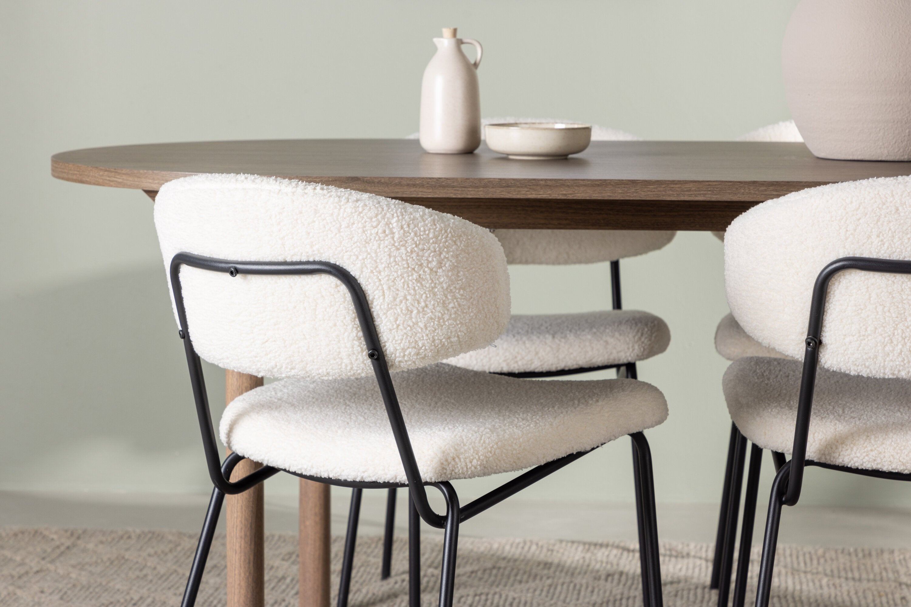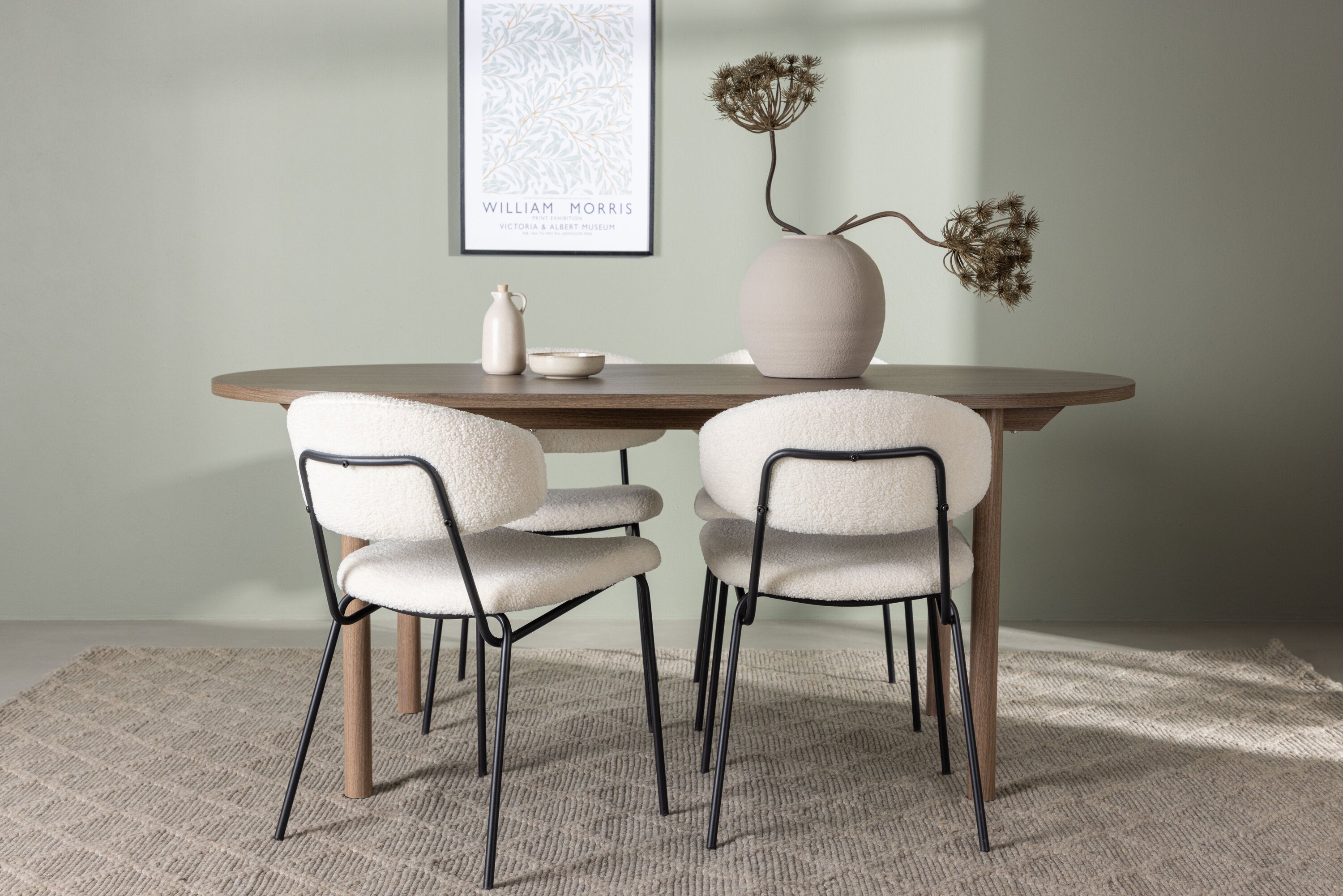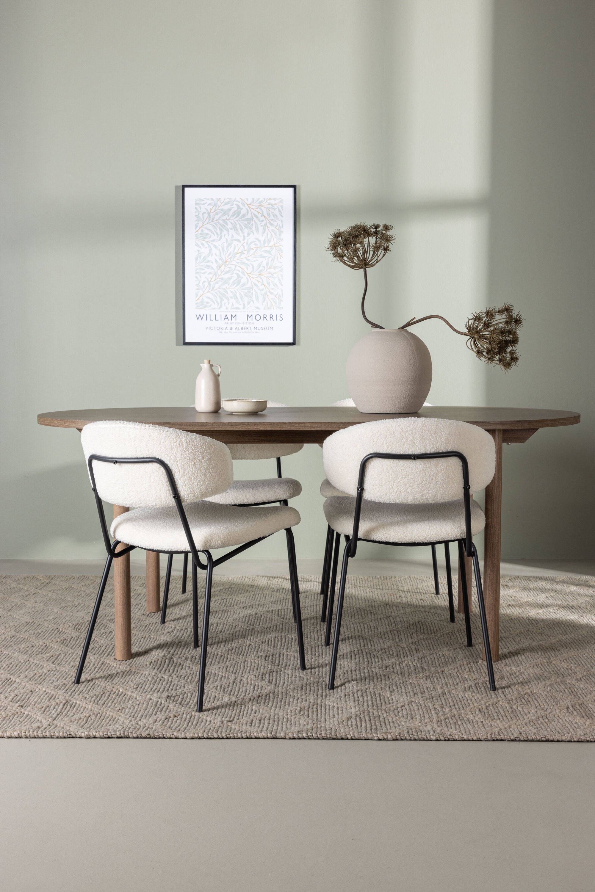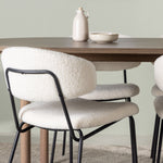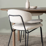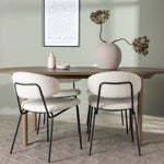 Zde jsme tento oválný jídelní stůl doplnili o bílé židle ze série Chico, abychom vytvořili dokonalou harmonii. Židle Chico zaujmou svým elegantním minimalismem a zaobleným designem, který umocňuje celkový vzhled. Tenká boucle látka v krásné béžové barvě dodá vašemu obývacímu pokoji punc elegance.