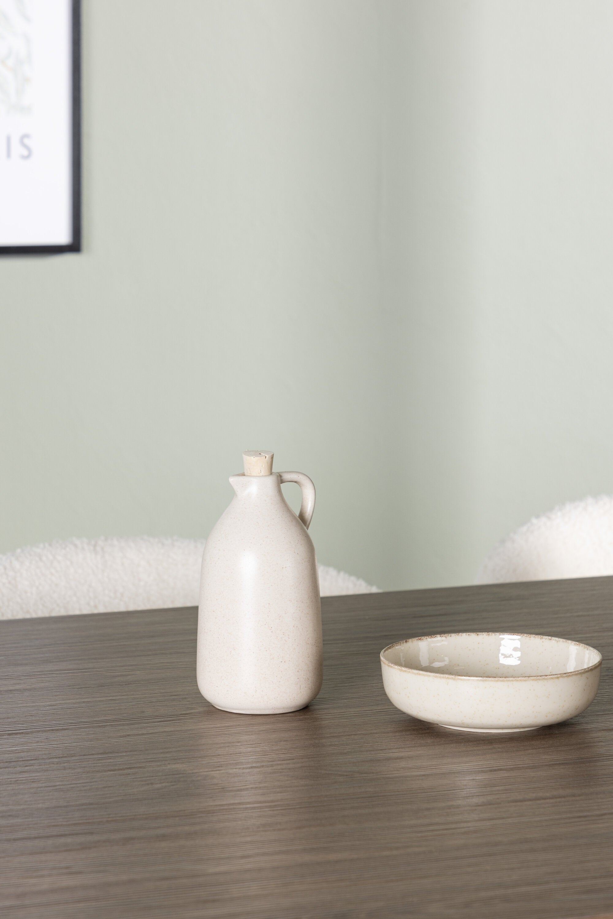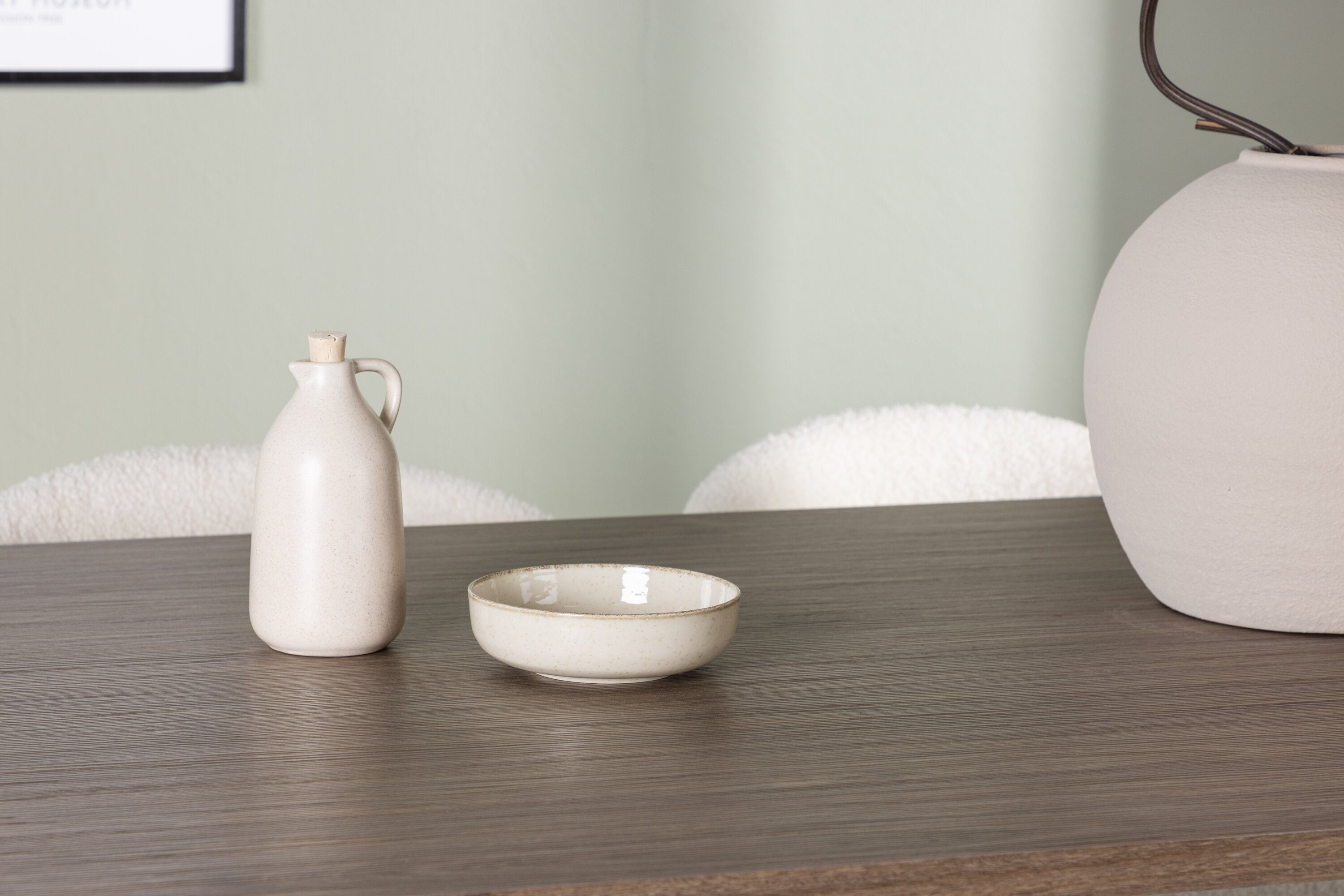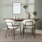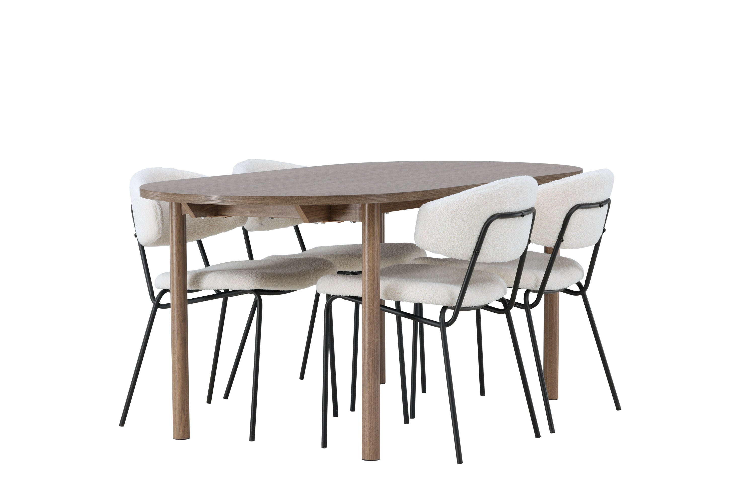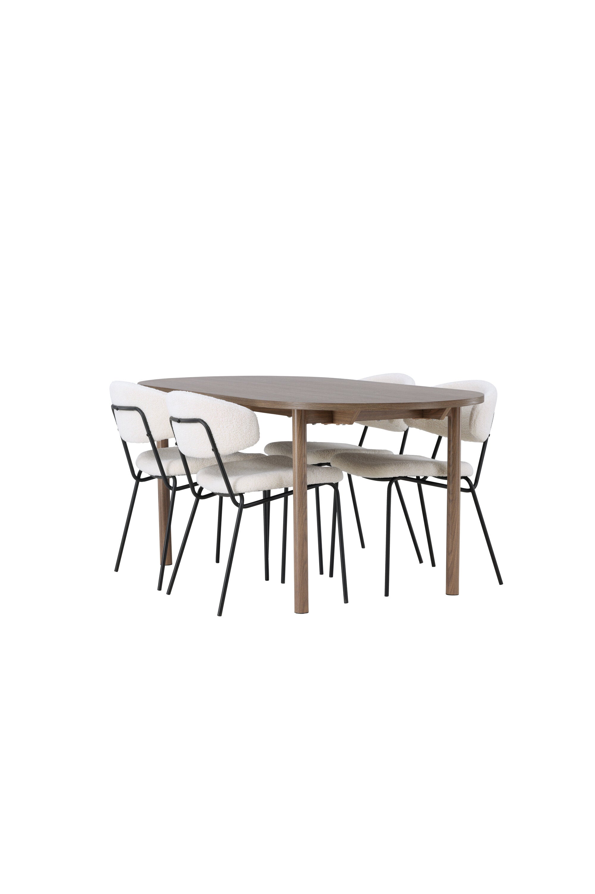 Zde jsme tento oválný jídelní stůl doplnili o bílé židle ze série Chico, abychom vytvořili dokonalou harmonii. Židle Chico zaujmou svým elegantním minimalismem a zaobleným designem, který umocňuje celkový vzhled. Tenká boucle látka v krásné béžové barvě dodá vašemu obývacímu pokoji punc elegance.