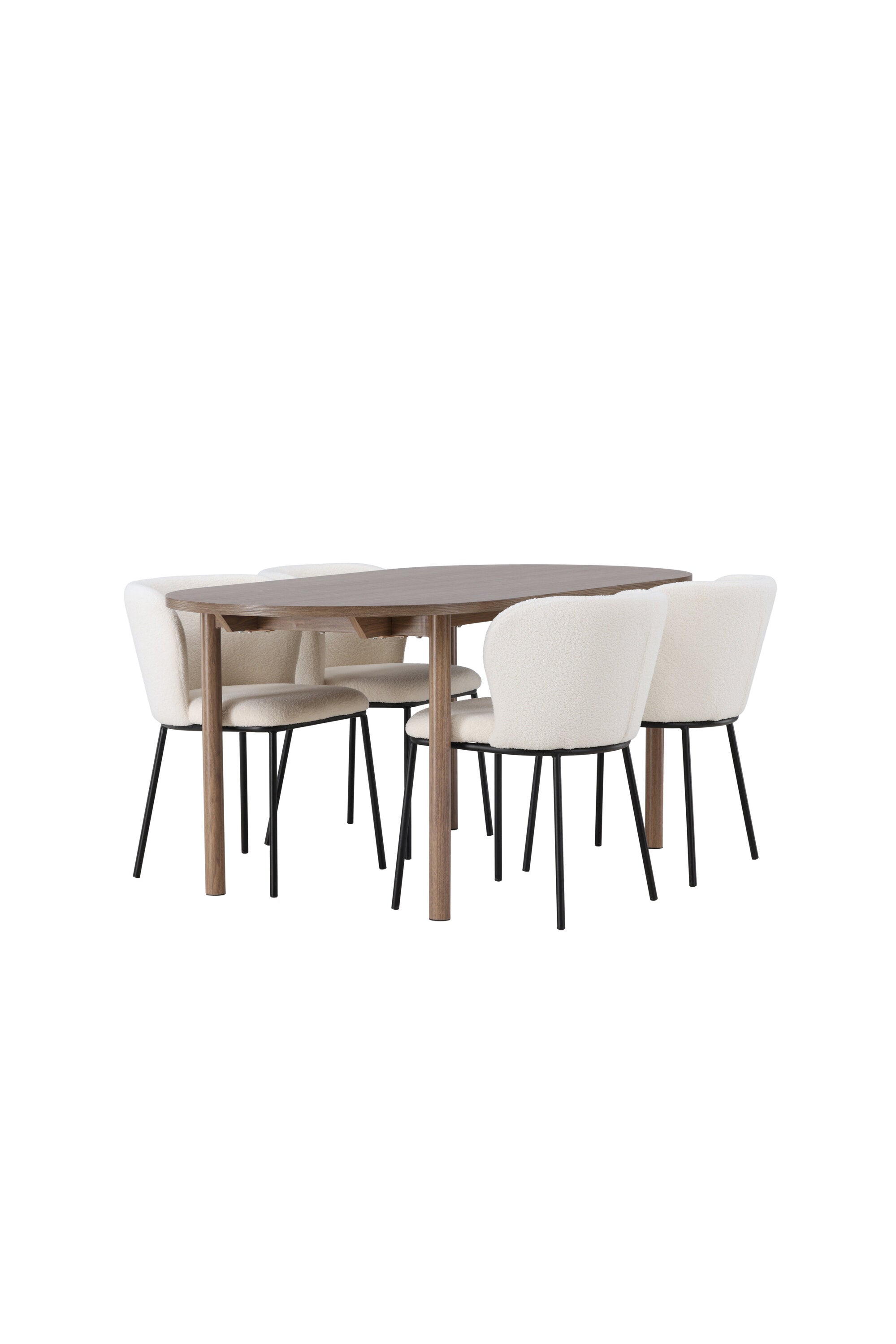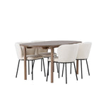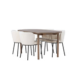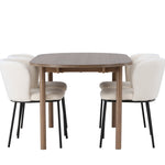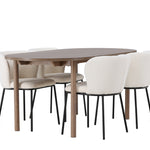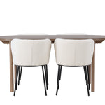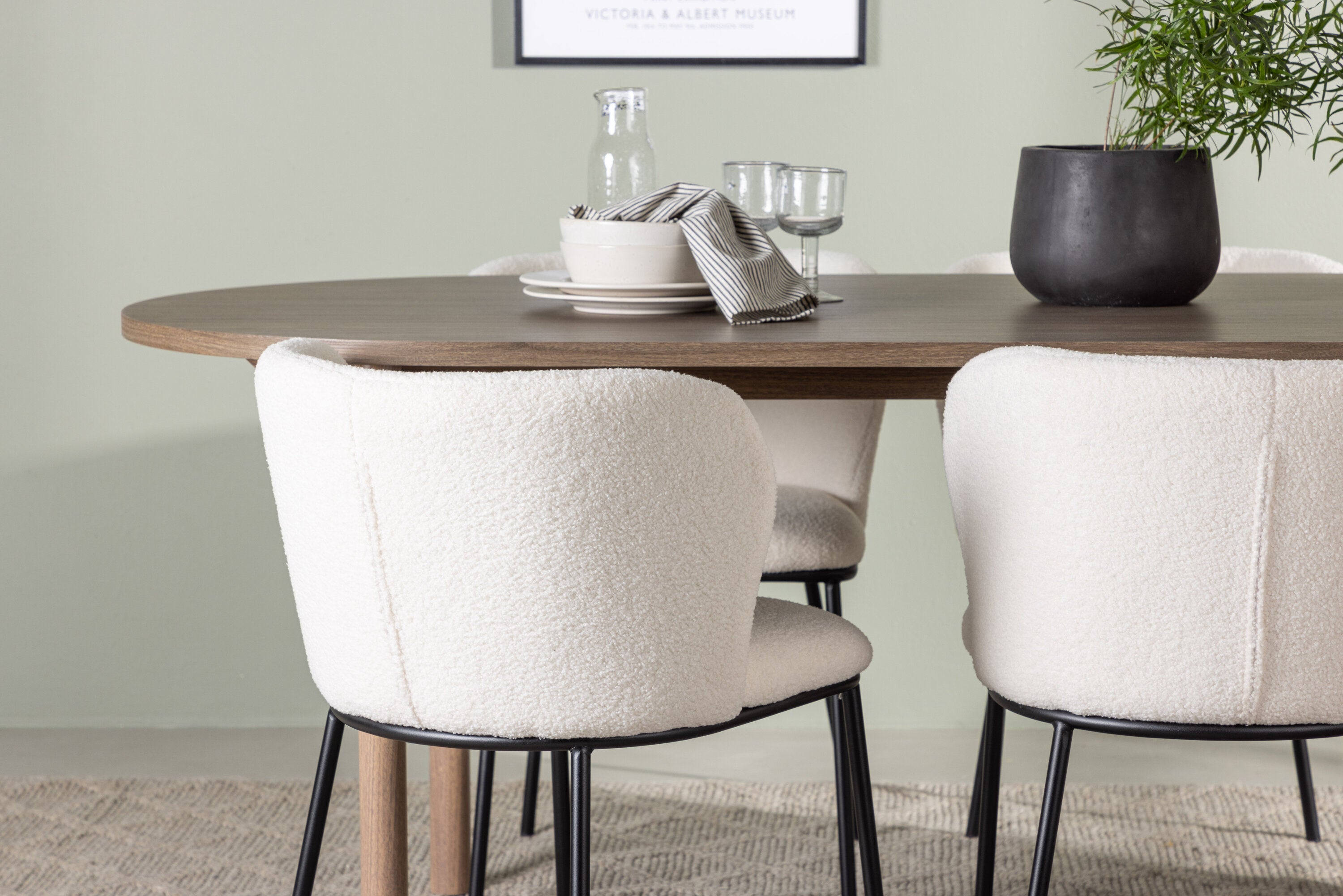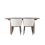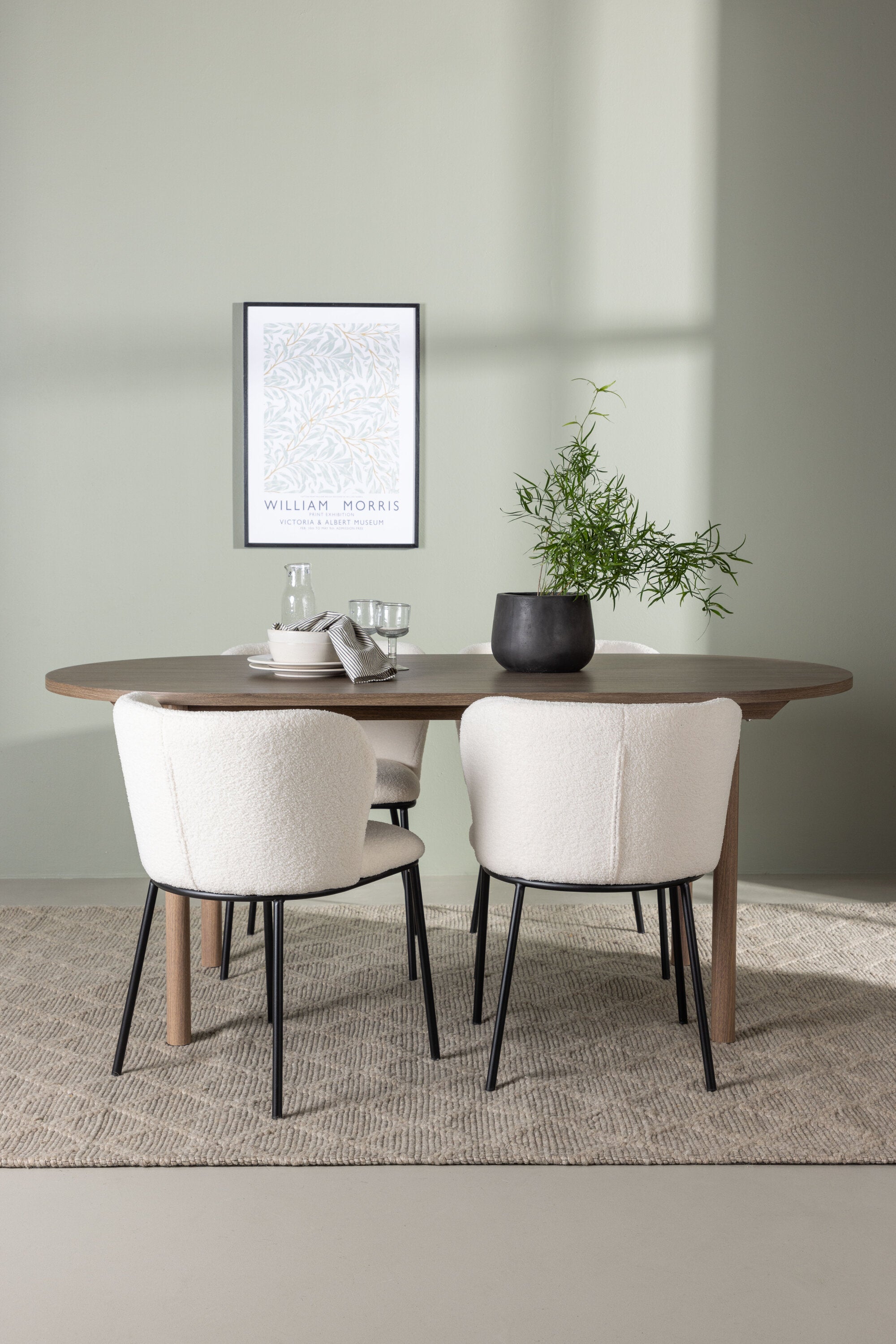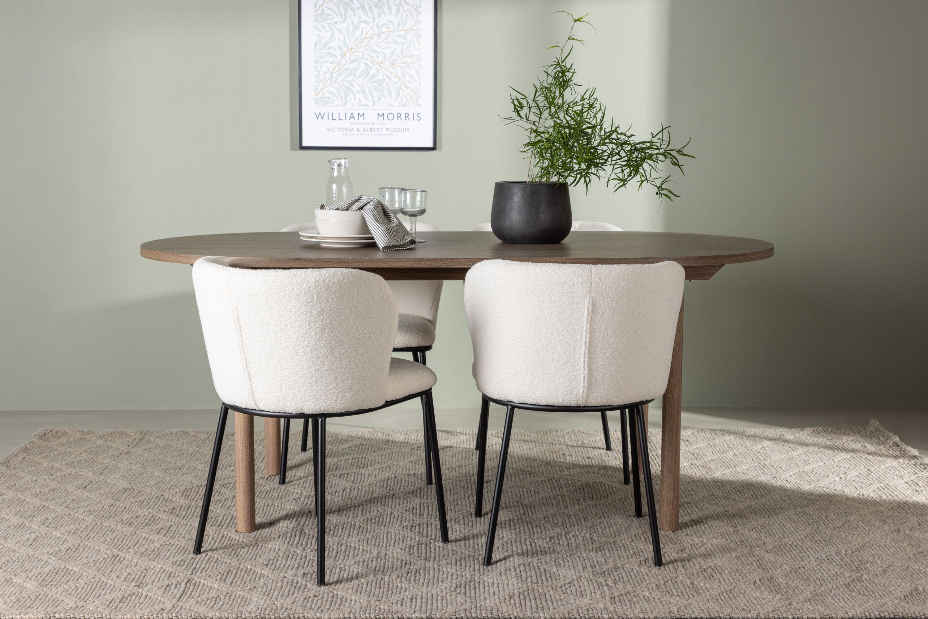 Zde jsme spojili jídelní stůl v přírodní barvě s elegantními jídelními židlemi ze série Edina. Židle má bezešvý a celočalouněný sedák v bílé buklé látce, který dodá vašemu jídelnímu koutu luxusní nádech. Minimalistické černé kovové nohy židle doplňují elegantní design elegantním způsobem.