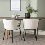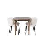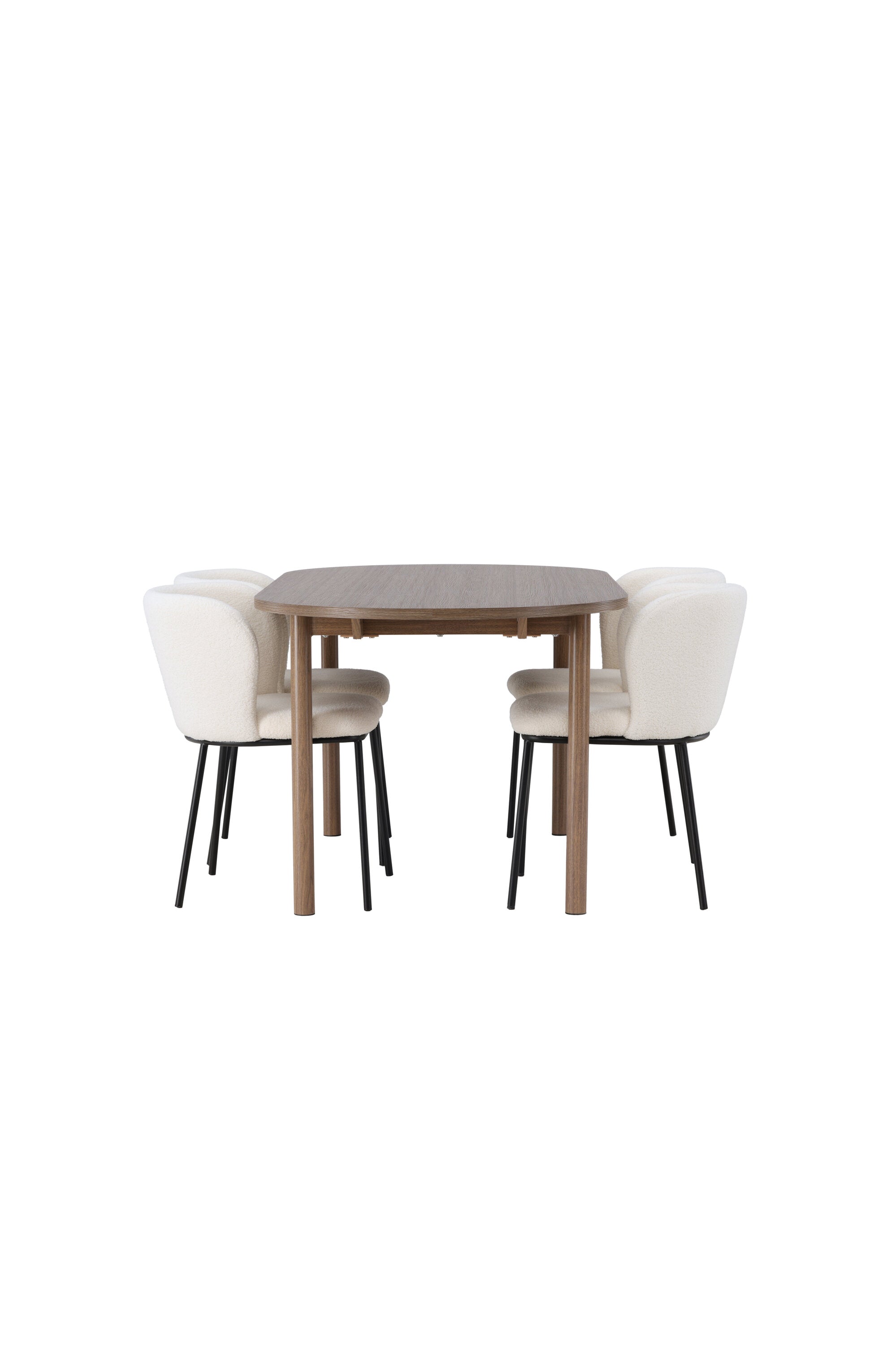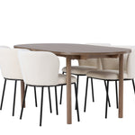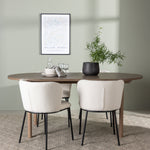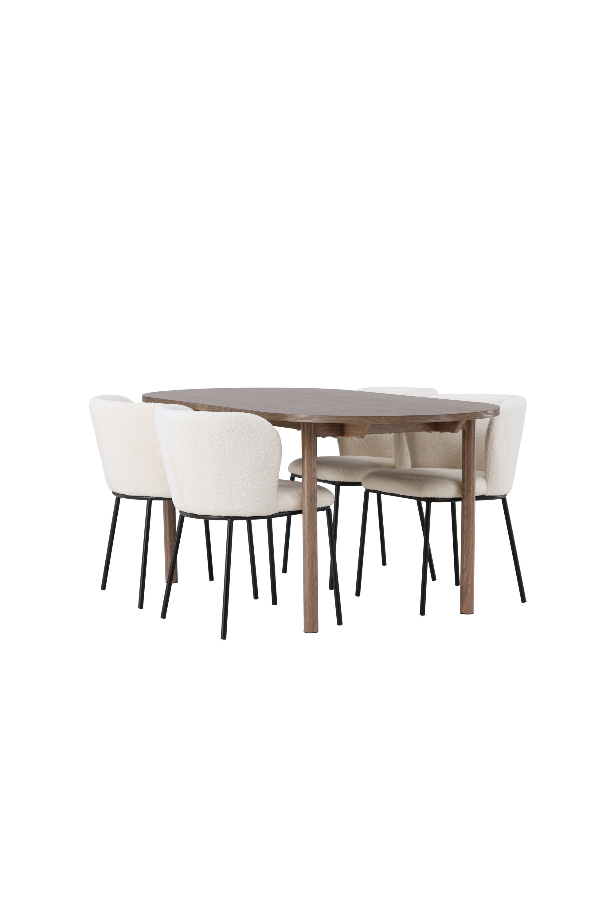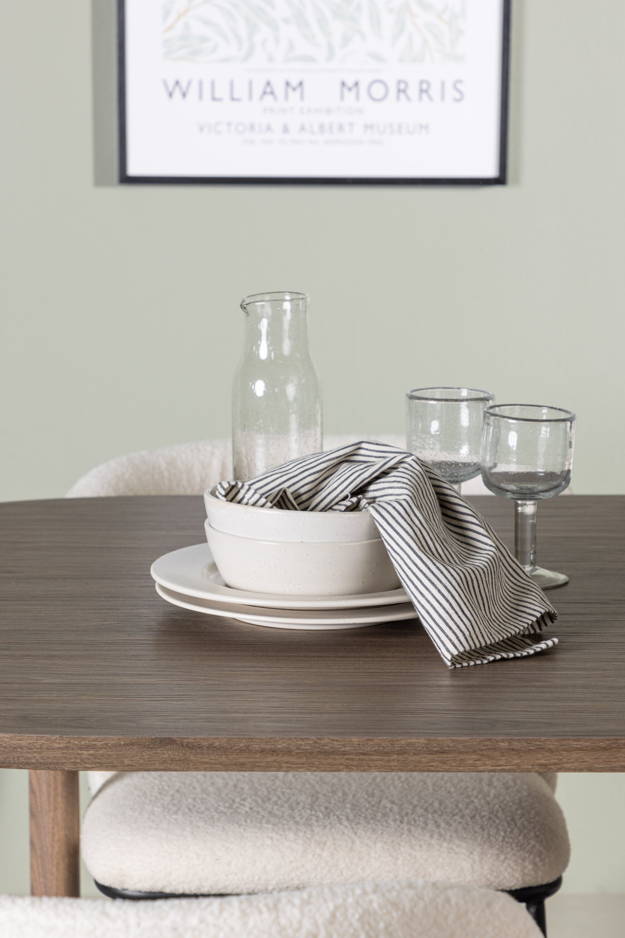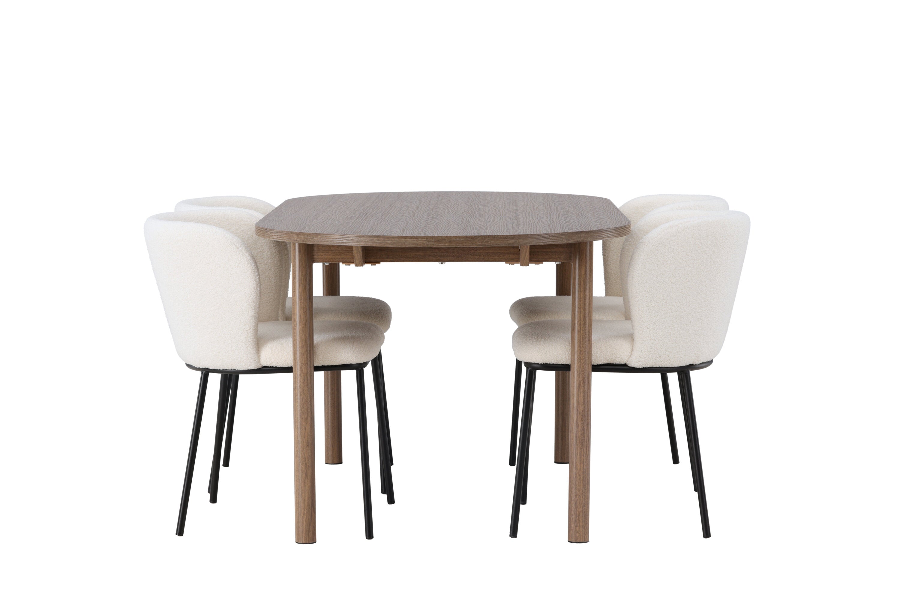 Zde jsme spojili jídelní stůl v přírodní barvě s elegantními jídelními židlemi ze série Edina. Židle má bezešvý a celočalouněný sedák v bílé buklé látce, který dodá vašemu jídelnímu koutu luxusní nádech. Minimalistické černé kovové nohy židle doplňují elegantní design elegantním způsobem.