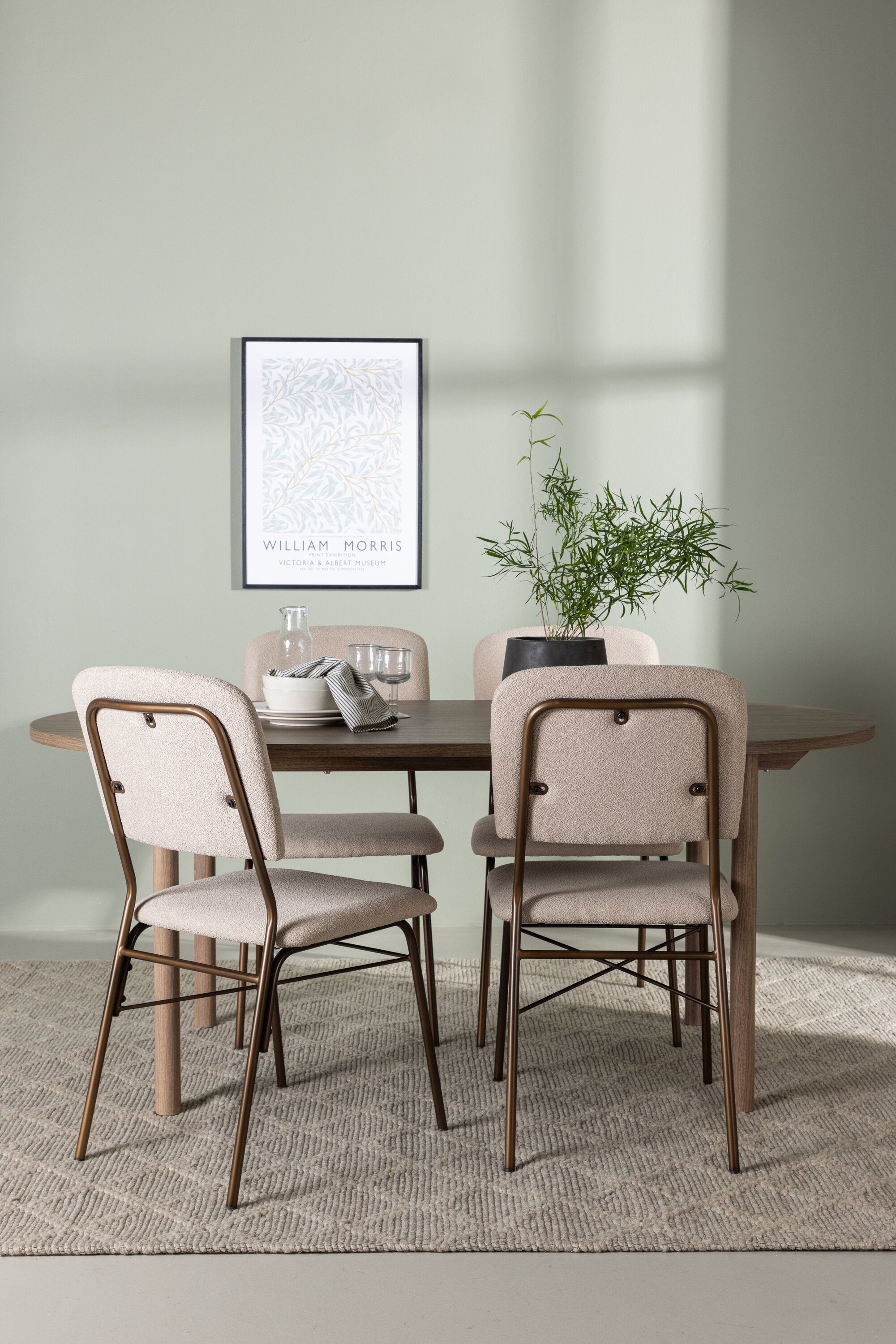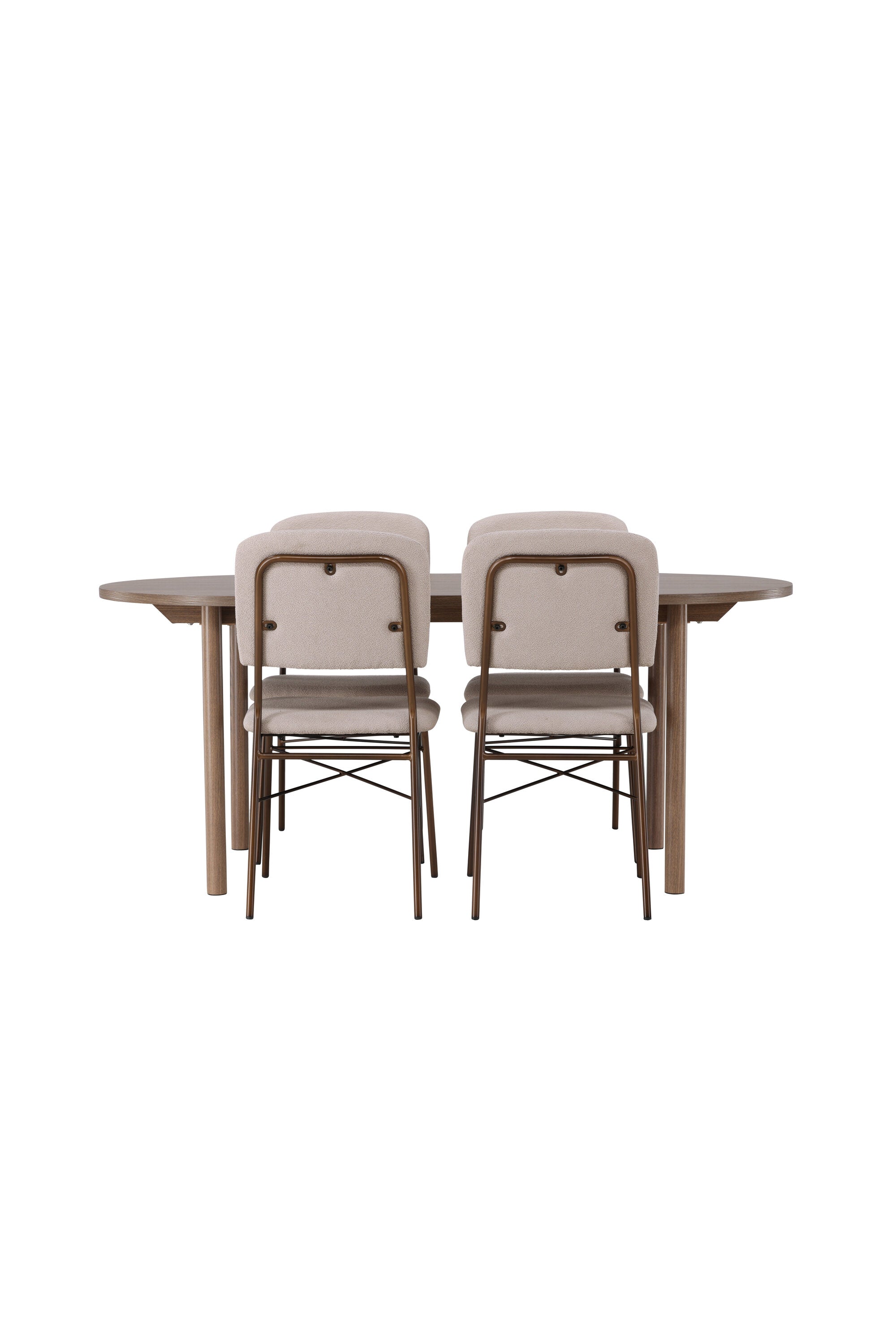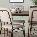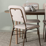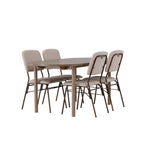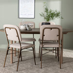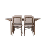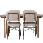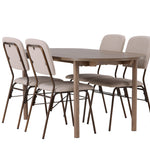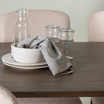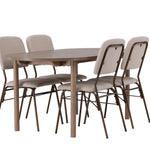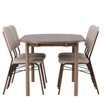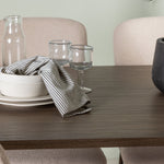 Zde jsme hnědý stůl sladili s béžovými jídelními židlemi ze série Seda. Tato židle je vytvořena v souladu s nejnovějšími trendy a nedělá kompromisy mezi stylem a pohodlím. Krásná béžová polyesterová tkanina s texturou poskytuje luxusní pocit a vytváří příjemnou atmosféru. Tmavě hnědé ocelové nohy židle poskytují pevnou a pevnou základnu, která se skvěle hodí k jídelnímu stolu.