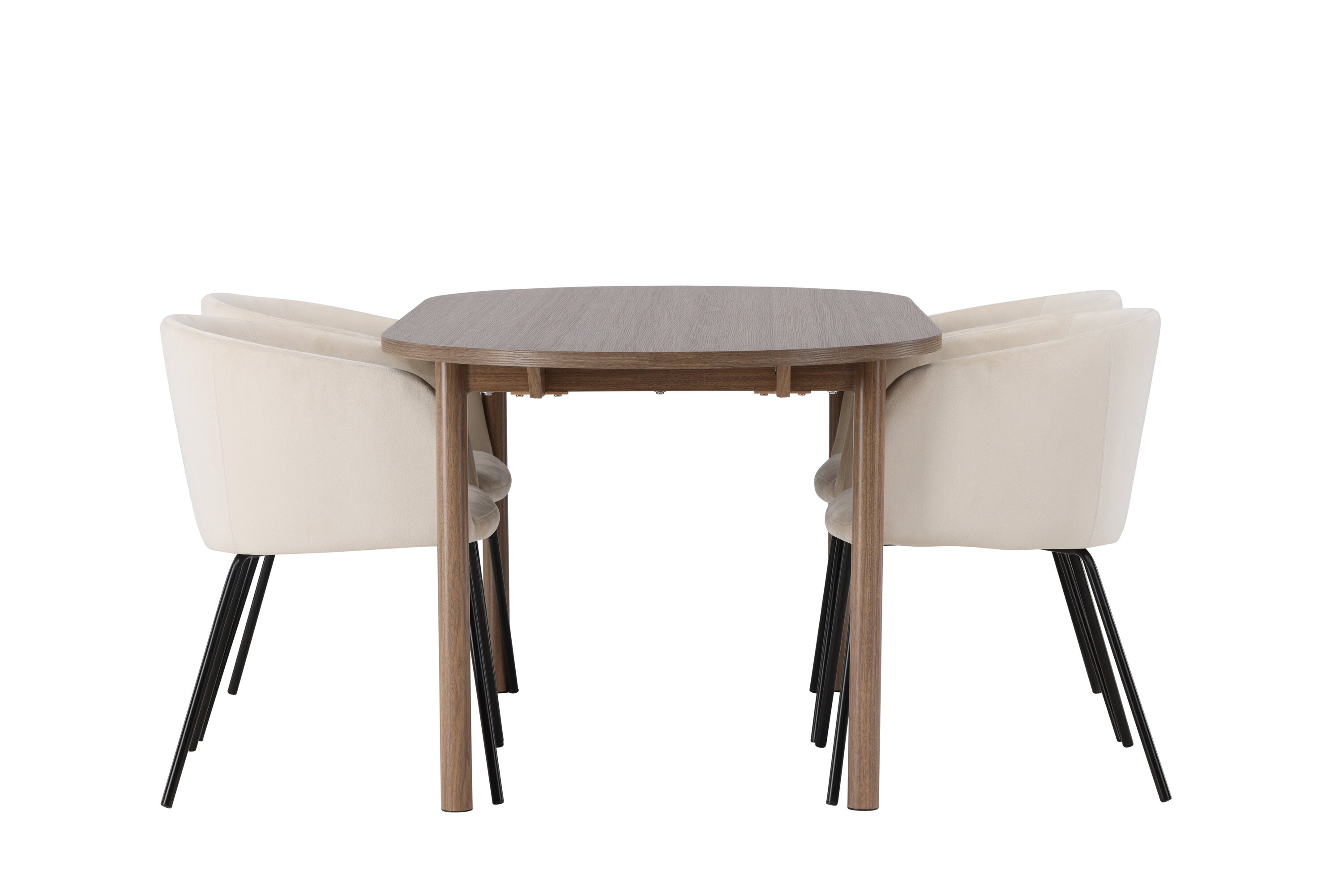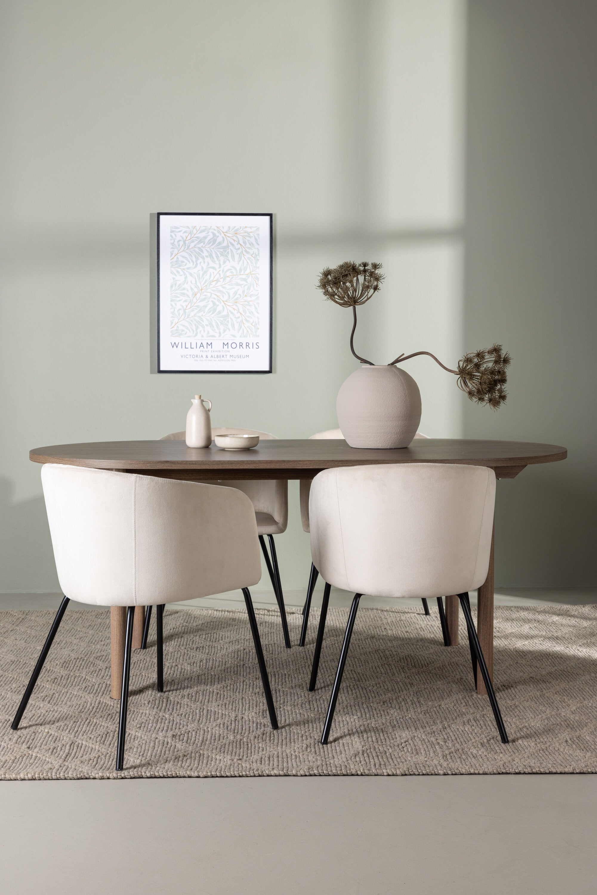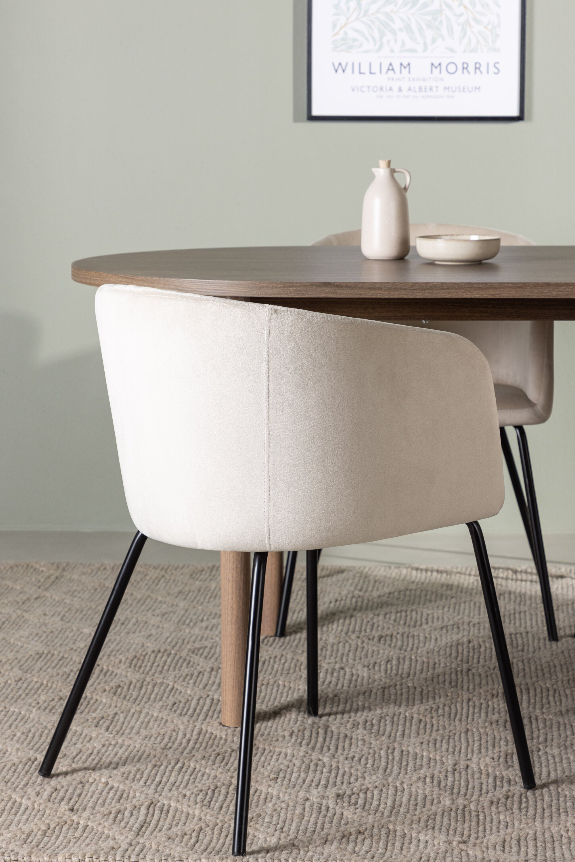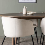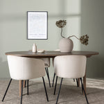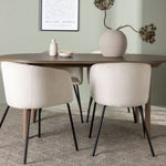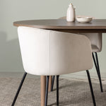 Spolu s tmavě hnědým jídelním stolem máme naše pohodlné jídelní židle ze série Berit. Tato židle je dokonalou kombinací pohodlí a elegance. Vyznačuje se plně čalouněným designem s lehce zaobleným opěradlem a sedákem ze sametové látky a polyesterového lnu a tenké černé železné nohy židle dodávají celkovému vzhledu elegantní nádech.