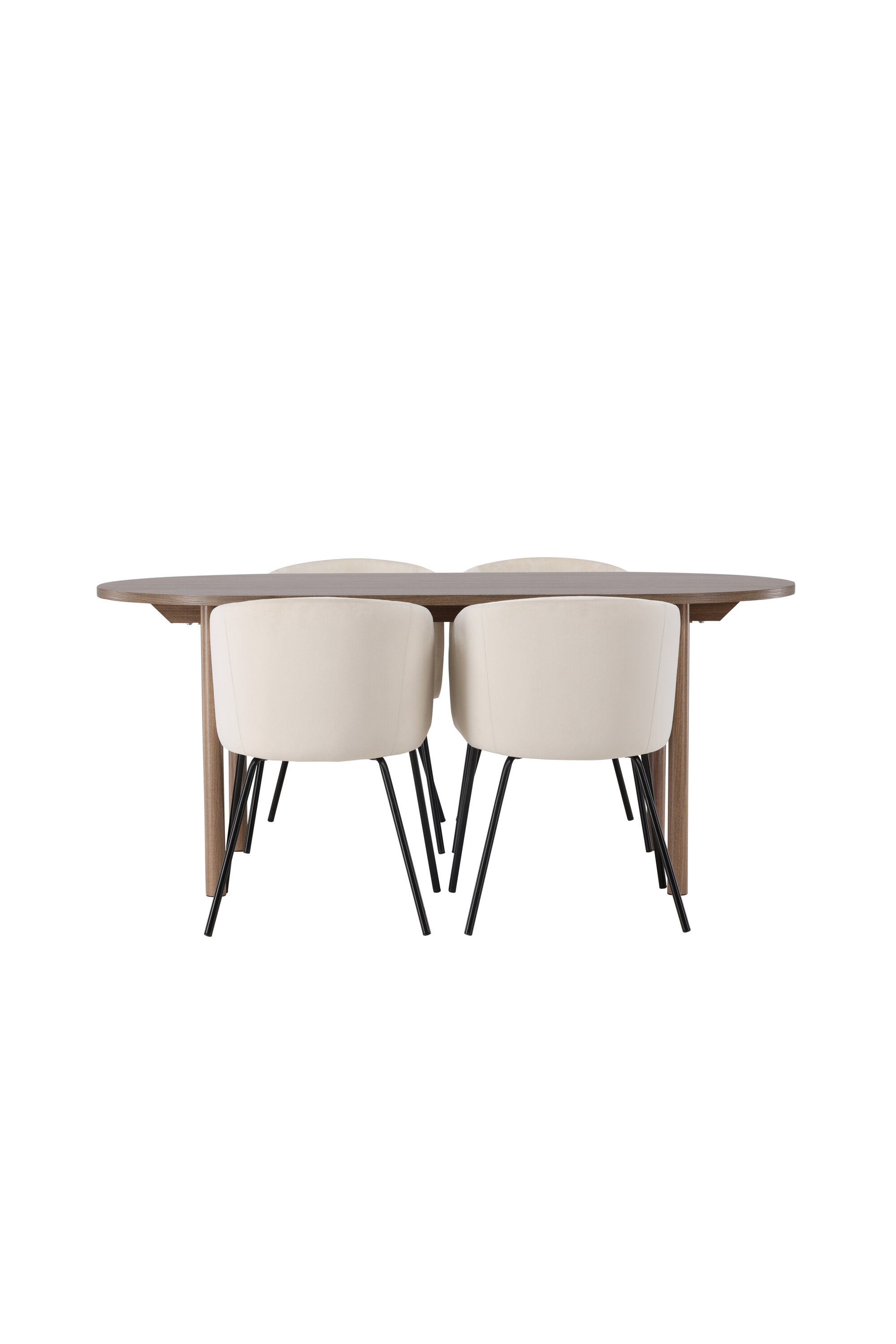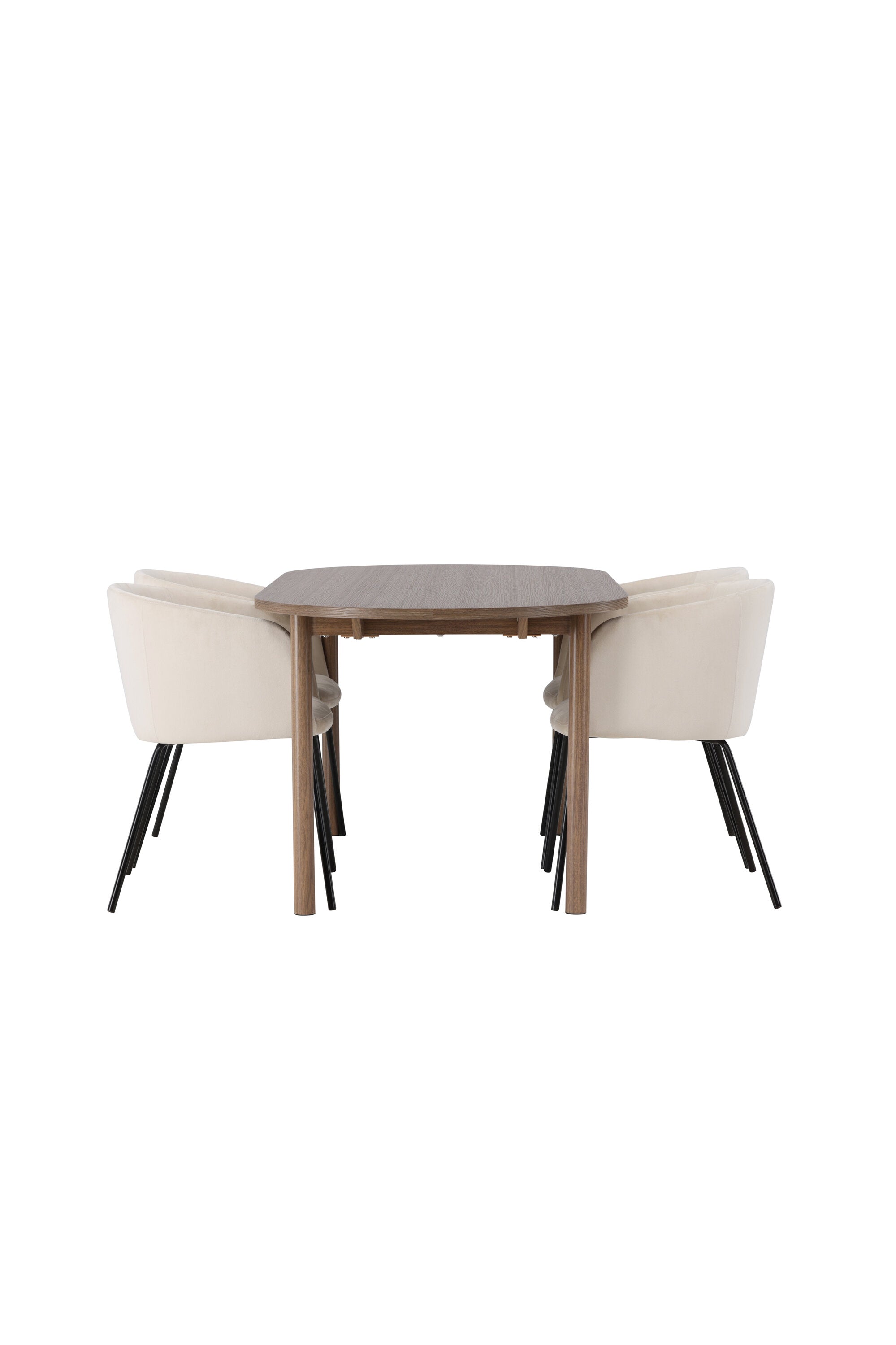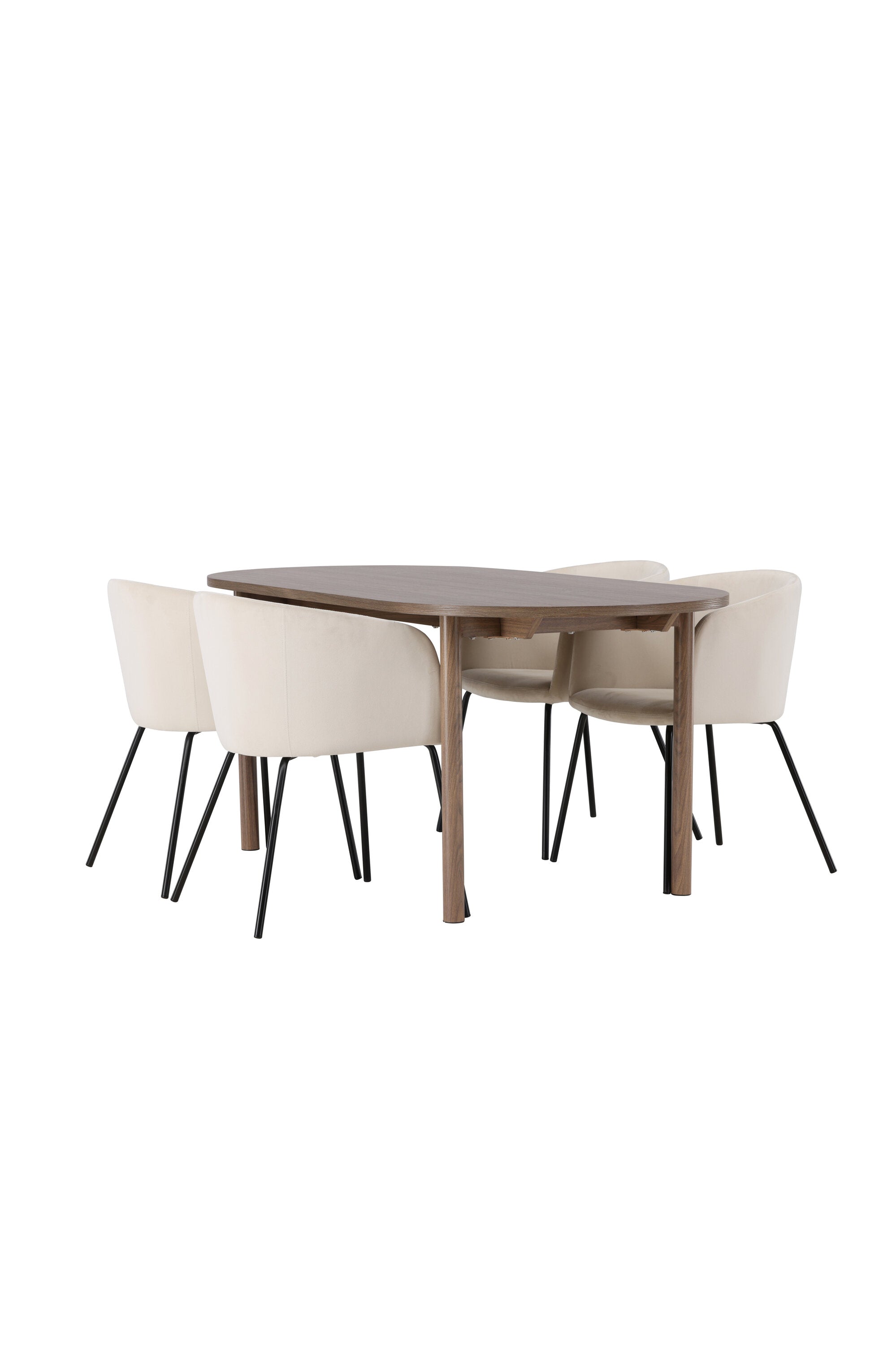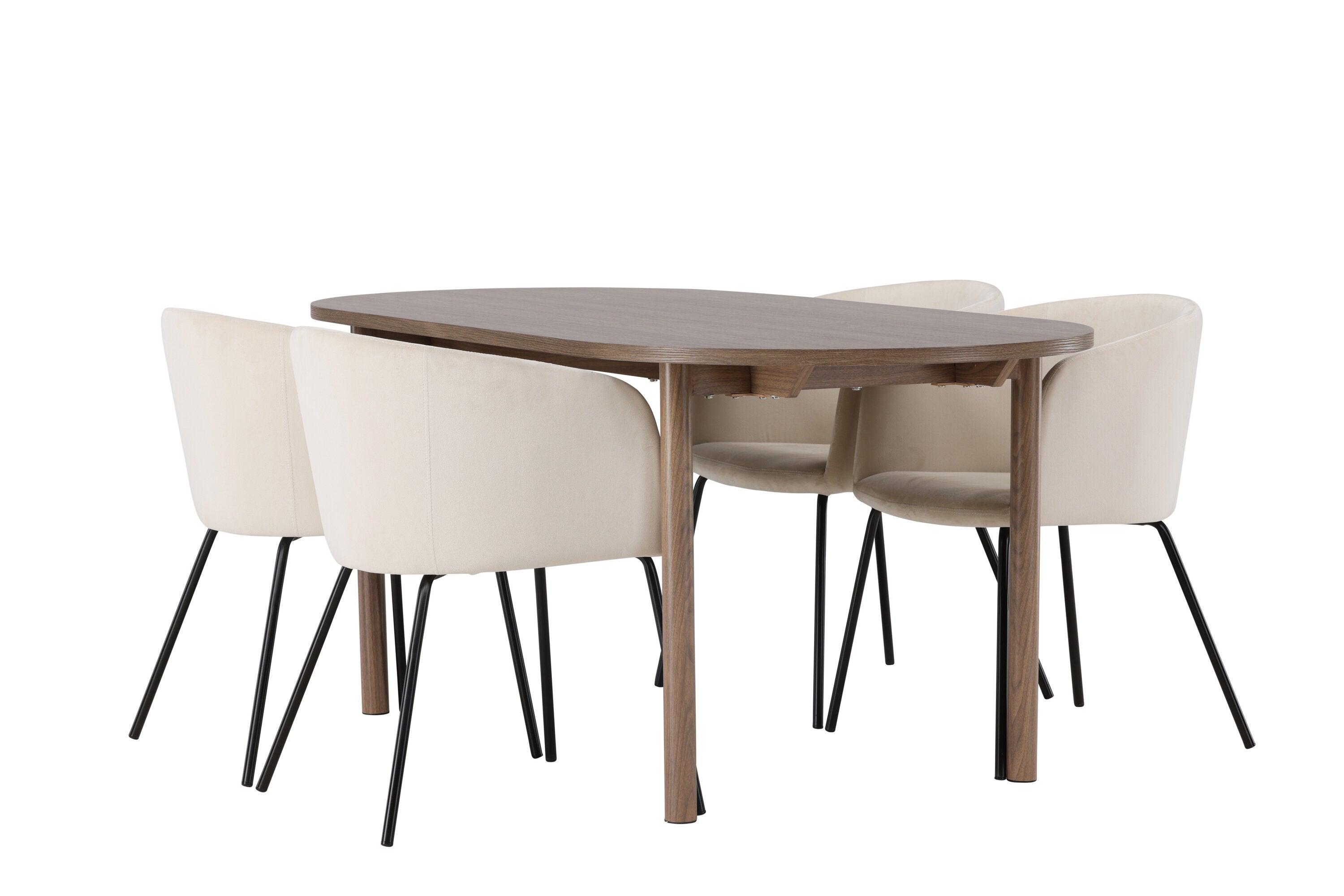 Spolu s tmavě hnědým jídelním stolem máme naše pohodlné jídelní židle ze série Berit. Tato židle je dokonalou kombinací pohodlí a elegance. Vyznačuje se plně čalouněným designem s lehce zaobleným opěradlem a sedákem ze sametové látky a polyesterového lnu a tenké černé železné nohy židle dodávají celkovému vzhledu elegantní nádech.