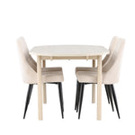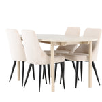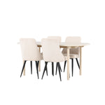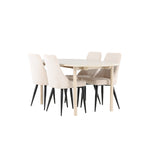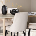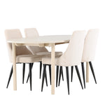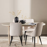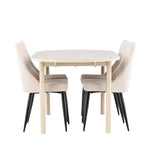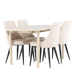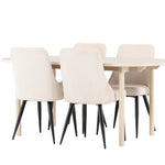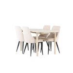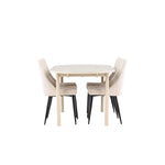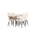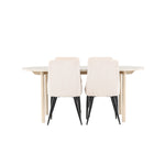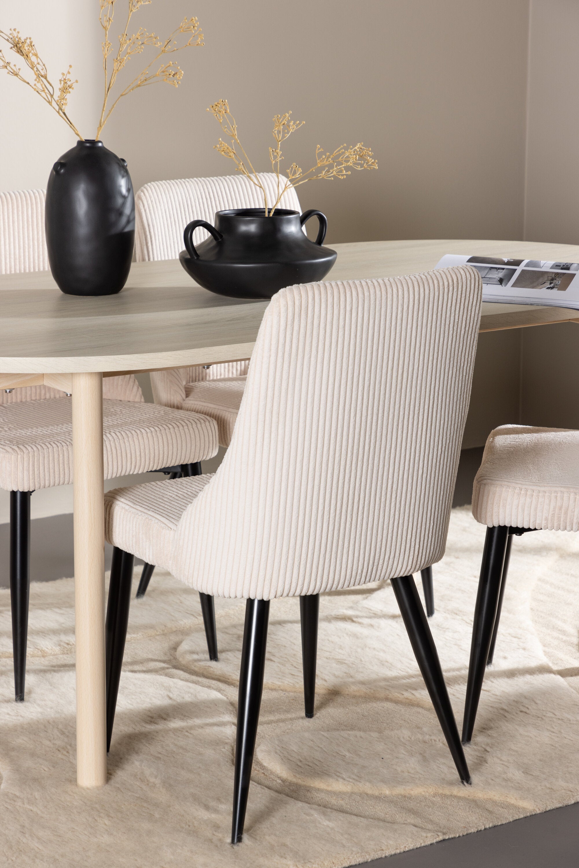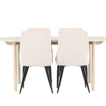 Jídelní židle Leone a jídelní stůl Andy dohromady tvoří perfektní jídelní set, který kombinuje styl a pohodlí elegantním způsobem. Židle má certifikaci FSC® (FSC®C177288), což znamená, že se skládá ze dřeva z odpovědného lesnictví, lesnictví, které bere ohled na lidi a životní prostředí. Leone je vyroben z měkkého sametu s ocelovými nohami a nabízí dokonalou rovnováhu mezi funkcí a estetikou. Jemná béžová barva působí hřejivě a příjemně a díky jednoduchému designu je židle všestranná a vhodná do různých stylů interiéru. Leone usnadňuje vytvoření jednotné a harmonické atmosféry kolem vašeho jídelního prostoru, ať už pro každodenní jídlo nebo speciální příležitosti. Jídelní stůl Andy svou bílou barvou vytváří zemitý a neutrální dojem ve vaší jídelně nebo kuchyni. Ocelové nohy stolu a stolová deska z MDF spojují eleganci s robustností, díky čemuž je spolehlivým kusem nábytku na mnoho let. Díky velkorysým rozměrům 180x90 cm je spousta místa pro rodinu a přátele, aby se sešli u stolu a vychutnali si dobré jídlo a společnost. Jídelní židle Leone a jídelní stůl Andy společně nabízejí stylové a funkční řešení pro váš domov, díky kterému bude každé jídlo příjemným zážitkem. Dodejte svému interiéru nádech jednoduché elegance s touto nadčasovou jídelní sadou.