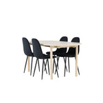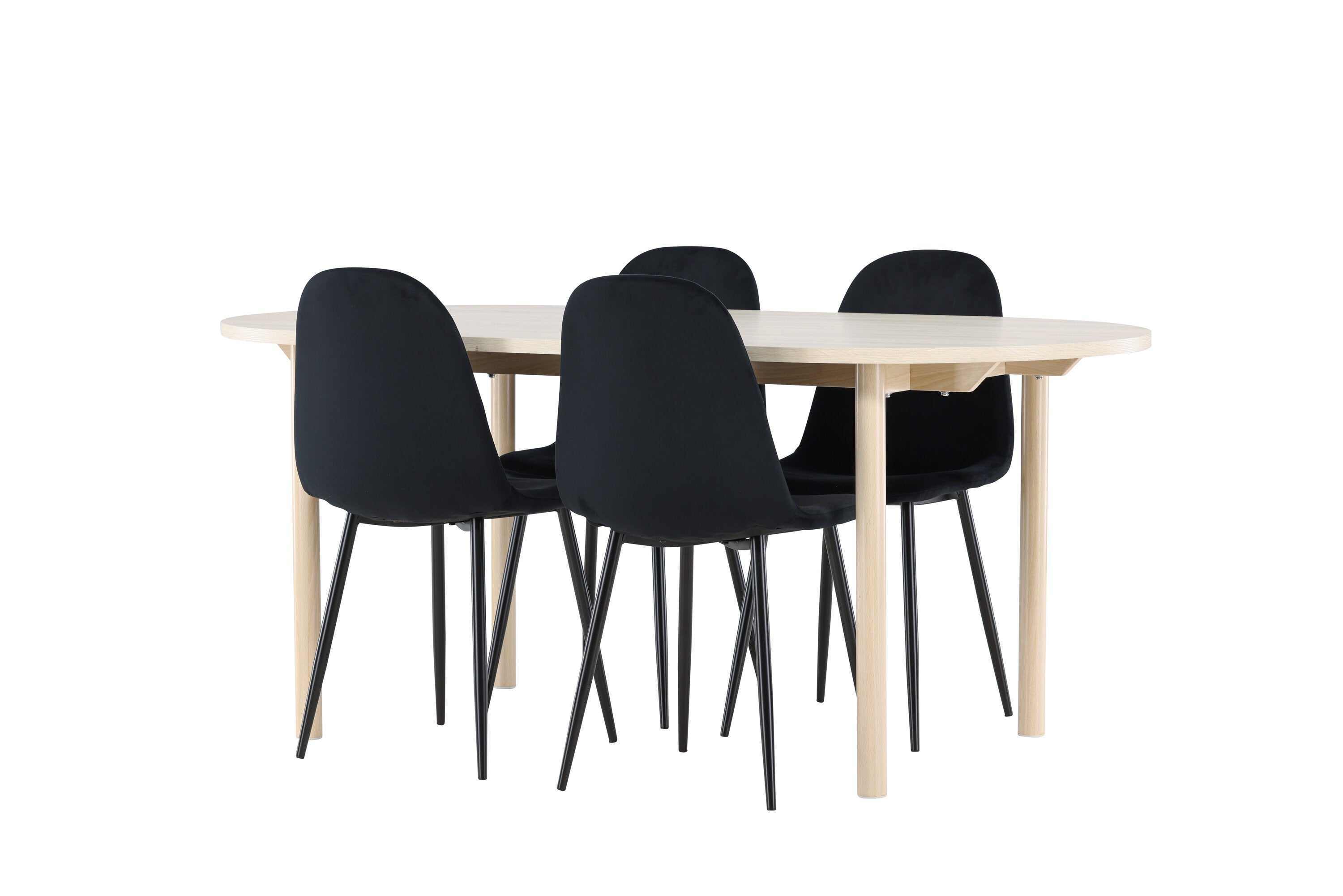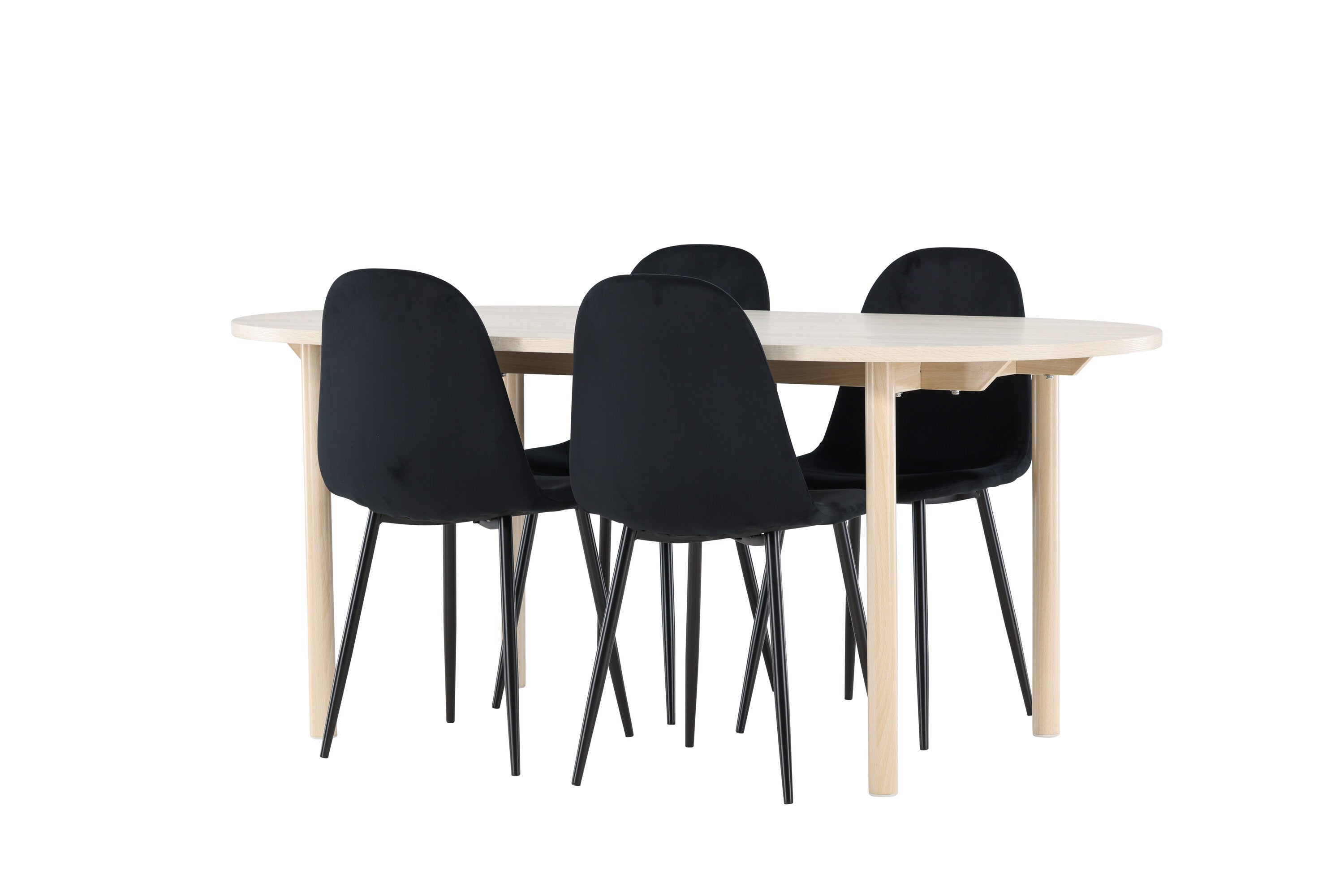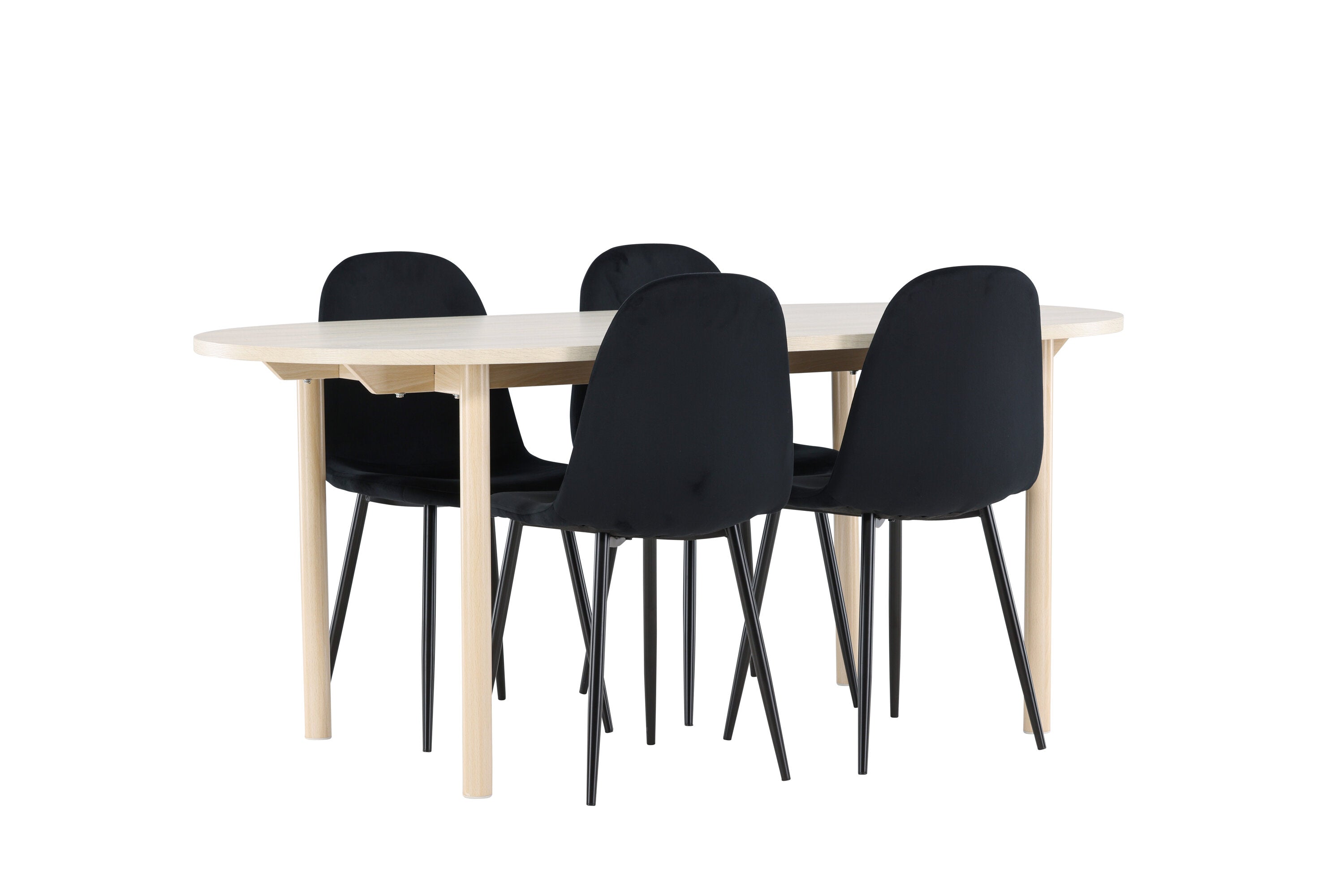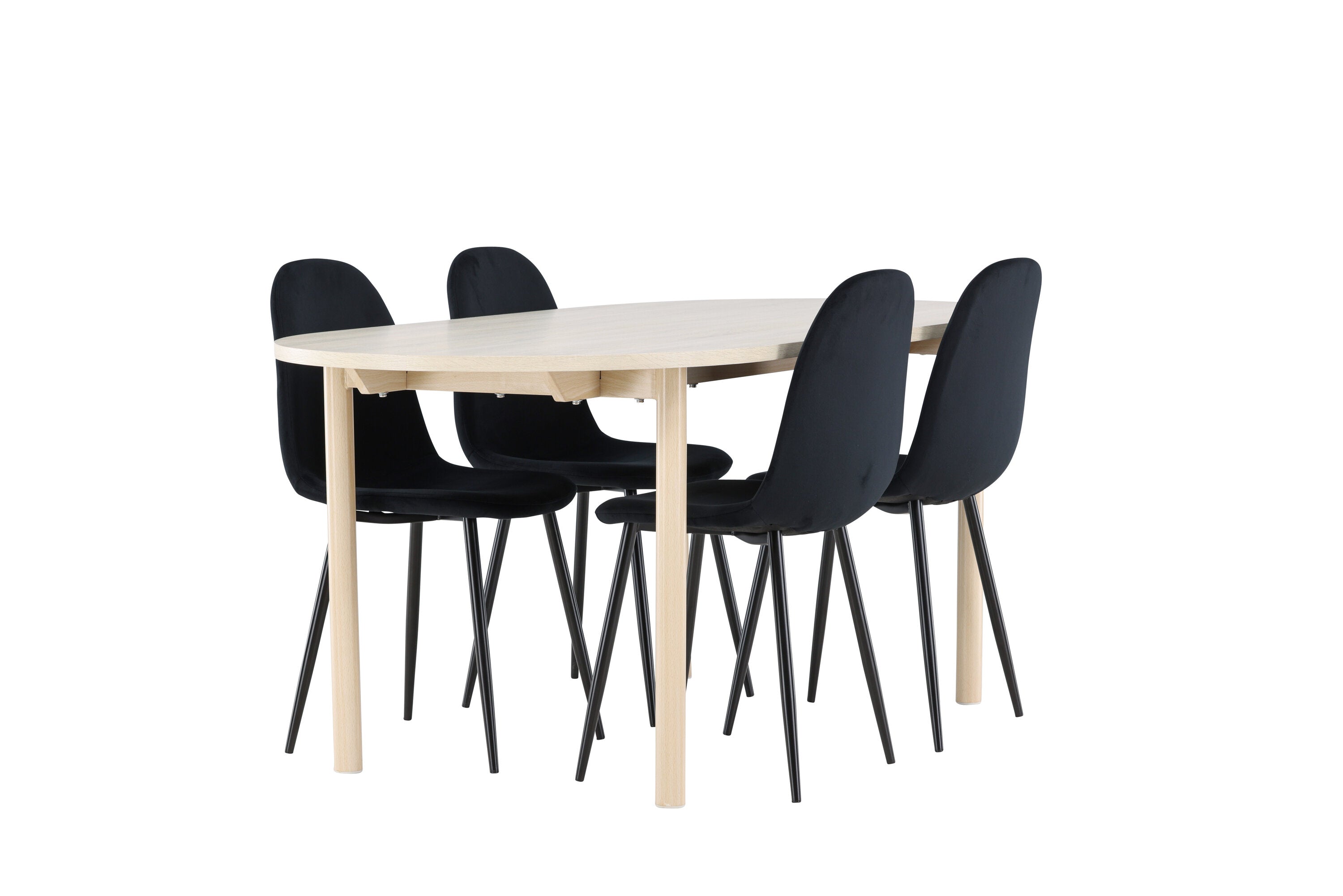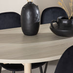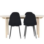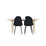 Objevte perfektní jídelní set pro váš domov s jídelním stolem Andy a jídelními židlemi Polar. Jídelní stůl Andy je nadčasový kousek, který se stává dokonalým místem pro společenské stolování. Díky své bílé barvě dodává Andy vaší jídelně nebo kuchyni zemitý a neutrální nádech. Ocelové nohy stolu a deska stolu z MDF kombinují štíhlost s robustností, což z něj dělá spolehlivý kus nábytku na mnoho let. Díky velkorysým rozměrům 180x90 cm je spousta místa pro rodinu a přátele, aby se sešli u stolu a vychutnali si dobré jídlo a dobrou společnost. Andy vytváří klidnou a uvolněnou atmosféru, která se perfektně hodí do různých stylů interiéru. Doplňte svůj jídelní stůl jídelními židlemi Polar, které nabízejí elegantní design v celočerné barvě. Polar má celočalouněný design s nohami z černého kovu s práškovým nástřikem a zaobleným opěradlem a sedákem z černé sametové látky s měkkým polstrováním. Tyto židle vám umožní vyhnout se kompromisům mezi pohodlím a designem. S jídelními židlemi Polar vytvoříte ve své jídelně moderní a elegantní atmosféru. Všimněte si, že samet má tendenci vytvářet otlaky, když se zdřímne položí, což může způsobit, že látka bude vypadat opotřebovaně. To je u tohoto typu materiálu zcela běžné a podle toho, jak dopadá světlo, se látka může posouvat v různých odstínech. Dodejte svému domovu nádech jednoduché elegance s jídelním stolem Andy a jídelními židlemi Polar – dokonalá kombinace pro vytvoření útulné atmosféry a příjemného prostředí pro všechna vaše jídla, ať už jde o každodenní jídlo nebo slavnostní příležitosti.