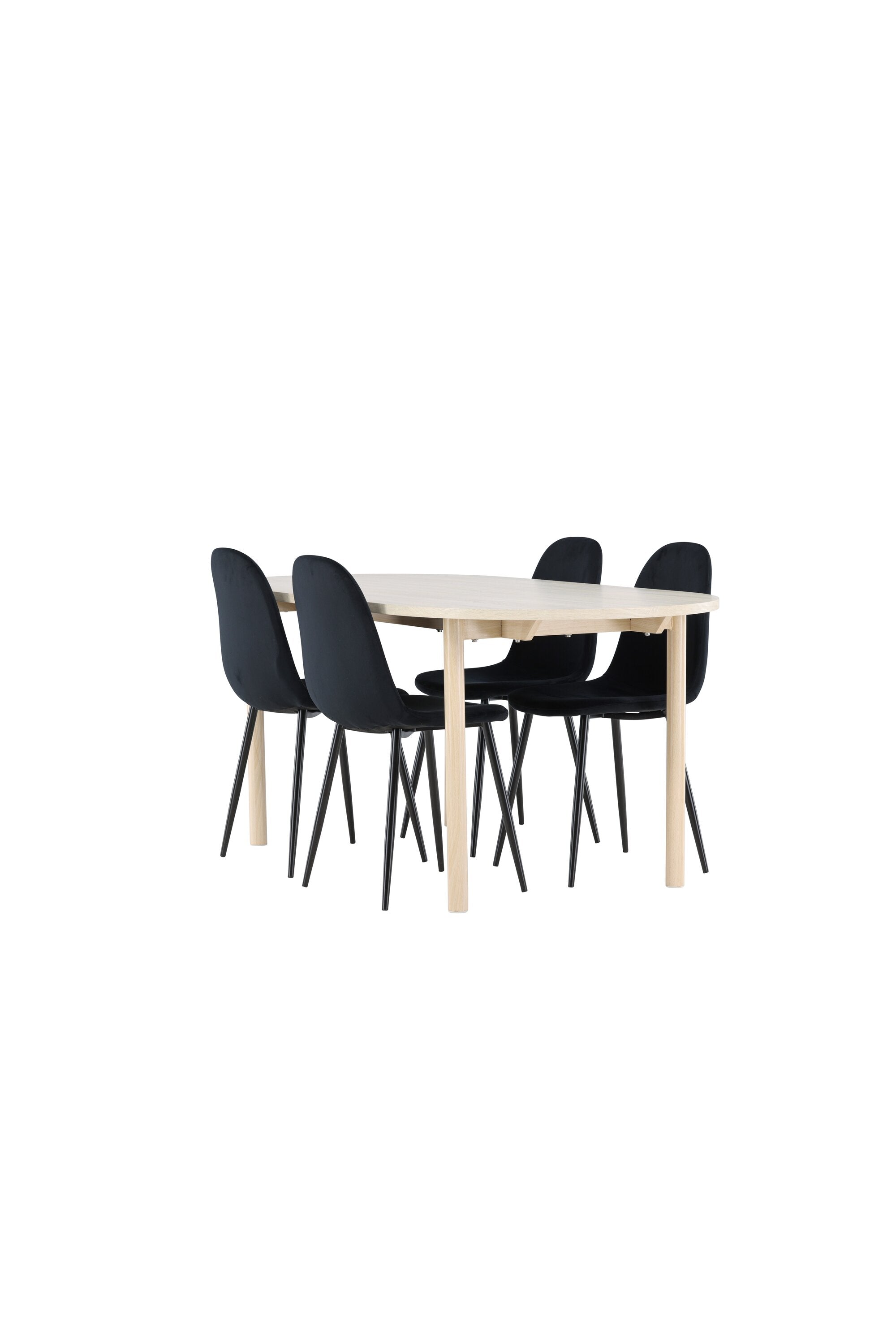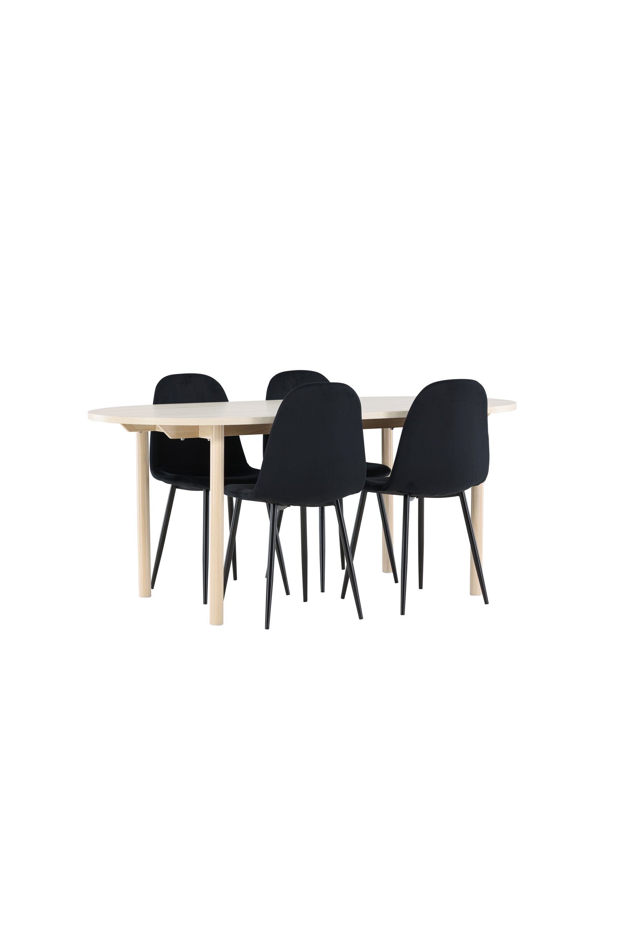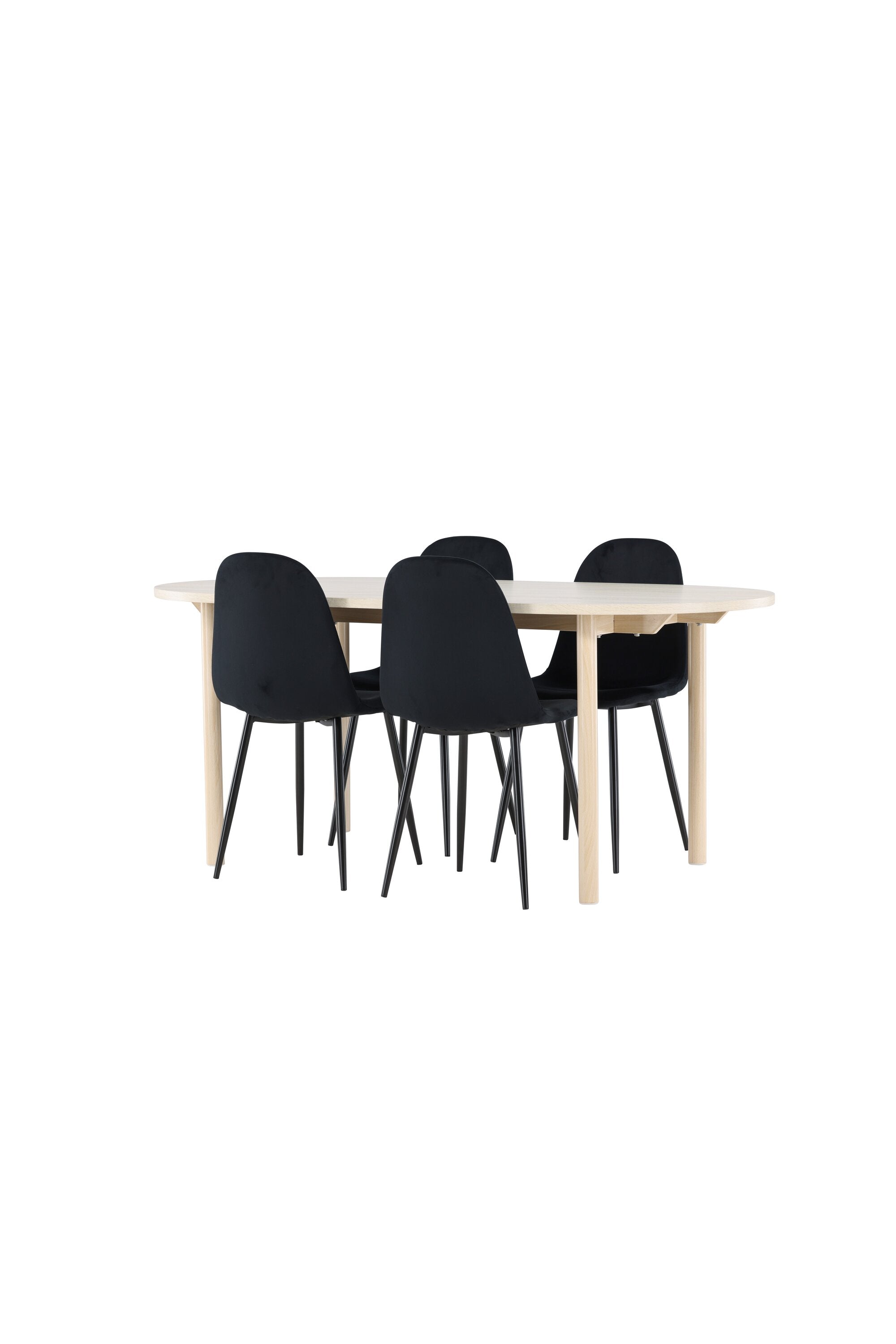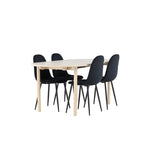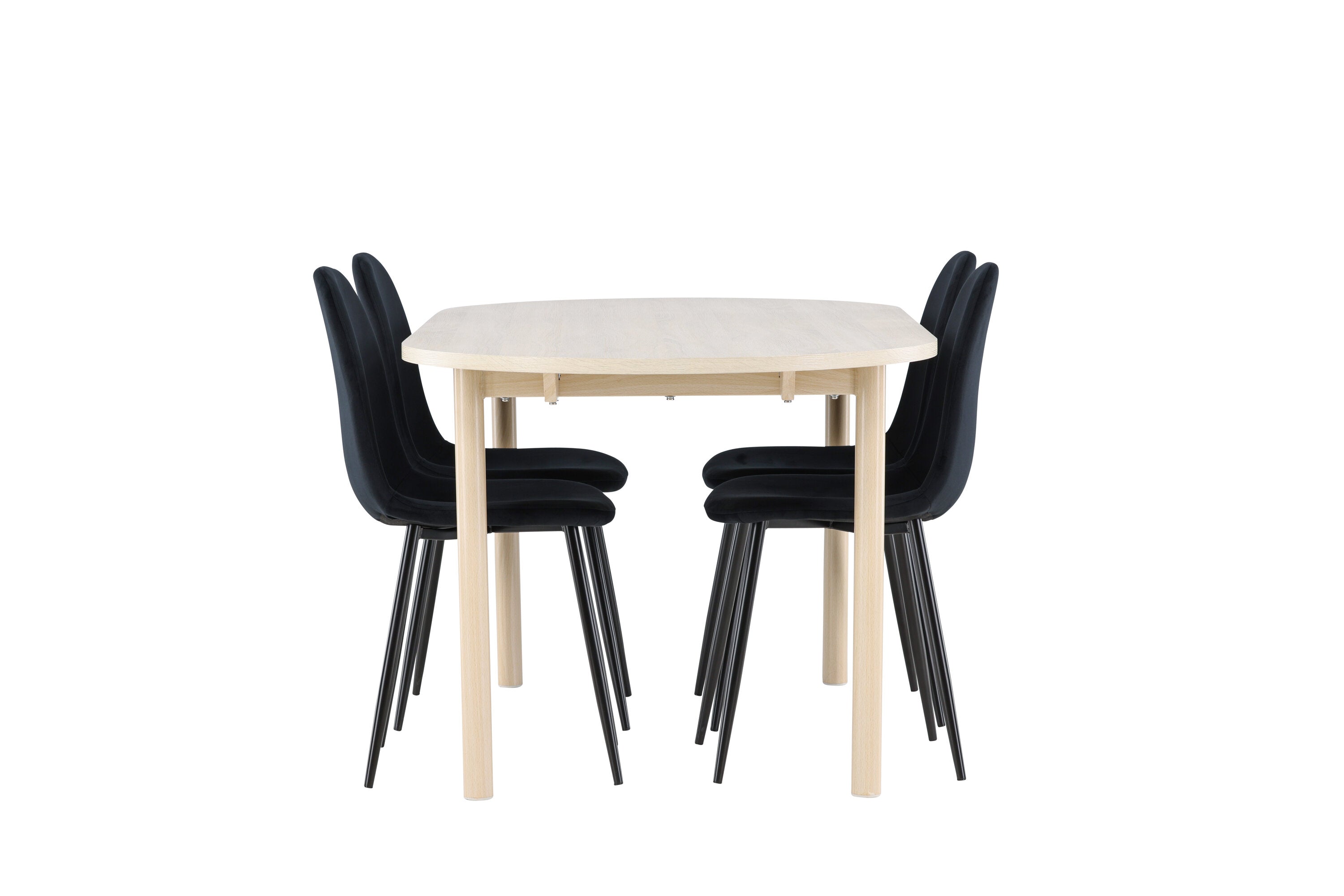 Objevte perfektní jídelní set pro váš domov s jídelním stolem Andy a jídelními židlemi Polar. Jídelní stůl Andy je nadčasový kousek, který se stává dokonalým místem pro společenské stolování. Díky své bílé barvě dodává Andy vaší jídelně nebo kuchyni zemitý a neutrální nádech. Ocelové nohy stolu a deska stolu z MDF kombinují štíhlost s robustností, což z něj dělá spolehlivý kus nábytku na mnoho let. Díky velkorysým rozměrům 180x90 cm je spousta místa pro rodinu a přátele, aby se sešli u stolu a vychutnali si dobré jídlo a dobrou společnost. Andy vytváří klidnou a uvolněnou atmosféru, která se perfektně hodí do různých stylů interiéru. Doplňte svůj jídelní stůl jídelními židlemi Polar, které nabízejí elegantní design v celočerné barvě. Polar má celočalouněný design s nohami z černého kovu s práškovým nástřikem a zaobleným opěradlem a sedákem z černé sametové látky s měkkým polstrováním. Tyto židle vám umožní vyhnout se kompromisům mezi pohodlím a designem. S jídelními židlemi Polar vytvoříte ve své jídelně moderní a elegantní atmosféru. Všimněte si, že samet má tendenci vytvářet otlaky, když se zdřímne položí, což může způsobit, že látka bude vypadat opotřebovaně. To je u tohoto typu materiálu zcela běžné a podle toho, jak dopadá světlo, se látka může posouvat v různých odstínech. Dodejte svému domovu nádech jednoduché elegance s jídelním stolem Andy a jídelními židlemi Polar – dokonalá kombinace pro vytvoření útulné atmosféry a příjemného prostředí pro všechna vaše jídla, ať už jde o každodenní jídlo nebo slavnostní příležitosti.