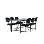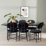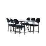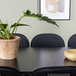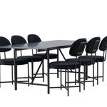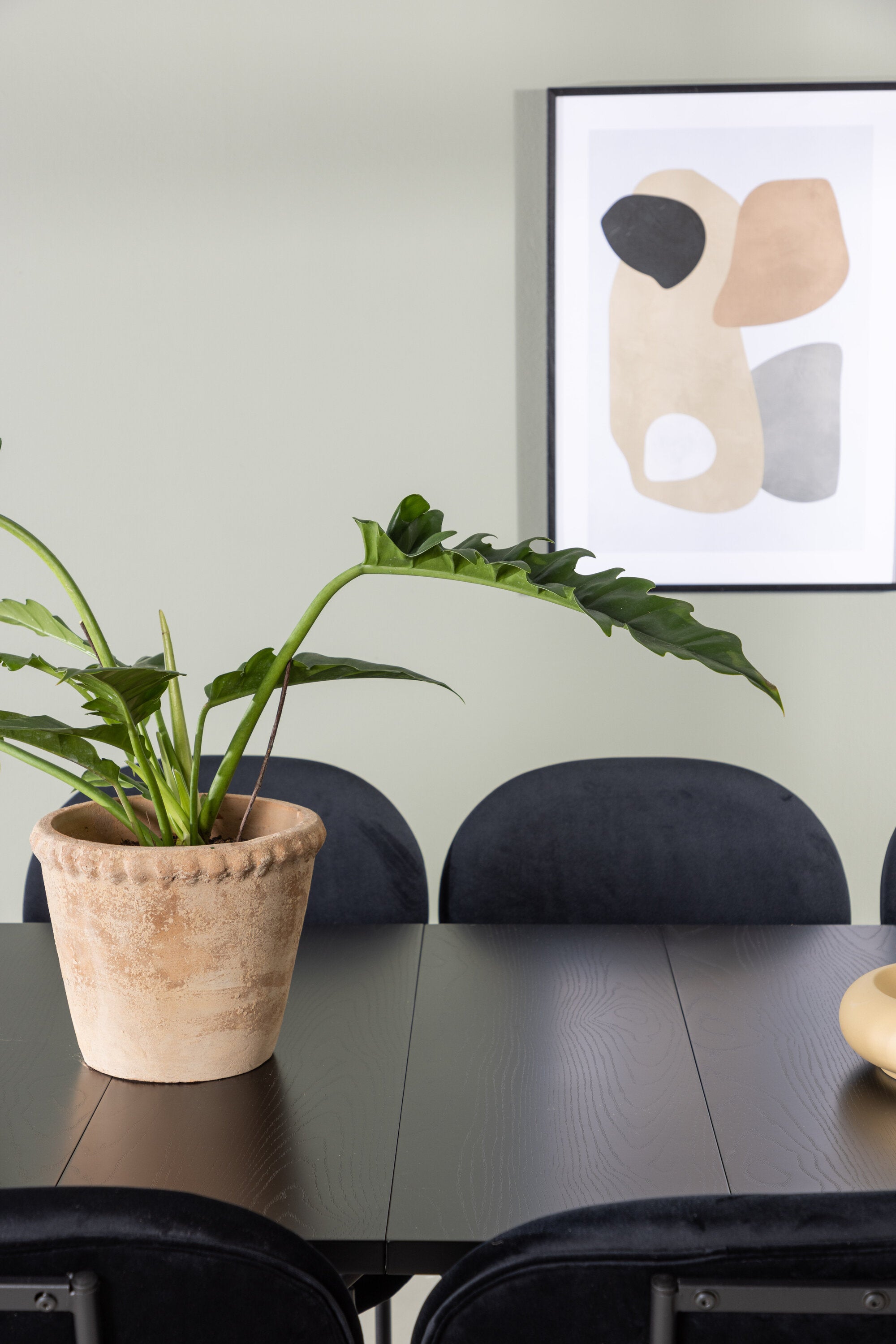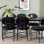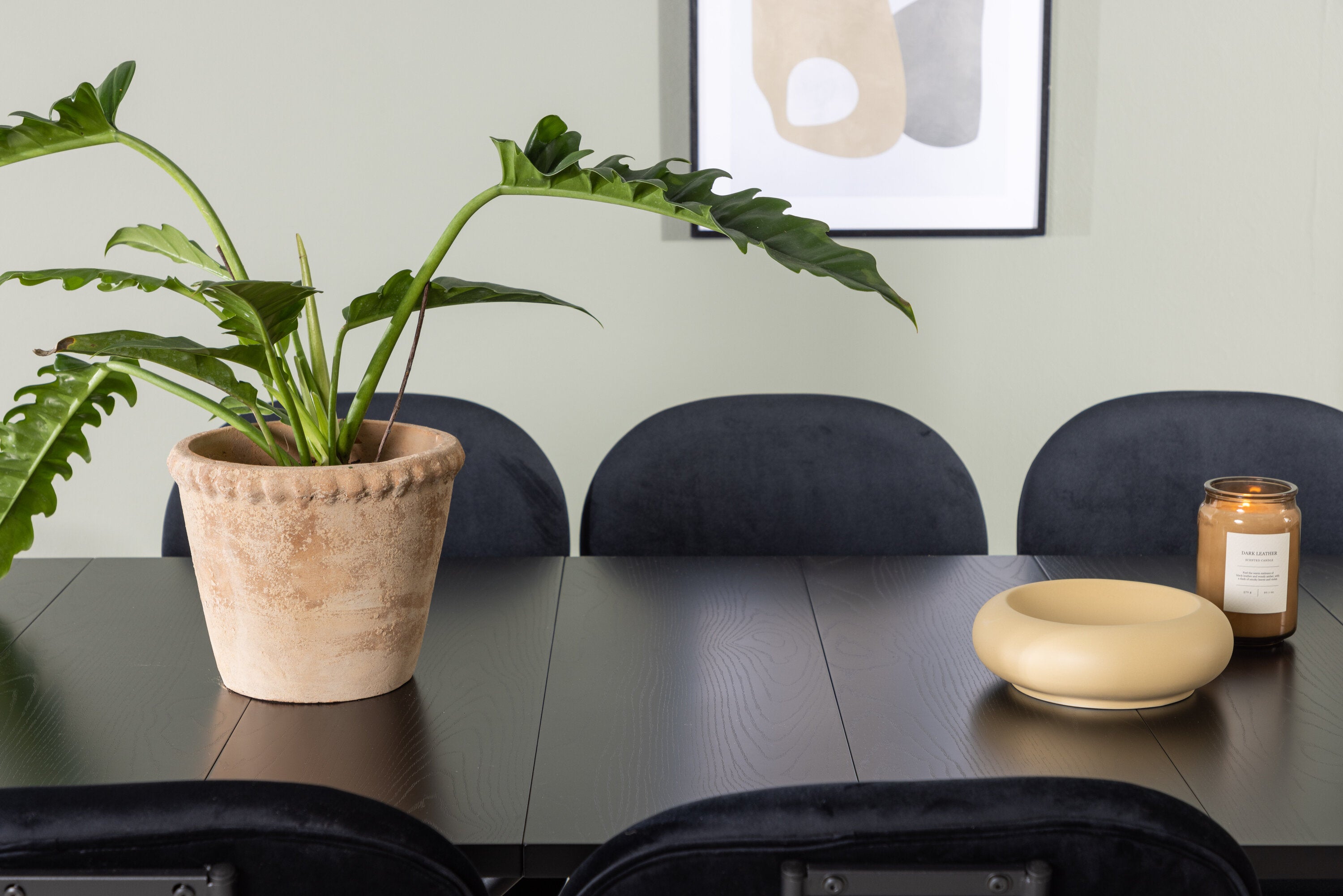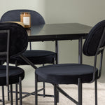 Zde jsme sladili černý jídelní stůl se stylovými jídelními židlemi Stella. Stella nabízí komfort a styl v jednom. Skandinávský design dodává židli trendy a moderní vzhled. S kulatým sedákem a opěradlem z černé sametové látky získáte luxusní pocit. Minimalistické nohy židle z černé oceli poskytují stylový kontrast a umocňují celkový elegantní zážitek.