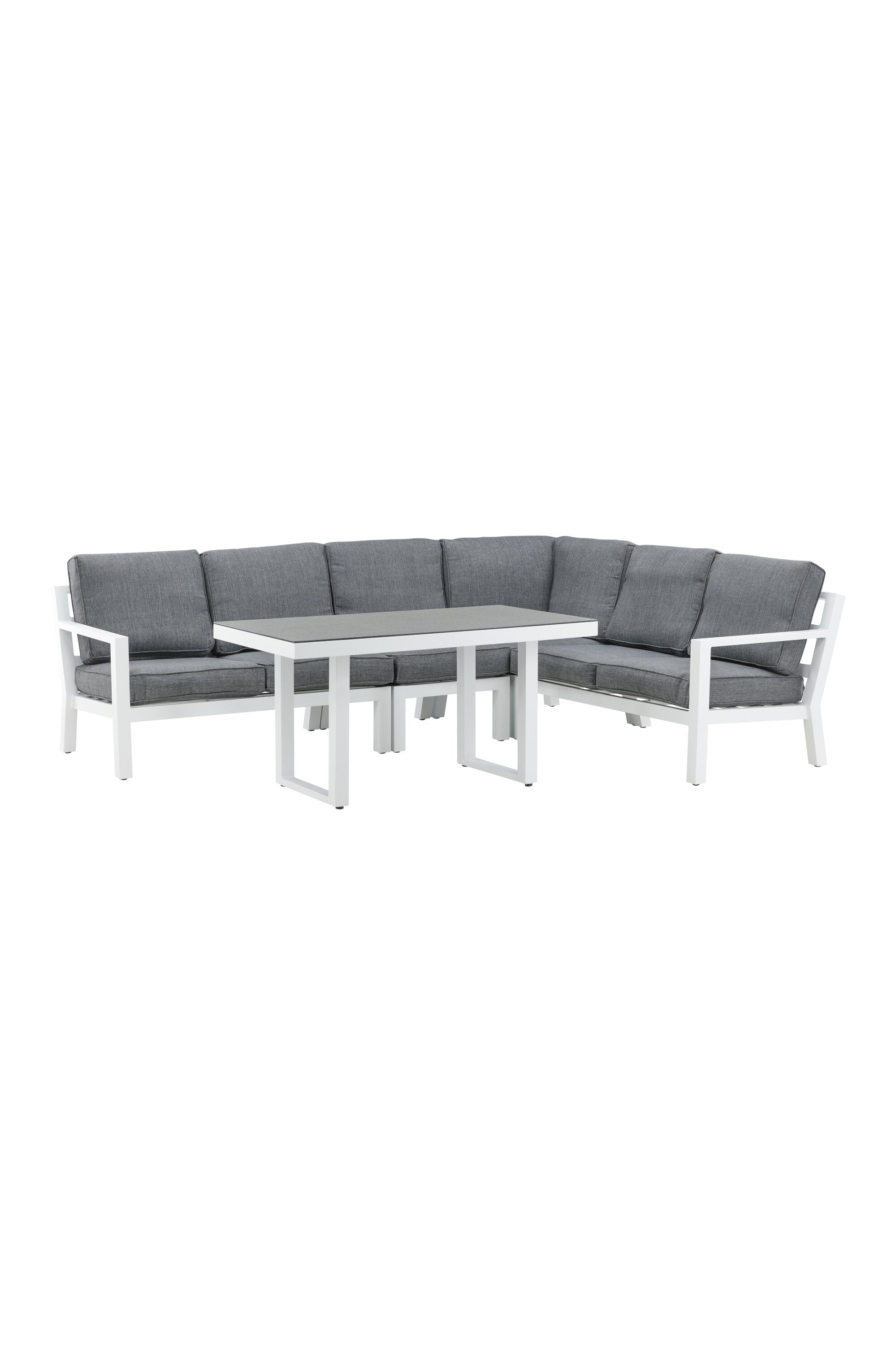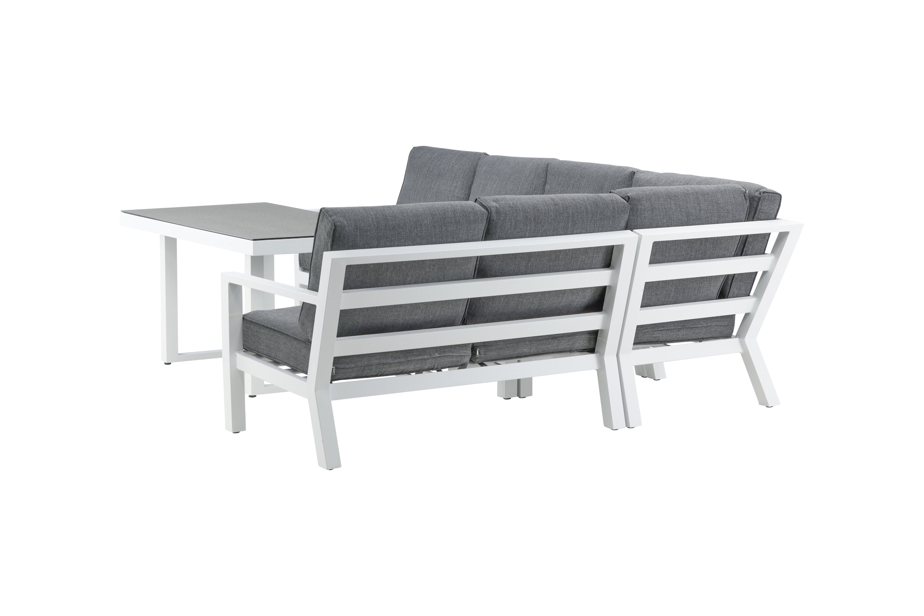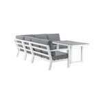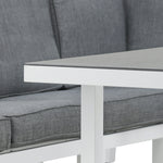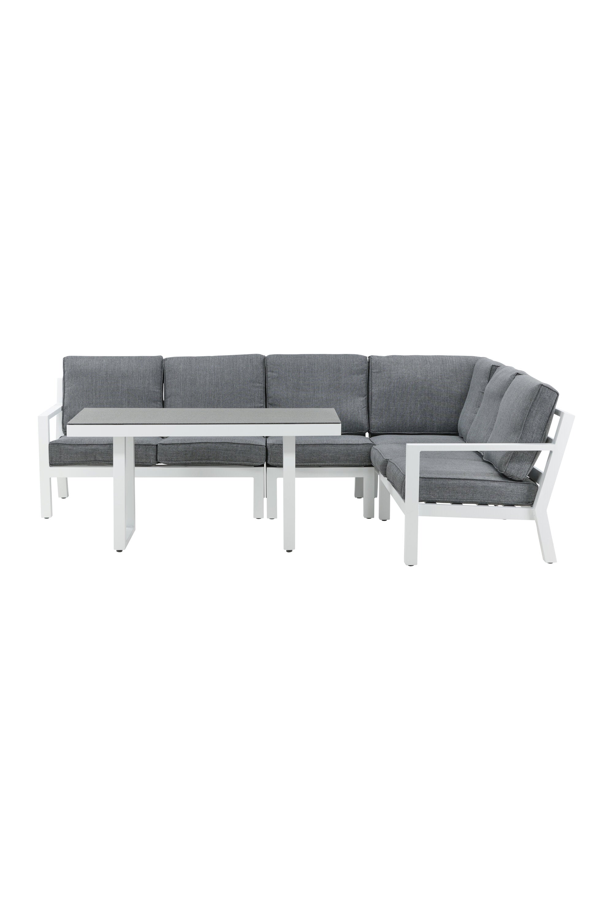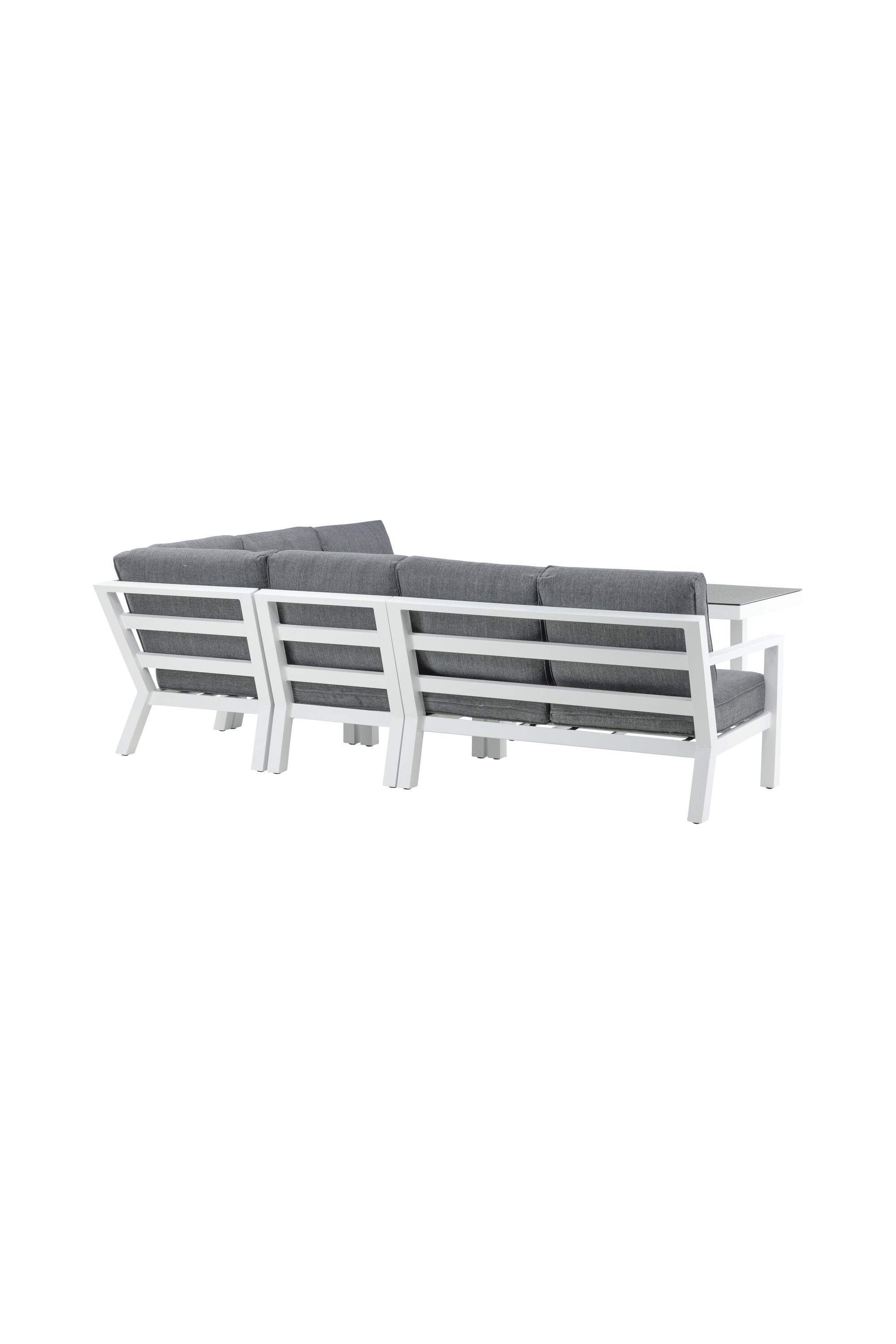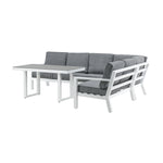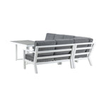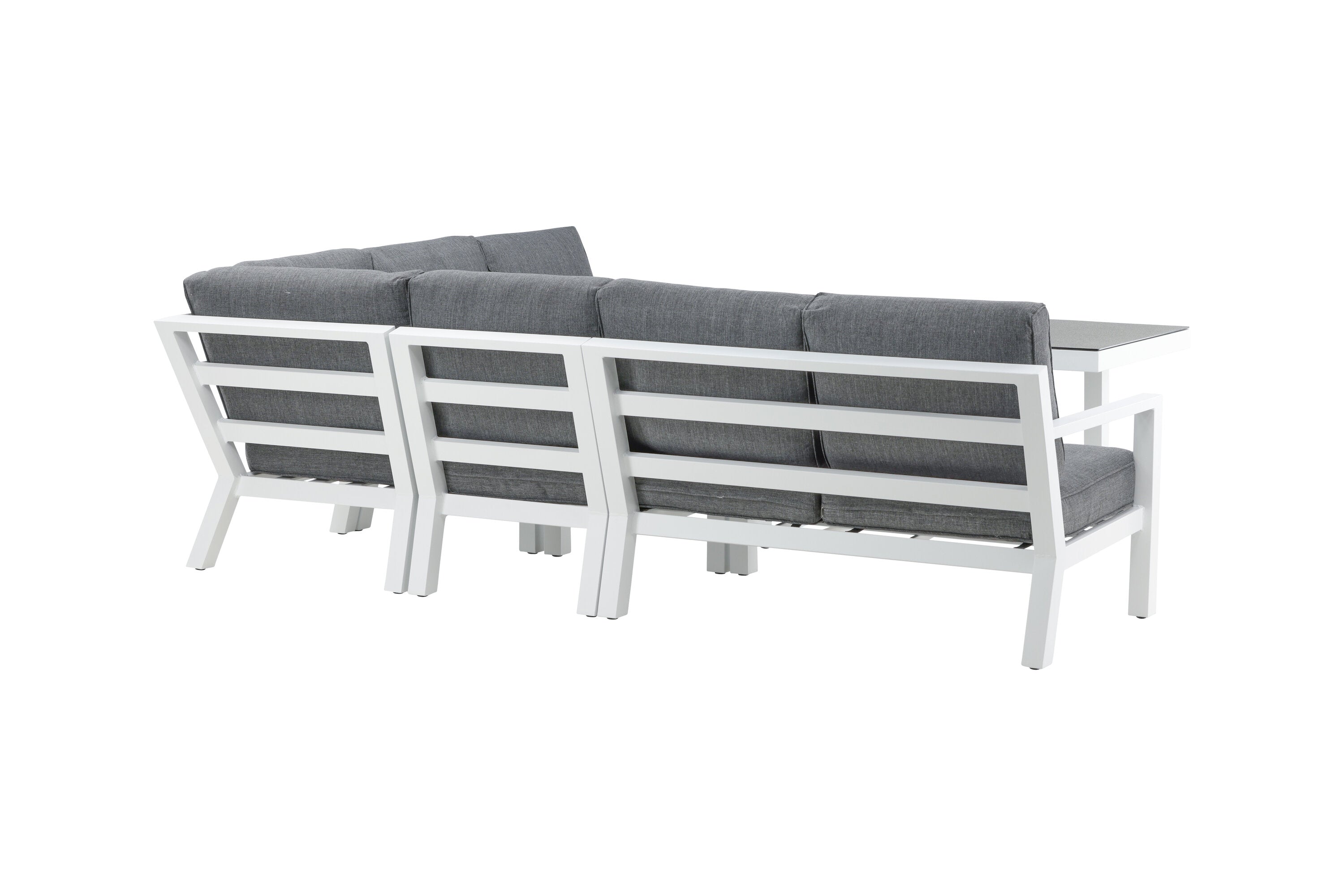 Vytvořte okouzlující středobod, kde se letos v létě shromáždíte na terase s rodinou a přáteli! Skupina pohovek Barcelona je pěkná a stylová skupina v bílém hliníku s přidruženými stolky, které ladí se skleněnou horní deskou. Součástí jsou odolné polštáře v černé barvě. Rozměry stolu: 140x75x68,5 cm. Rozměr pohovky: 267x254 cm. ROZMĚRY: 254x55x31 cm. Není nutná žádná montáž. Zlikvidujte odpolední kávu a vychutnejte si - zde můžete pohodlně sedět a relaxovat celé hodiny!