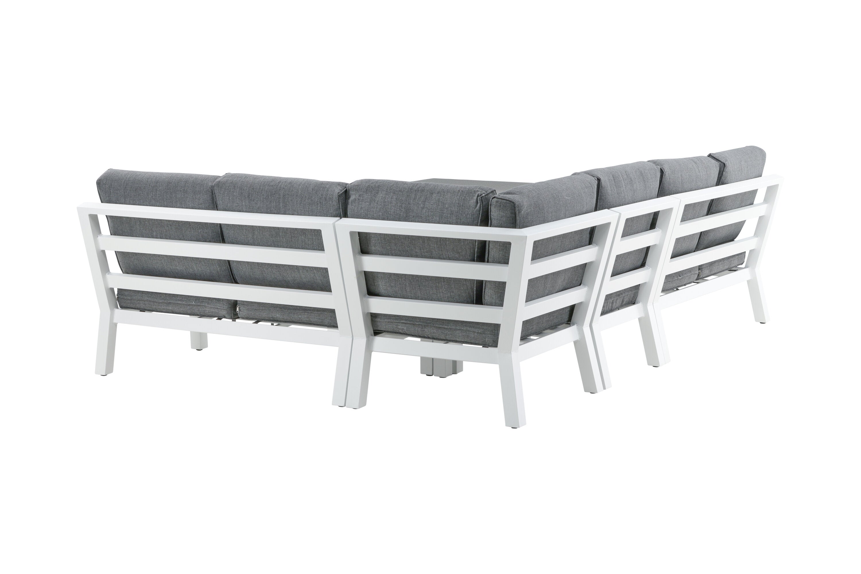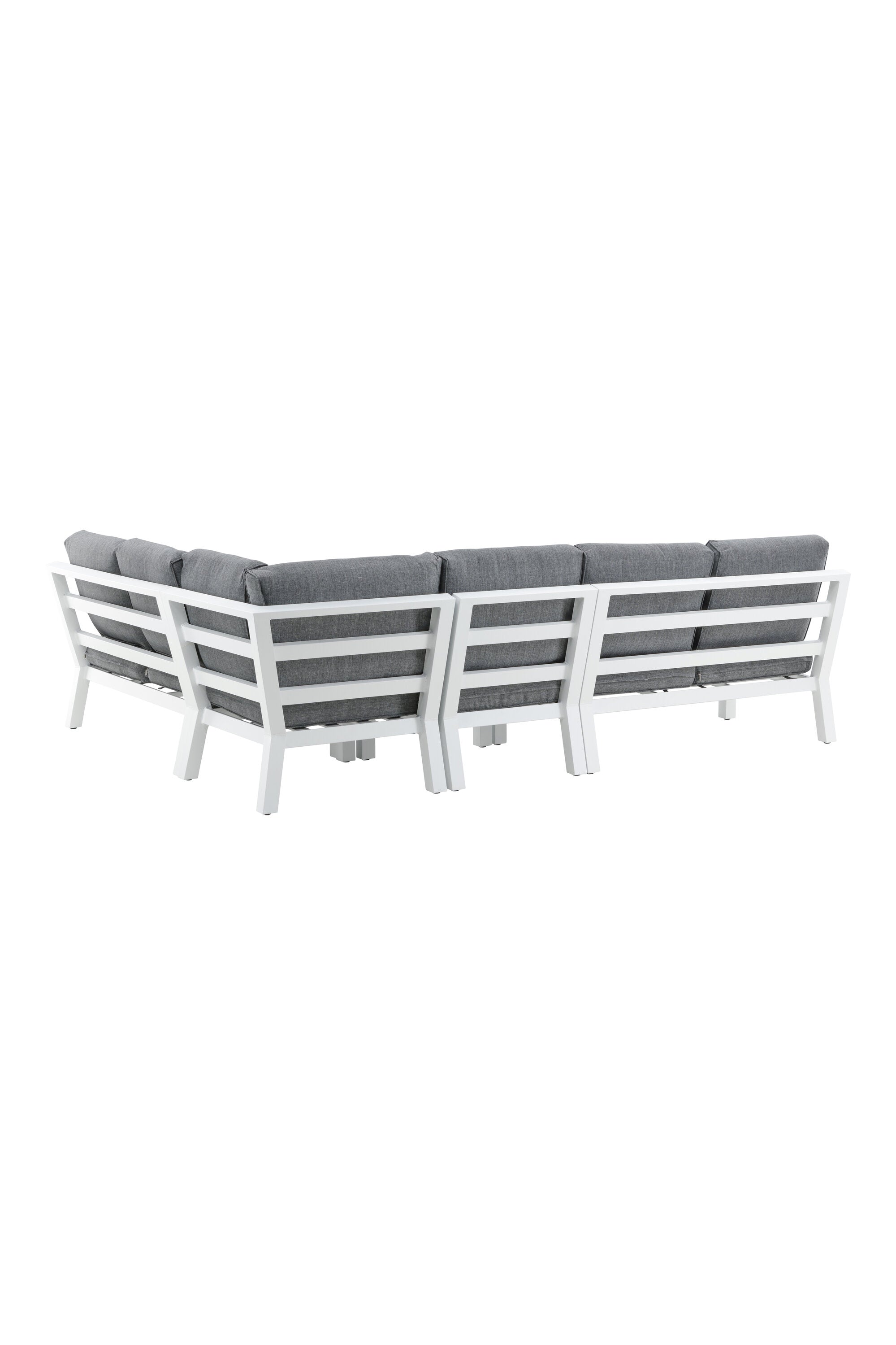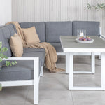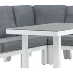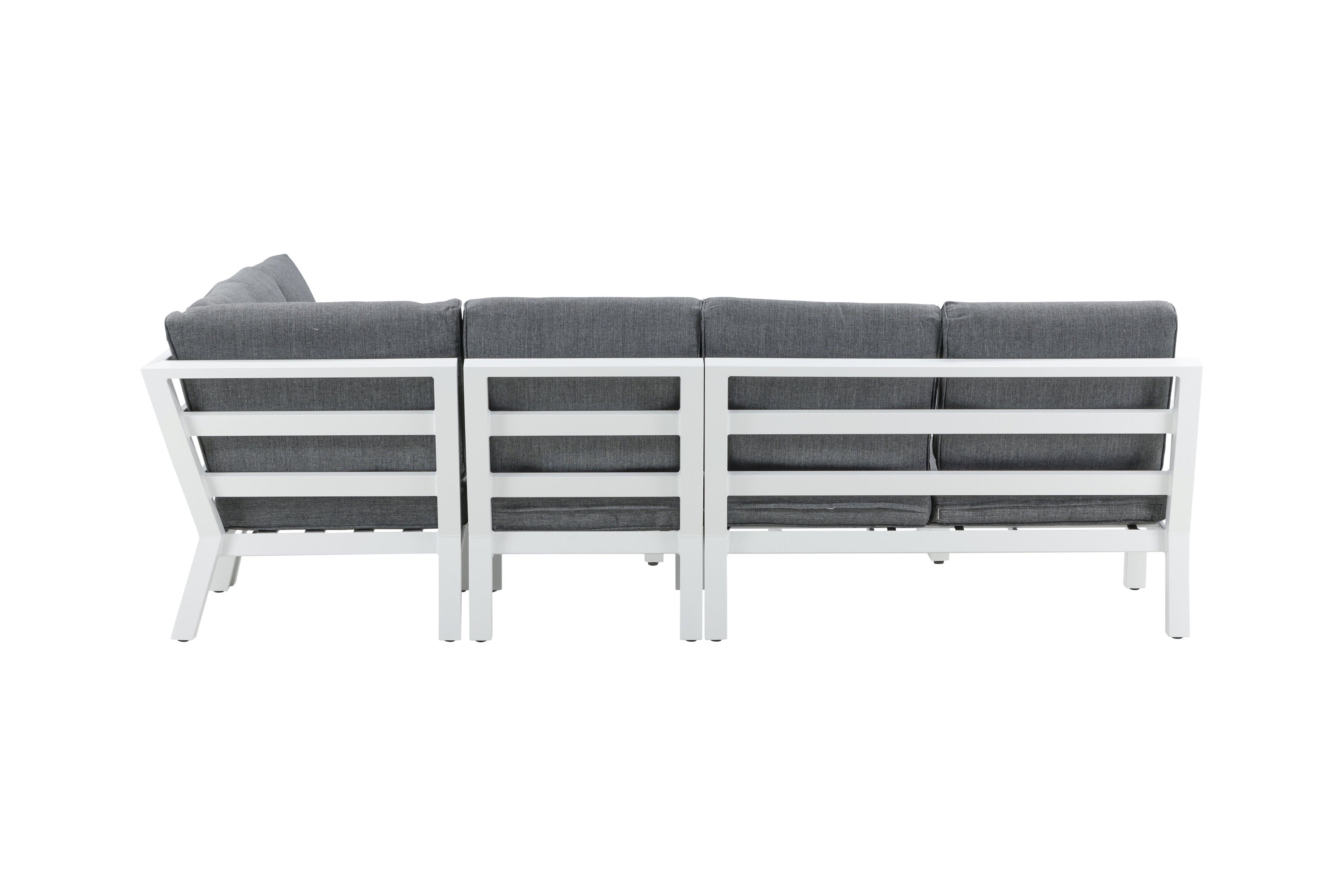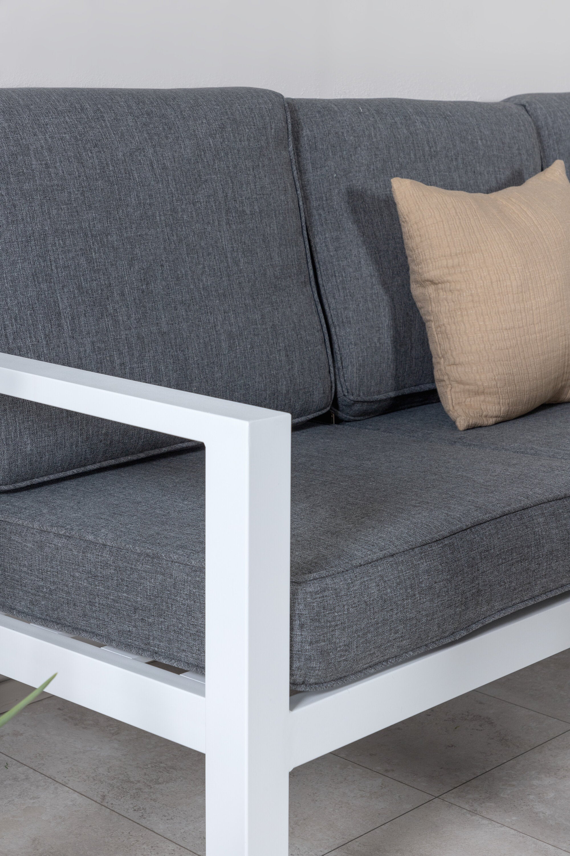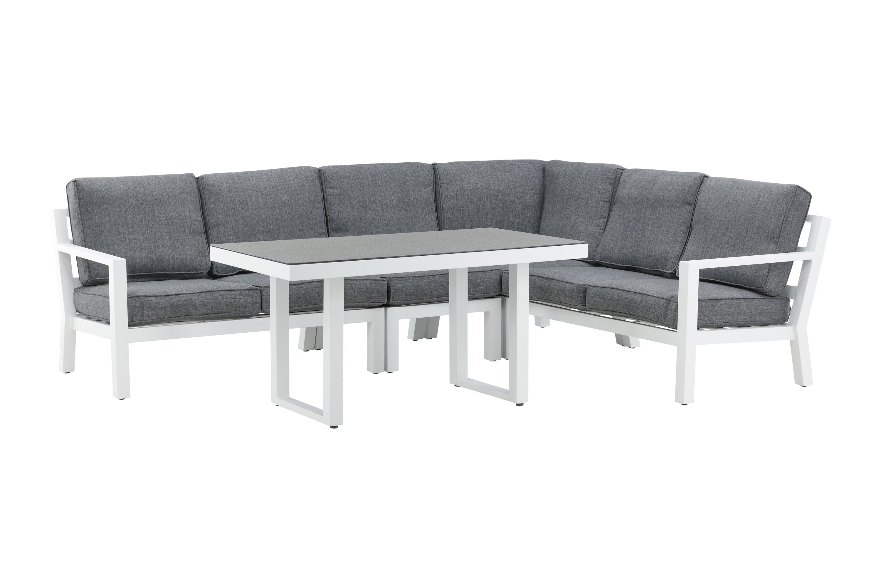 Vytvořte okouzlující středobod, kde se letos v létě shromáždíte na terase s rodinou a přáteli! Skupina pohovek Barcelona je pěkná a stylová skupina v bílém hliníku s přidruženými stolky, které ladí se skleněnou horní deskou. Součástí jsou odolné polštáře v černé barvě. Rozměry stolu: 140x75x68,5 cm. Rozměr pohovky: 267x254 cm. ROZMĚRY: 254x55x31 cm. Není nutná žádná montáž. Zlikvidujte odpolední kávu a vychutnejte si - zde můžete pohodlně sedět a relaxovat celé hodiny!