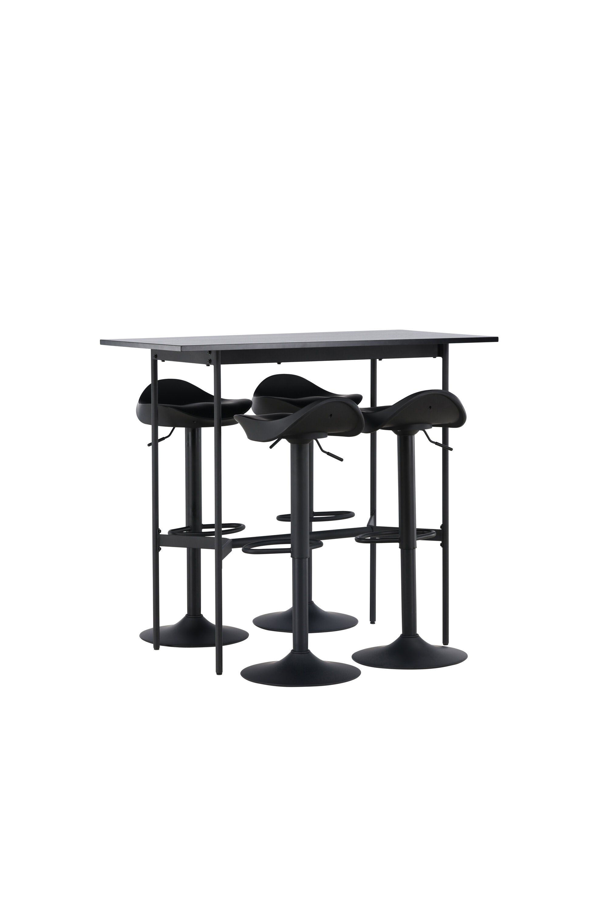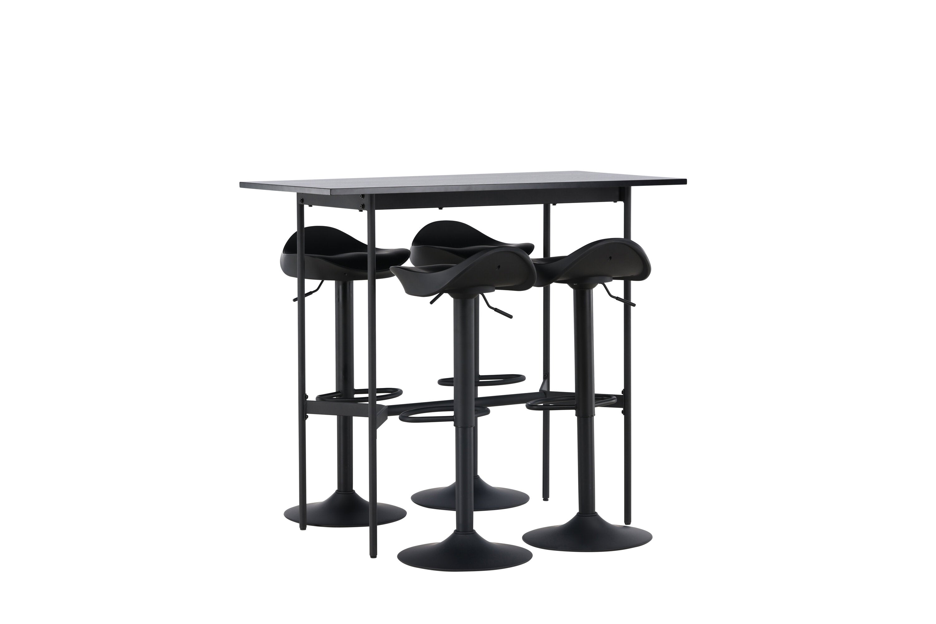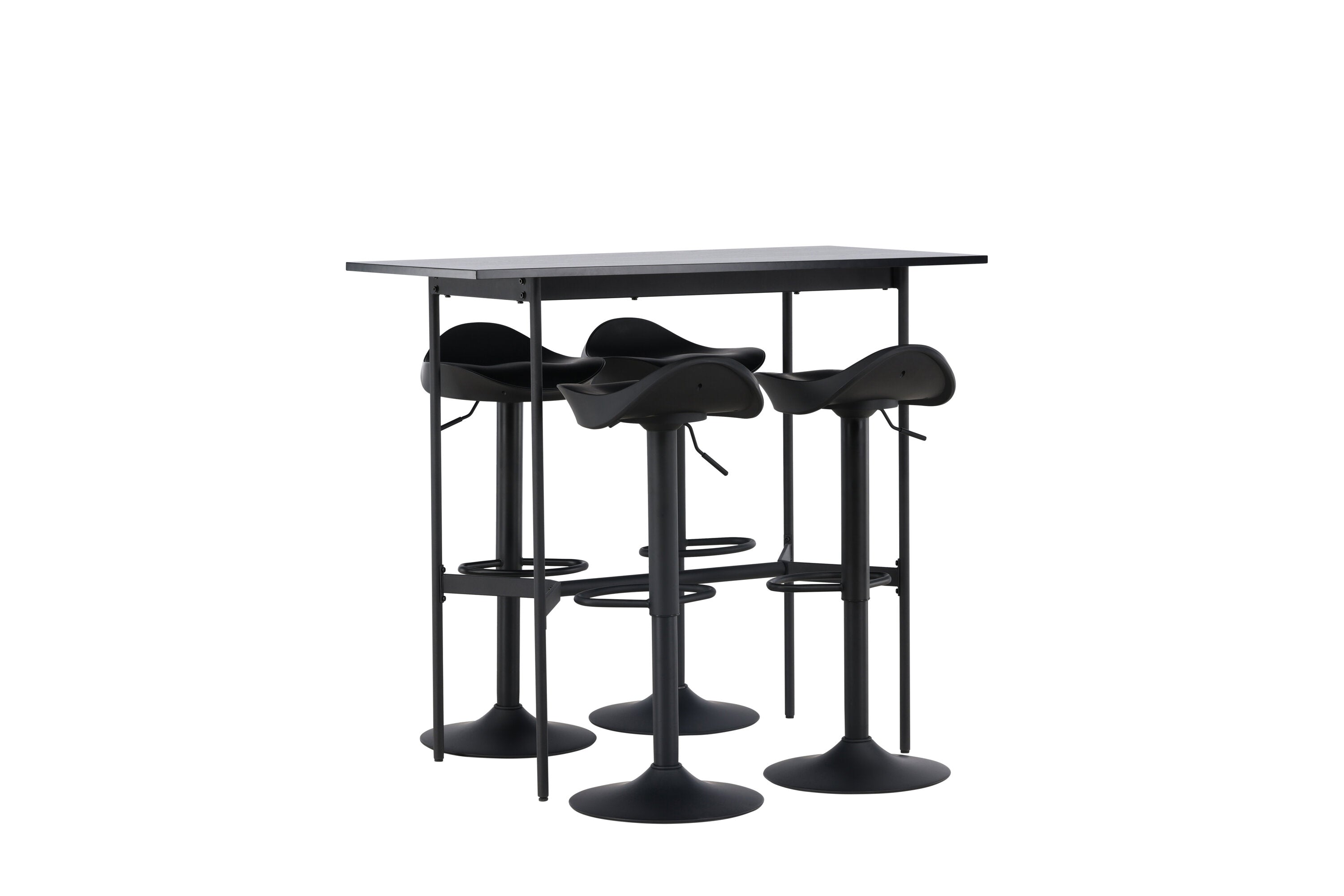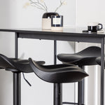 Vzdušné a stylové! Minimalistický barový stůl Rax má tenkou desku z černé MDF a úzké nohy stolu s integrovanou podnožkou v černém kovu. Zde společně s klasickými, černými barovými židlemi ze série Adesto. Židle má stylový design s trumpetovou nohou z černé oceli a jednoduchým sedákem z černého plastu. Spojte minimalismus s nadčasovým designem! Rozměry stolu: 120x60cm.