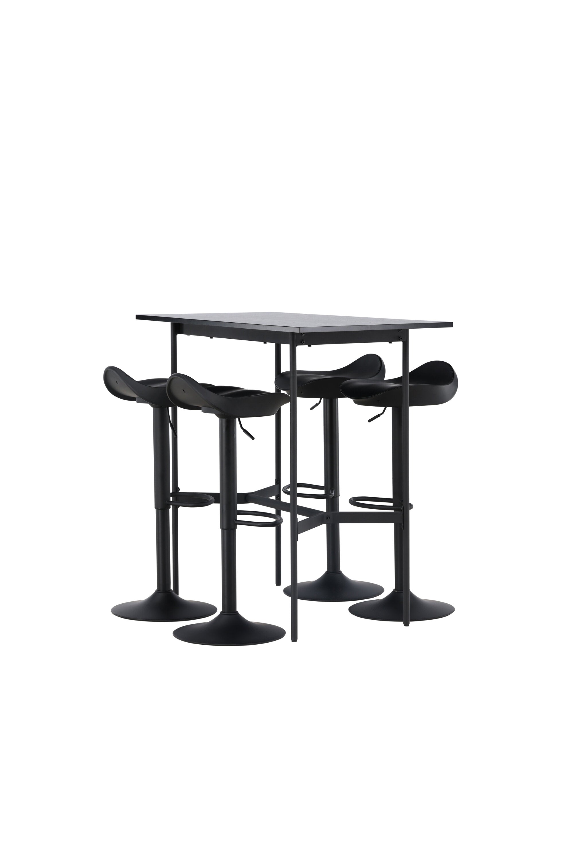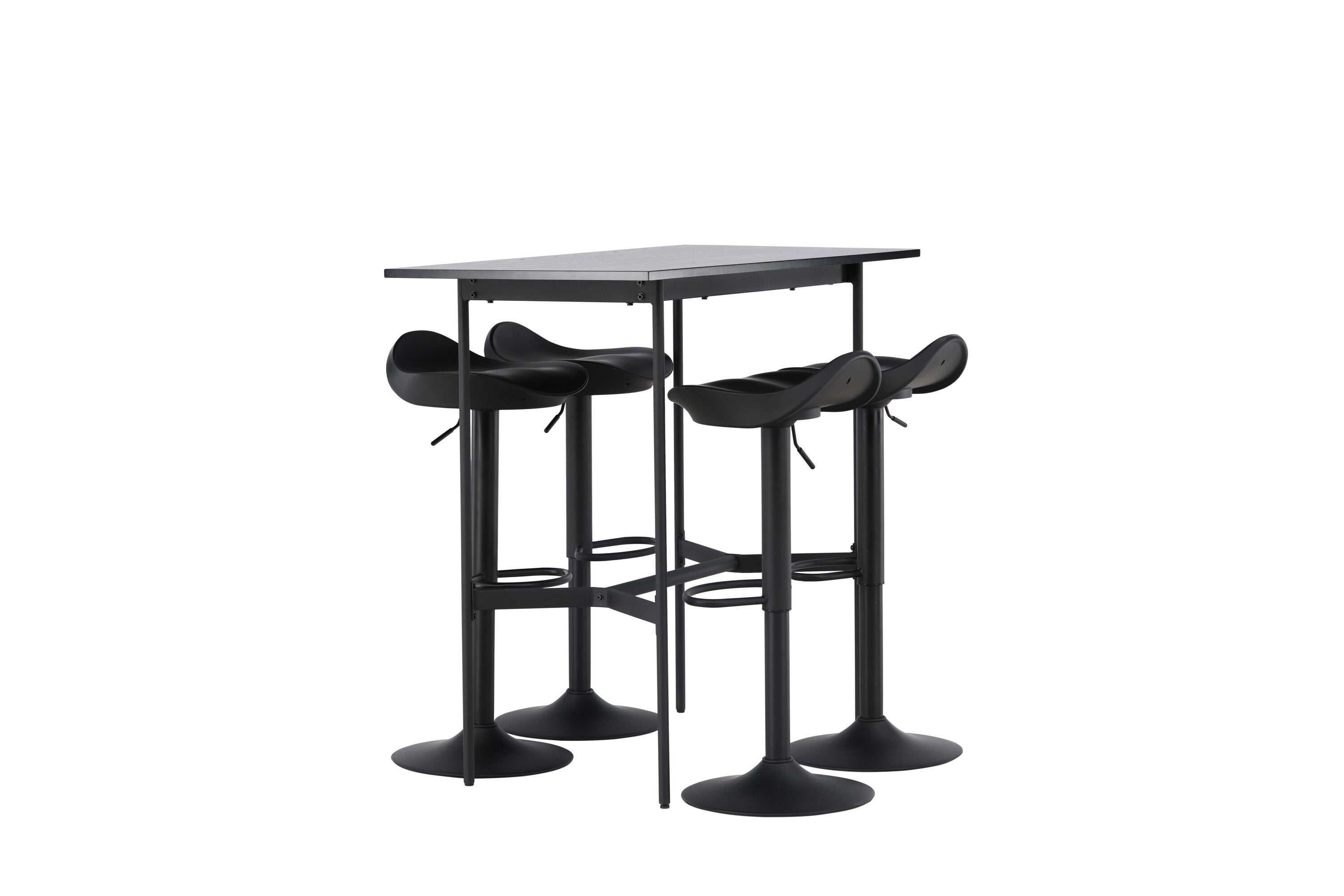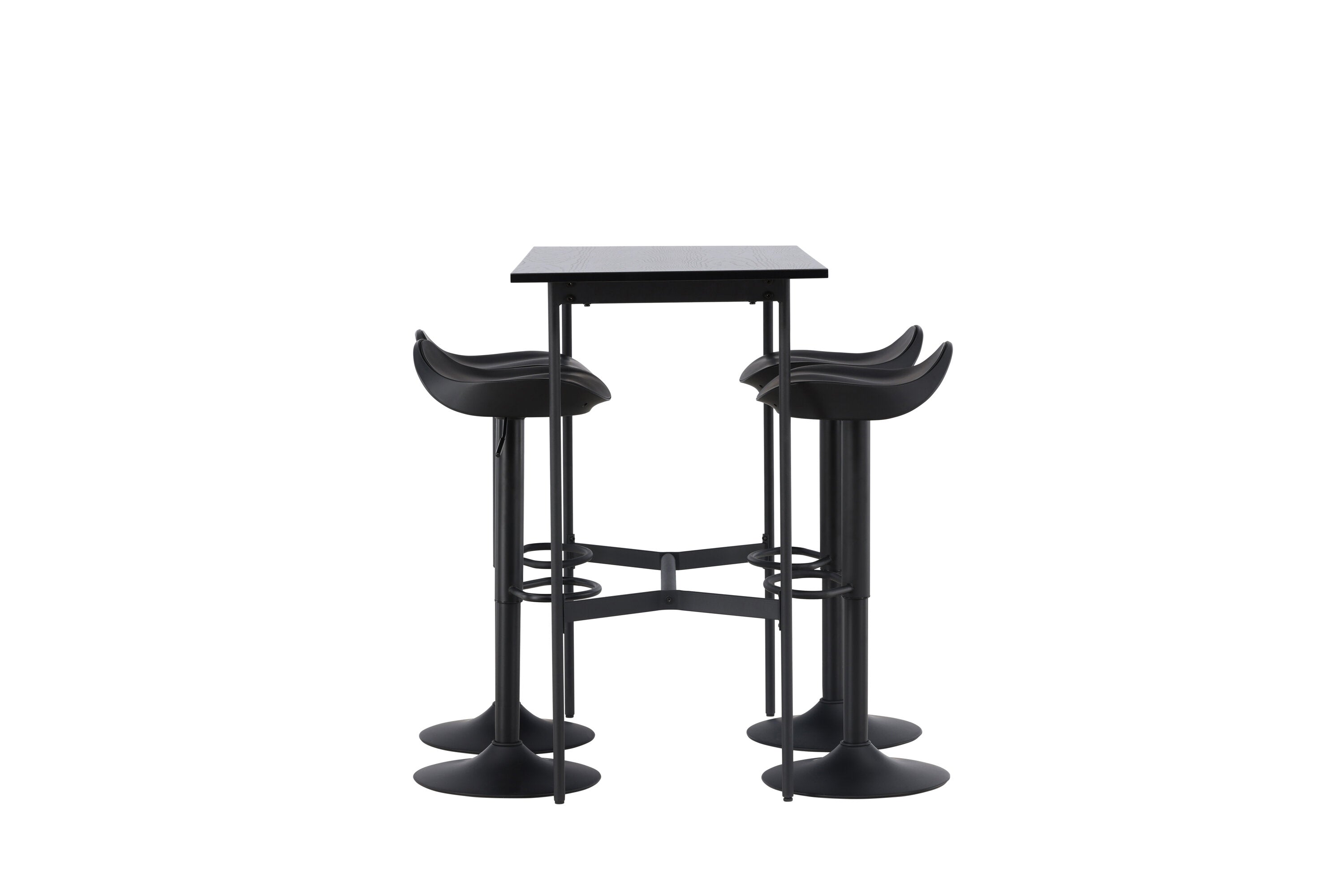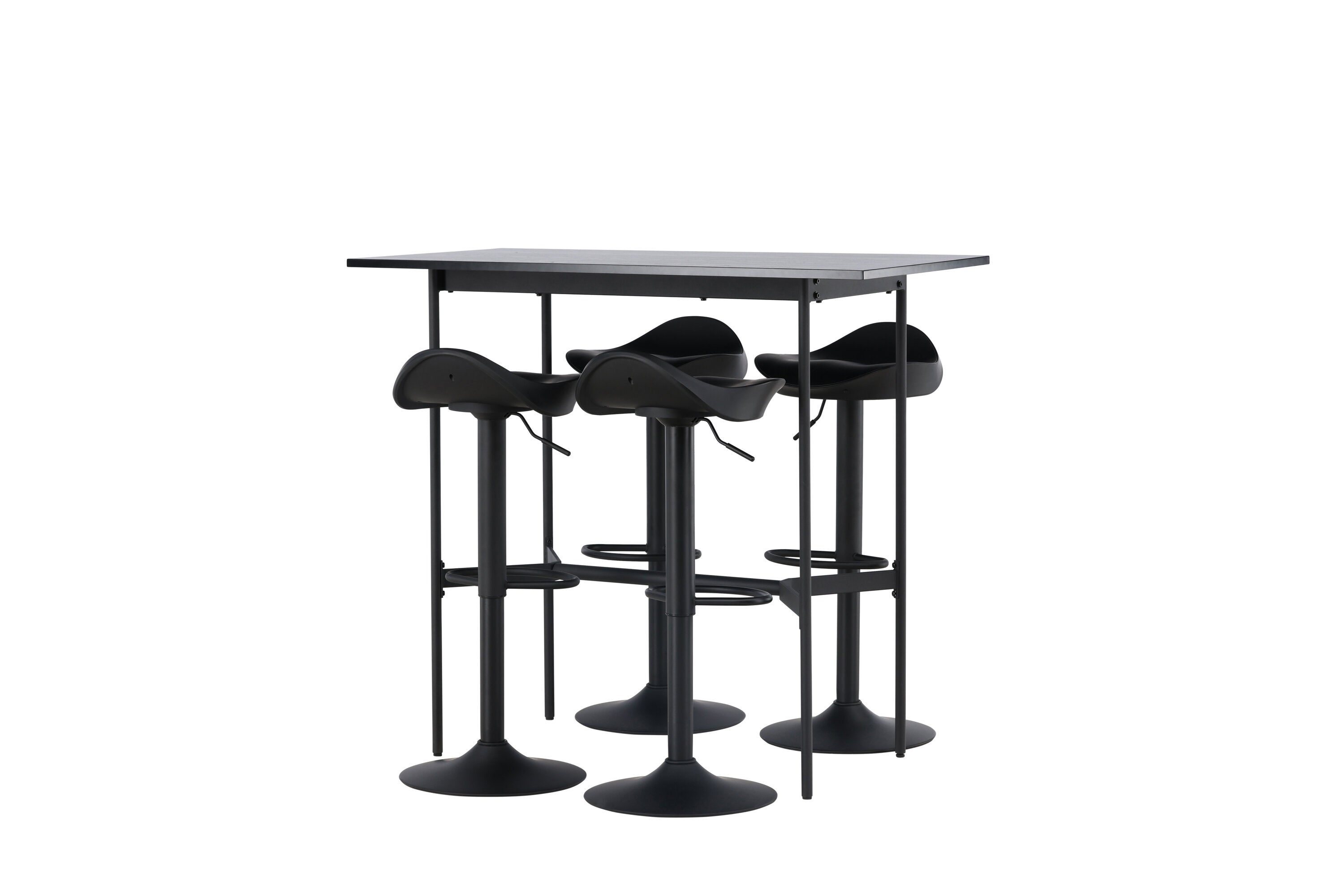 Vzdušné a stylové! Minimalistický barový stůl Rax má tenkou desku z černé MDF a úzké nohy stolu s integrovanou podnožkou v černém kovu. Zde společně s klasickými, černými barovými židlemi ze série Adesto. Židle má stylový design s trumpetovou nohou z černé oceli a jednoduchým sedákem z černého plastu. Spojte minimalismus s nadčasovým designem! Rozměry stolu: 120x60cm.