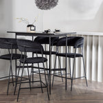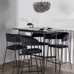 Nedělejte kompromisy mezi stylem a pohodlím! Minimalistický barový stůl Rax má tenkou desku z černé MDF a úzké nohy stolu s integrovanou podnožkou v černém kovu. Zde ve stylové kombinaci s pohodlnými barovými židlemi ze série Lui. Židle má celočalouněný design s mírně zaobleným opěradlem a sedákem z umělé kůže se stylovými ozdobnými švy a úzké nohy židle v černé oceli s integrovanou podnožkou - zaručeně stylové i pohodlné. Rozměry stolu: 120x60cm.