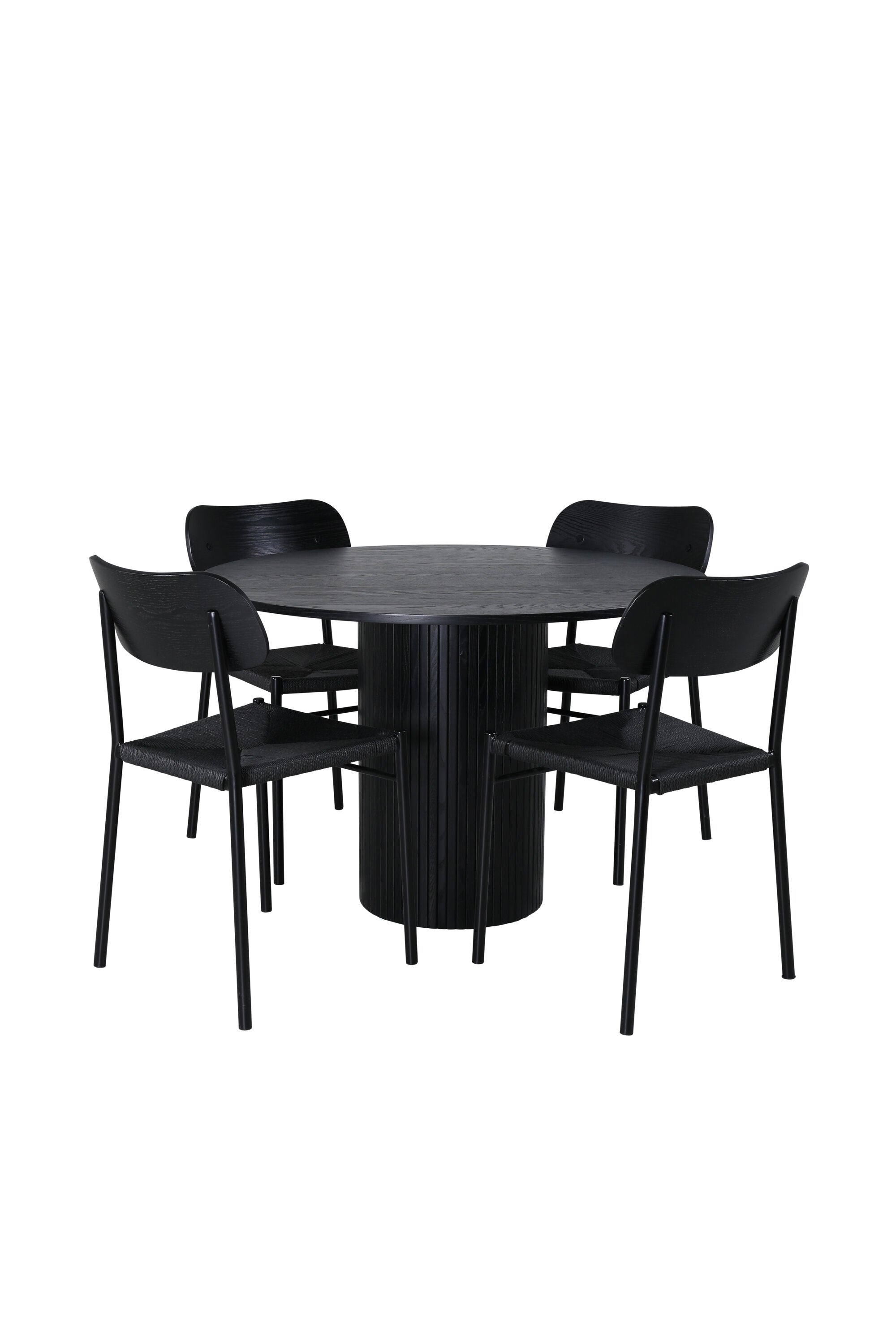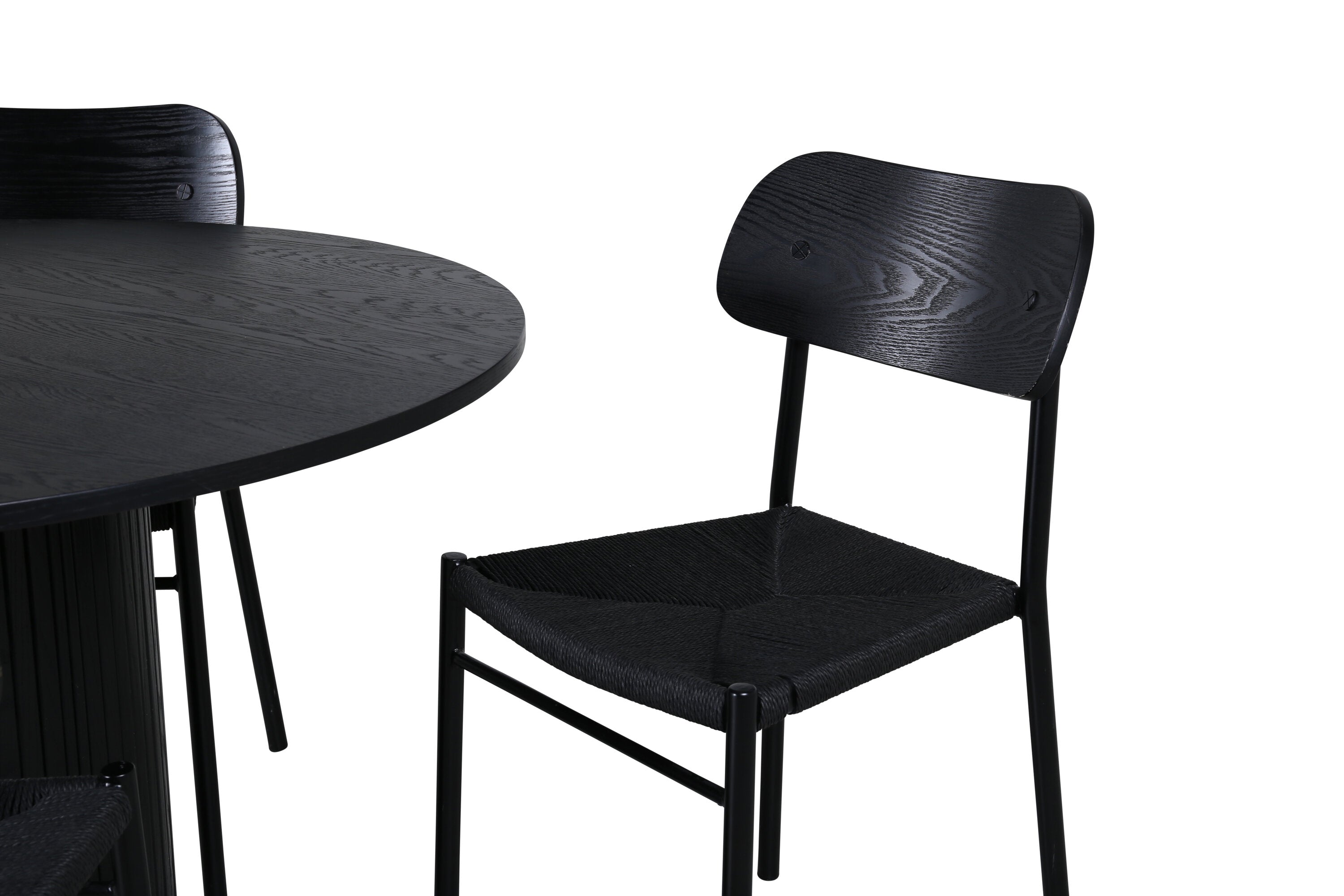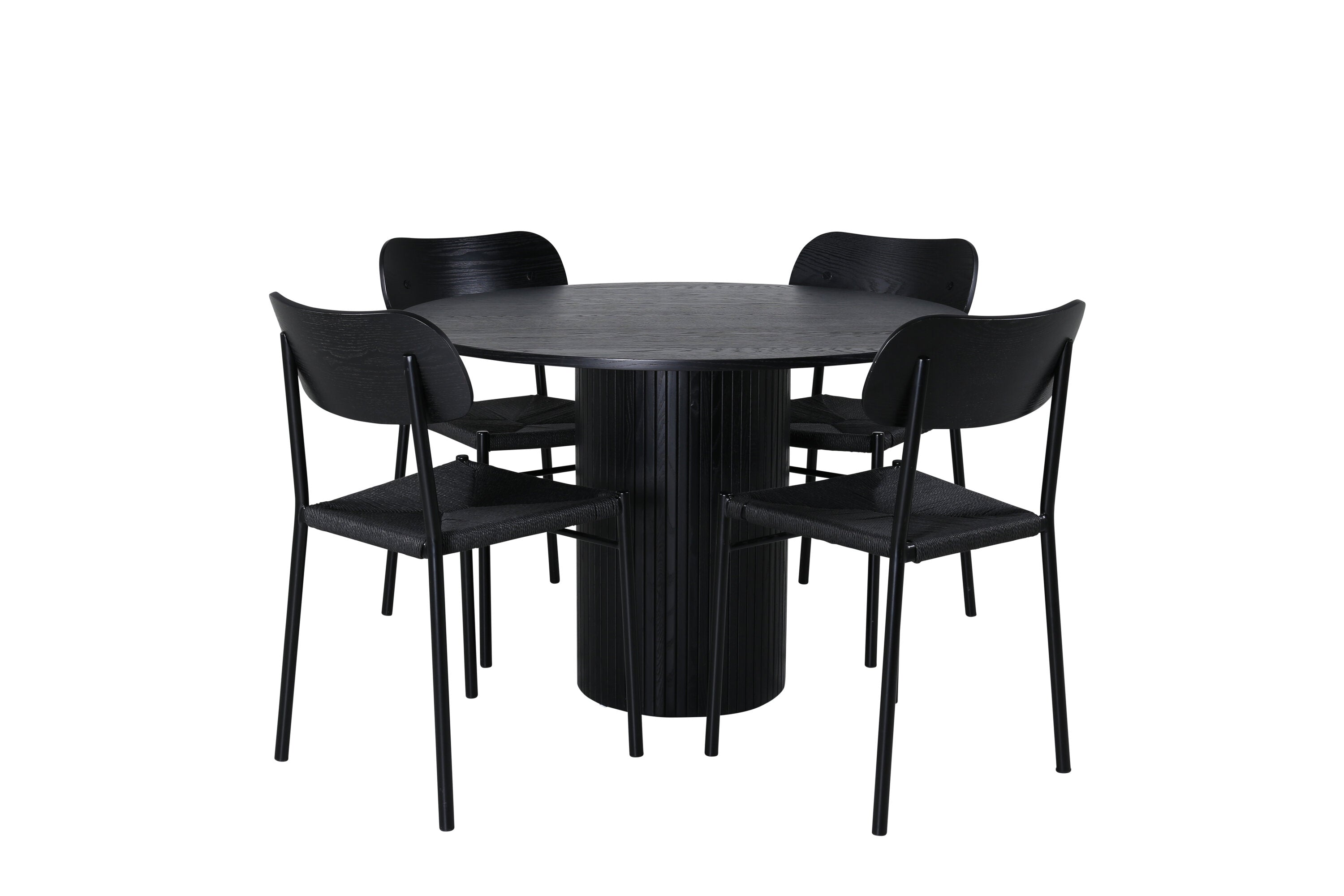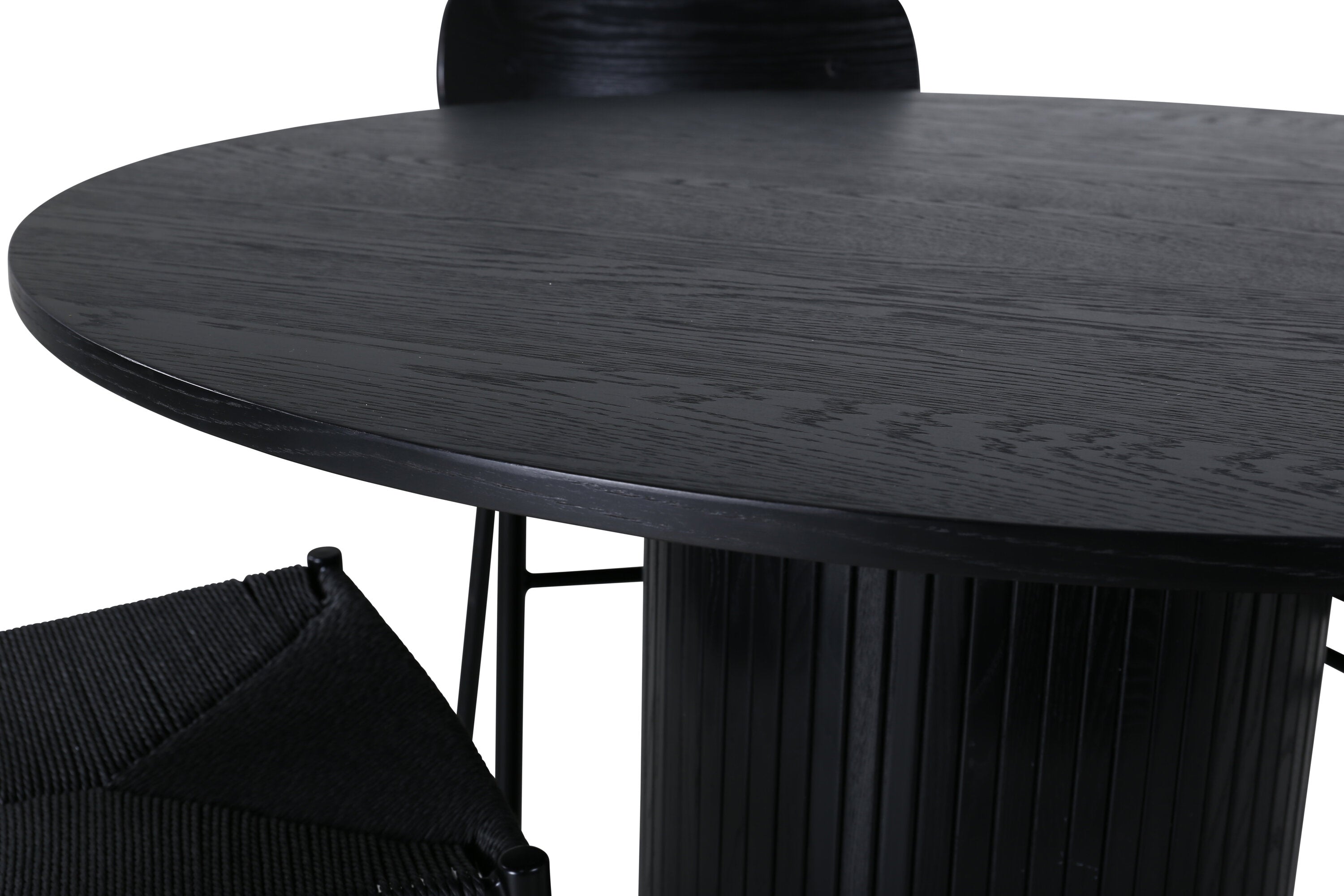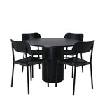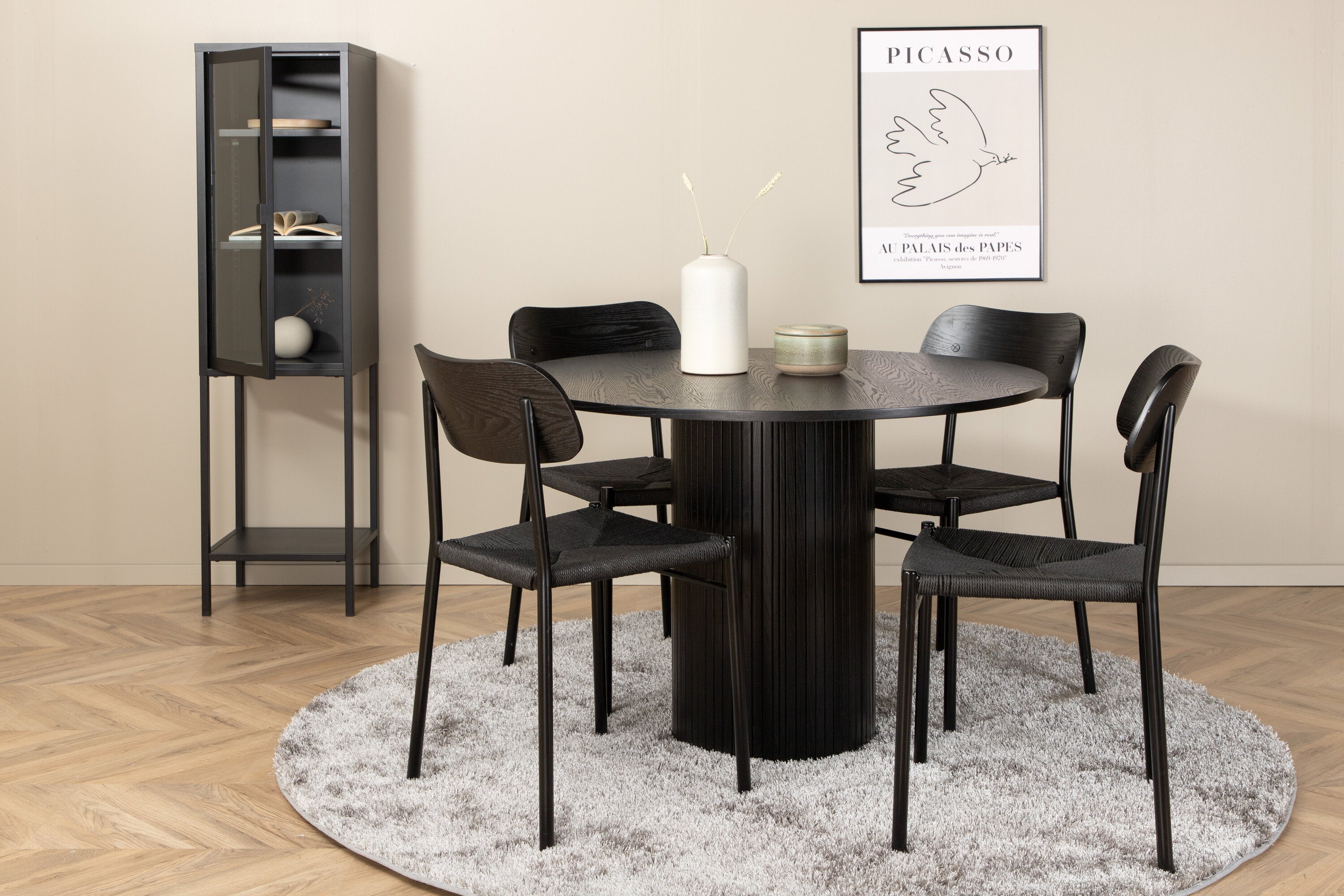 Lahodná sladká skupina potravin v moderním designu – co víc si přát? Kolem našeho kulatého jídelního stolu Bianca vytvoříte úžasnou komunitu, kde nikdo neriskuje, že se dostane na okraj. Deska stolu je vyrobena z MDF a má válcový rám v robustním provedení a žebrovaném provedení. Konzistentně černá barva je nadčasová i stylová a lze ji snadno sladit s jiným dekorem. Rozměry stolu: Průměr: 110 cm, Výška: 74 cm. V kombinaci se 4 jídelními židlemi Polly v černé barvě s kovovými nohami židlí a černými sedáky z provazu. Rozměry židle: výška: 88 cm, výška sedáku: 47 cm, šířka: 42 cm, hloubka: 55 cm. Užijte si všechna jídla dne!