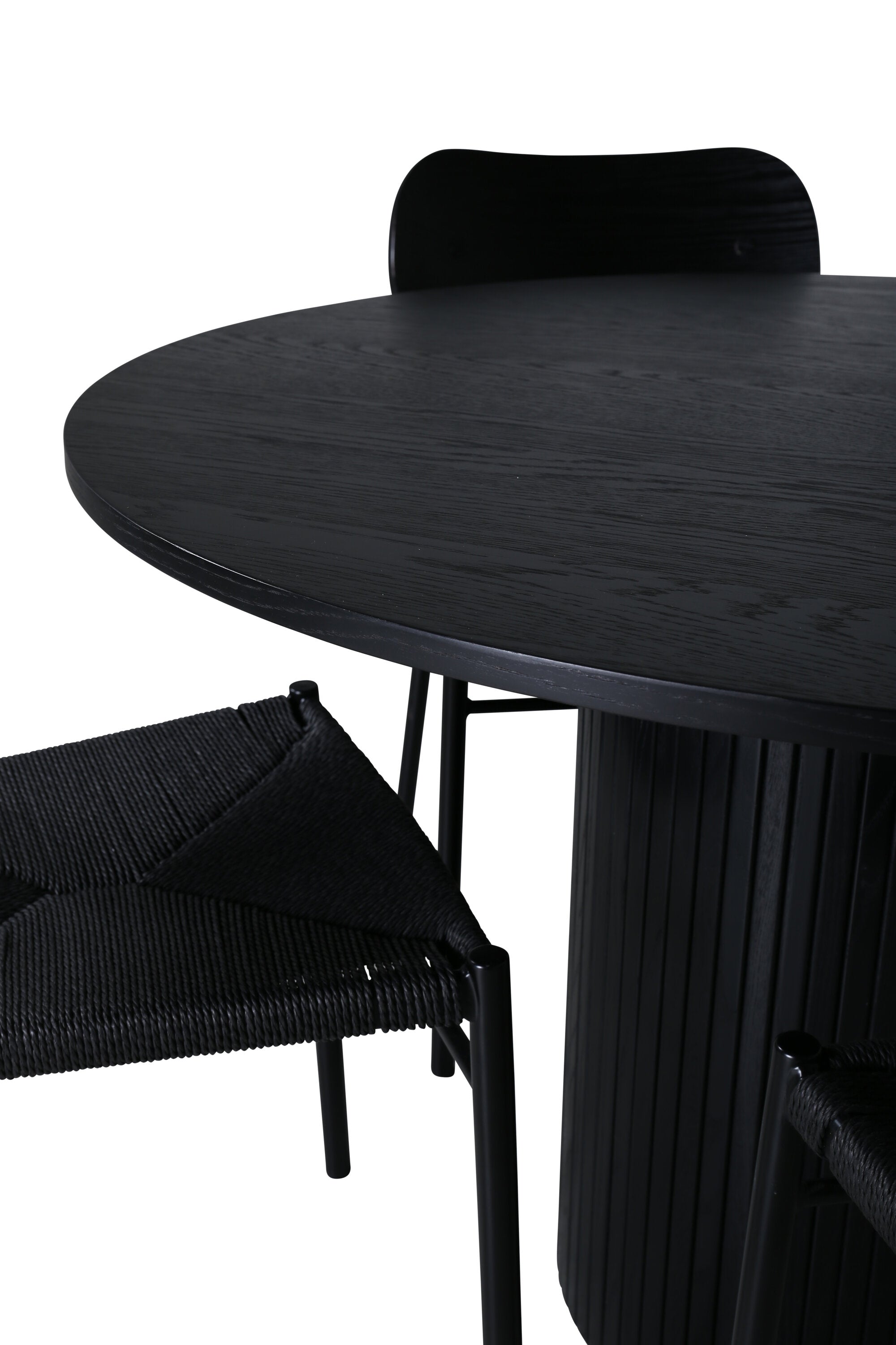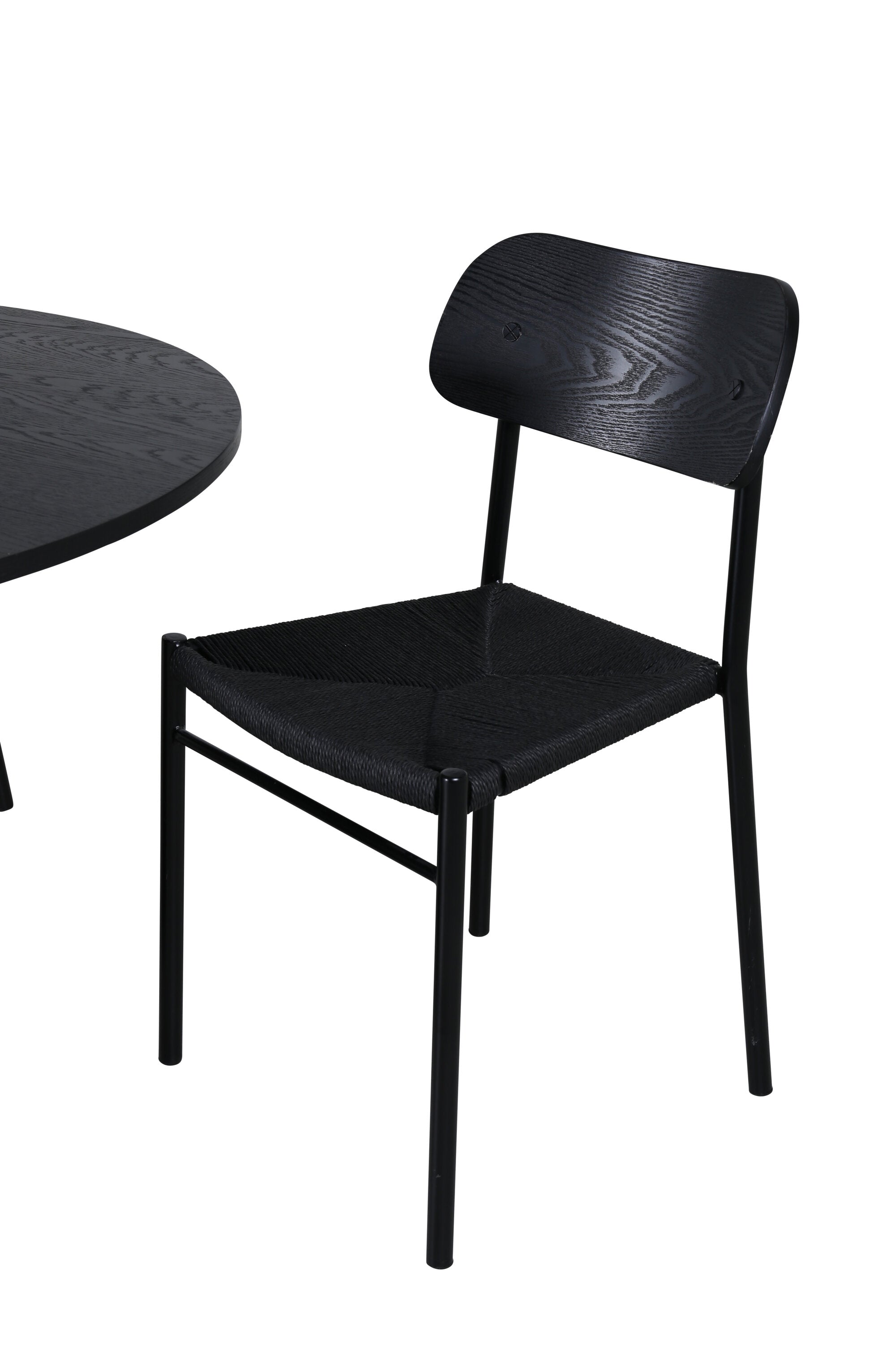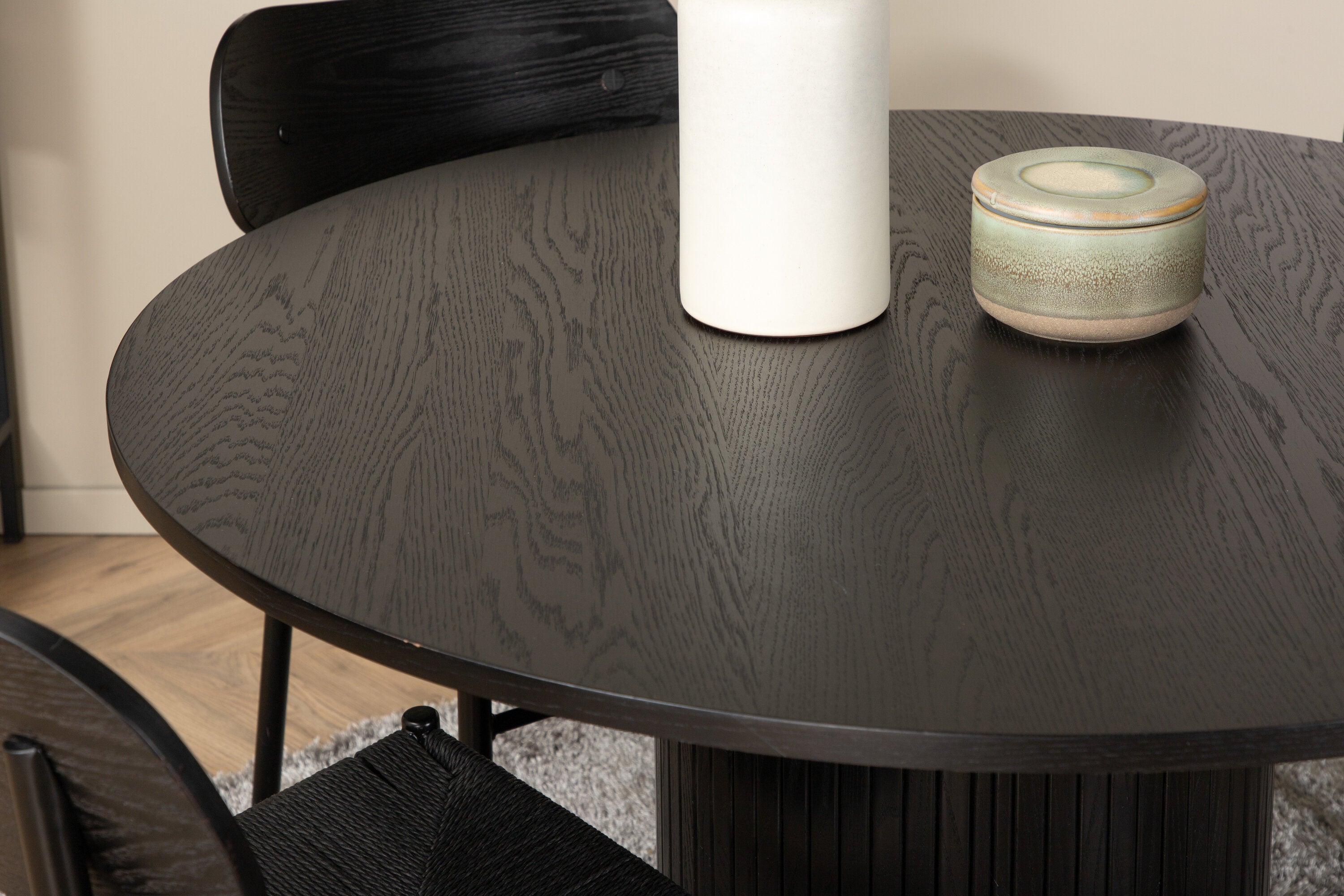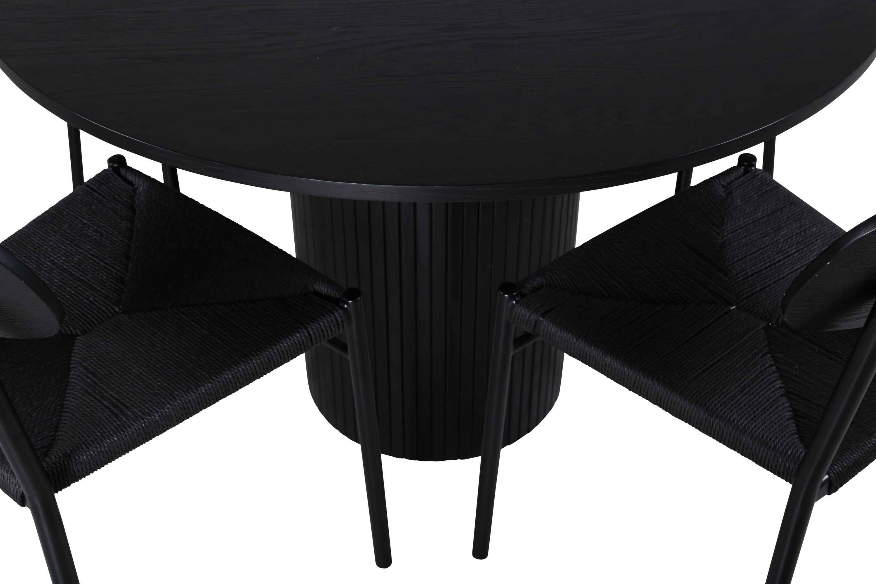 Lahodná sladká skupina potravin v moderním designu – co víc si přát? Kolem našeho kulatého jídelního stolu Bianca vytvoříte úžasnou komunitu, kde nikdo neriskuje, že se dostane na okraj. Deska stolu je vyrobena z MDF a má válcový rám v robustním provedení a žebrovaném provedení. Konzistentně černá barva je nadčasová i stylová a lze ji snadno sladit s jiným dekorem. Rozměry stolu: Průměr: 110 cm, Výška: 74 cm. V kombinaci se 4 jídelními židlemi Polly v černé barvě s kovovými nohami židlí a černými sedáky z provazu. Rozměry židle: výška: 88 cm, výška sedáku: 47 cm, šířka: 42 cm, hloubka: 55 cm. Užijte si všechna jídla dne!