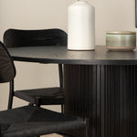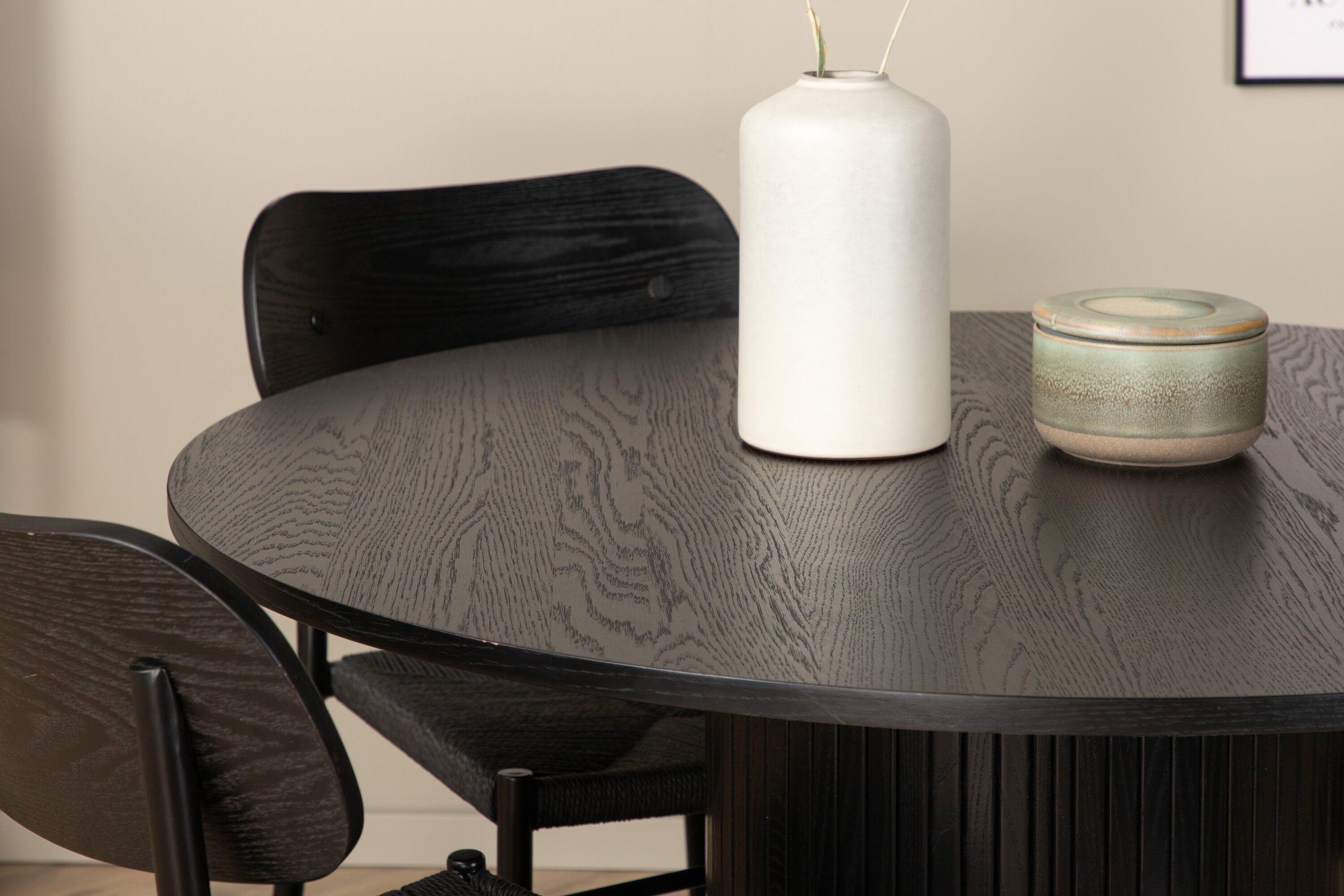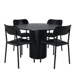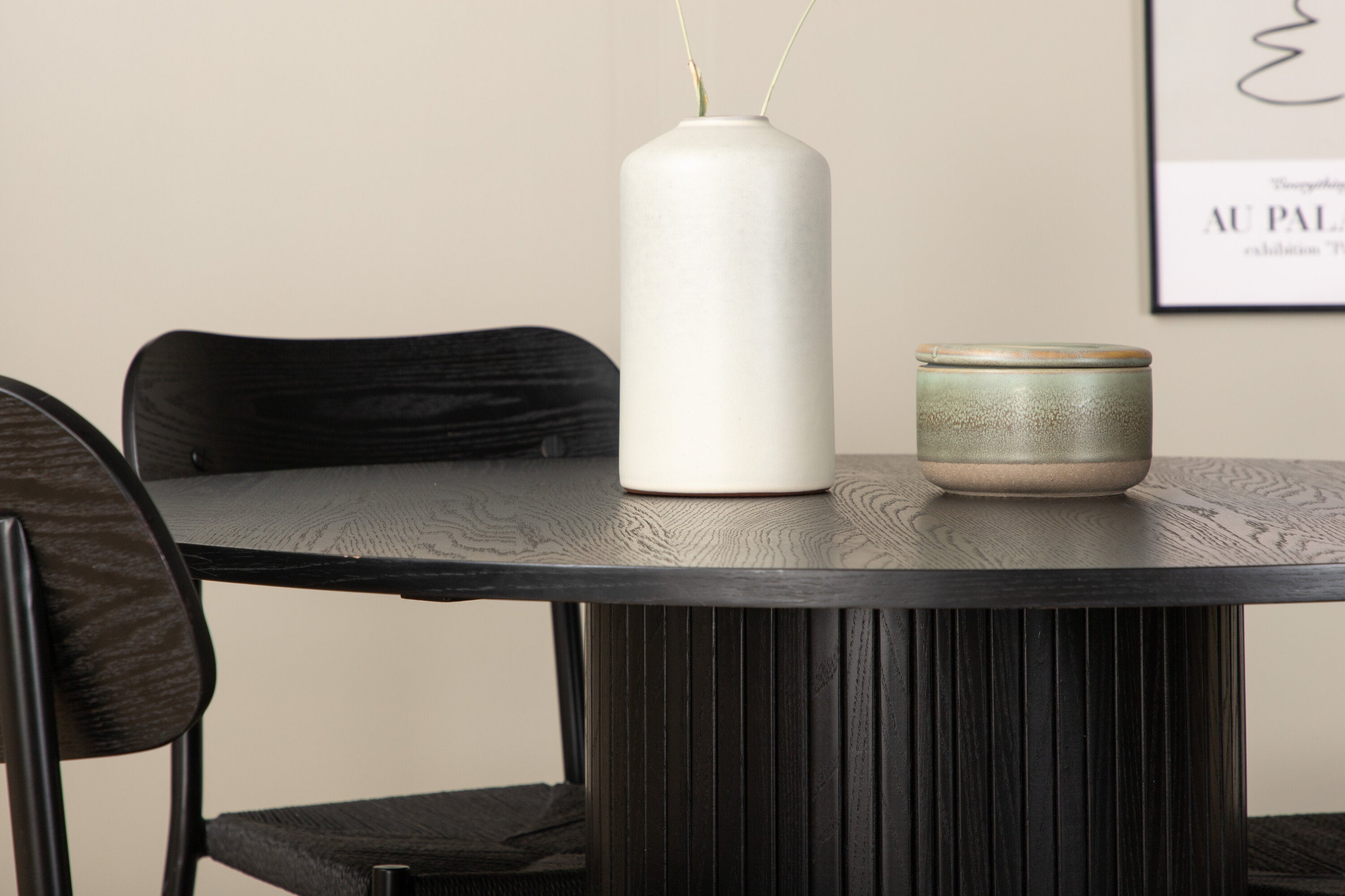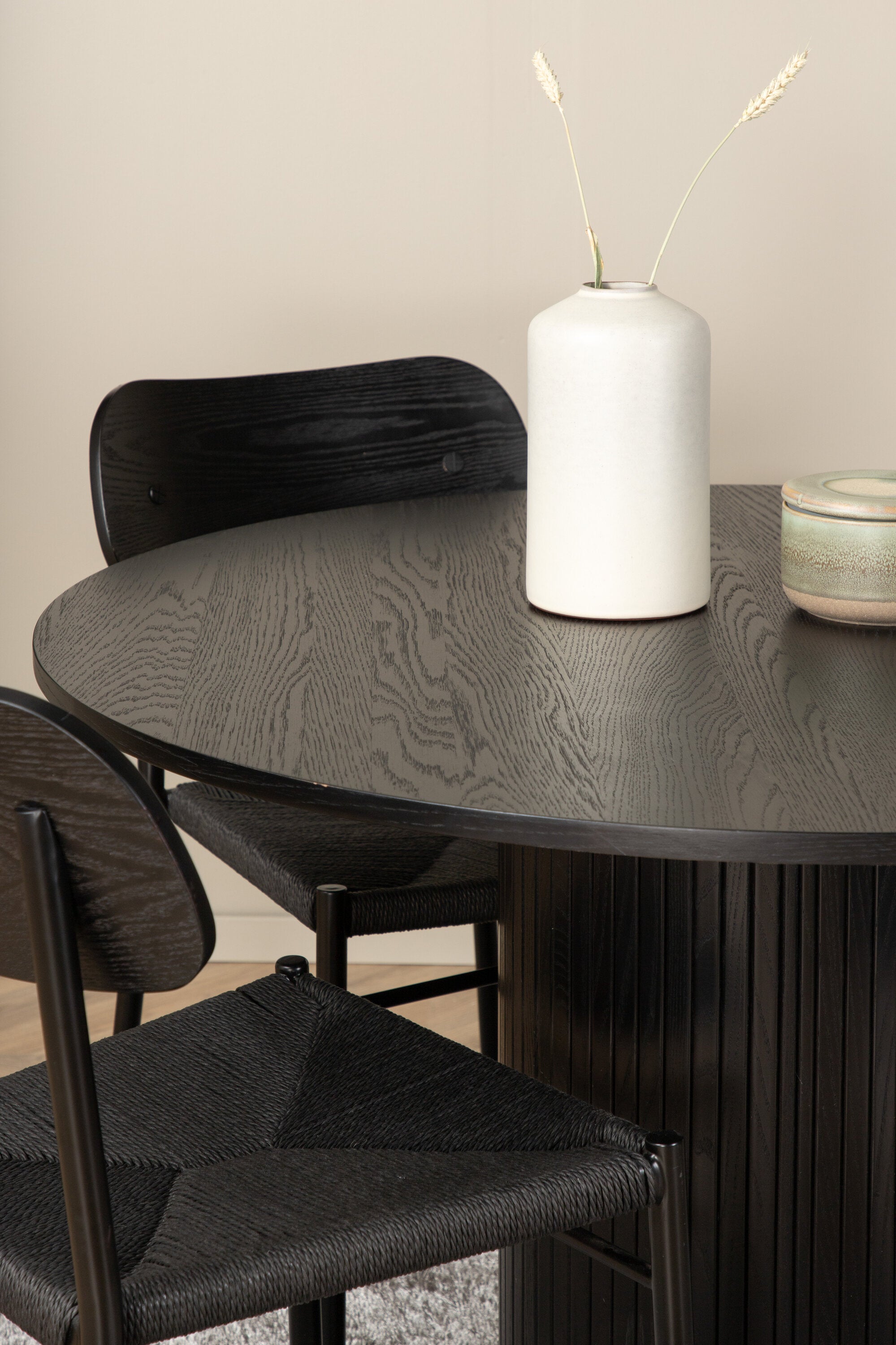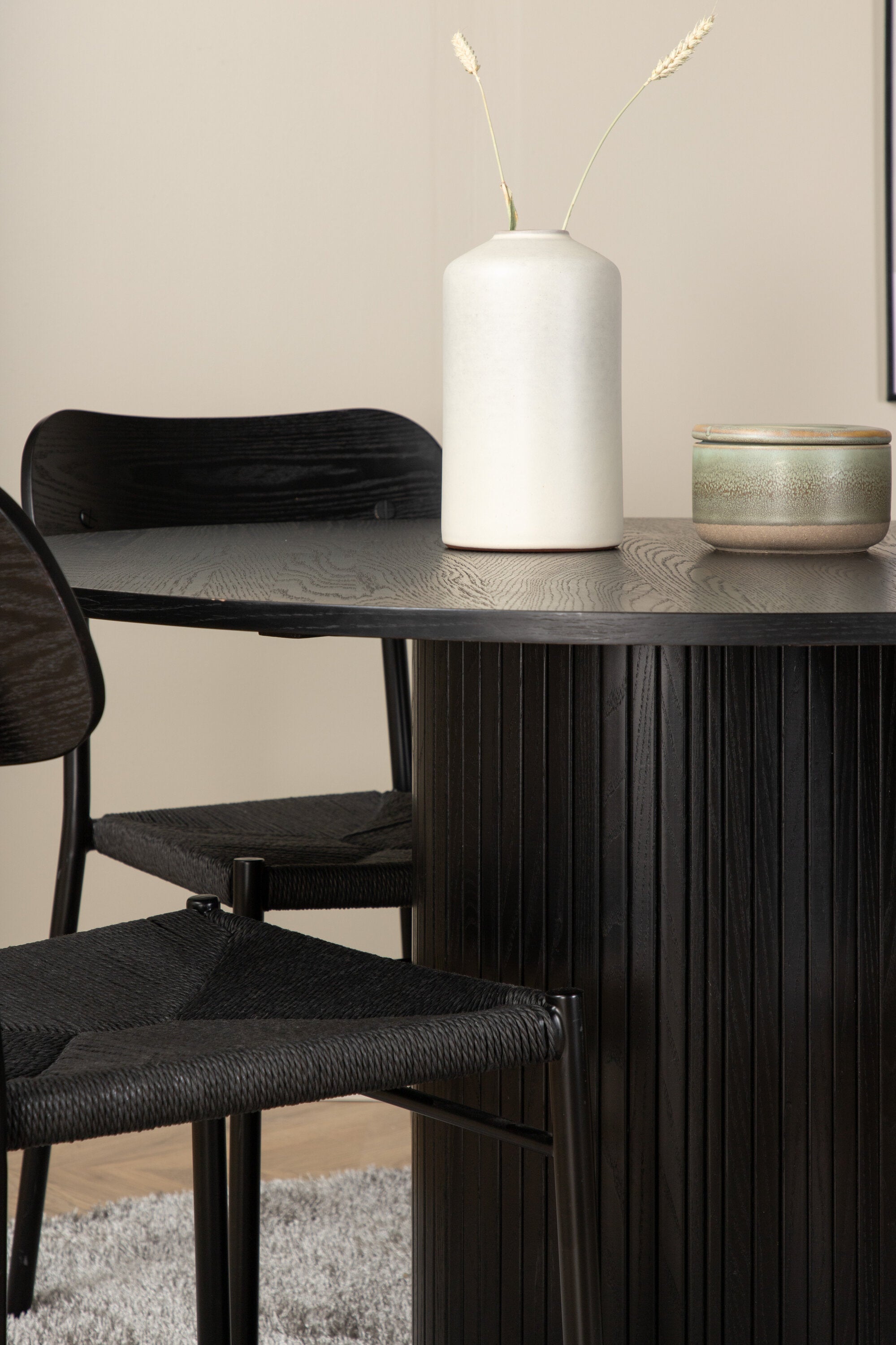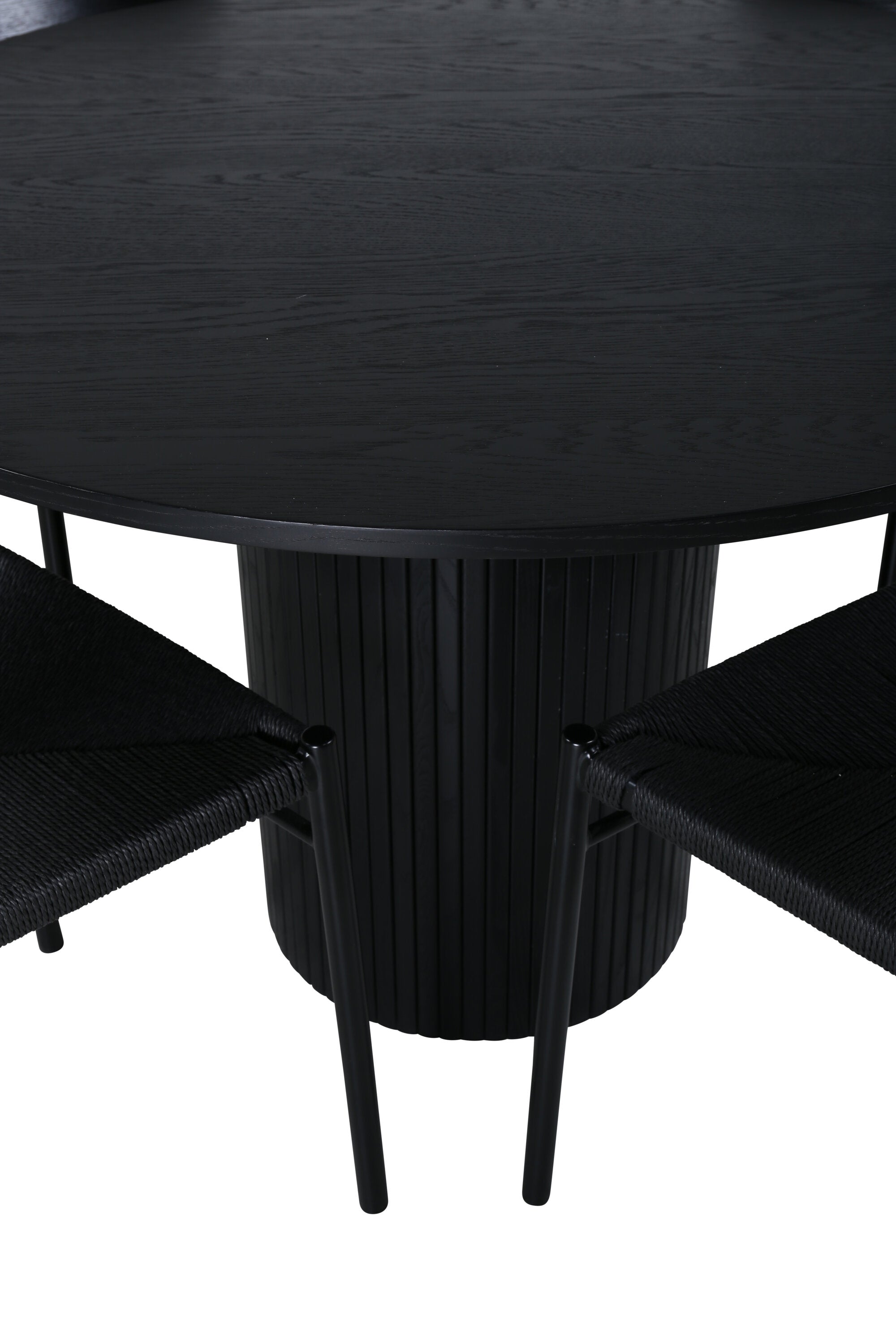 Lahodná sladká skupina potravin v moderním designu – co víc si přát? Kolem našeho kulatého jídelního stolu Bianca vytvoříte úžasnou komunitu, kde nikdo neriskuje, že se dostane na okraj. Deska stolu je vyrobena z MDF a má válcový rám v robustním provedení a žebrovaném provedení. Konzistentně černá barva je nadčasová i stylová a lze ji snadno sladit s jiným dekorem. Rozměry stolu: Průměr: 110 cm, Výška: 74 cm. V kombinaci se 4 jídelními židlemi Polly v černé barvě s kovovými nohami židlí a černými sedáky z provazu. Rozměry židle: výška: 88 cm, výška sedáku: 47 cm, šířka: 42 cm, hloubka: 55 cm. Užijte si všechna jídla dne!