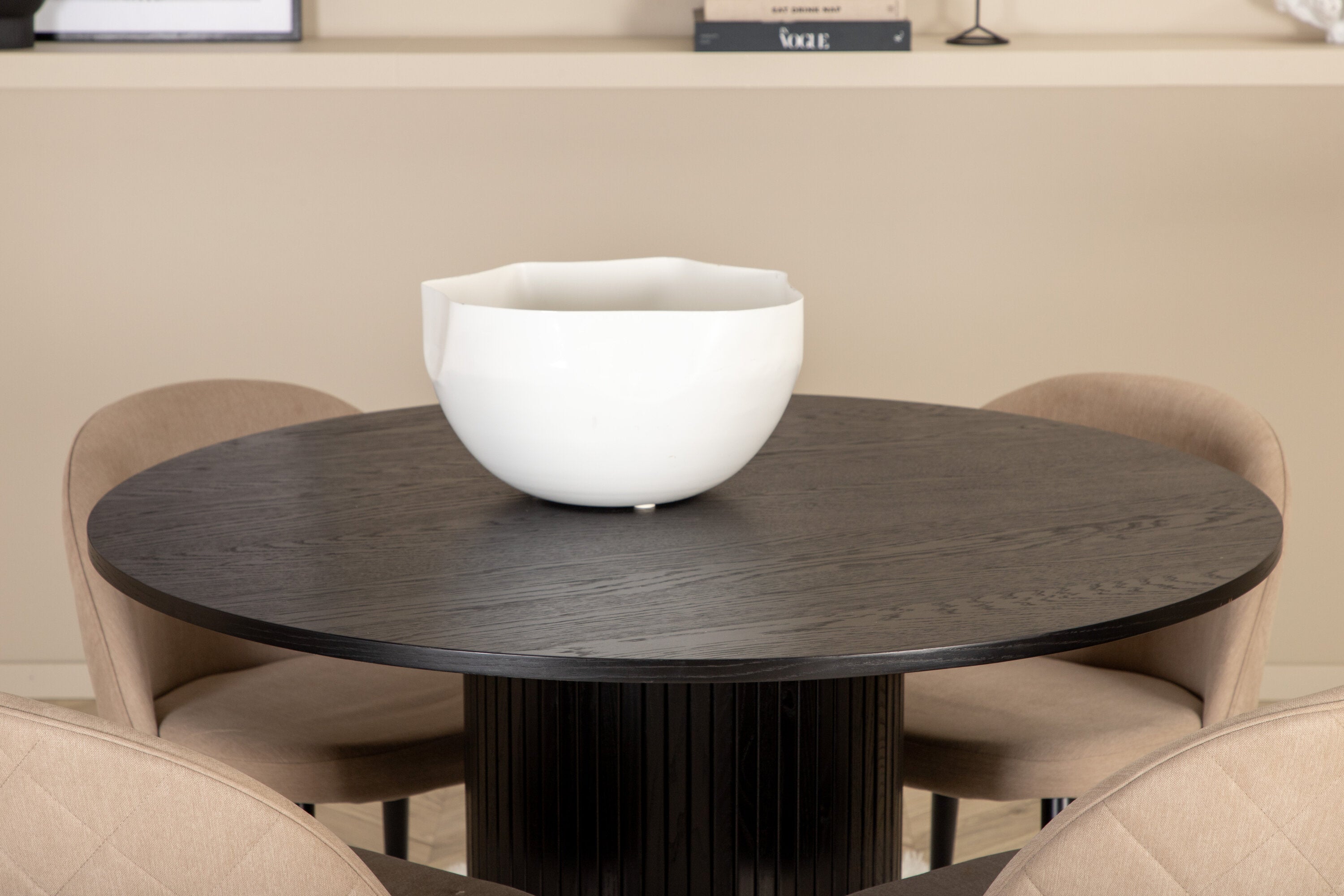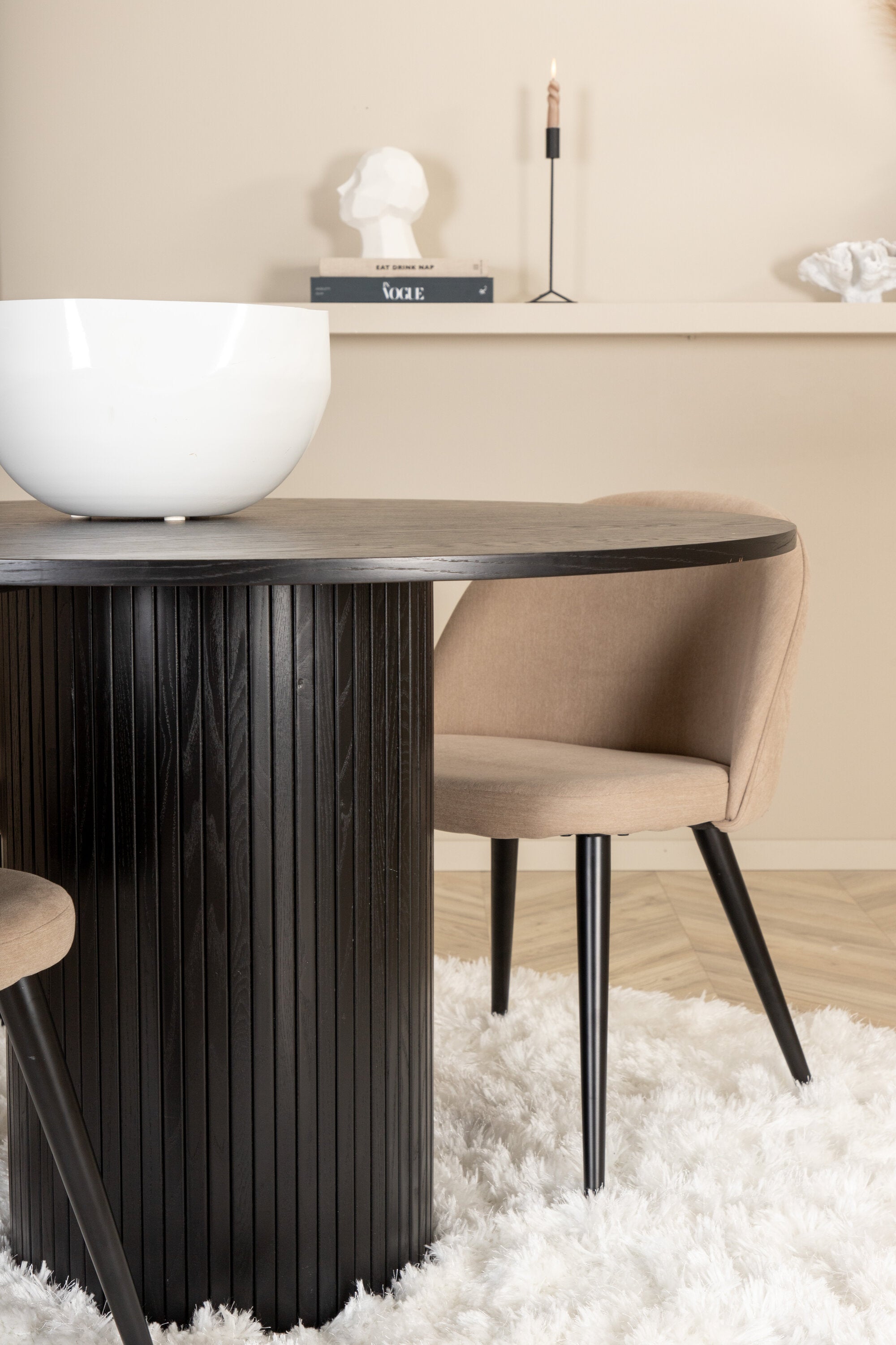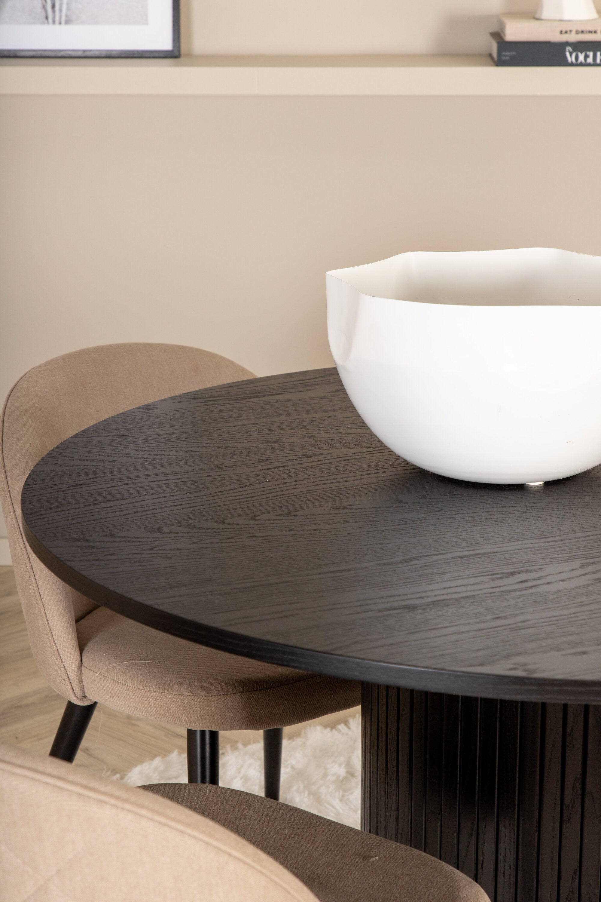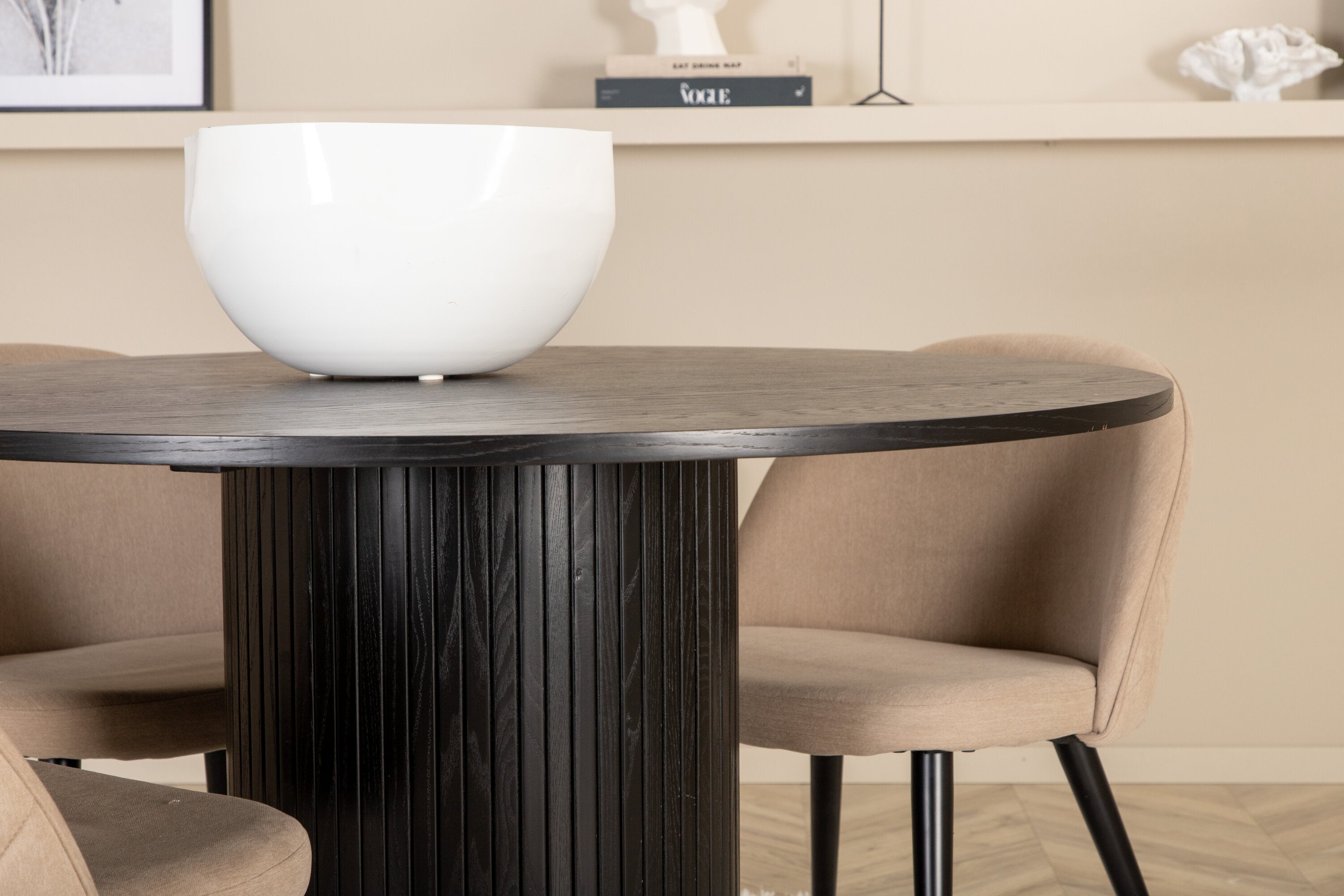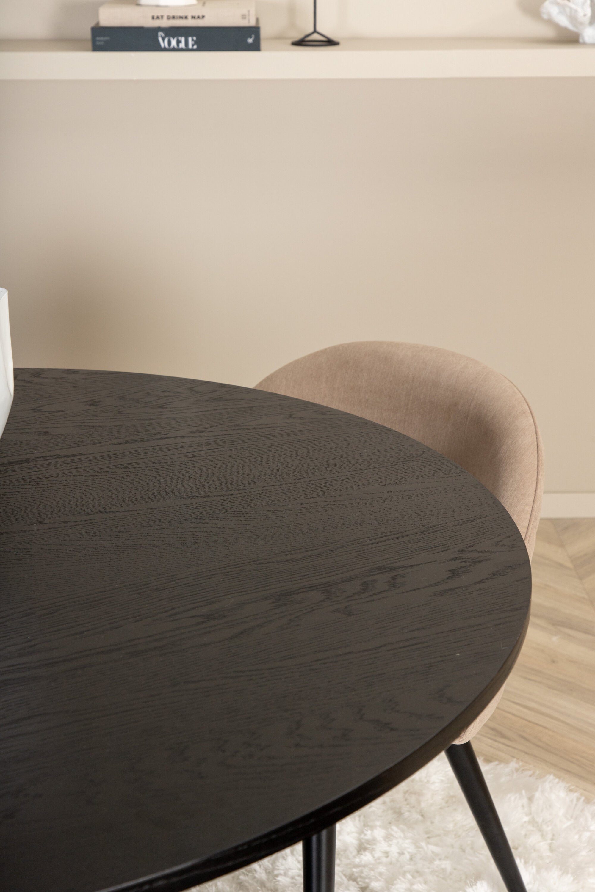 Vytvořte si lákavý poutač v srdci domova! Náš kulatý jídelní stůl Bianca v nafoukané černé barvě se skvěle hodí jak do obývacího pokoje, tak do prostorné kuchyně. Deska stolu je černá z MDF s dýhou a rámem Robustní ze dřeva a MDF v žebrovaném provedení, které působí stabilním dojmem. Zde spolu se 4 našimi oblíbenými jídelními židlemi Velvet Stitches, které přispívají k pěknému celku v obývacím pokoji. Nohy židle jsou snadno rozšířeny v černém železe a béžová sedadla z polyesterového plátna. Zde získáte nadčasovou skupinu potravin, která stojí v čase!