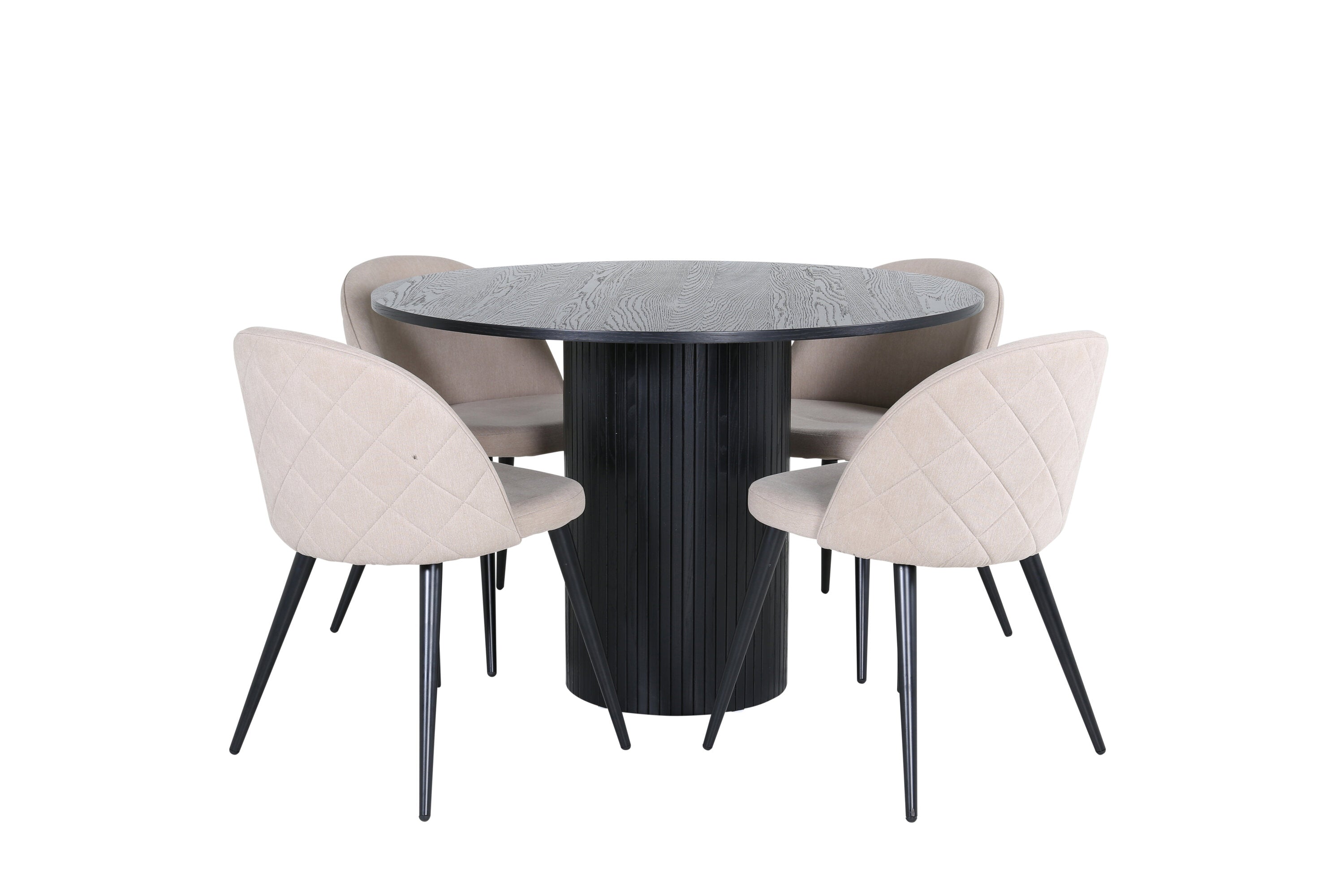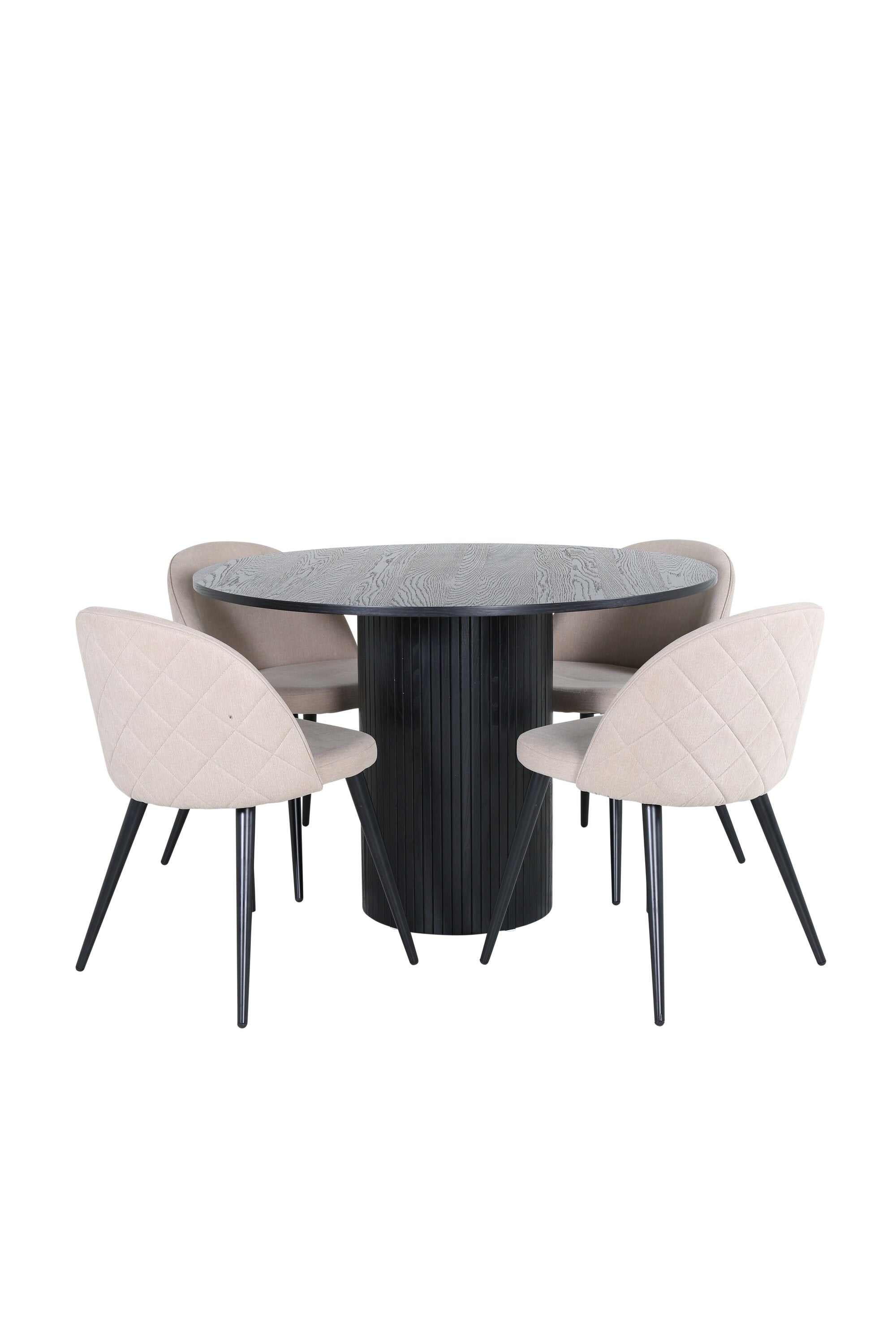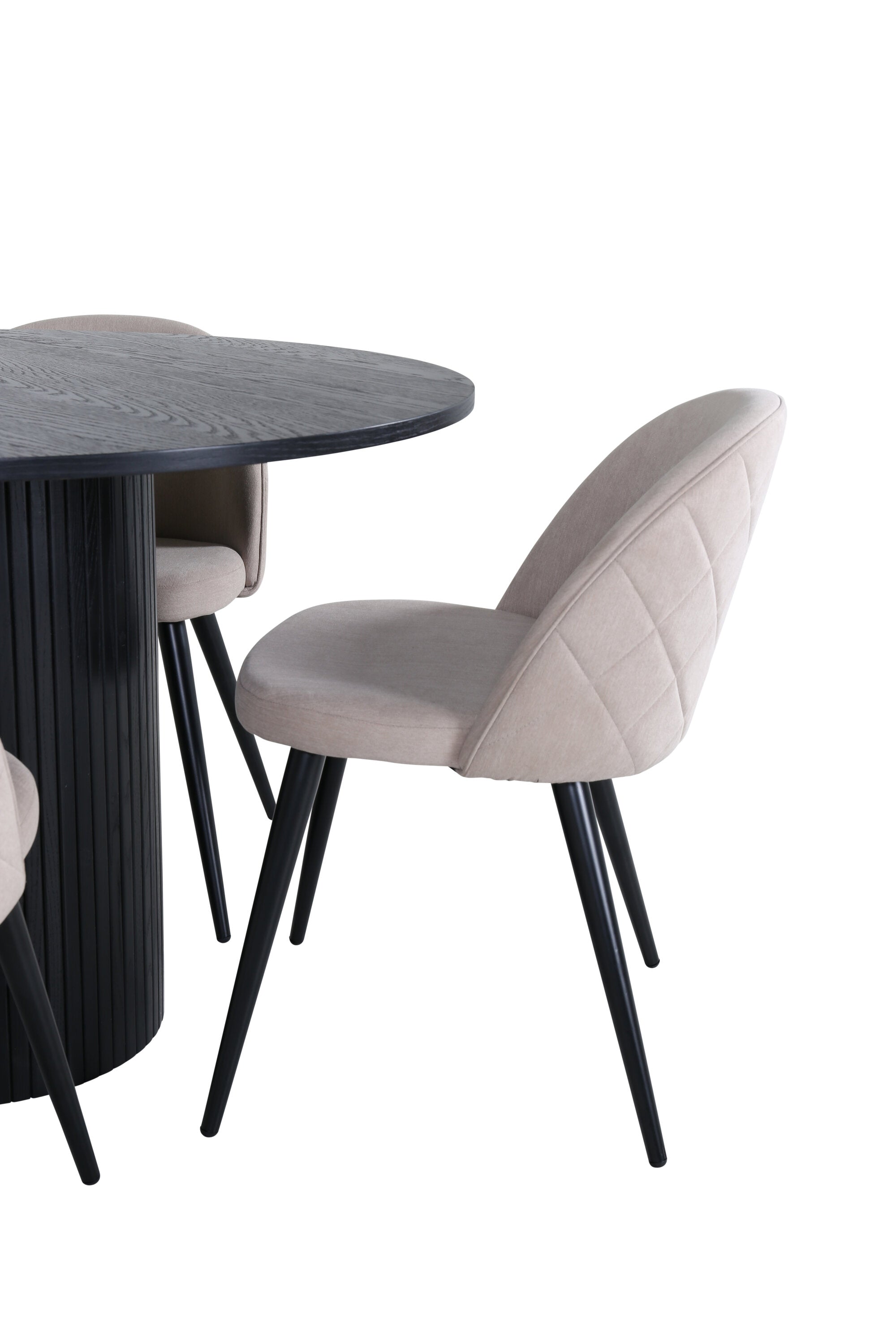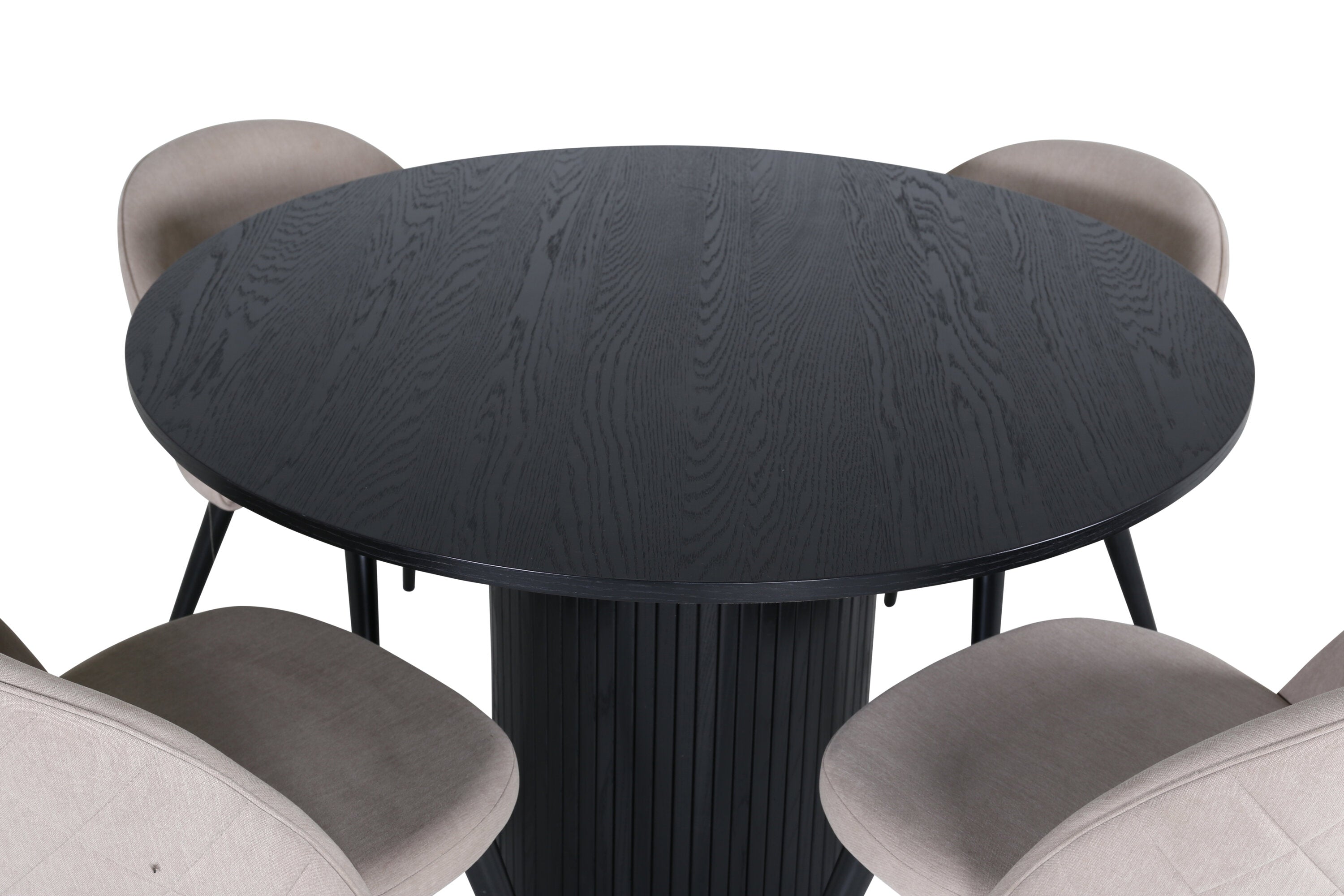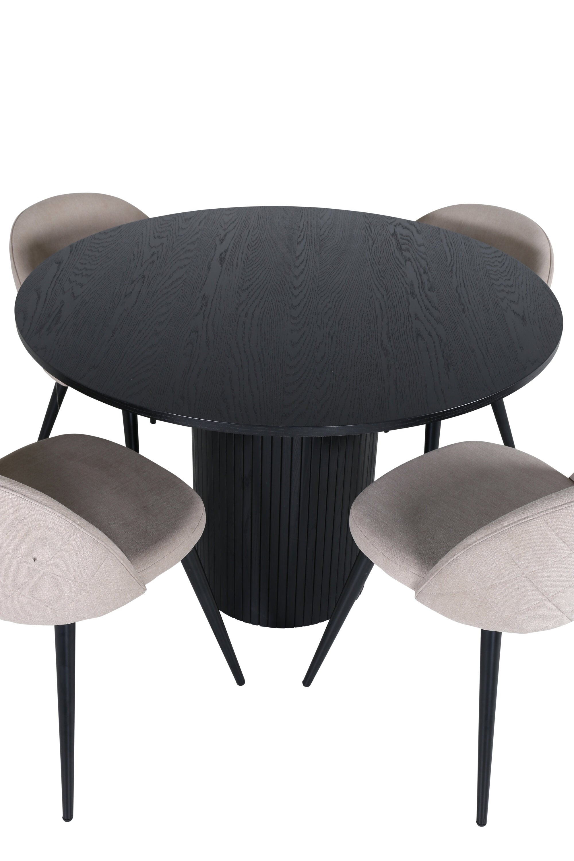 Vytvořte si lákavý poutač v srdci domova! Náš kulatý jídelní stůl Bianca v nafoukané černé barvě se skvěle hodí jak do obývacího pokoje, tak do prostorné kuchyně. Deska stolu je černá z MDF s dýhou a rámem Robustní ze dřeva a MDF v žebrovaném provedení, které působí stabilním dojmem. Zde spolu se 4 našimi oblíbenými jídelními židlemi Velvet Stitches, které přispívají k pěknému celku v obývacím pokoji. Nohy židle jsou snadno rozšířeny v černém železe a béžová sedadla z polyesterového plátna. Zde získáte nadčasovou skupinu potravin, která stojí v čase!