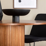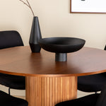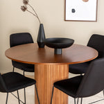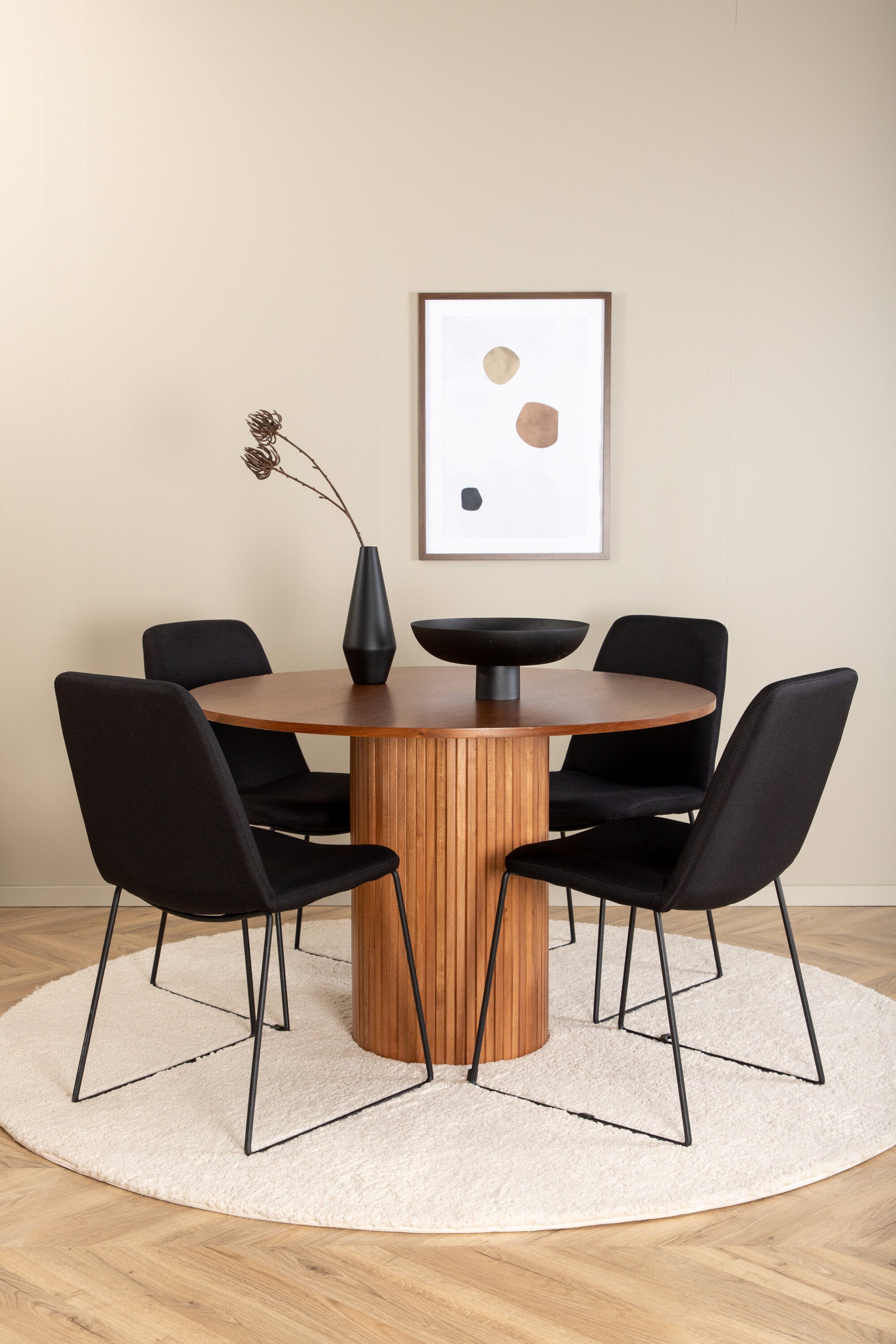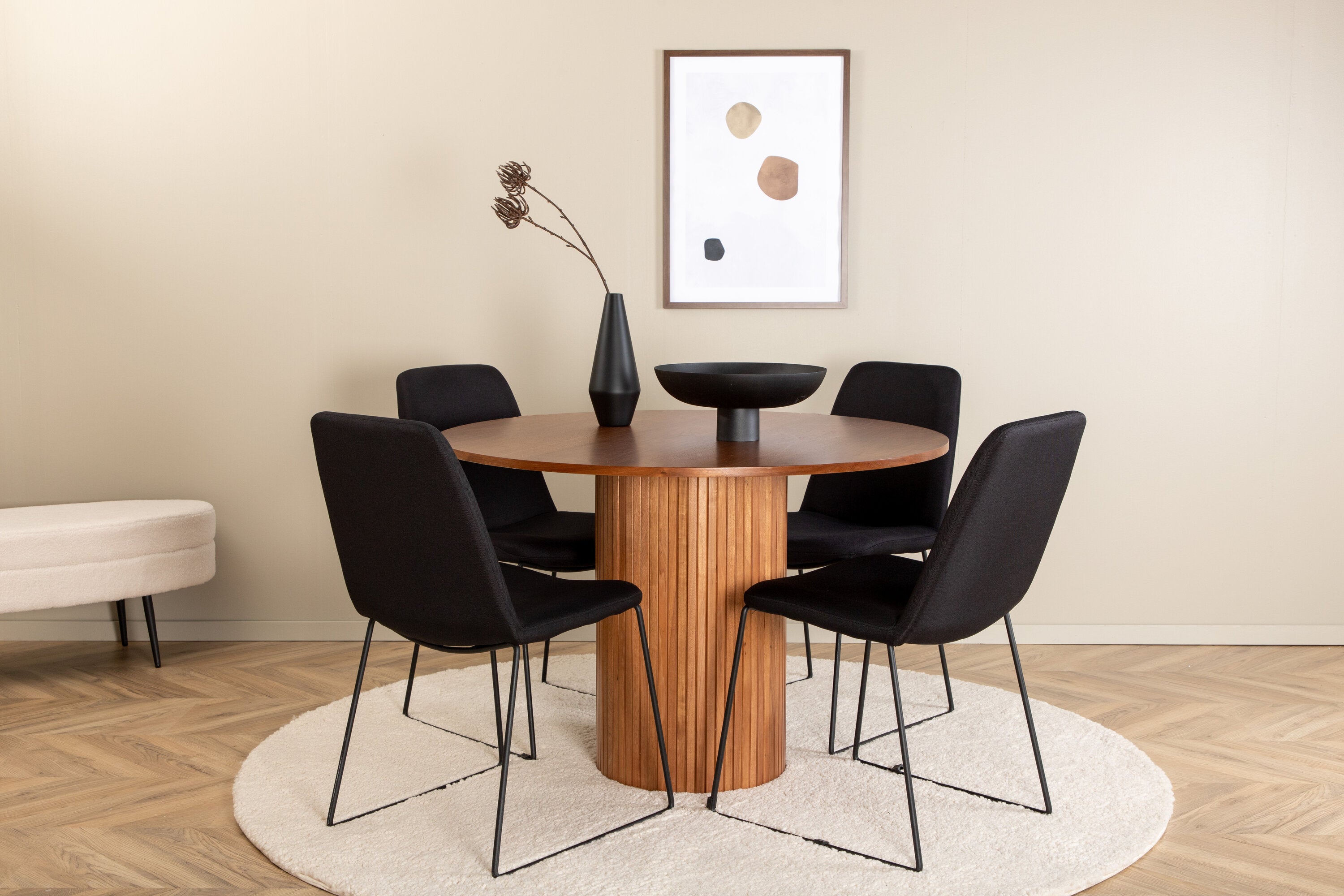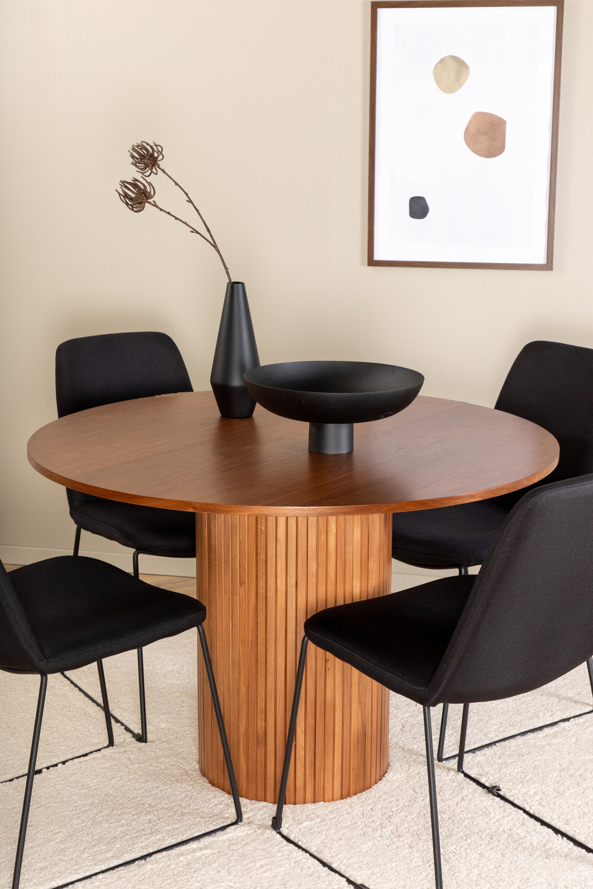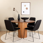 Skupina jídel, která vytváří příjemnou atmosféru v srdci domova! Náš kulatý jídelní stůl Bianca v trendy barvách ořechu se skvěle hodí jak do obývacího pokoje, tak do prostorné kuchyně. Deska stolu je z MDF v barvě ořechu s dýhou a korpus bytelný v ořechové i černé barvě dřeva a MDF v žebrovaném provedení, které působí stabilním dojmem. Sladěny se 4 černými jídelními židlemi Muce, jejichž úzké železné nohy působí vzdušným dojmem a měkký sedák z polyesteru poskytuje vysoký komfort. Nábytek pro zlatou hranu v každodenním životě - měl by se cítit příjemně!