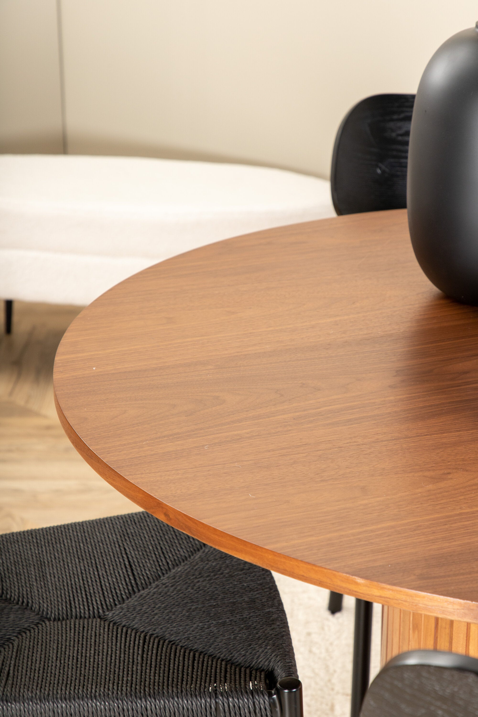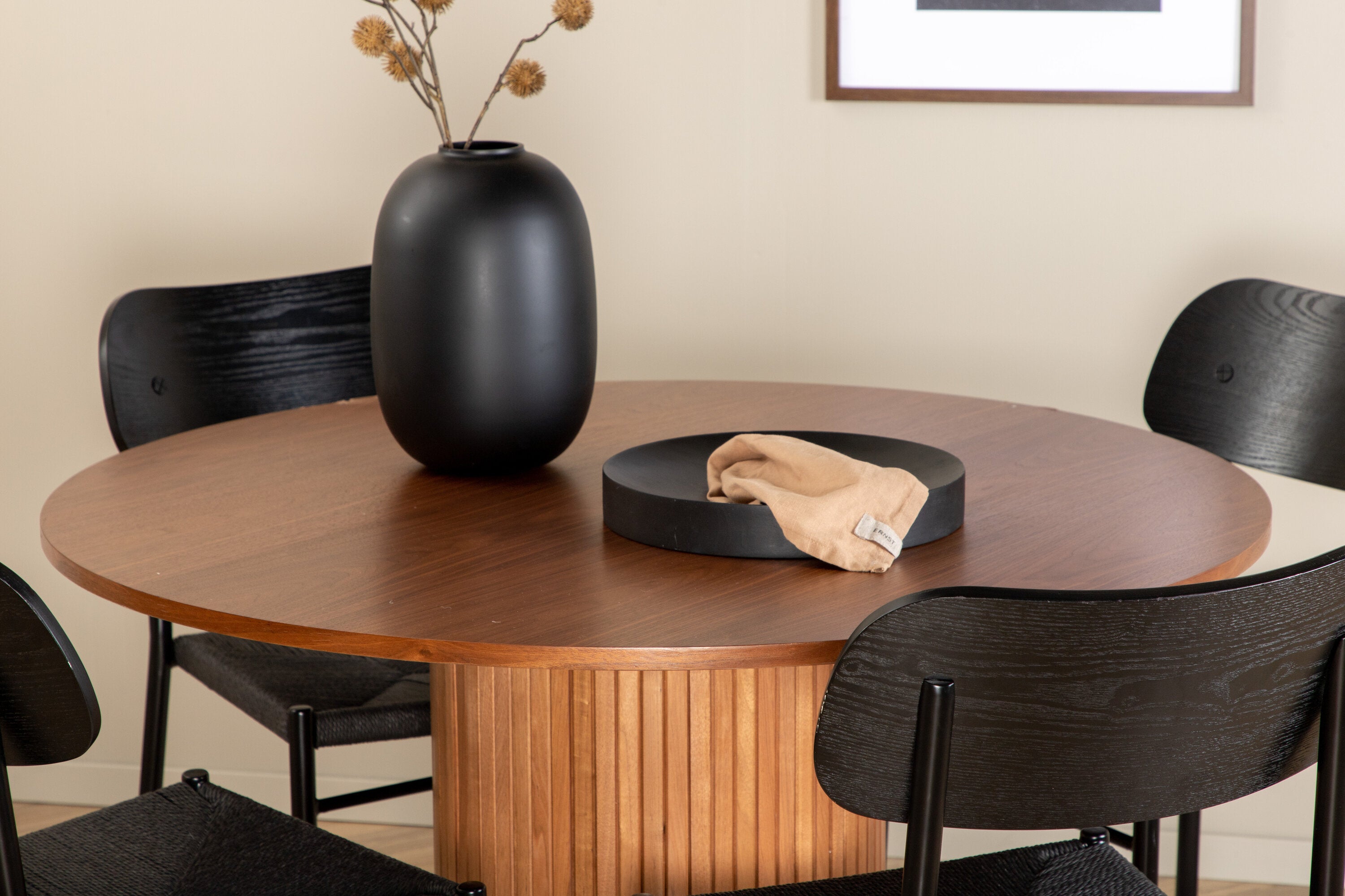 Lahodná sladká skupina potravin v moderním designu – co víc si přát? Kolem našeho kulatého jídelního stolu Bianca vytvoříte úžasnou komunitu, kde nikdo neriskuje, že se dostane na okraj. Deska stolu je vyrobena z MDF a má válcový rám v robustním provedení a žebrovaném provedení. Trendy ořechový sochař je nadčasový i stylový a lze jej snadno sladit s jiným dekorem. V kombinaci se 4 jídelními židlemi Polly v černé barvě s kovovými nohami židlí a černými sedáky z provazu. Užijte si všechna jídla dne!