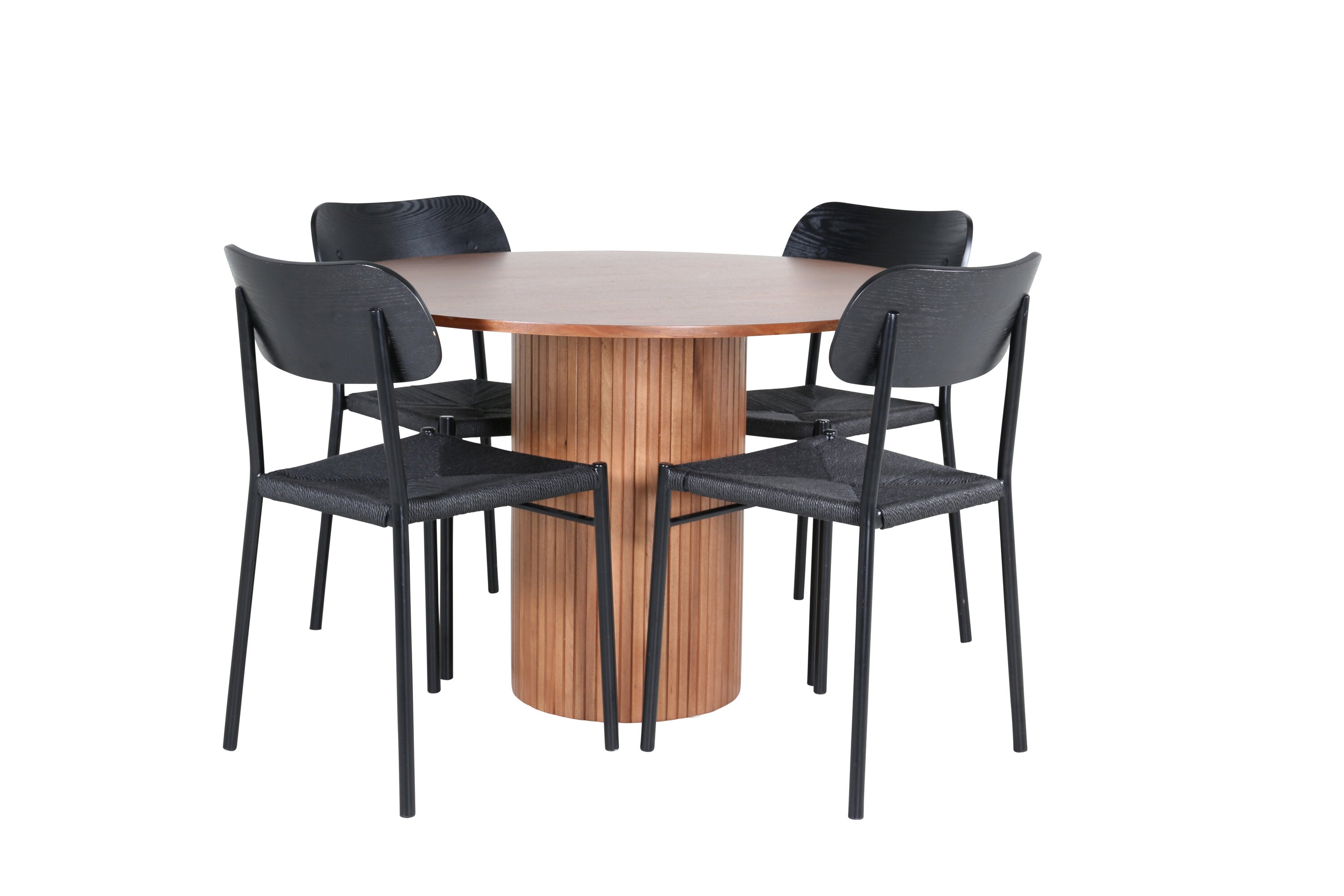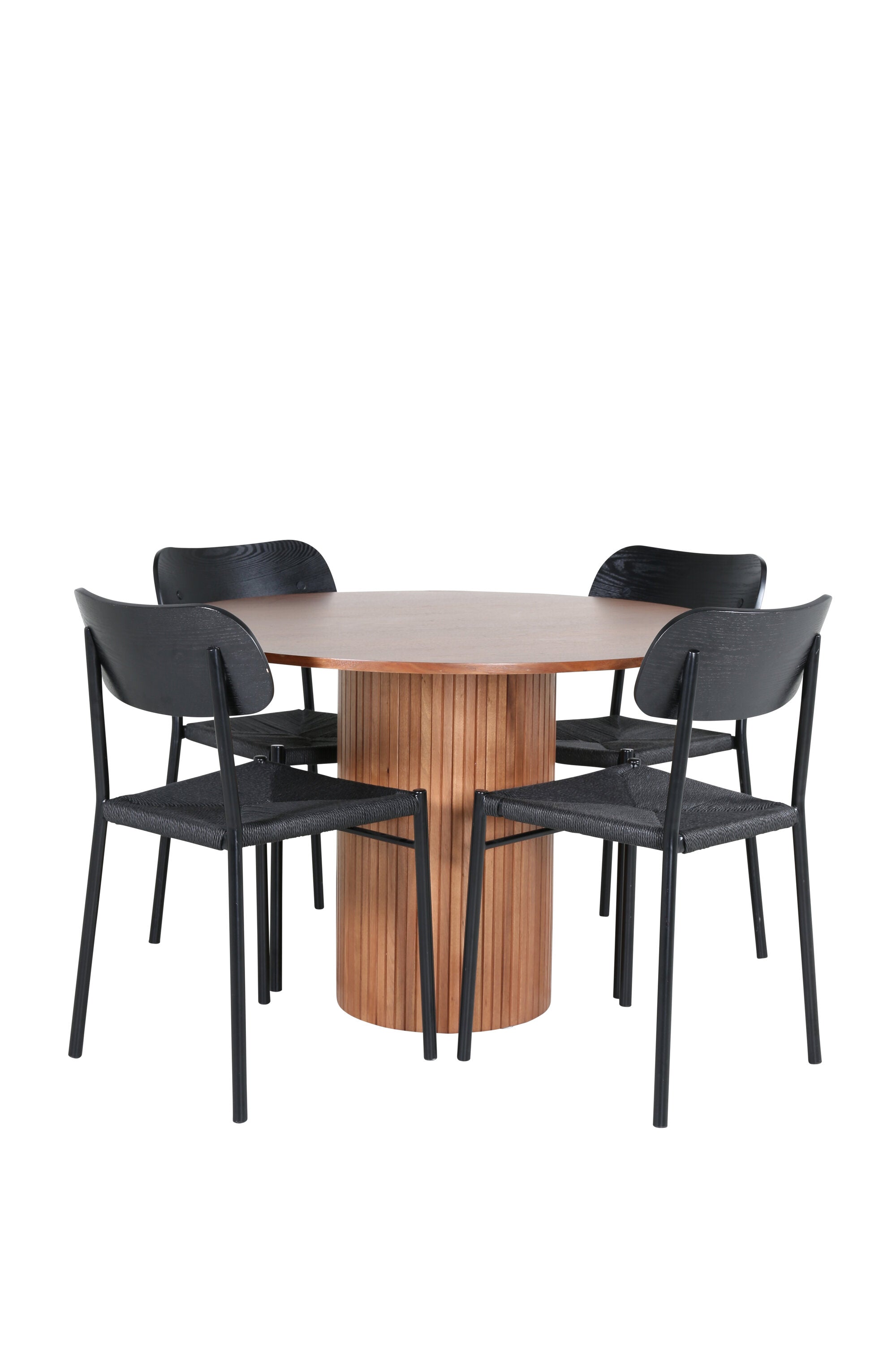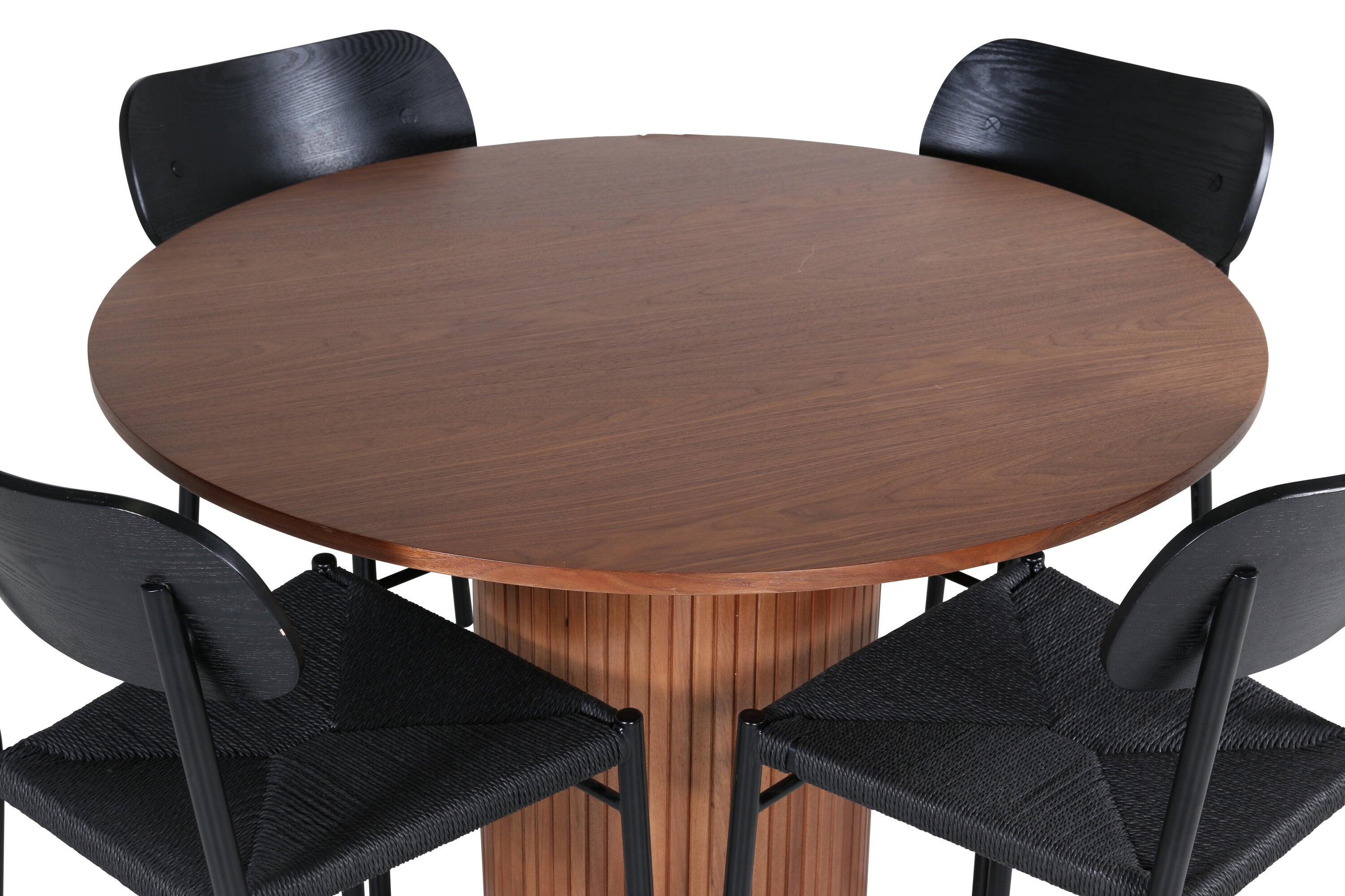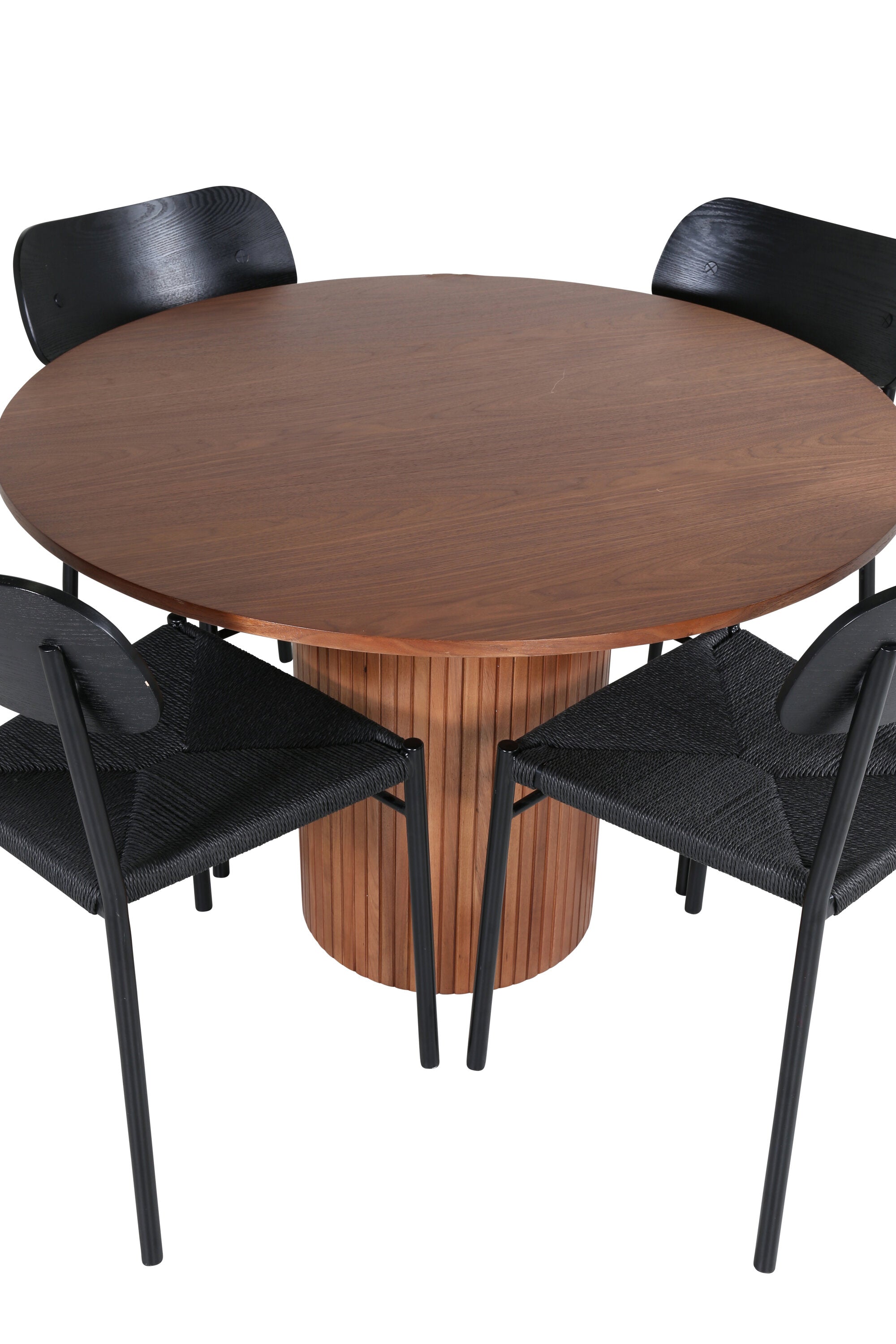 Lahodná sladká skupina potravin v moderním designu – co víc si přát? Kolem našeho kulatého jídelního stolu Bianca vytvoříte úžasnou komunitu, kde nikdo neriskuje, že se dostane na okraj. Deska stolu je vyrobena z MDF a má válcový rám v robustním provedení a žebrovaném provedení. Trendy ořechový sochař je nadčasový i stylový a lze jej snadno sladit s jiným dekorem. V kombinaci se 4 jídelními židlemi Polly v černé barvě s kovovými nohami židlí a černými sedáky z provazu. Užijte si všechna jídla dne!