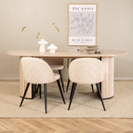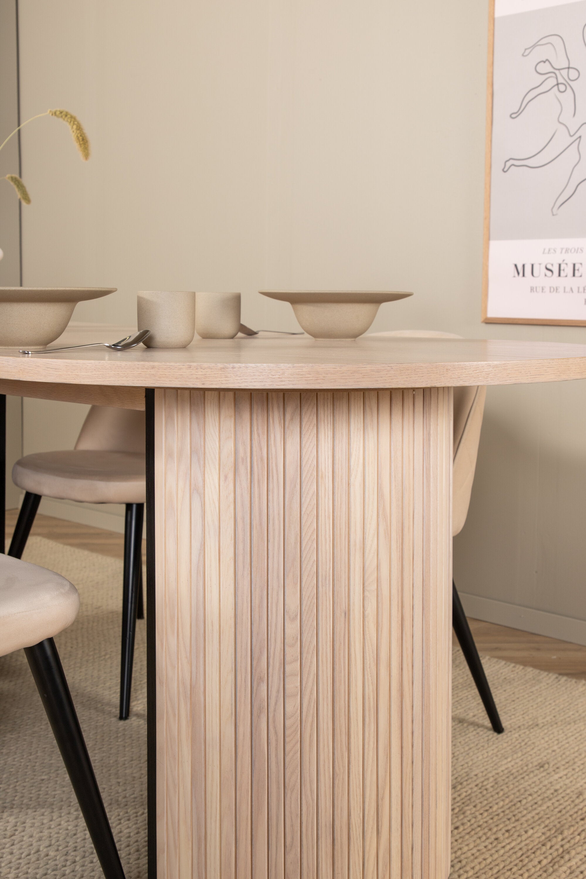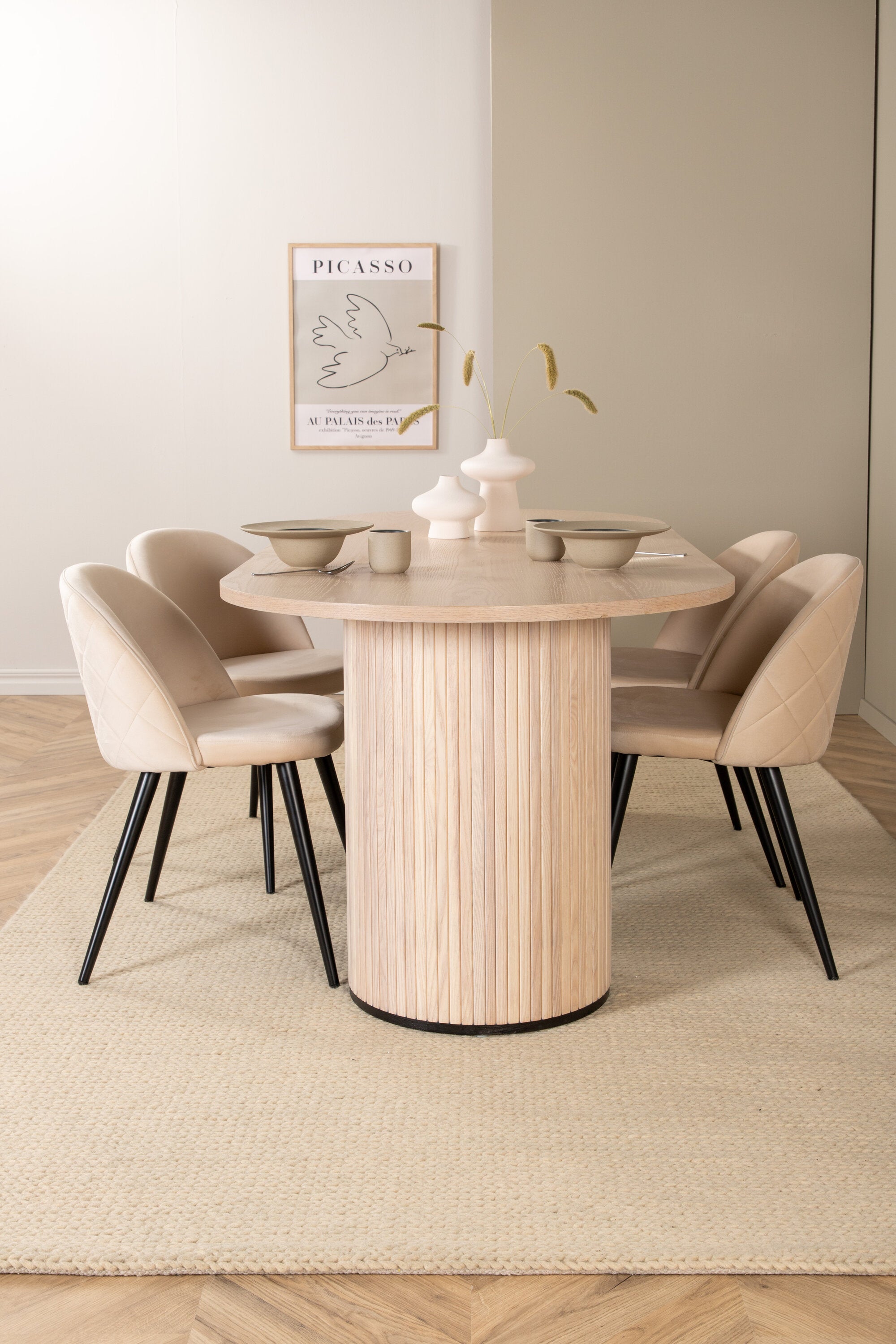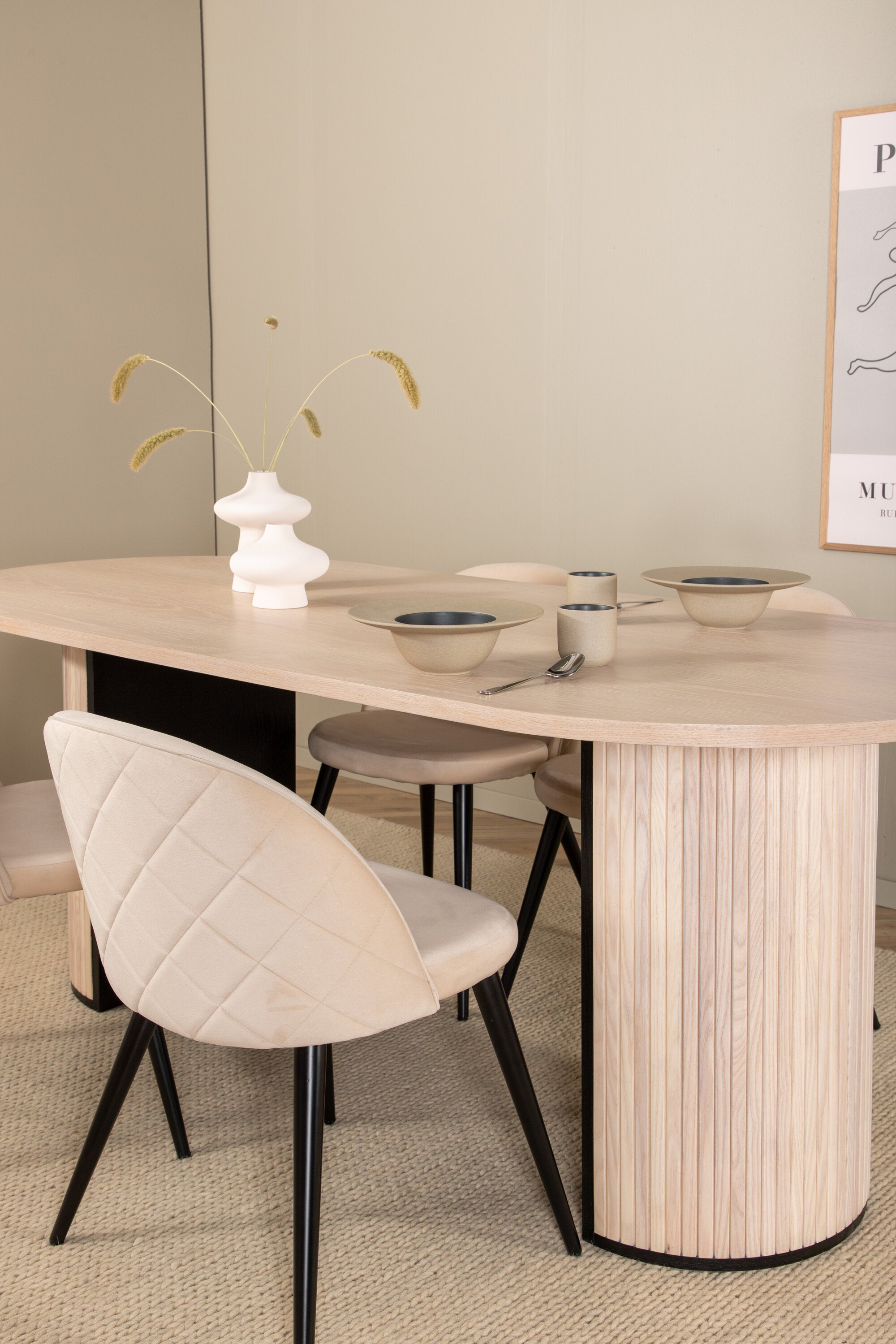 Moderní skupina potravin, která přitahuje oči! Oválný jídelní stůl Bianca v omítnuté bílé barvě má ​​lahodný design se stolní deskou z kostěné bílé MDF s dýhou a robustním rámem ze dřeva a MDF v žebrovaném provedení, který působí stabilním dojmem. Rozměry stolu: Délka: 200 cm, Šířka: 90 cm, Výška: 75 cm. Zde v dokonalé kombinaci se 4 našimi oblíbenými jídelními židlemi Velvet. Židle se zaměřují na styl a pohodlí s pohodlným sedákem z béžového polyesterového prádla a rozšířenými nohami židle ze železa. Rozměry židle: Výška: 76,5 cm, výška sedáku: 46,5 cm, šířka: 50 cm, hloubka: 57 cm. Ať se čas u jídelního stolu stane jedním z vrcholů dneška!