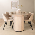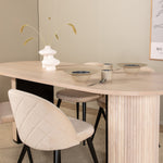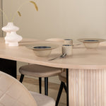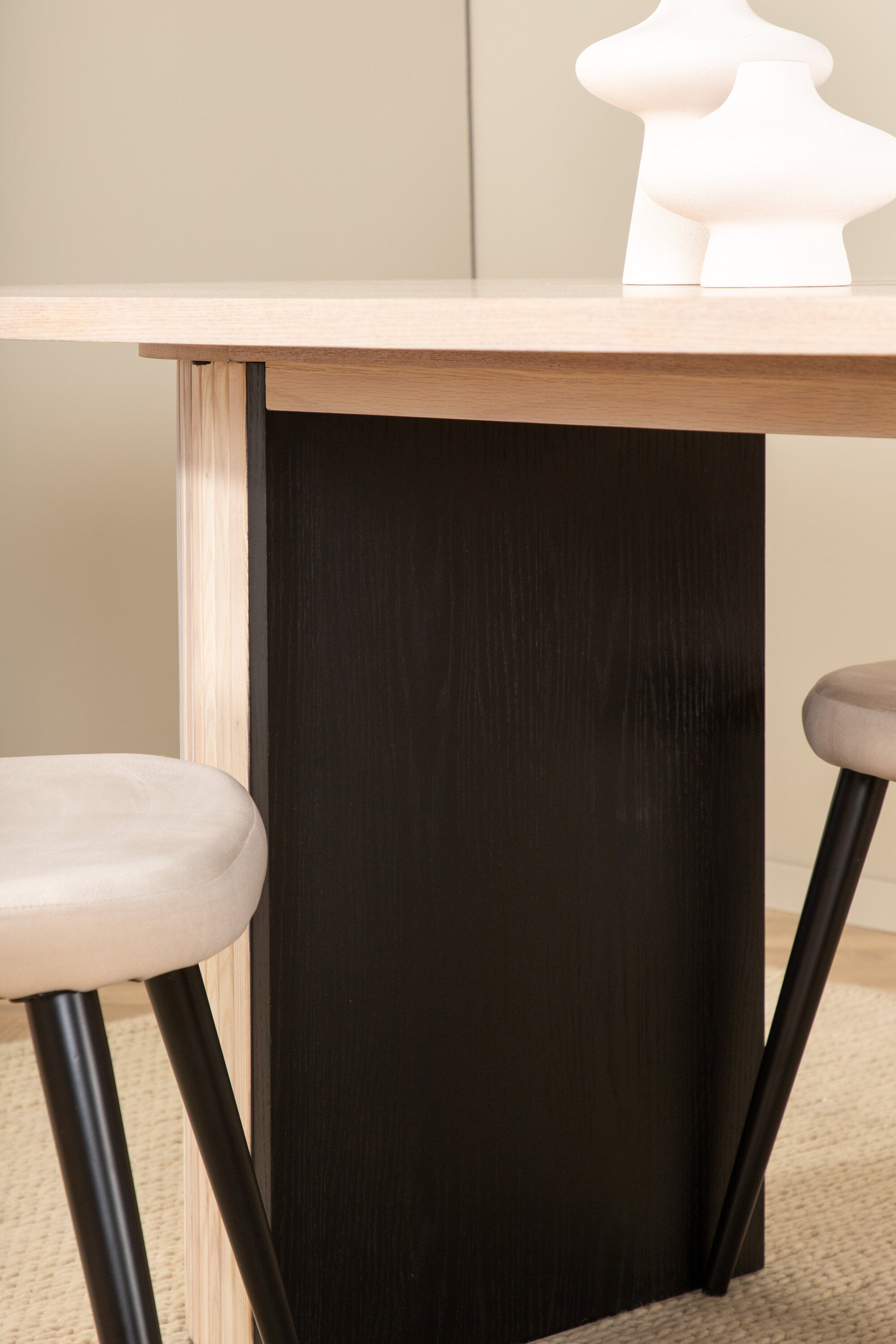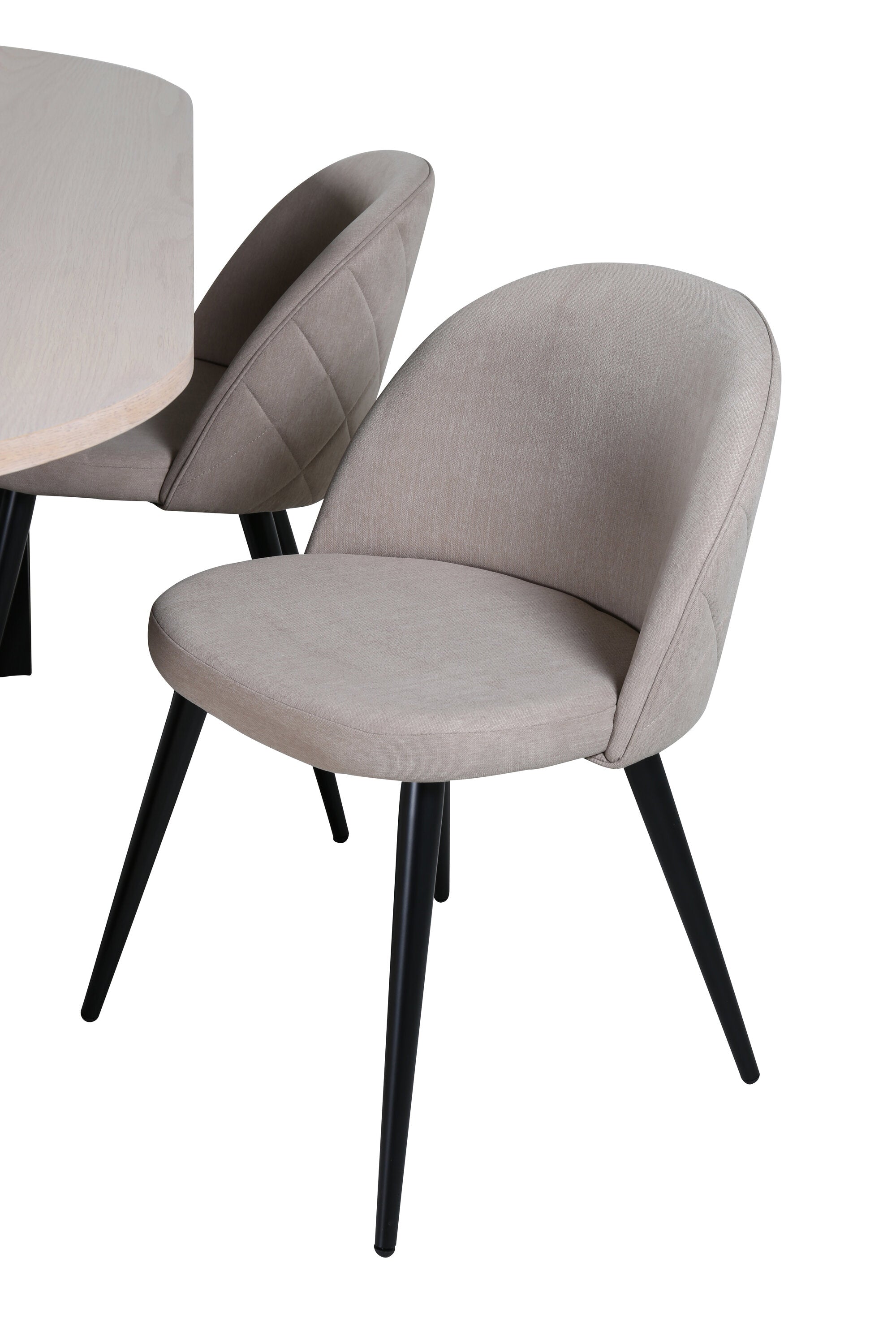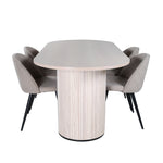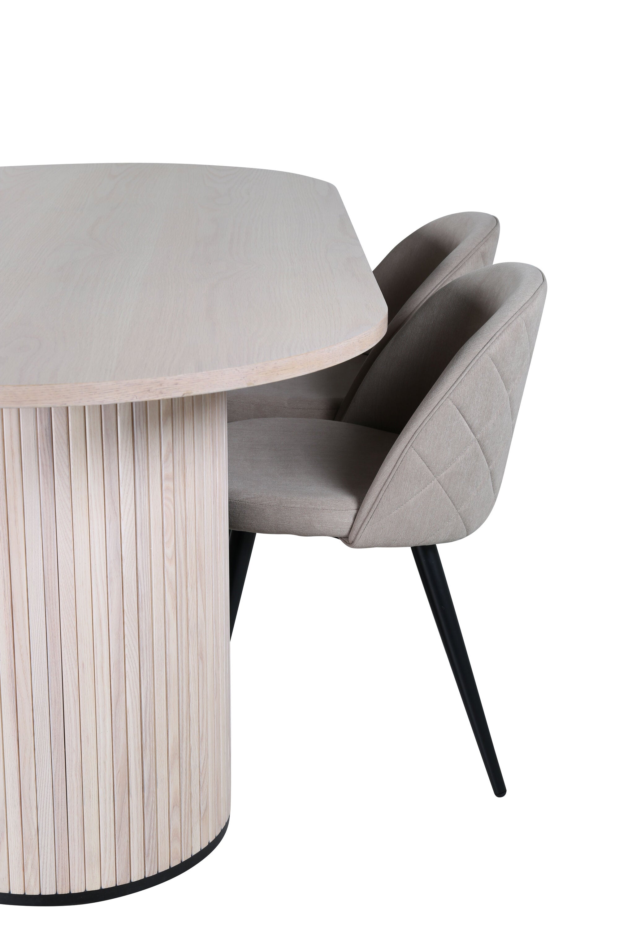 Moderní skupina potravin, která přitahuje oči! Oválný jídelní stůl Bianca v omítnuté bílé barvě má ​​lahodný design se stolní deskou z kostěné bílé MDF s dýhou a robustním rámem ze dřeva a MDF v žebrovaném provedení, který působí stabilním dojmem. Rozměry stolu: Délka: 200 cm, Šířka: 90 cm, Výška: 75 cm. Zde v dokonalé kombinaci se 4 našimi oblíbenými jídelními židlemi Velvet. Židle se zaměřují na styl a pohodlí s pohodlným sedákem z béžového polyesterového prádla a rozšířenými nohami židle ze železa. Rozměry židle: Výška: 76,5 cm, výška sedáku: 46,5 cm, šířka: 50 cm, hloubka: 57 cm. Ať se čas u jídelního stolu stane jedním z vrcholů dneška!