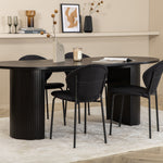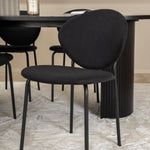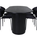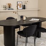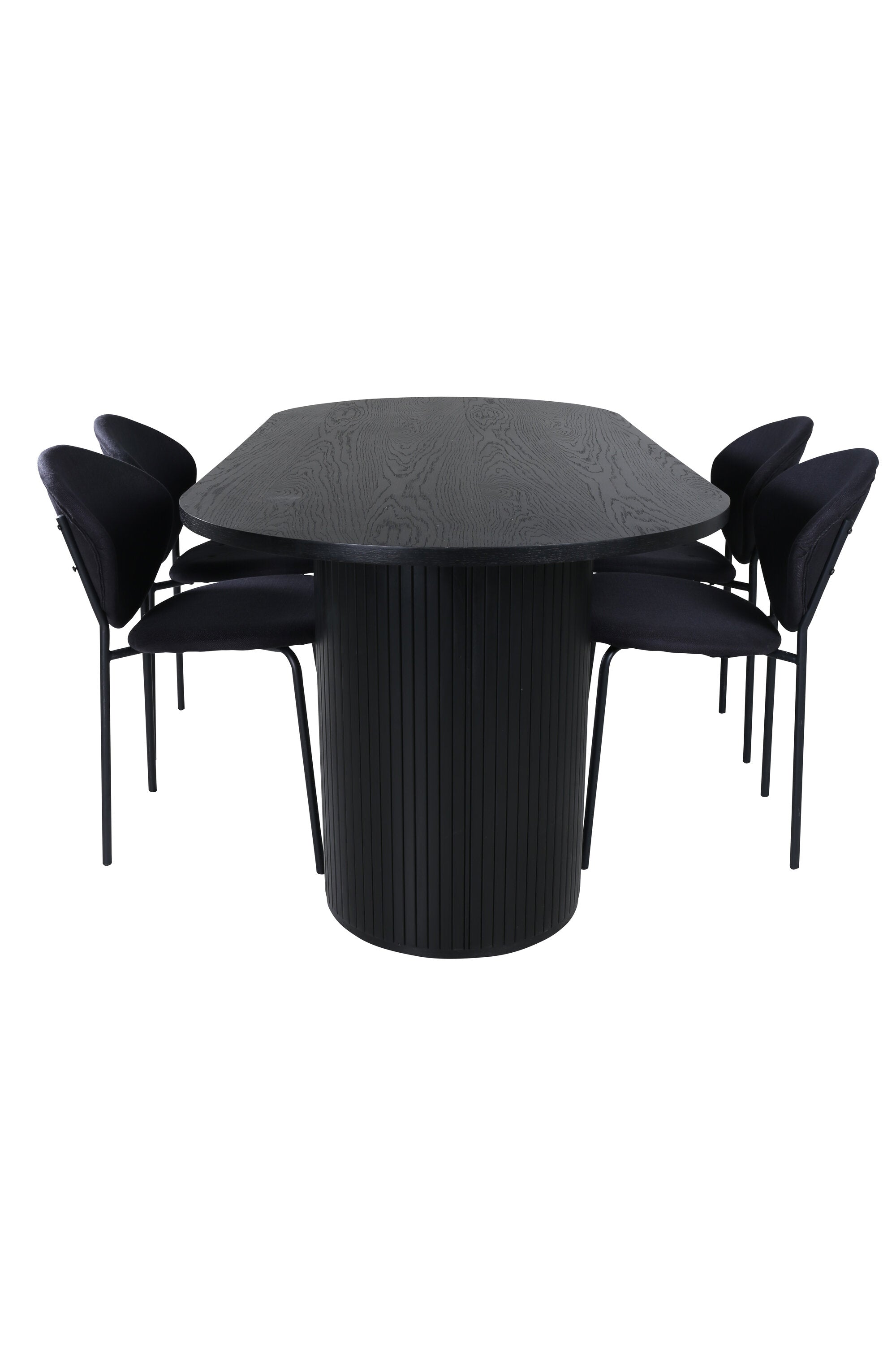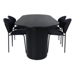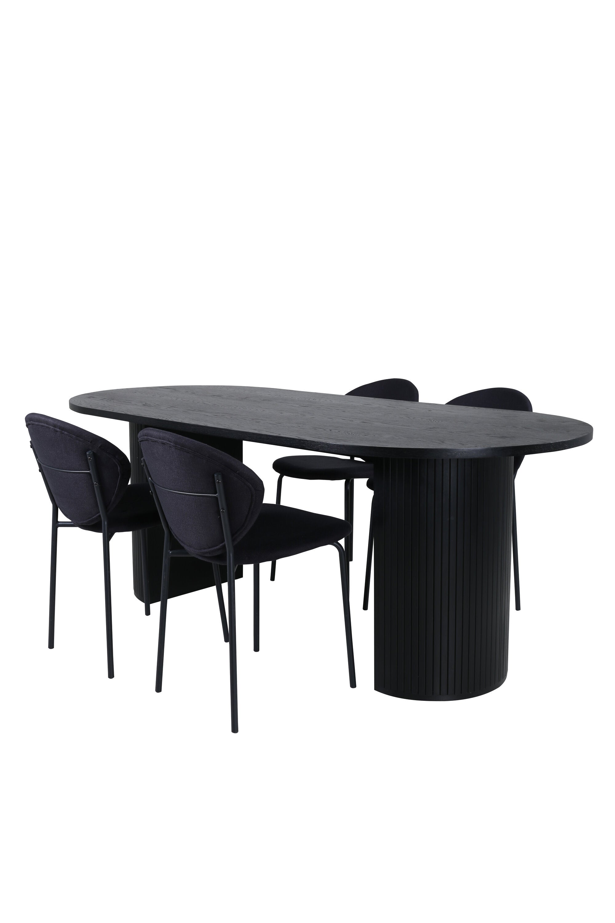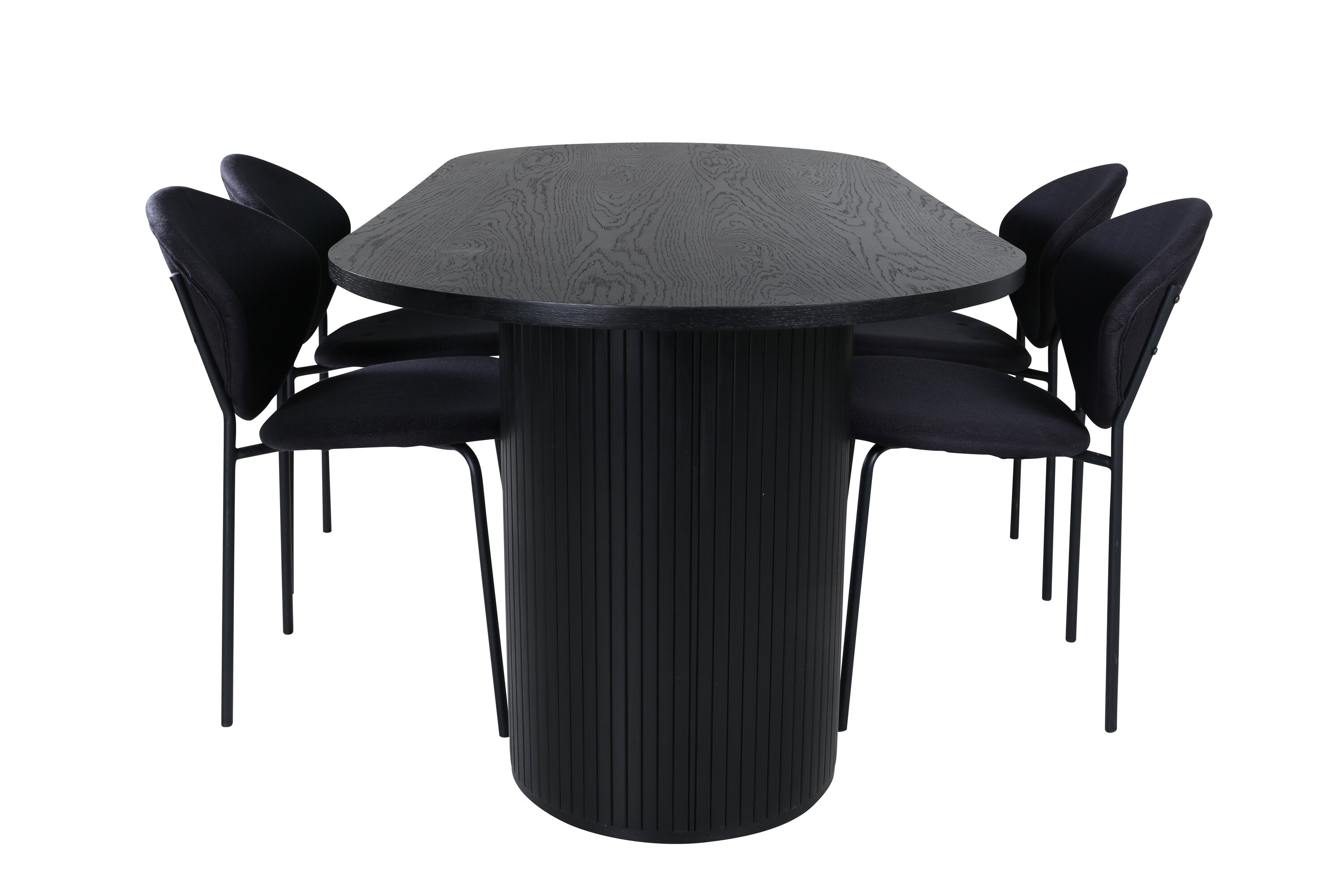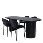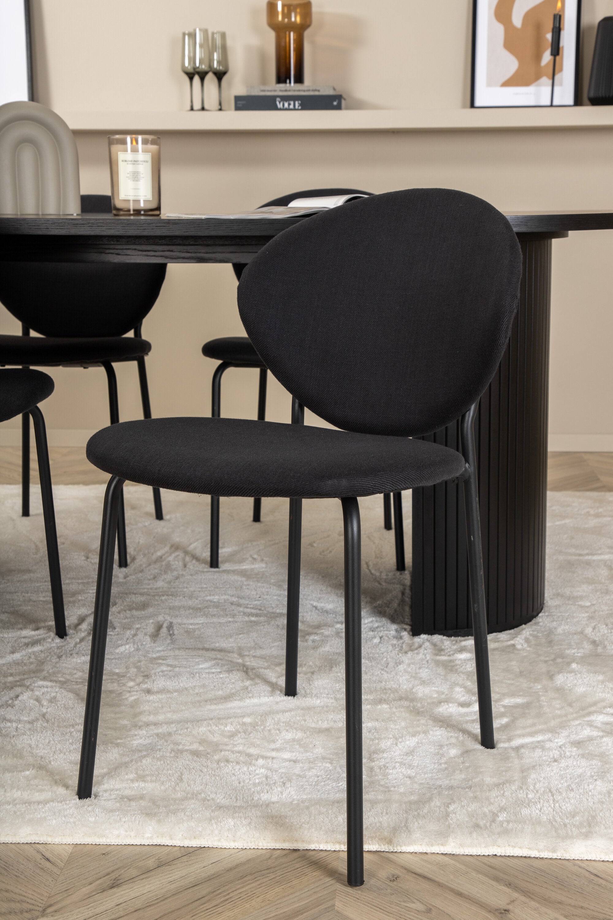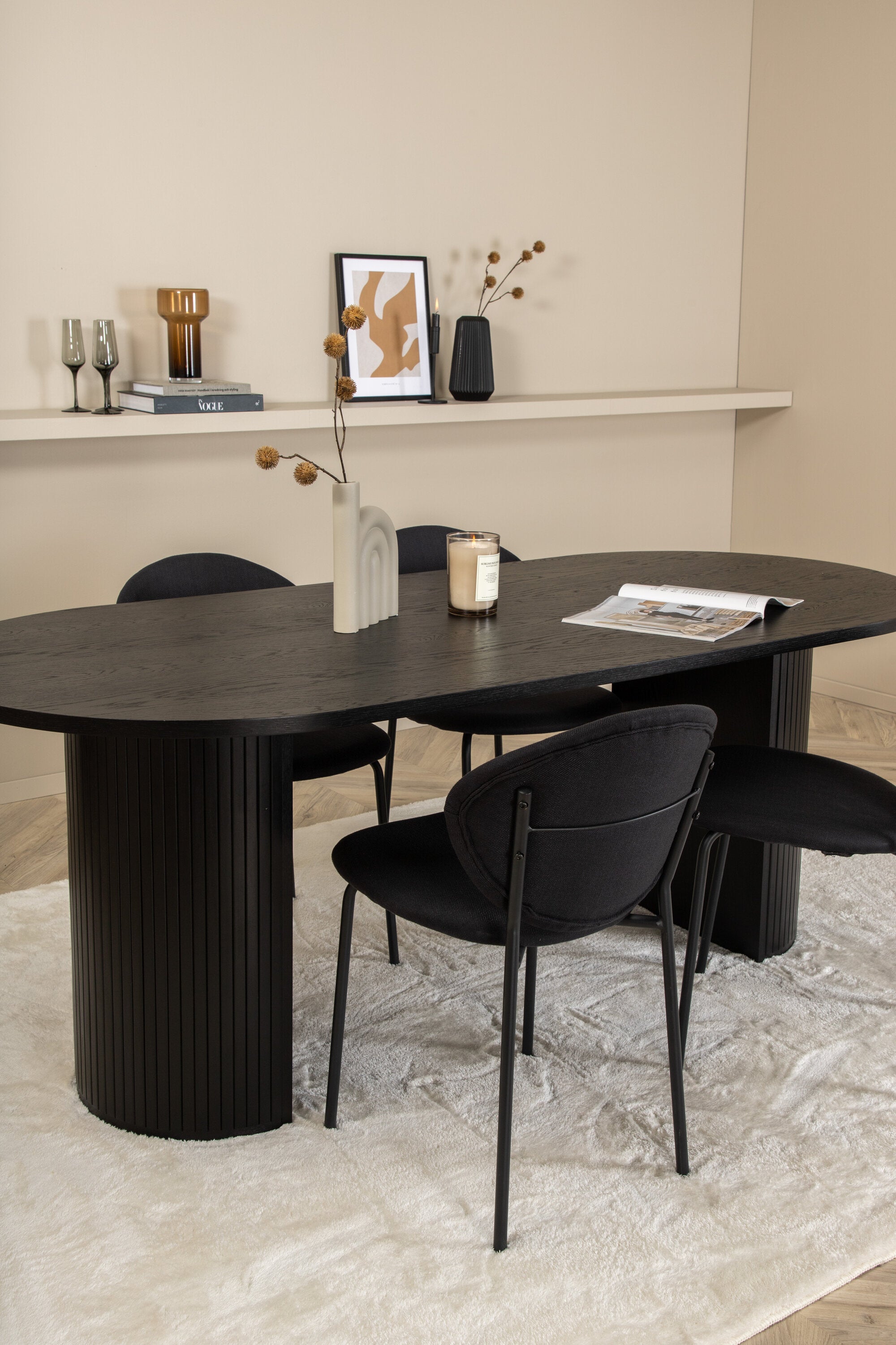 Plná skupina černého jídla nikdy nevyjde z času! Náš oválný jídelní stůl Bianca v konzistentně černé barvě má ​​trendy design se stolovou deskou z MDF a robustním rámem v žebrovaném provedení, který působí stabilním dojmem. Rozměry stolu: Délka: 200 cm, Šířka: 90 cm, Výška: 75 cm. Zde sladěné se 4 jídelními židlemi Vault v oválném designu. Nohy židle jsou úzké v černém kovu a sedák z černého polyesteru. Rozměry židle: výška: 80 cm, výška sedáku: 49 cm, šířka: 46 cm, hloubka: 61,5 cm. Ať se čas u jídelního stolu stane jedním z vrcholů dneška!