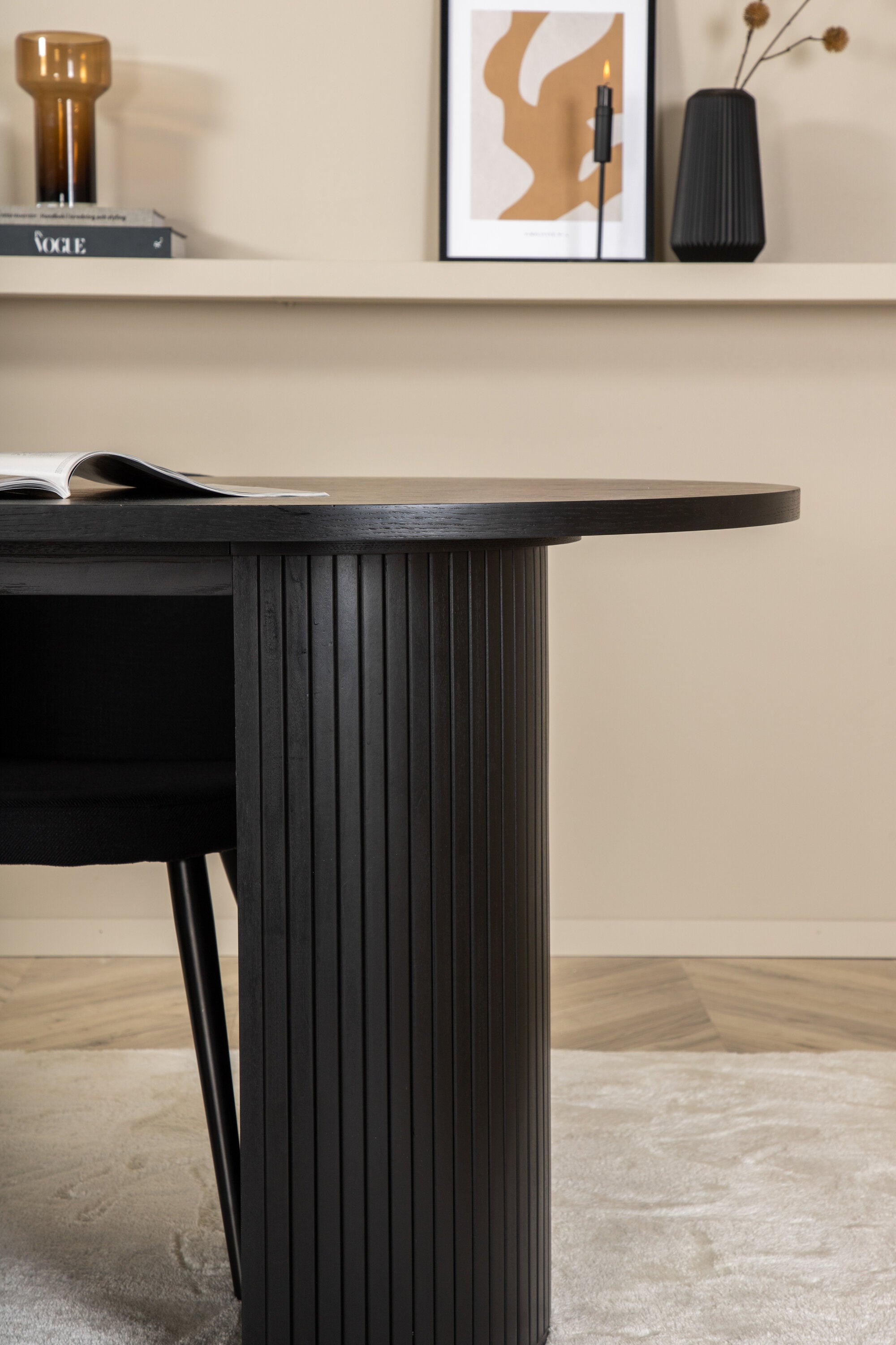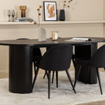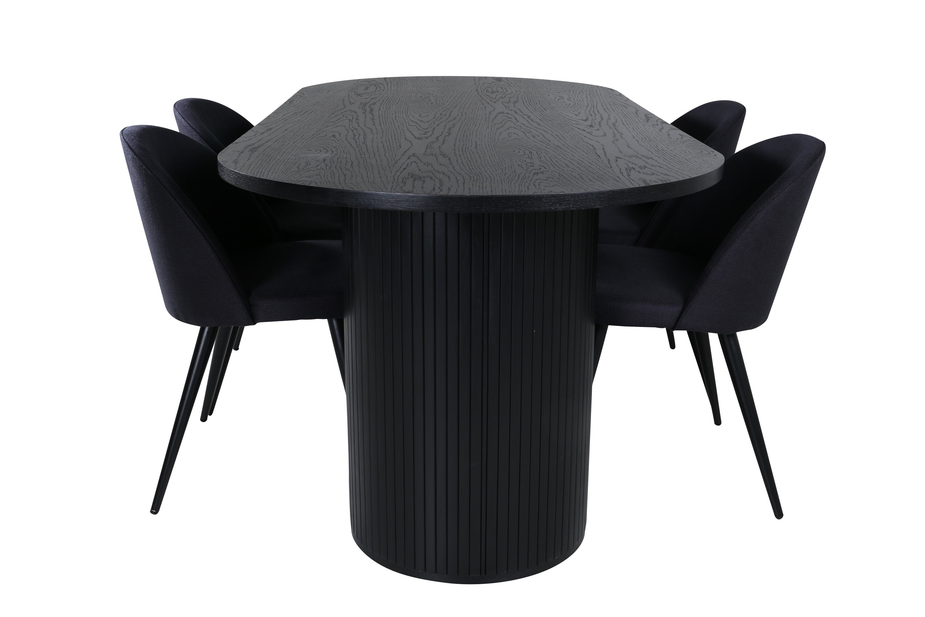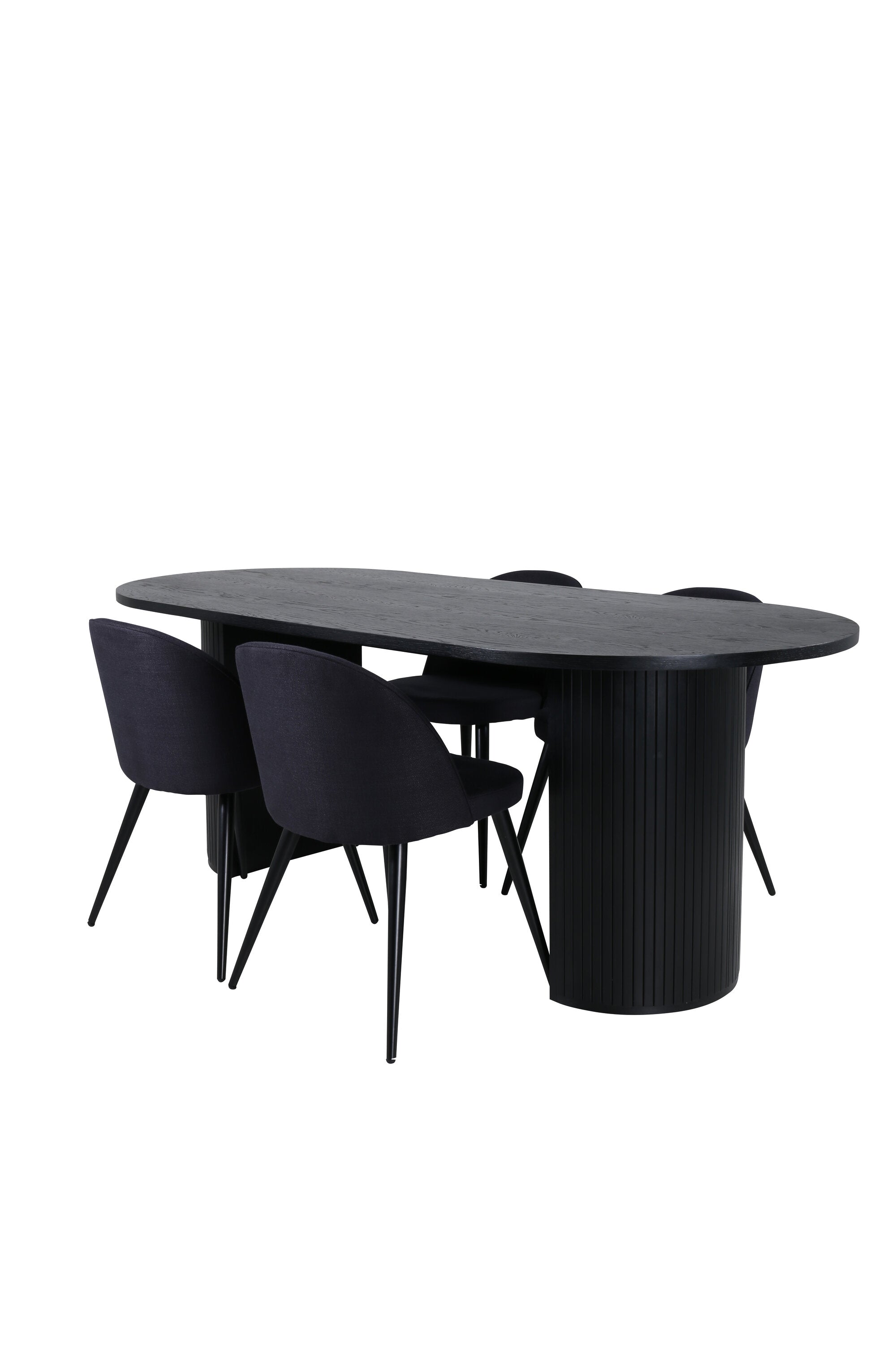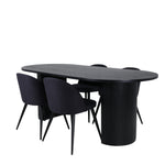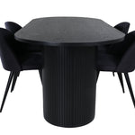 Pohodlně se usaďte a vytvořte moderní poutač, který zaujme! Náš oválný jídelní stůl Bianca v konzistentně černé barvě má ​​trendy design se stolovou deskou z MDF a robustním rámem v žebrovaném provedení, který působí stabilním dojmem. Rozměry stolu: Délka: 200 cm, Šířka: 90 cm, Výška: 75 cm. Sladěno se 4 sametovými jídelními židlemi s černými kovovými kostmi a sedáky z polyesteru. Rozměry židle: Výška: 76,5 cm, výška sedáku: 46,5 cm, šířka: 50 cm, hloubka: 57 cm. Nemusíte dělat kompromisy mezi stylem a pohodlím!