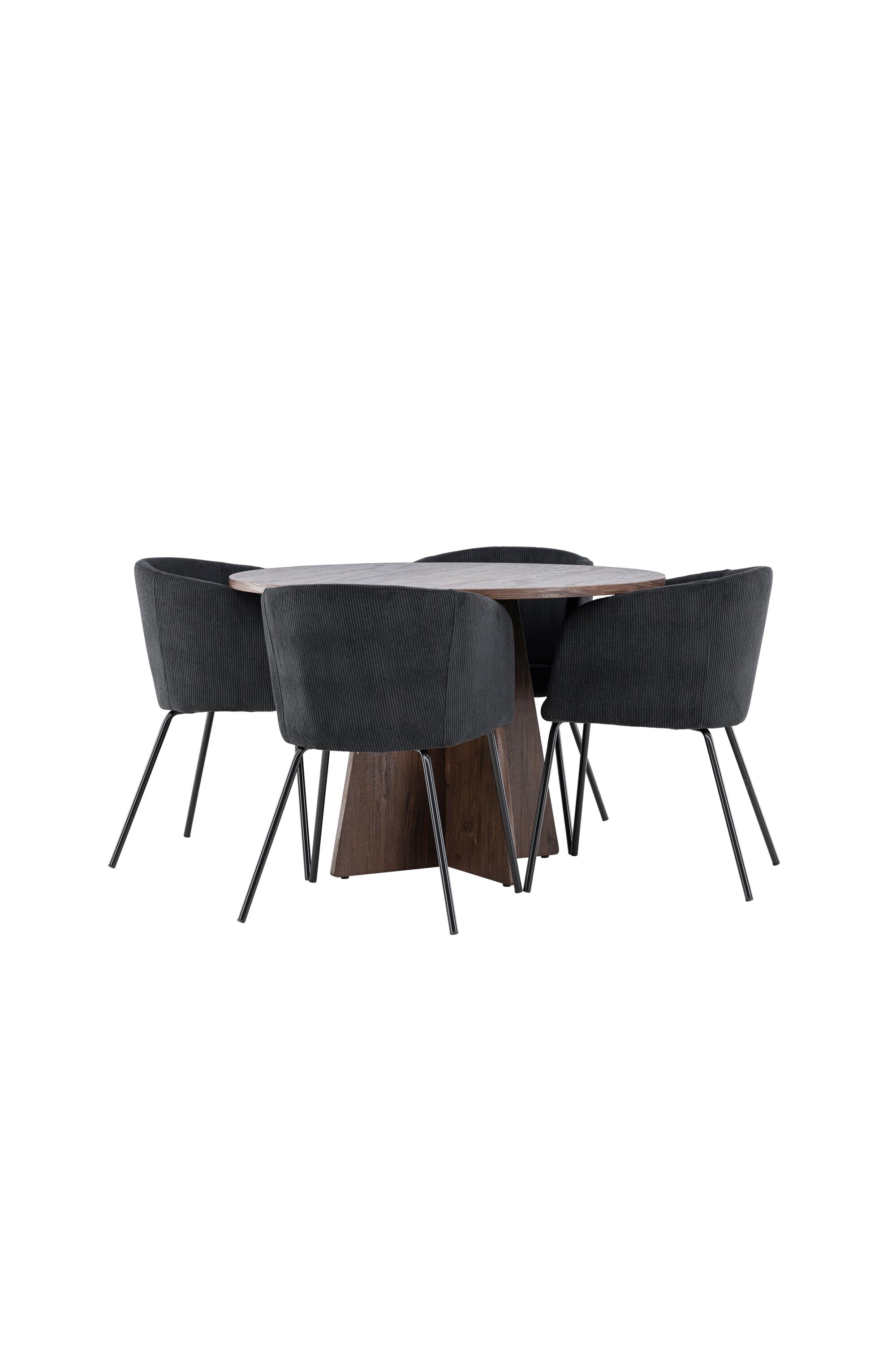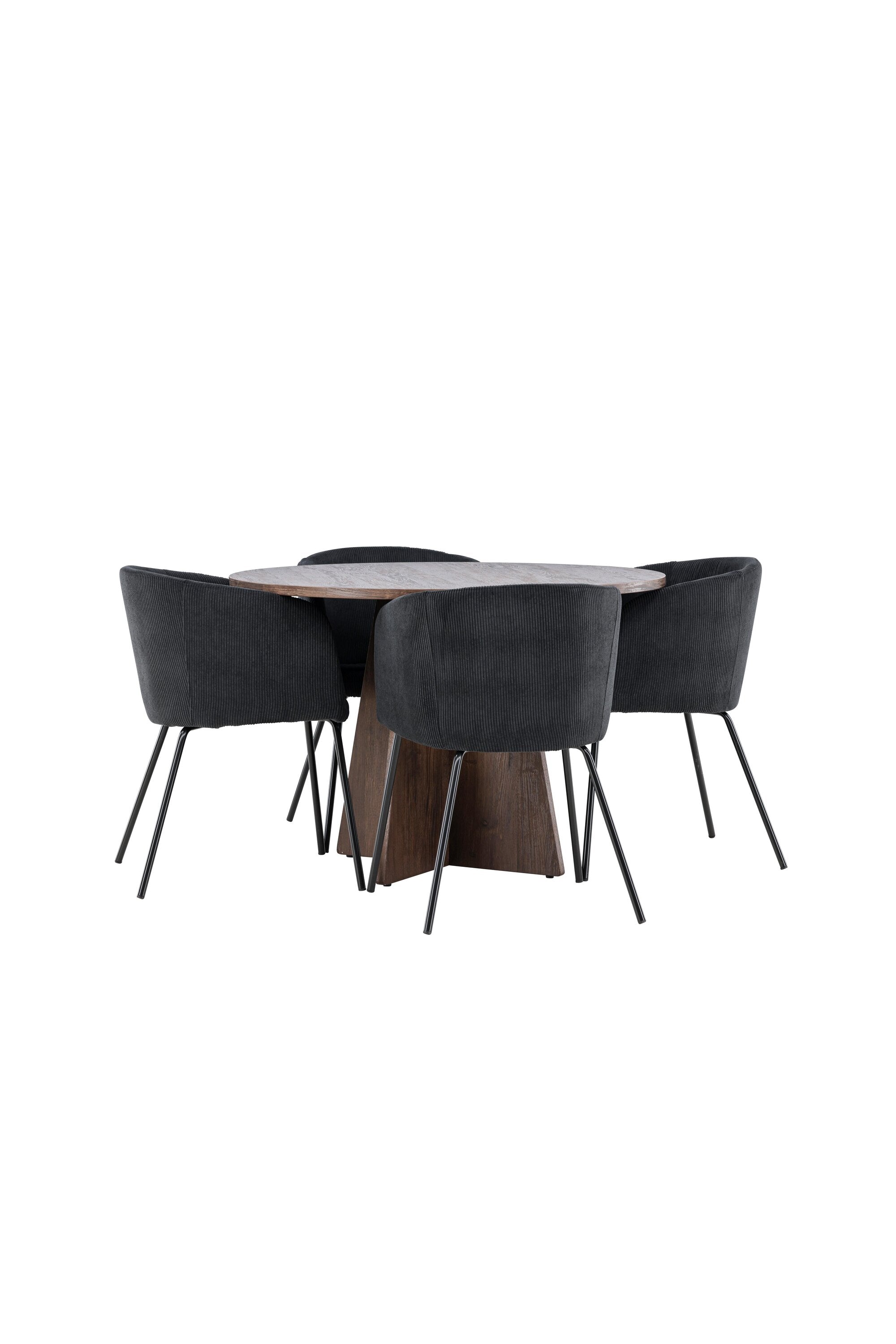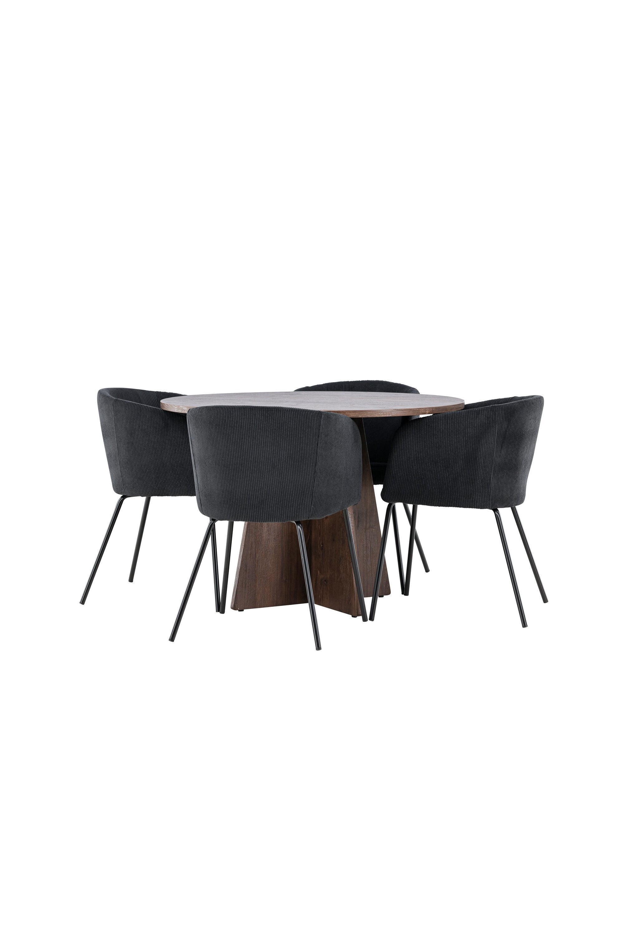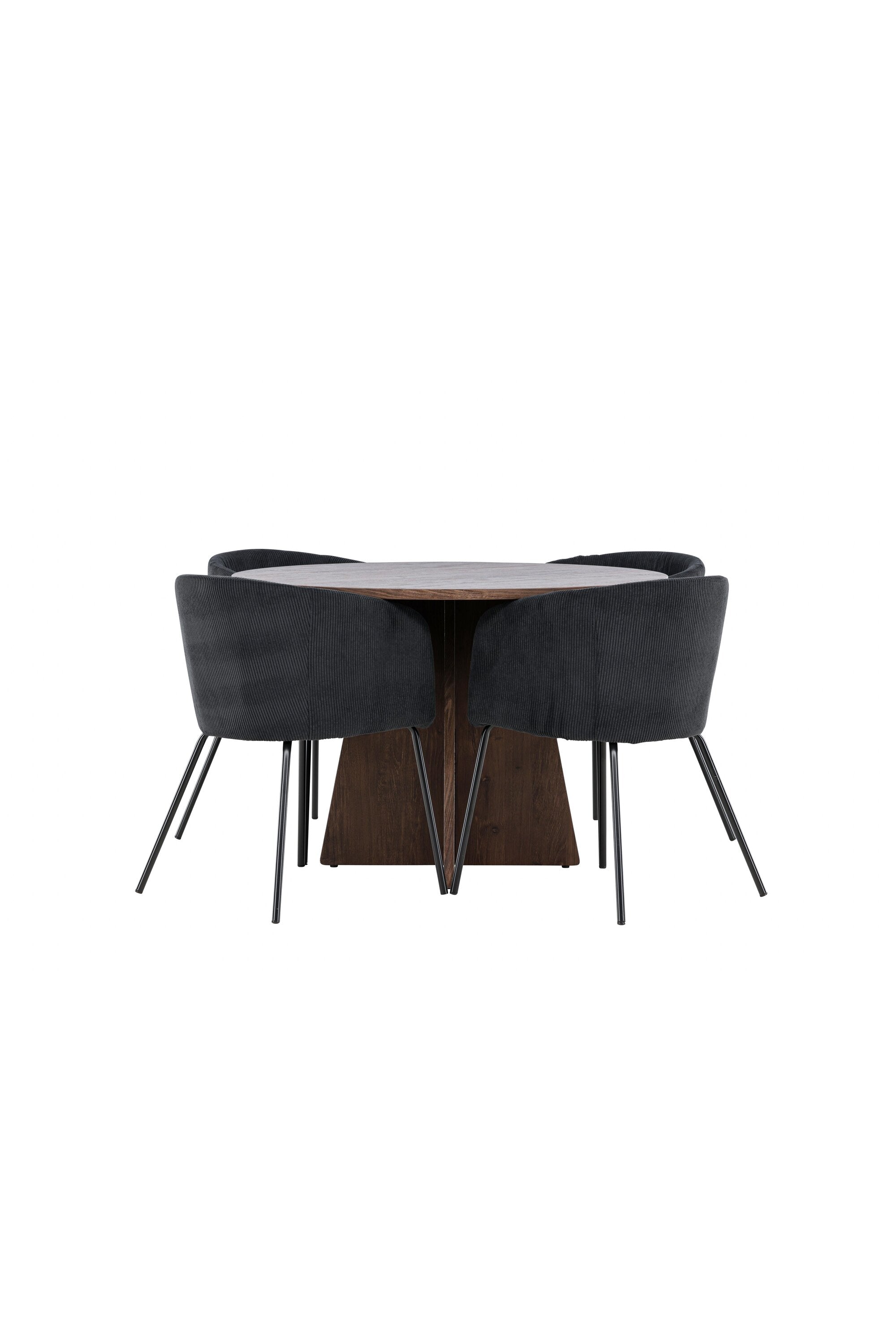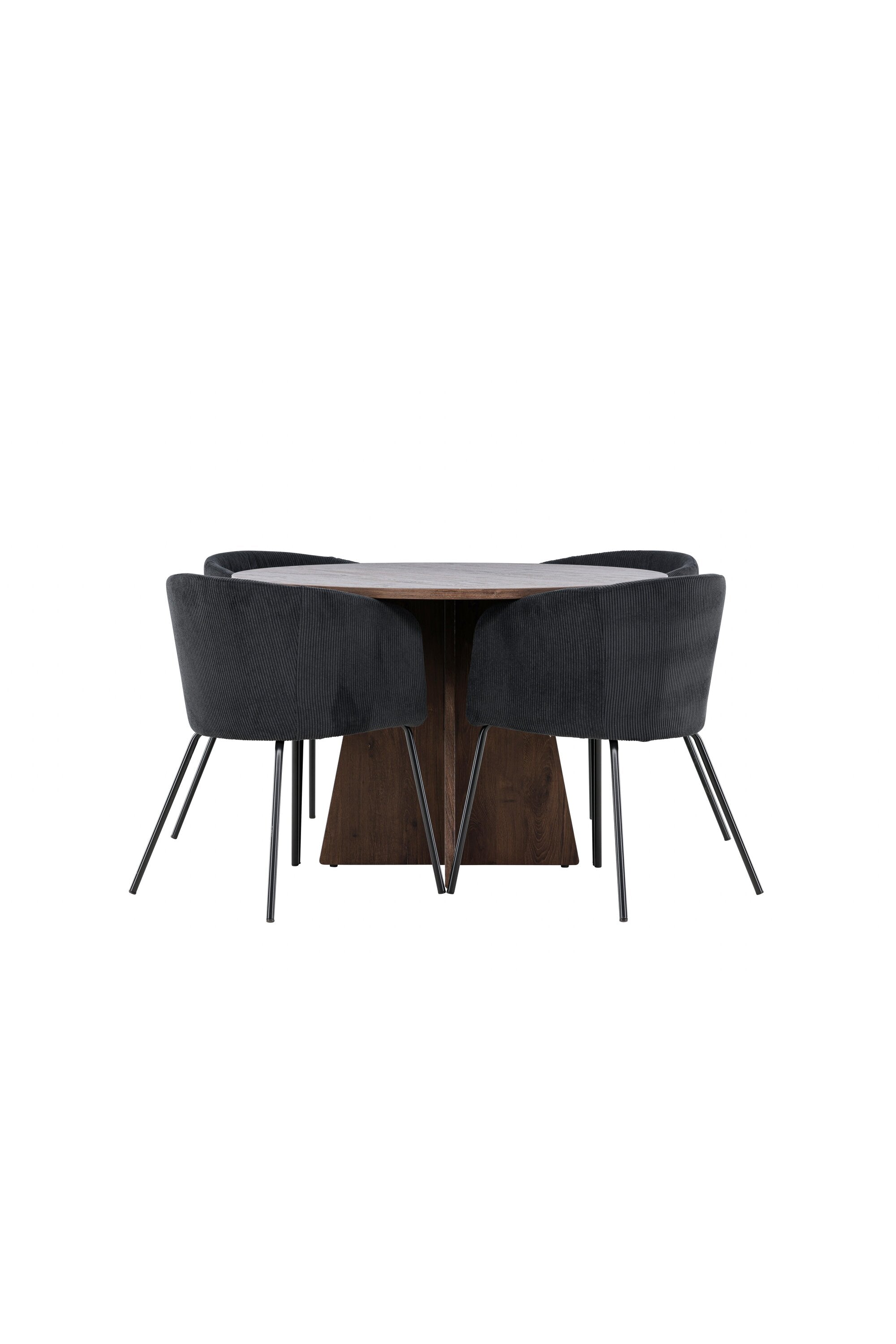Vytvořte si elegantní a moderní jídelní kout s naší exkluzivní jídelní sadou, která kombinuje elegantní stůl Bootcut se sofistikovanými židlemi Berit. Tato jídelní sada je ideální jak pro každodenní použití, tak pro zvláštní příležitosti a dodá vaší jídelně elegantní a moderní atmosféru. Stůl Bootcut, v rafinovaném mocca odstínu, je vyroben z MDF materiálu a má průměr 110 cm. Jeho kulatý tvar a robustní konstrukce z něj dělají ideální středobod vaší jídelny, ideální pro příjemné večeře a společné chvíle. Černé židle Berit jsou čalouněny luxusním manšestrem, poskytujícím pohodlí i nádech elegance. Díky měkkým a pohodlným sedadlům jsou tato křesla navržena tak, abyste si mohli vychutnat dlouhé a chutné jídlo s rodinou a přáteli. Tato jídelní souprava je dokonalým spojením stylu a funkčnosti, takže je vynikající volbou pro ty, kteří chtějí příjemný a moderní jídelní kout. Vylepšete svou jídelnu touto krásnou kombinací stolu Bootcut a židlí Berit a vytvořte si místo, kde se budou sdílet vzpomínky a radost.