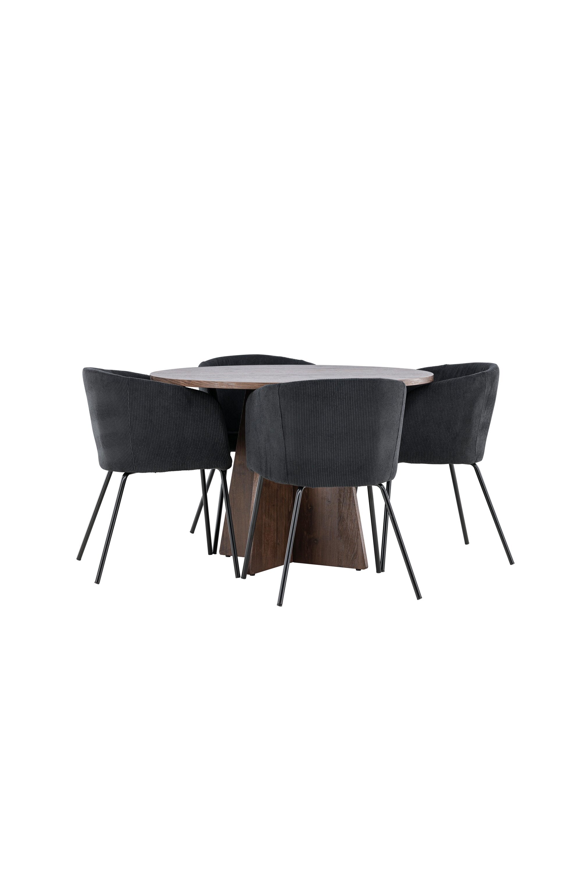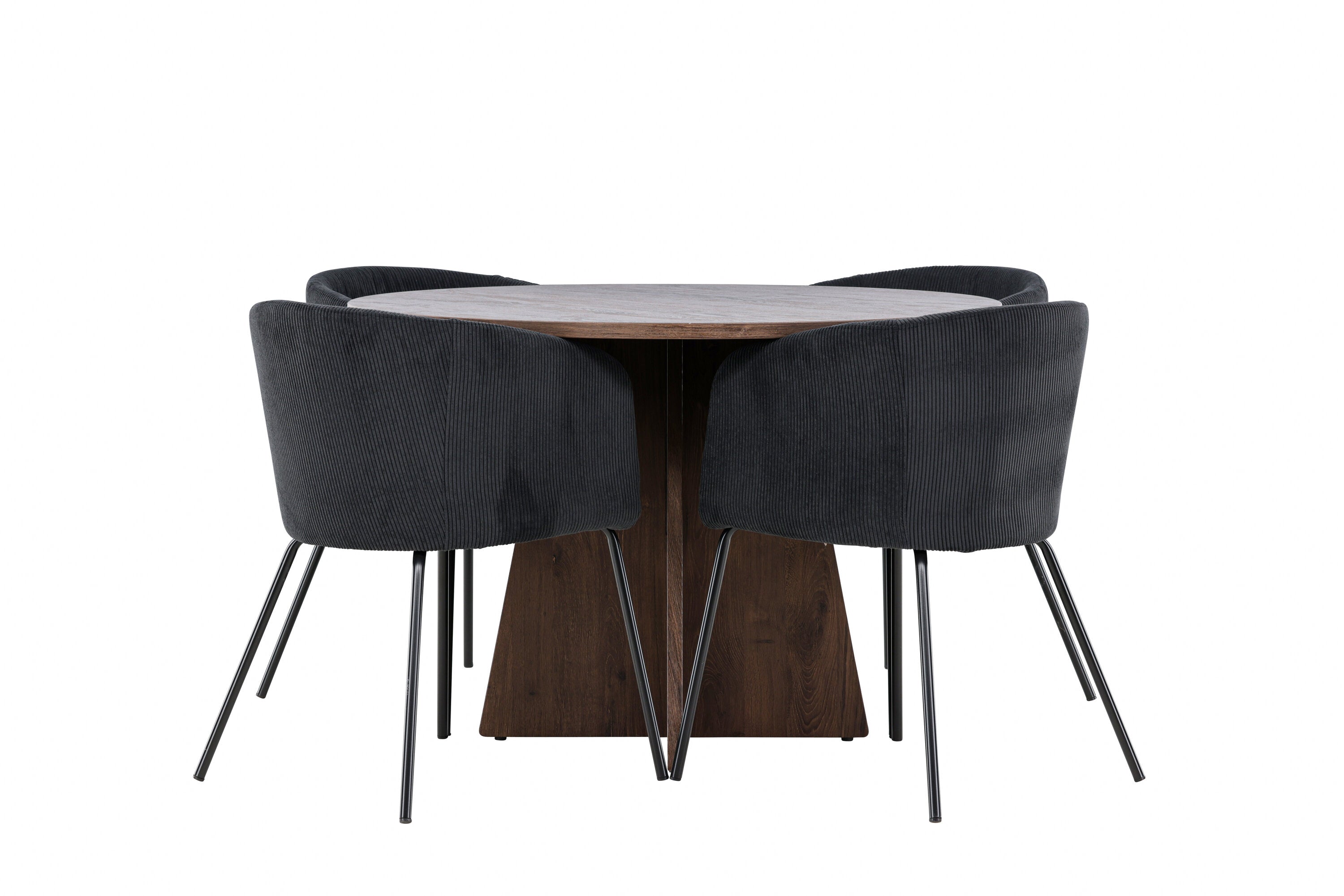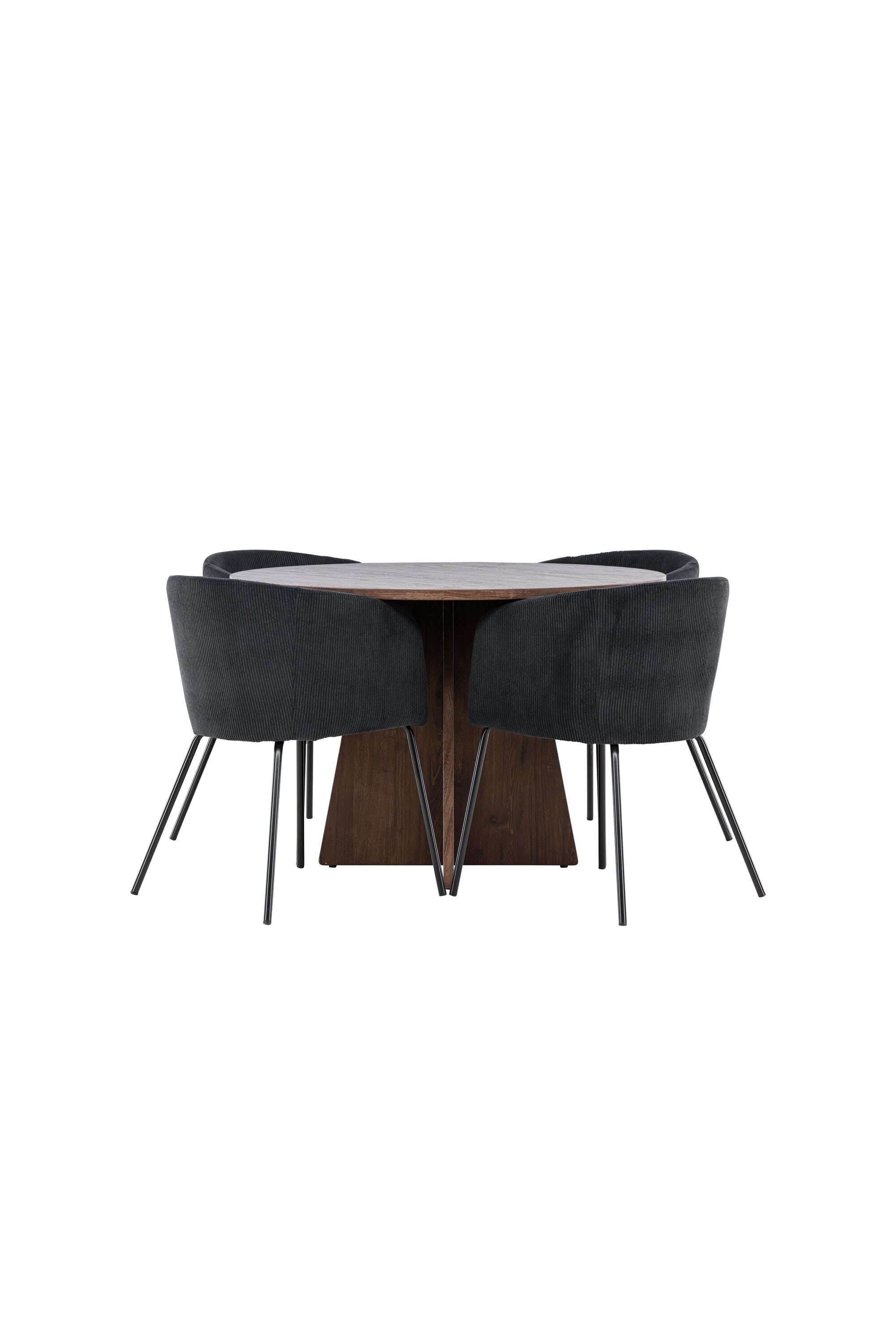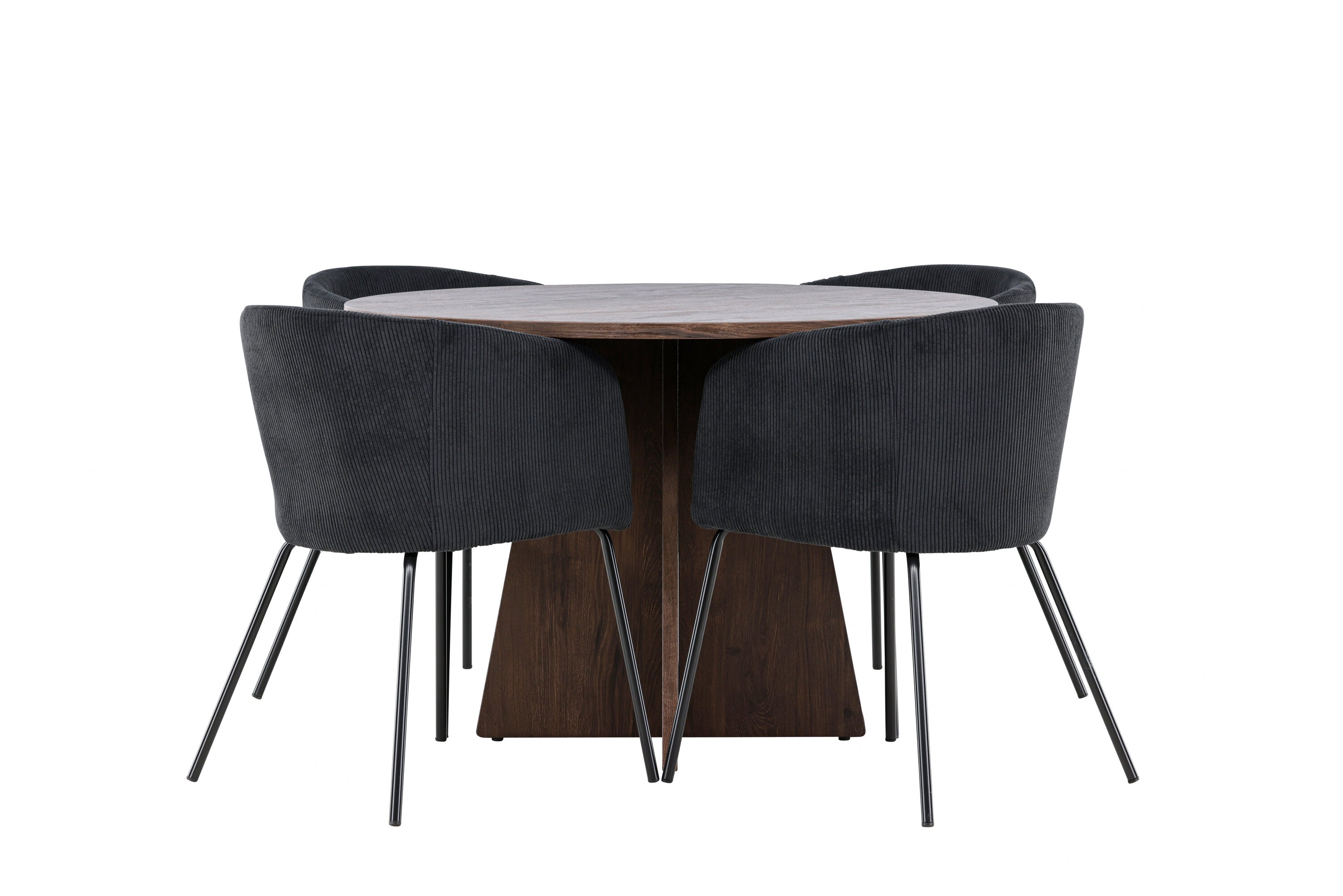 Vytvořte si elegantní a moderní jídelní kout s naší exkluzivní jídelní sadou, která kombinuje elegantní stůl Bootcut se sofistikovanými židlemi Berit. Tato jídelní sada je ideální jak pro každodenní použití, tak pro zvláštní příležitosti a dodá vaší jídelně elegantní a moderní atmosféru. Stůl Bootcut, v rafinovaném mocca odstínu, je vyroben z MDF materiálu a má průměr 110 cm. Jeho kulatý tvar a robustní konstrukce z něj dělají ideální středobod vaší jídelny, ideální pro příjemné večeře a společné chvíle. Černé židle Berit jsou čalouněny luxusním manšestrem, poskytujícím pohodlí i nádech elegance. Díky měkkým a pohodlným sedadlům jsou tato křesla navržena tak, abyste si mohli vychutnat dlouhé a chutné jídlo s rodinou a přáteli. Tato jídelní souprava je dokonalým spojením stylu a funkčnosti, takže je vynikající volbou pro ty, kteří chtějí příjemný a moderní jídelní kout. Vylepšete svou jídelnu touto krásnou kombinací stolu Bootcut a židlí Berit a vytvořte si místo, kde se budou sdílet vzpomínky a radost.