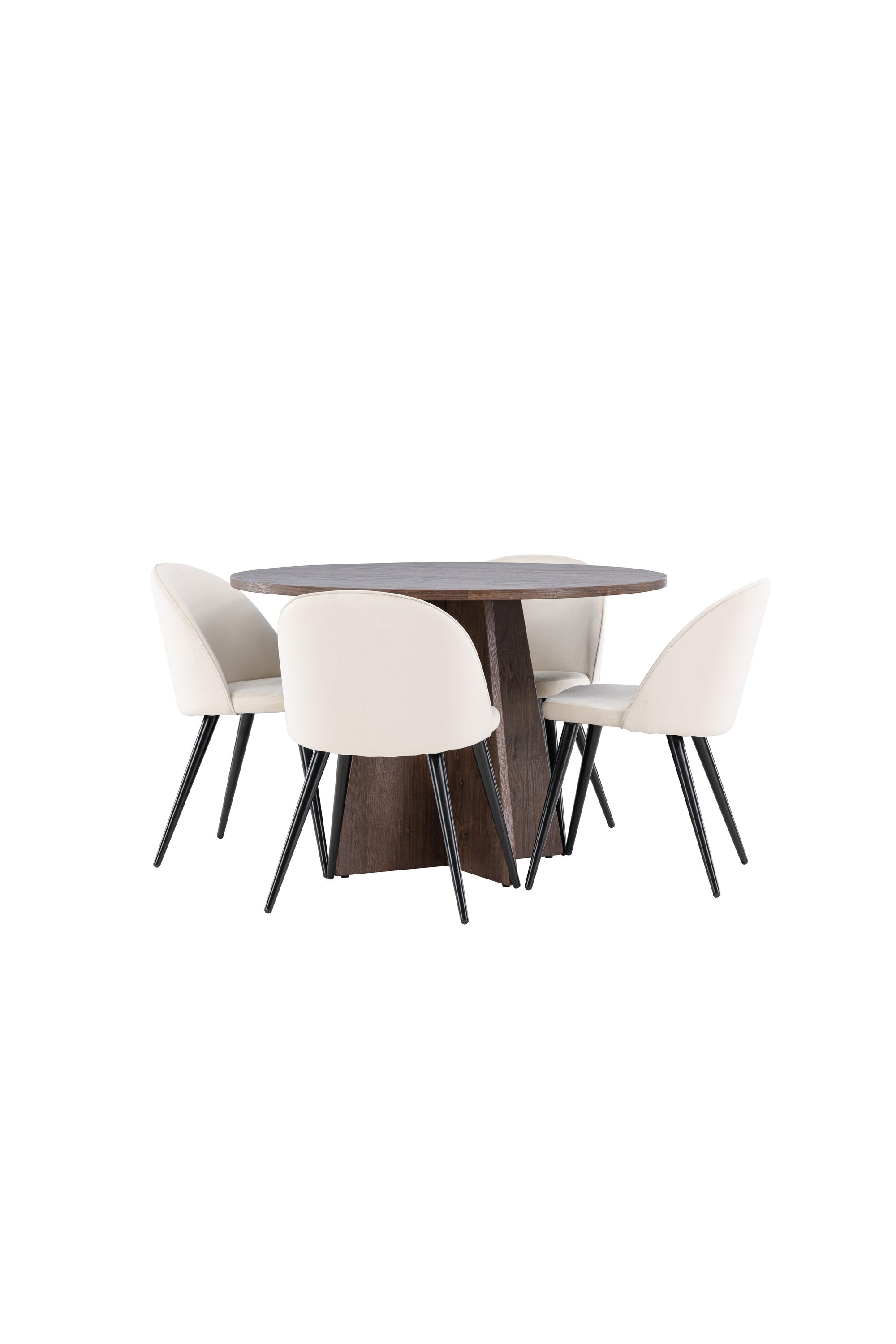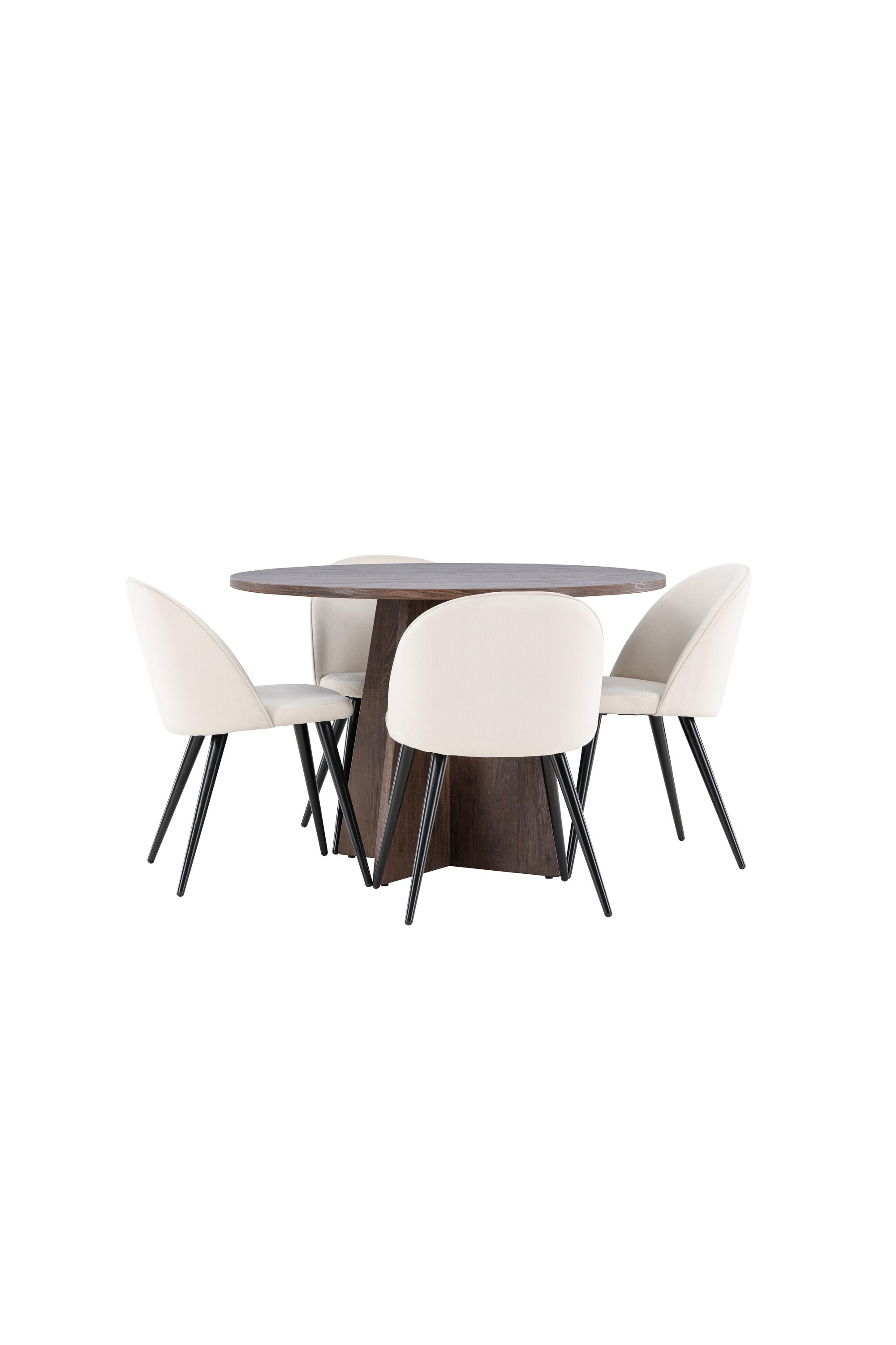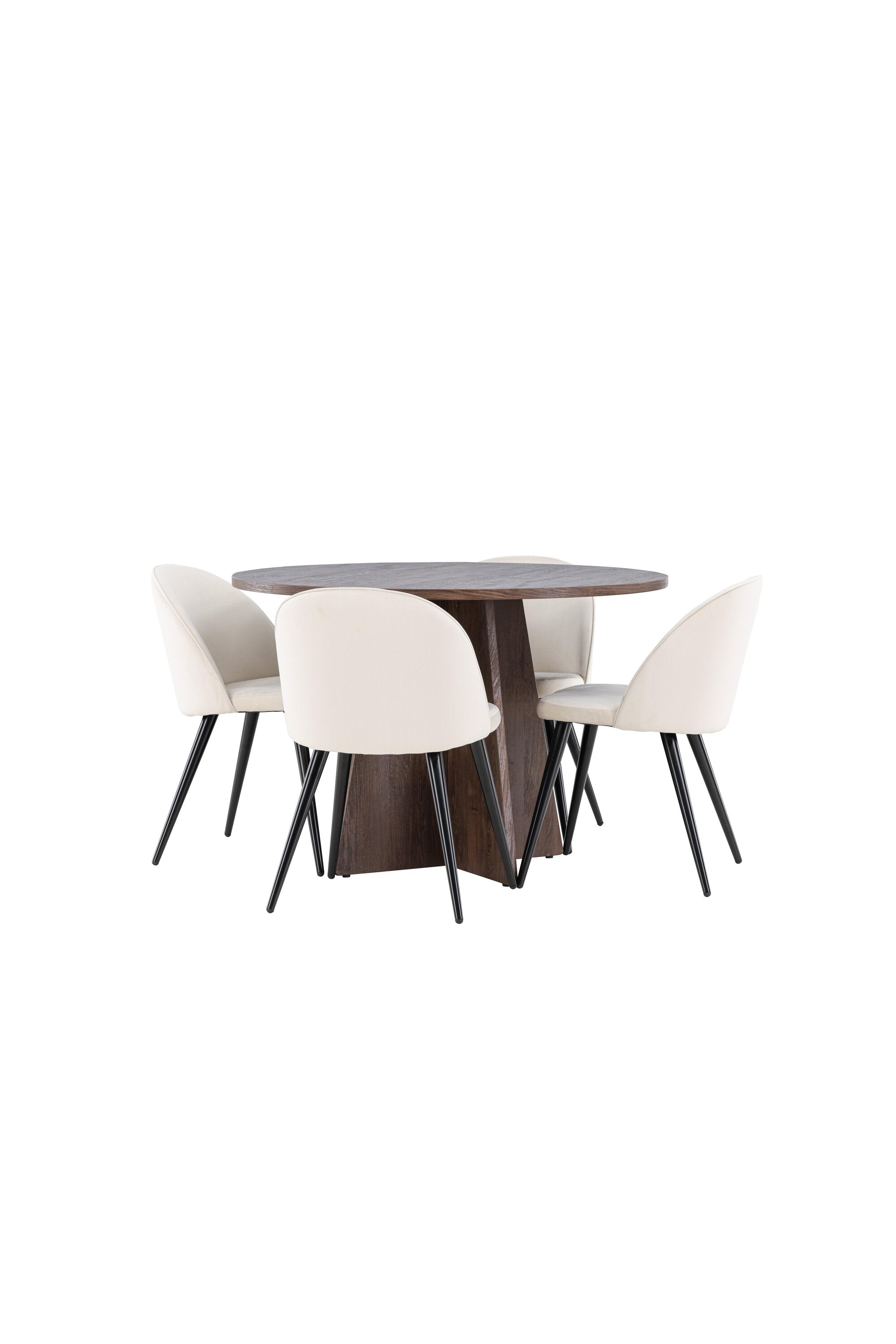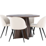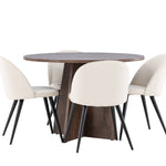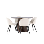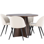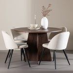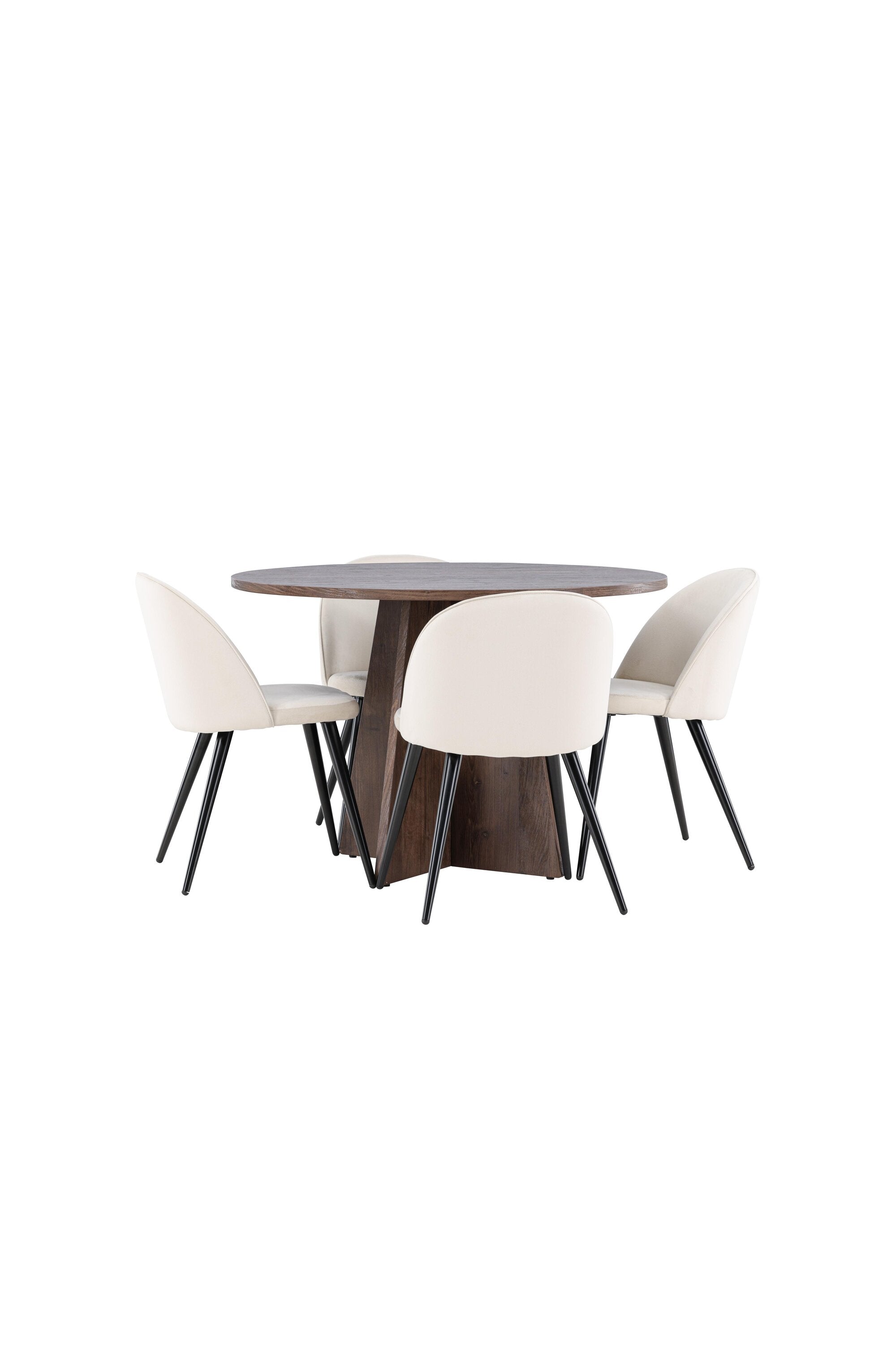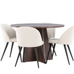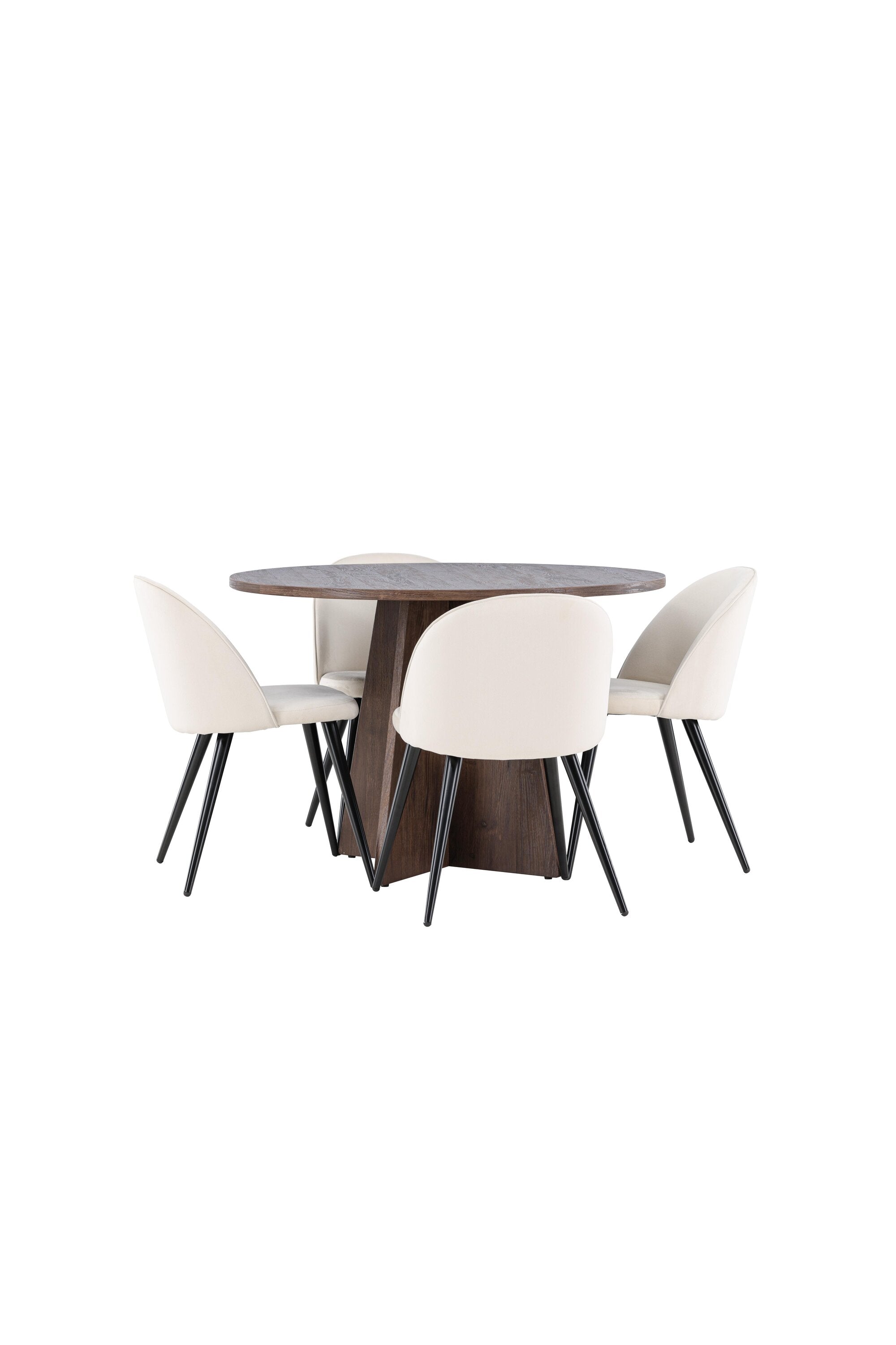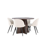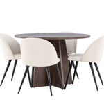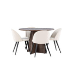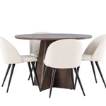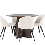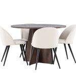 Proměňte svůj jídelní kout s naší elegantní jídelní sadou, která kombinuje elegantní stůl Bootcut s luxusními židlemi Velvet. Tato jídelní souprava je ideální pro každodenní stravování i slavnostní příležitosti a dodá vaší jídelně sofistikovaný a příjemný pocit. Stůl Bootcut je vyroben z MDF a má krásnou moka barvu. S průměrem 110 cm nabízí dostatek prostoru pro jídlo i rozhovory, přičemž jeho kulatý tvar navodí harmonickou atmosféru ve vaší jídelně. Robustní konstrukce zajišťuje dlouhodobé používání a stabilitu. Čtyři židle Velvet skvěle doplňují stůl s elegantními béžovými sedáky z měkkého sametu a stylovými černými nohami. Tyto židle nabízejí pohodlí i styl, díky čemuž jsou ideální pro dlouhé, relaxační večeře s rodinou a přáteli. Jejich moderní design s vysokými opěradly a luxusními sedáky dodá vaší jídelně sofistikovaný nádech. Tato jídelní souprava je dokonalou kombinací estetiky a funkčnosti, takže je vynikající volbou pro ty, kteří chtějí elegantní a pohodlný jídelní kout. Vylepšete svou jídelnu stylovou kombinací stolu Bootcut a židlí Velvet a vytvořte si místo, kde se budou sdílet vzpomínky a radost.