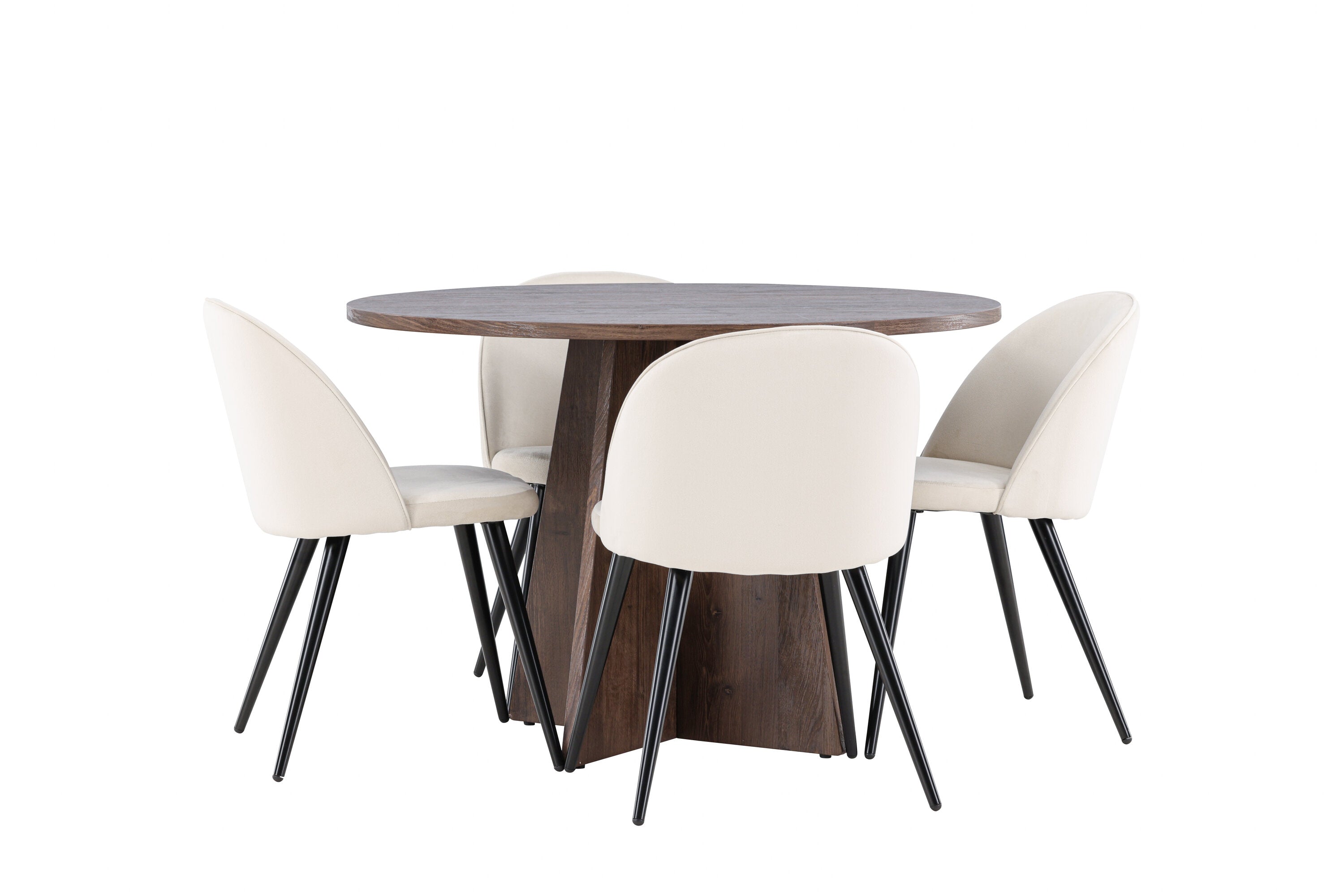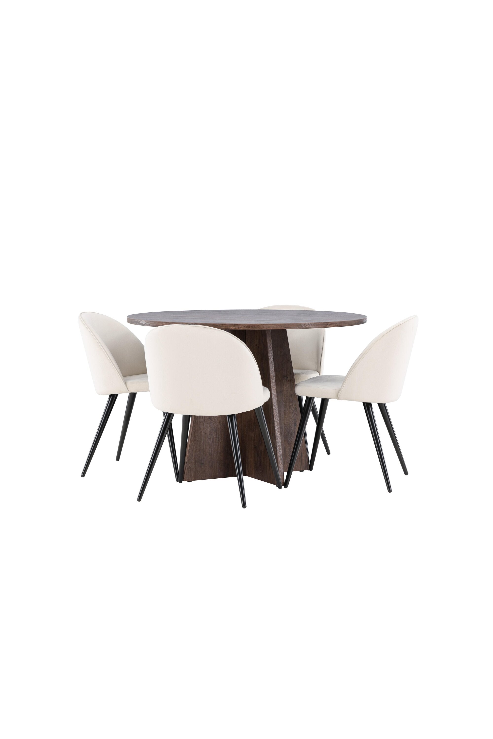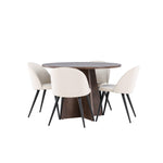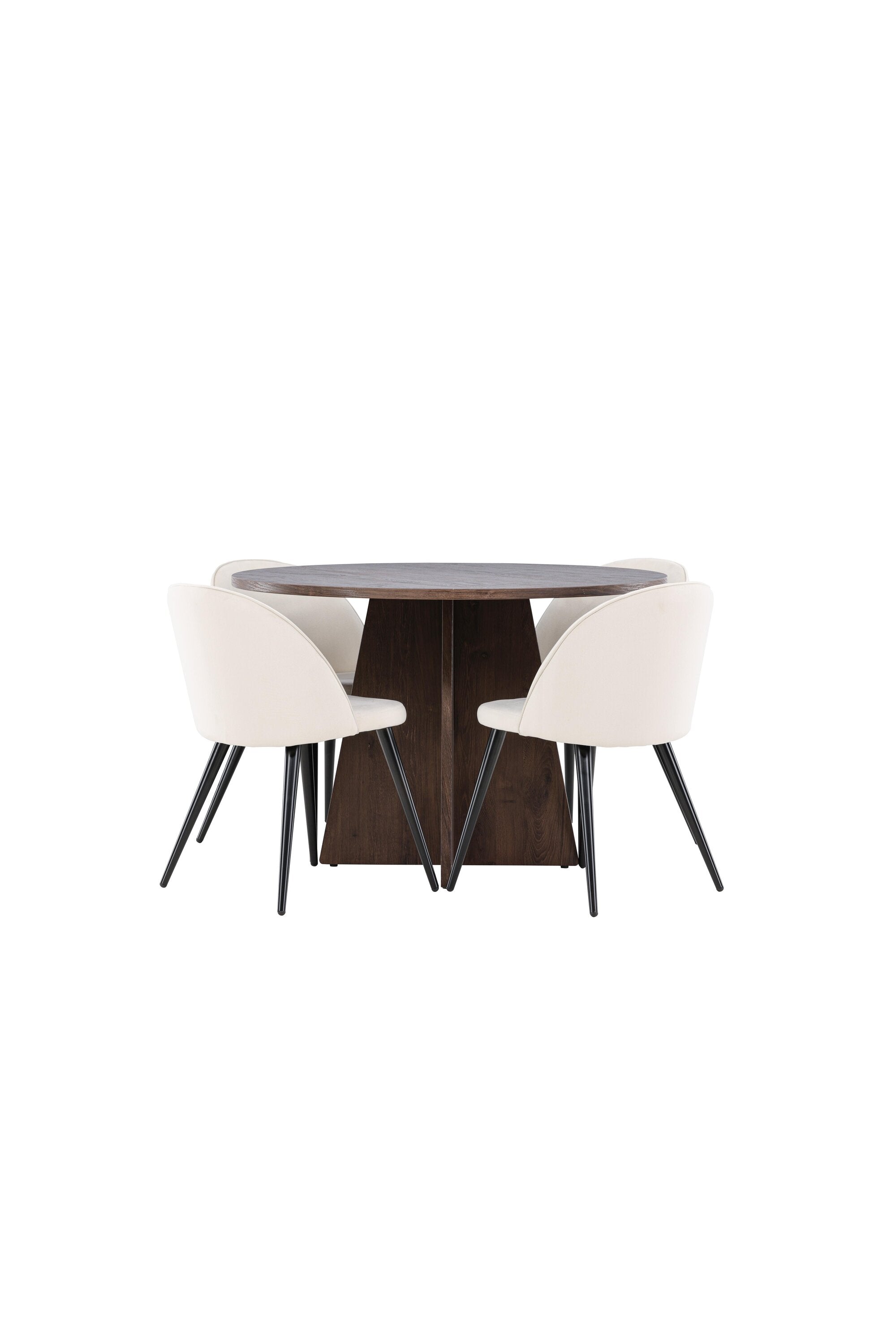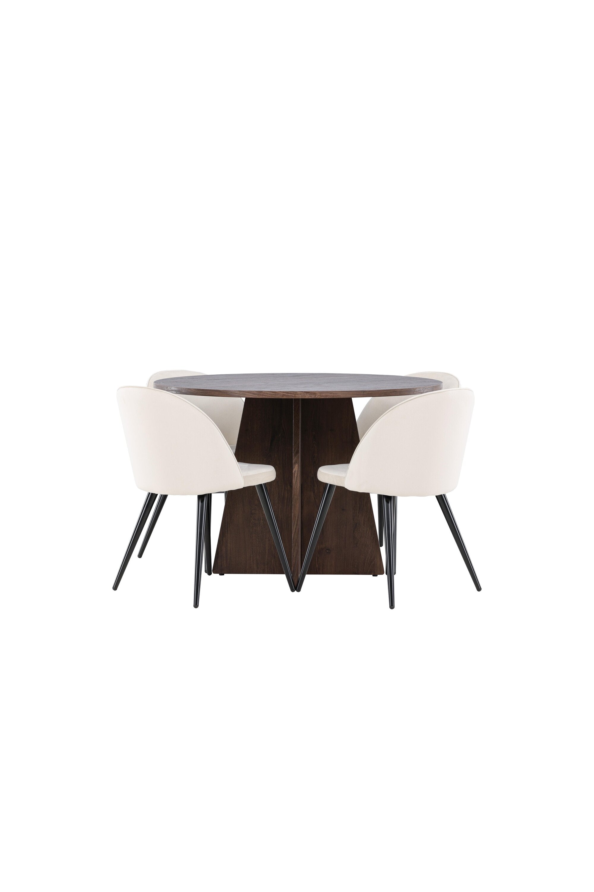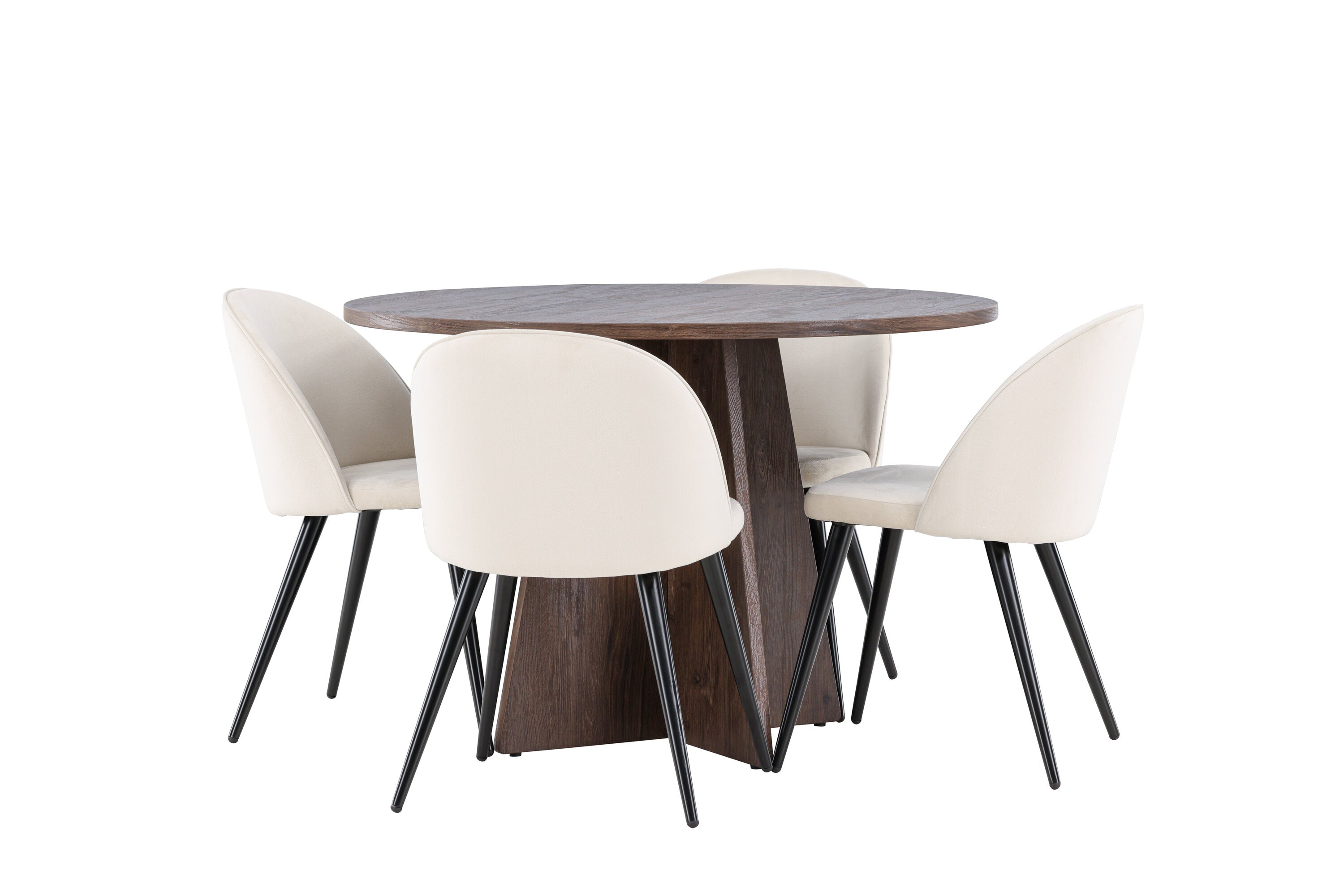 Proměňte svůj jídelní kout s naší elegantní jídelní sadou, která kombinuje elegantní stůl Bootcut s luxusními židlemi Velvet. Tato jídelní souprava je ideální pro každodenní stravování i slavnostní příležitosti a dodá vaší jídelně sofistikovaný a příjemný pocit. Stůl Bootcut je vyroben z MDF a má krásnou moka barvu. S průměrem 110 cm nabízí dostatek prostoru pro jídlo i rozhovory, přičemž jeho kulatý tvar navodí harmonickou atmosféru ve vaší jídelně. Robustní konstrukce zajišťuje dlouhodobé používání a stabilitu. Čtyři židle Velvet skvěle doplňují stůl s elegantními béžovými sedáky z měkkého sametu a stylovými černými nohami. Tyto židle nabízejí pohodlí i styl, díky čemuž jsou ideální pro dlouhé, relaxační večeře s rodinou a přáteli. Jejich moderní design s vysokými opěradly a luxusními sedáky dodá vaší jídelně sofistikovaný nádech. Tato jídelní souprava je dokonalou kombinací estetiky a funkčnosti, takže je vynikající volbou pro ty, kteří chtějí elegantní a pohodlný jídelní kout. Vylepšete svou jídelnu stylovou kombinací stolu Bootcut a židlí Velvet a vytvořte si místo, kde se budou sdílet vzpomínky a radost.