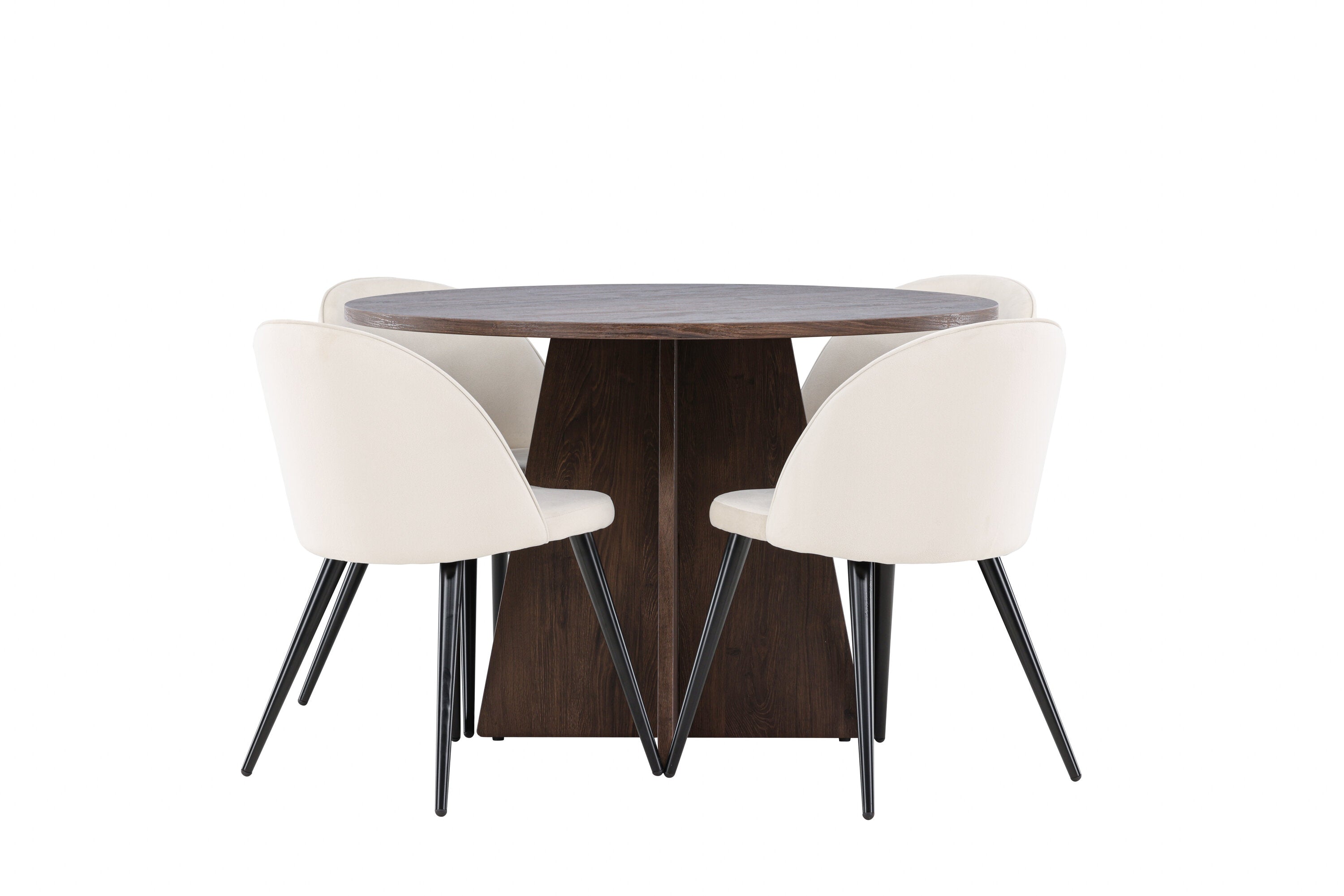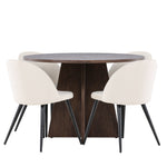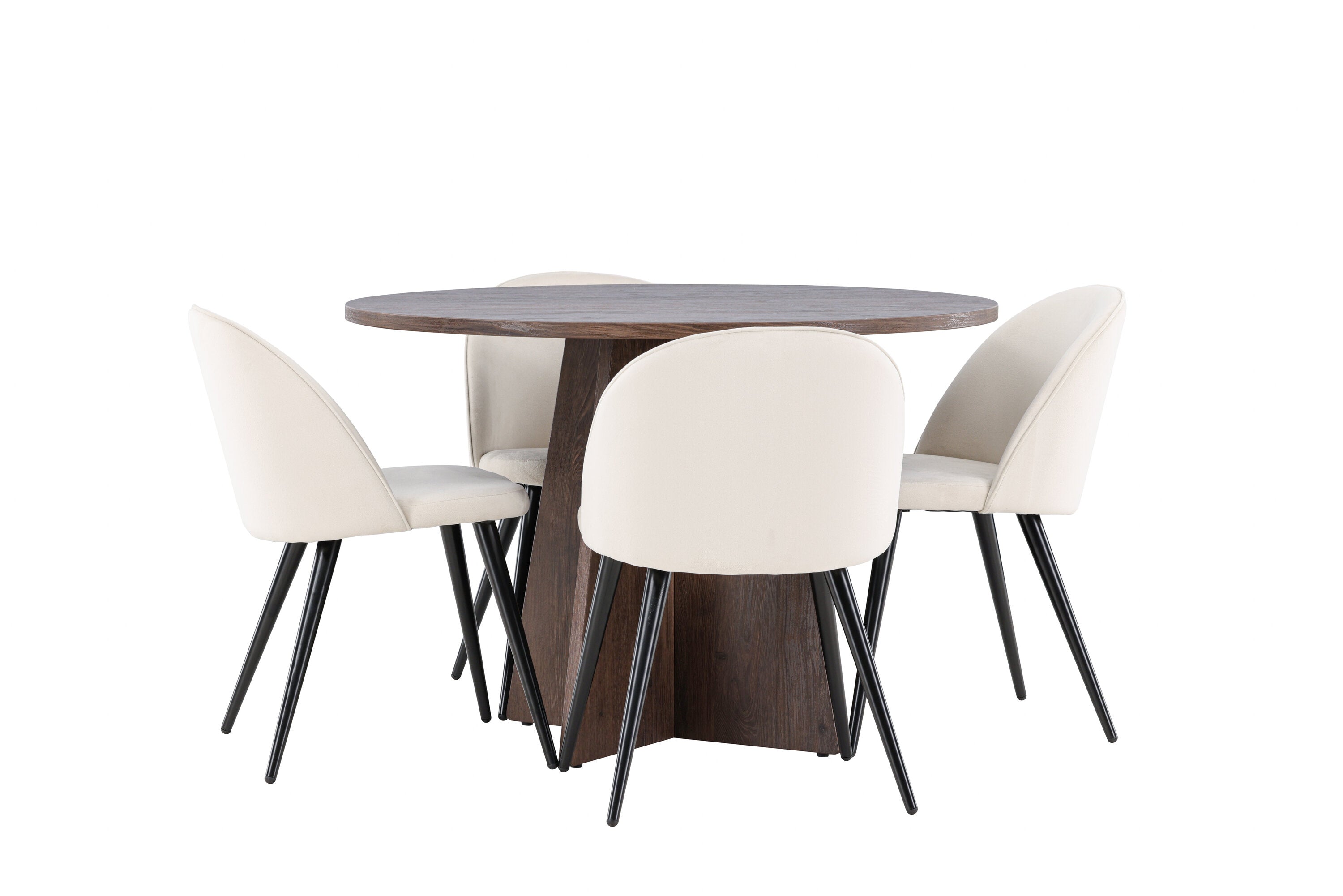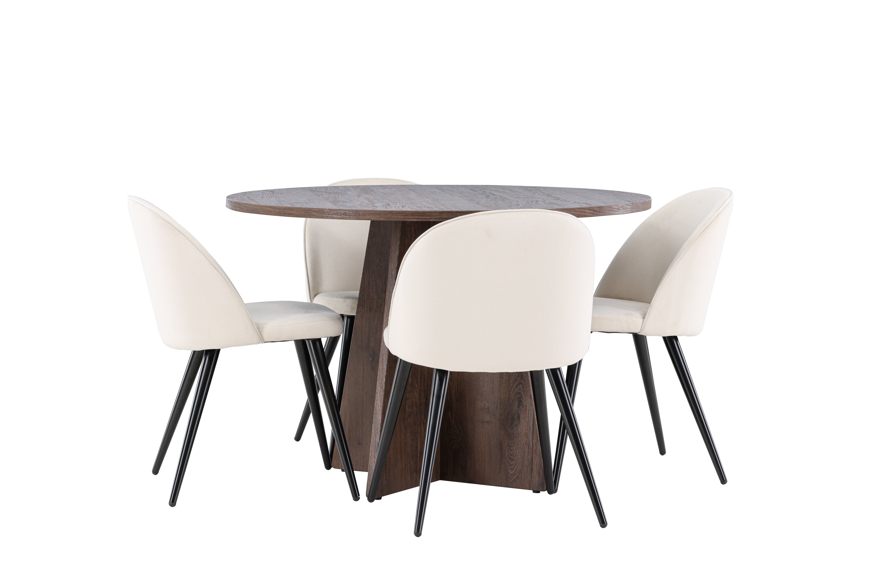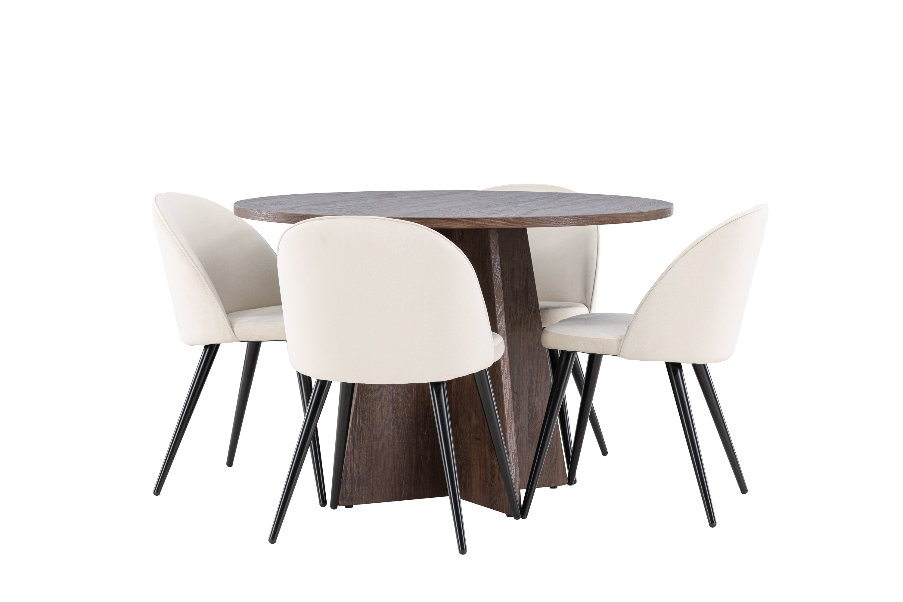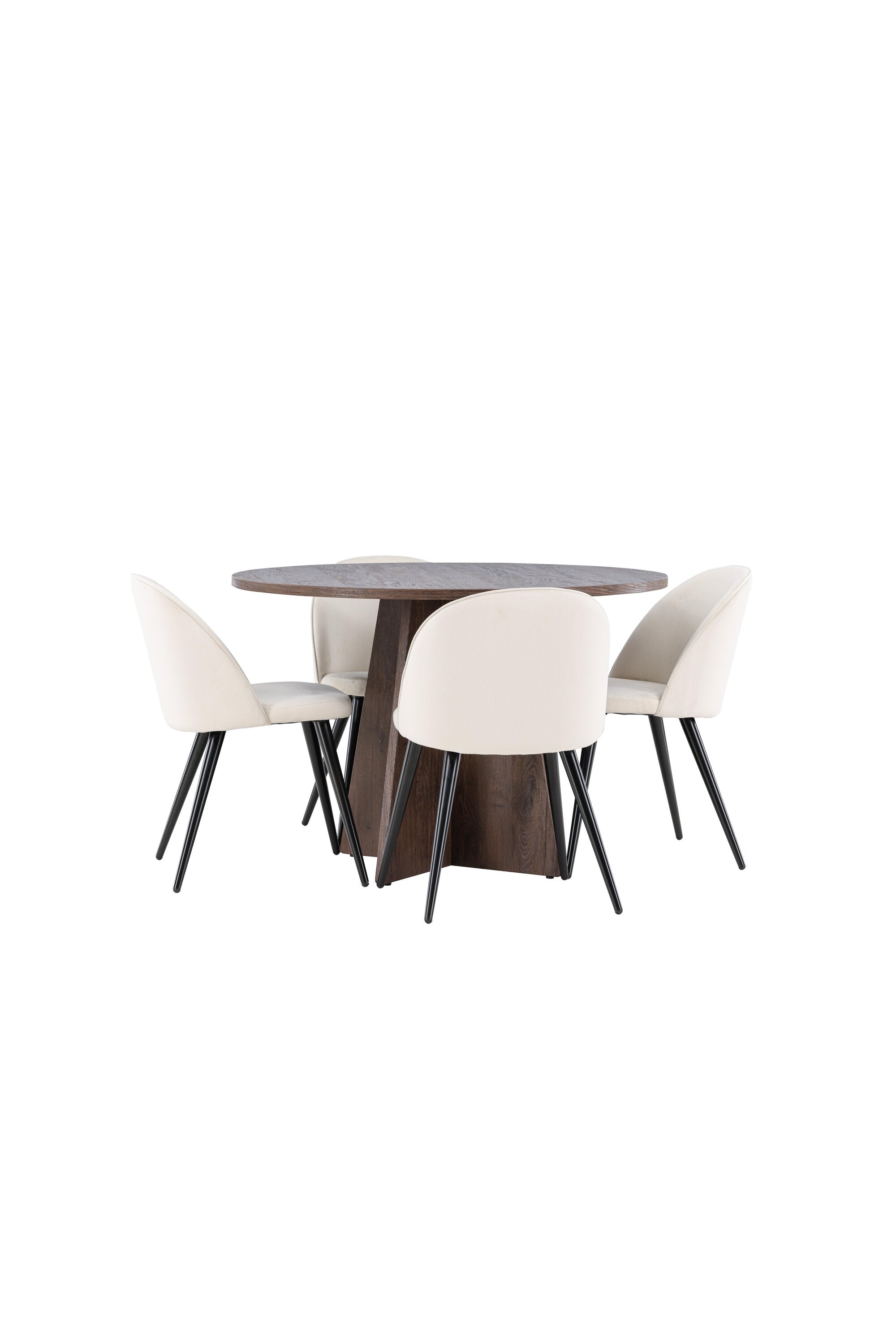 Proměňte svůj jídelní kout s naší elegantní jídelní sadou, která kombinuje elegantní stůl Bootcut s luxusními židlemi Velvet. Tato jídelní souprava je ideální pro každodenní stravování i slavnostní příležitosti a dodá vaší jídelně sofistikovaný a příjemný pocit. Stůl Bootcut je vyroben z MDF a má krásnou moka barvu. S průměrem 110 cm nabízí dostatek prostoru pro jídlo i rozhovory, přičemž jeho kulatý tvar navodí harmonickou atmosféru ve vaší jídelně. Robustní konstrukce zajišťuje dlouhodobé používání a stabilitu. Čtyři židle Velvet skvěle doplňují stůl s elegantními béžovými sedáky z měkkého sametu a stylovými černými nohami. Tyto židle nabízejí pohodlí i styl, díky čemuž jsou ideální pro dlouhé, relaxační večeře s rodinou a přáteli. Jejich moderní design s vysokými opěradly a luxusními sedáky dodá vaší jídelně sofistikovaný nádech. Tato jídelní souprava je dokonalou kombinací estetiky a funkčnosti, takže je vynikající volbou pro ty, kteří chtějí elegantní a pohodlný jídelní kout. Vylepšete svou jídelnu stylovou kombinací stolu Bootcut a židlí Velvet a vytvořte si místo, kde se budou sdílet vzpomínky a radost.