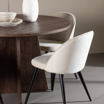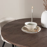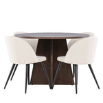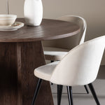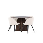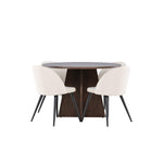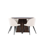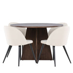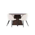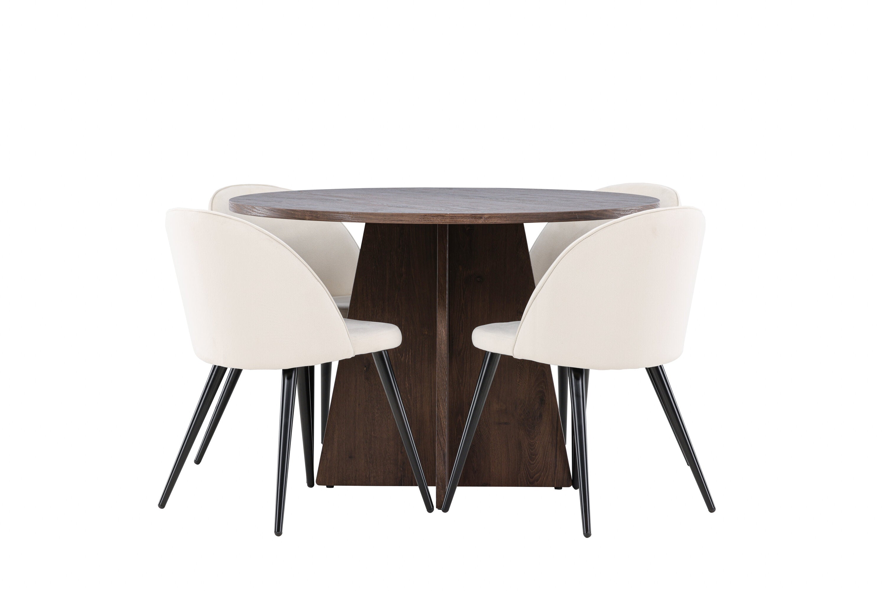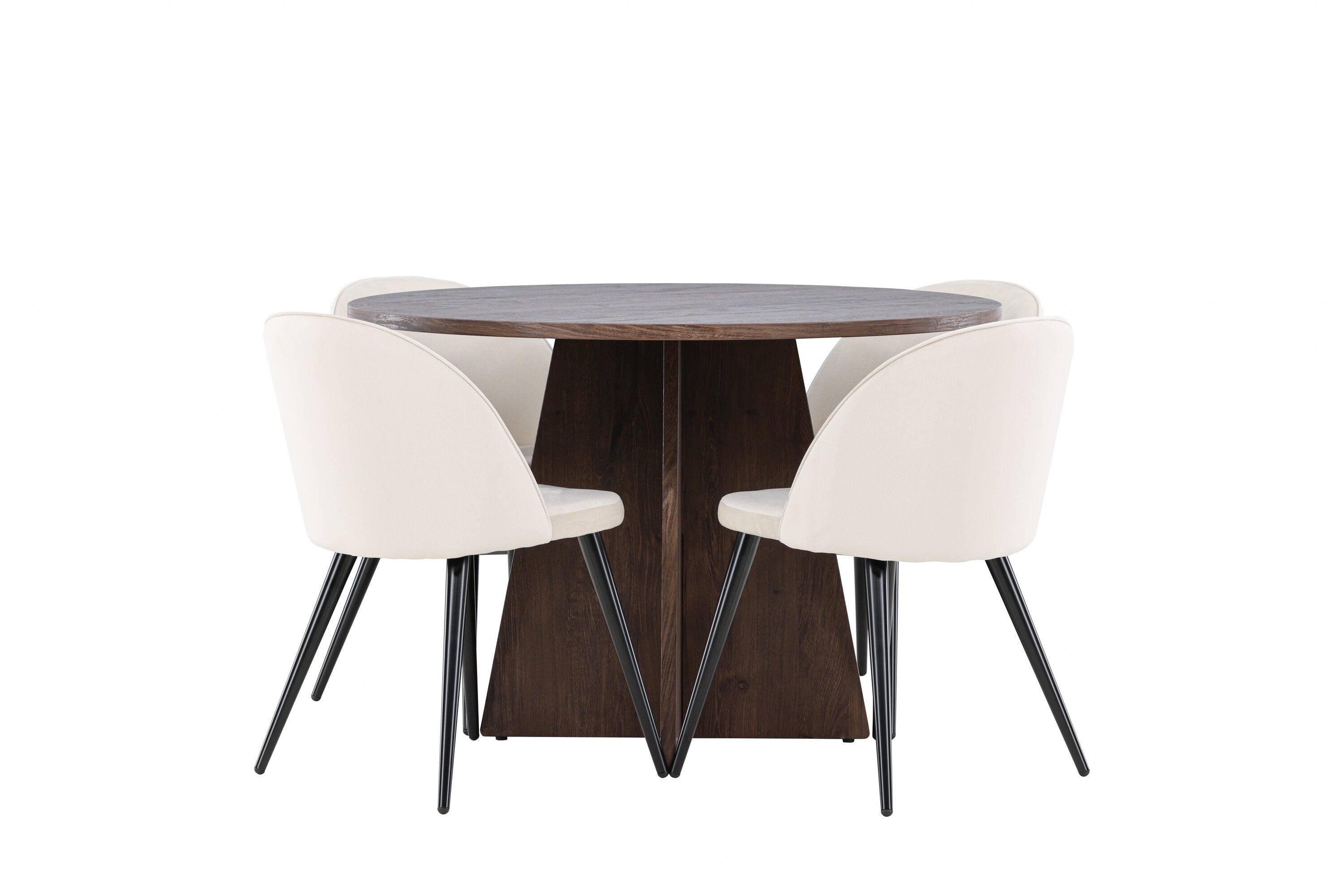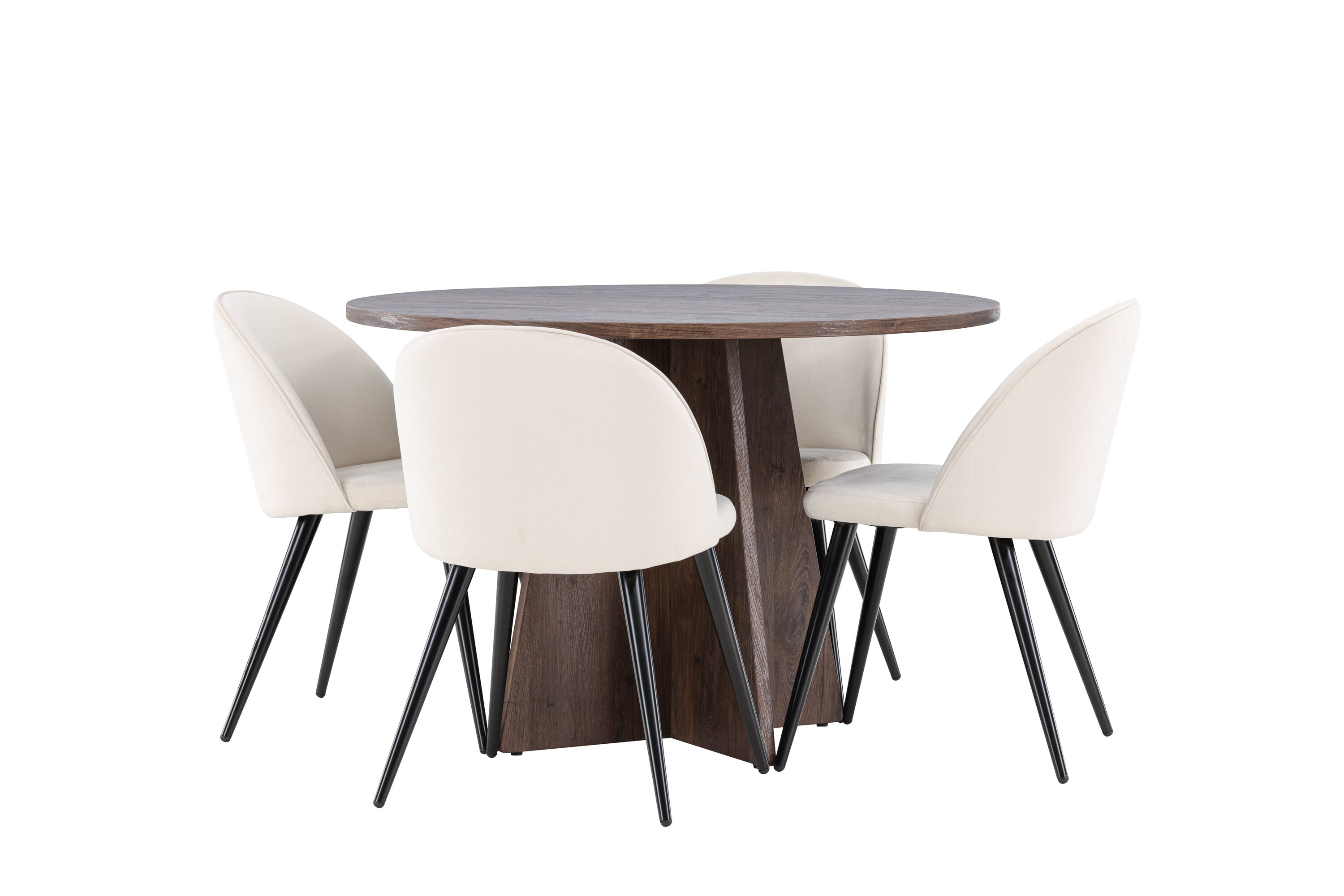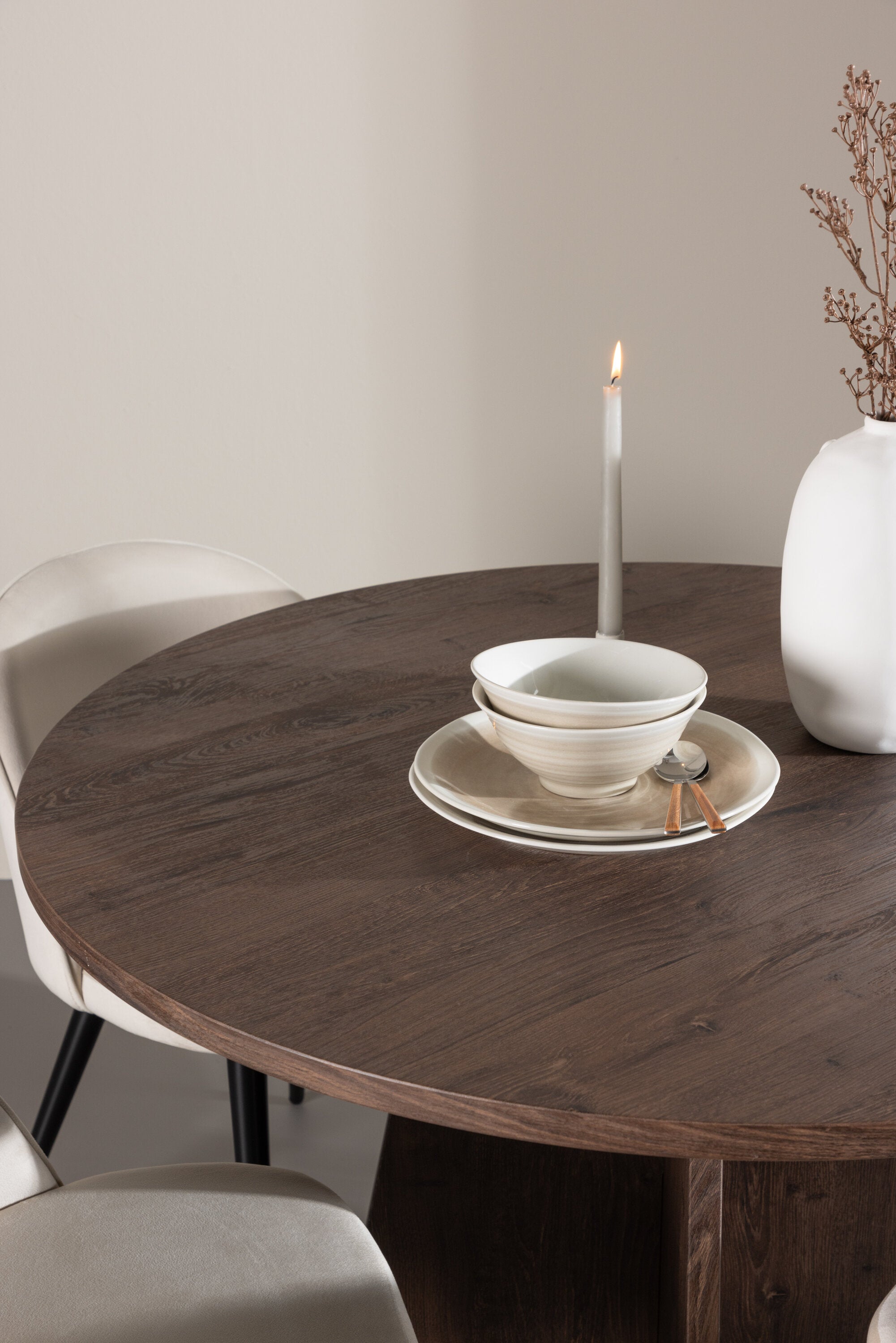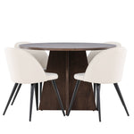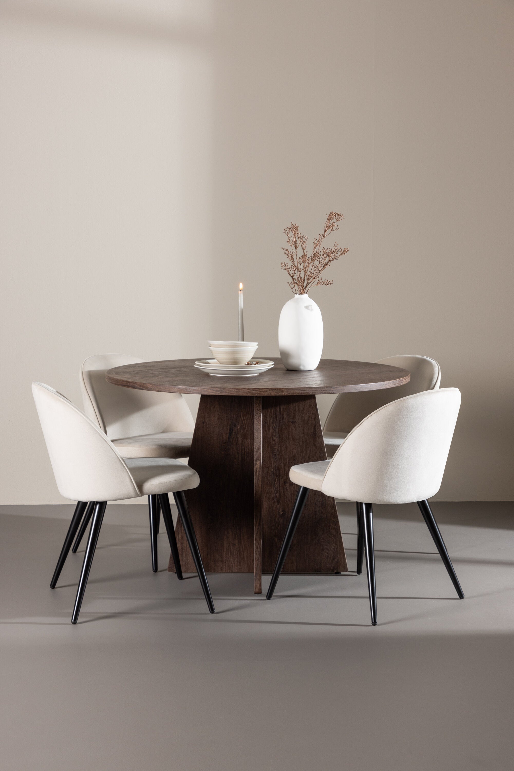 Proměňte svůj jídelní kout s naší elegantní jídelní sadou, která kombinuje elegantní stůl Bootcut s luxusními židlemi Velvet. Tato jídelní souprava je ideální pro každodenní stravování i slavnostní příležitosti a dodá vaší jídelně sofistikovaný a příjemný pocit. Stůl Bootcut je vyroben z MDF a má krásnou moka barvu. S průměrem 110 cm nabízí dostatek prostoru pro jídlo i rozhovory, přičemž jeho kulatý tvar navodí harmonickou atmosféru ve vaší jídelně. Robustní konstrukce zajišťuje dlouhodobé používání a stabilitu. Čtyři židle Velvet skvěle doplňují stůl s elegantními béžovými sedáky z měkkého sametu a stylovými černými nohami. Tyto židle nabízejí pohodlí i styl, díky čemuž jsou ideální pro dlouhé, relaxační večeře s rodinou a přáteli. Jejich moderní design s vysokými opěradly a luxusními sedáky dodá vaší jídelně sofistikovaný nádech. Tato jídelní souprava je dokonalou kombinací estetiky a funkčnosti, takže je vynikající volbou pro ty, kteří chtějí elegantní a pohodlný jídelní kout. Vylepšete svou jídelnu stylovou kombinací stolu Bootcut a židlí Velvet a vytvořte si místo, kde se budou sdílet vzpomínky a radost.