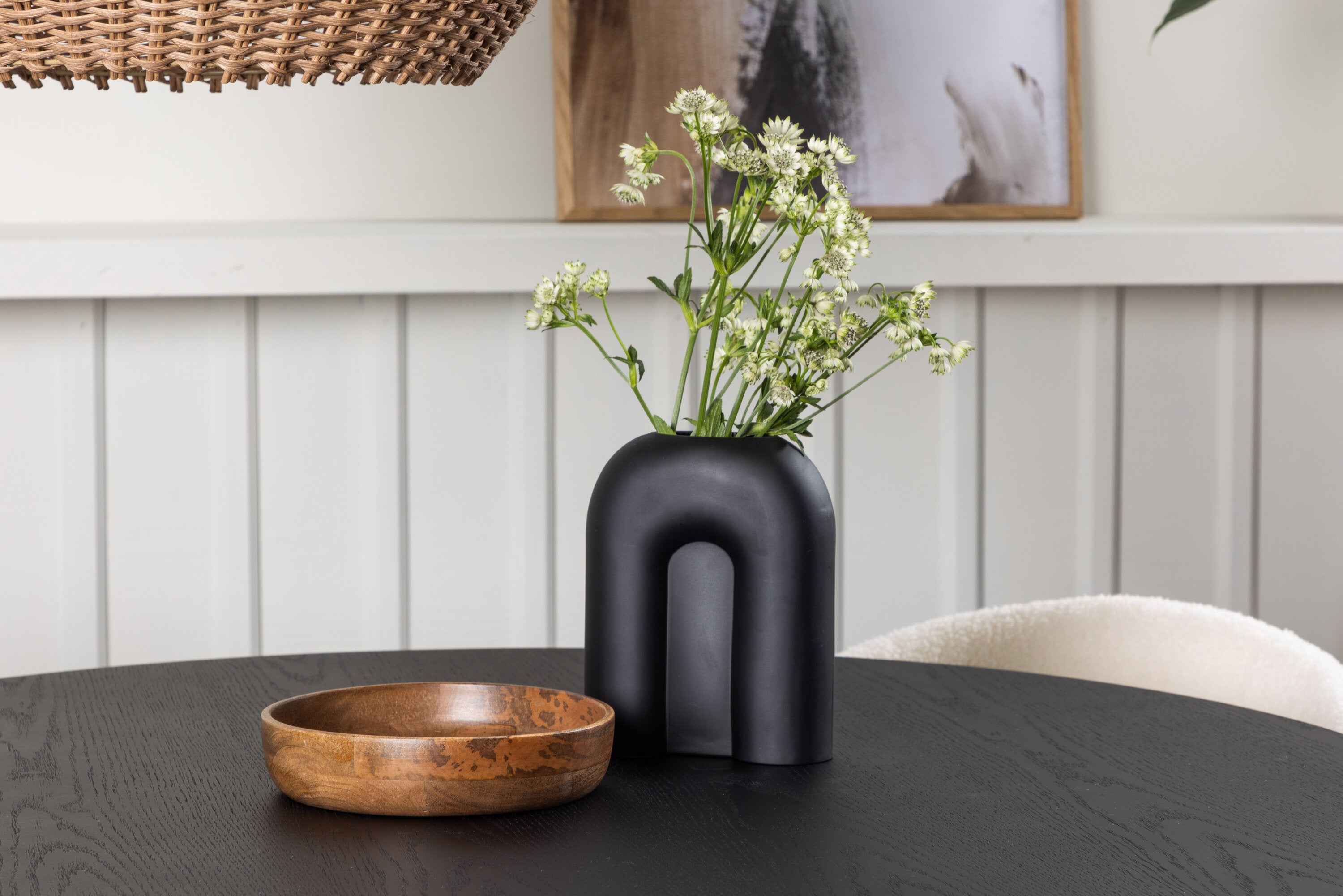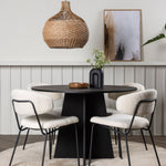 Známé a zároveň trendy! Kulatý jídelní stůl Bootcut v konzistentně černé barvě má ​​stolní desku z MDF s dýhou a designově bohatý rám, který působí na celkový obraz příjemným dojmem. Zde ve stylové kombinaci s našimi bílými jídelními židlemi ze série Chico. Židle je vyrobena z bílého boucle látky s čalouněným sedákem a opěradlem pro větší pohodlí. Nohy jsou úzké z černé oceli, což dodává židli vzdušný pocit. Tady nikdo nekončí na hraně! Rozměry stolu: 110 cm.