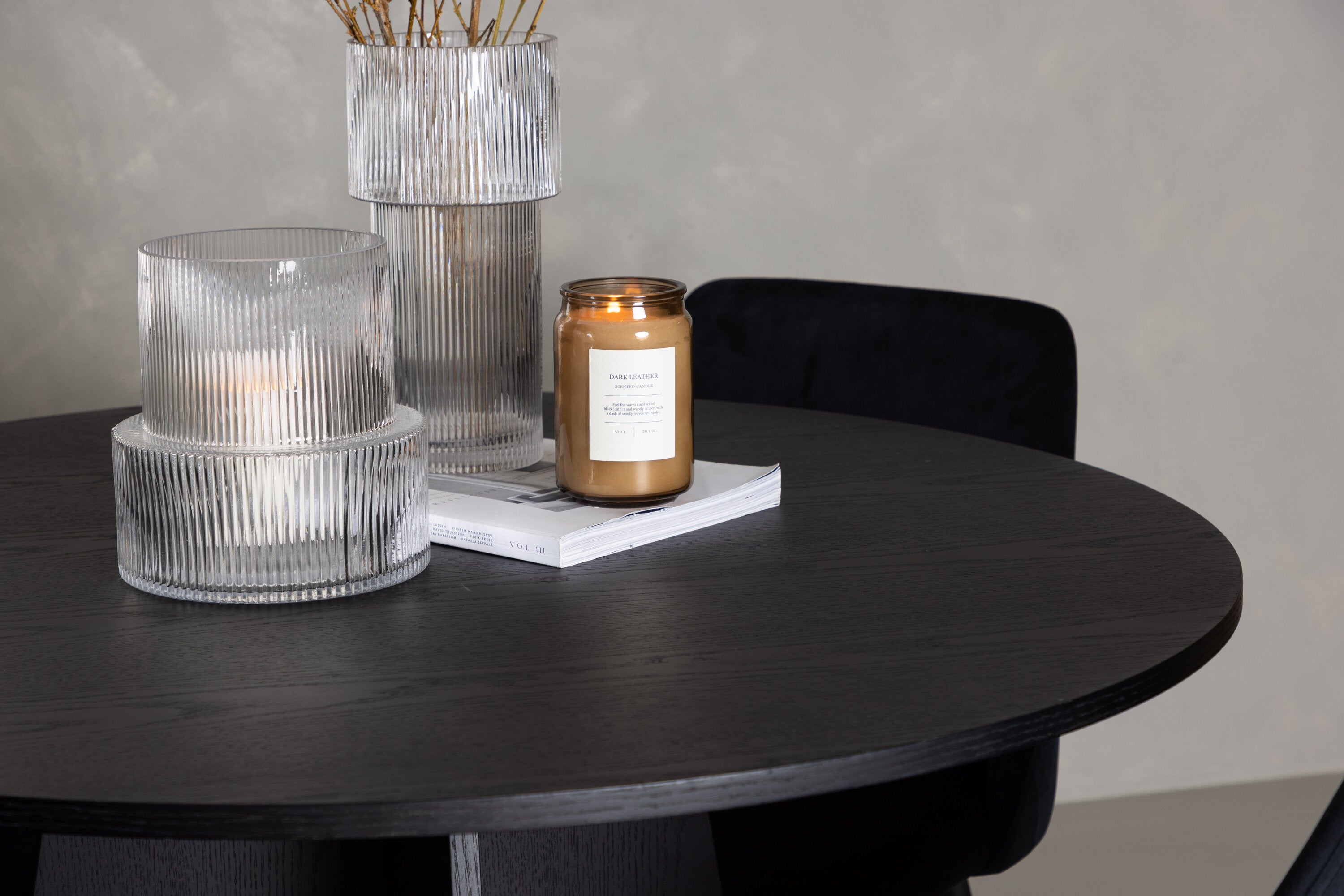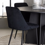 Spolu s kulatým jídelním stolem Bootcut máme naše sametové židle ze série Night. Celočalouněný sedák židle z černé sametové látky dodává exkluzivní pocit a odpovídající černé nohy židle jsou dokonalým doplňkem.