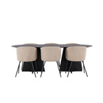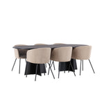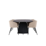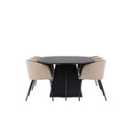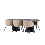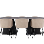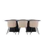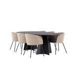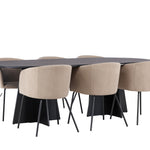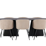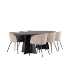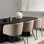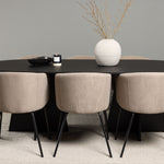Už to nebude lepší než tohle! Náš oválný jídelní stůl Bootcut má unikátní design s oválnou stolní deskou z černé MDF s dýhou a výrazným rámem se dvěma kuželovitými nohami v otevřeném provedení. Zde spolu s našimi pohodlnými jídelními židlemi Berit. Židle má celočalouněný design s mírně zaobleným opěradlem a sedákem ze sametové látky a polyesterového lnu a úzkými nohami židle z černého železa. Jednoduše neuvěřitelně příjemná a luxusní jídelní skupina! Rozměry stolu: 230x115cm.