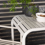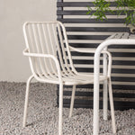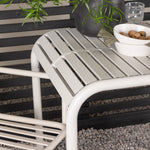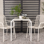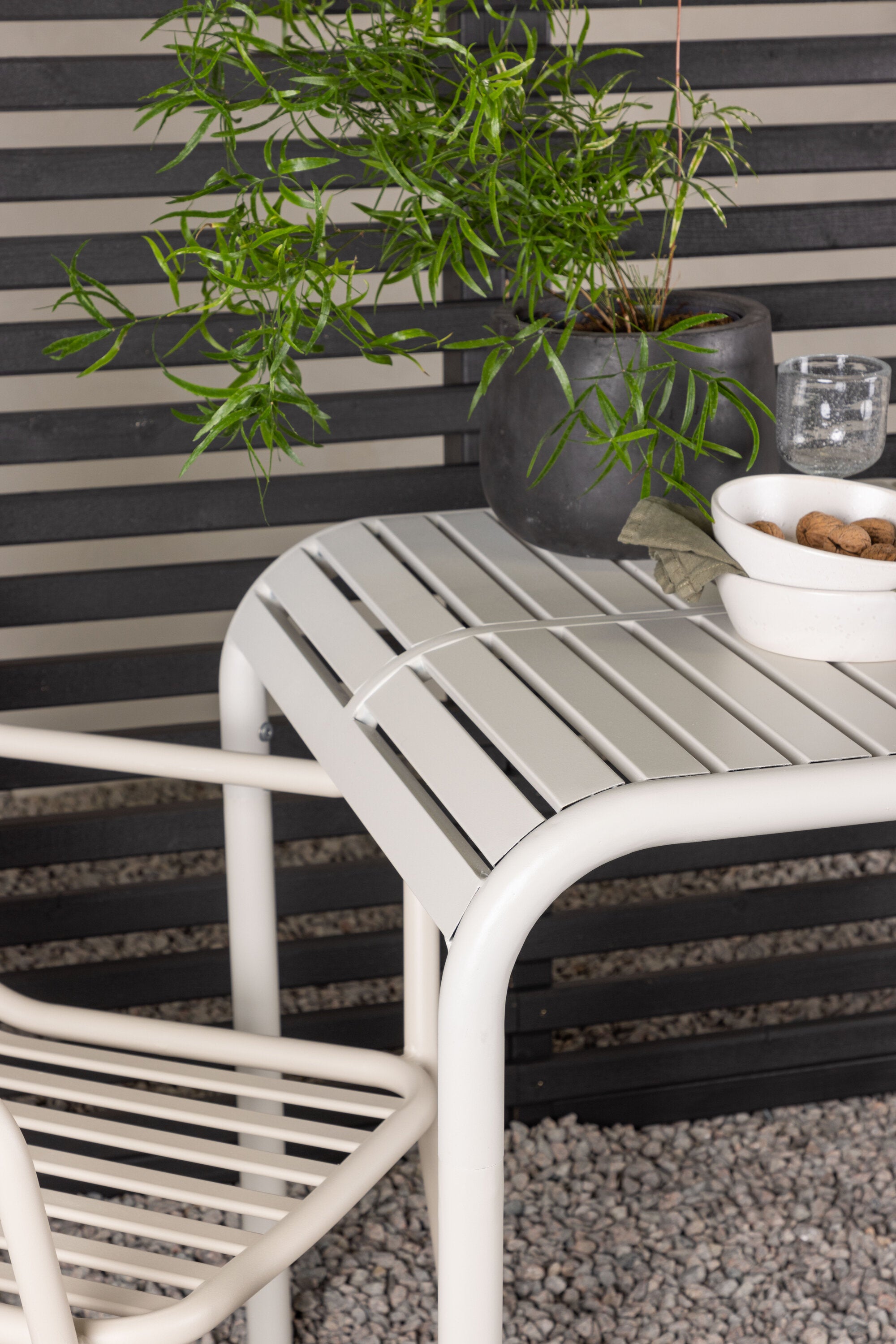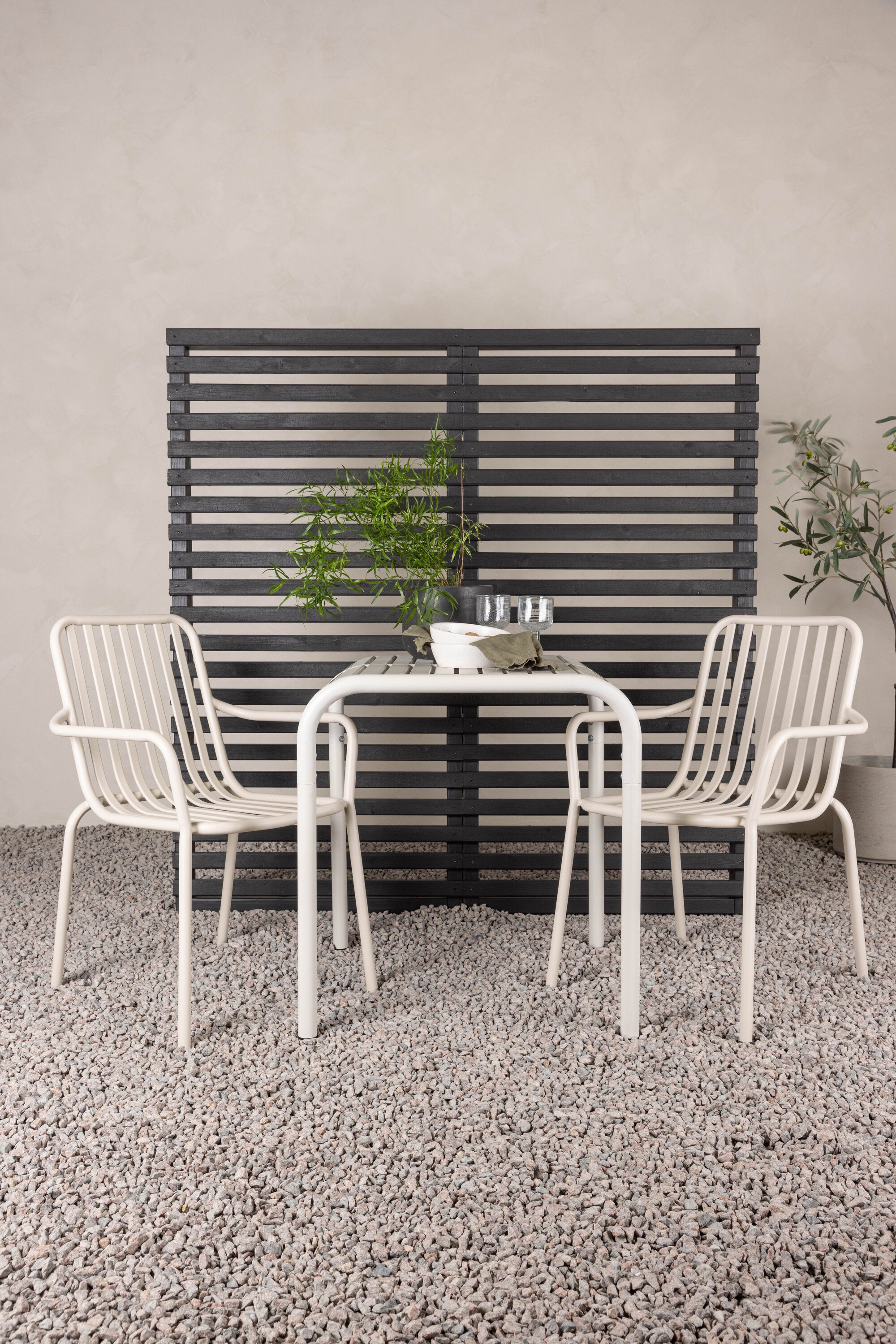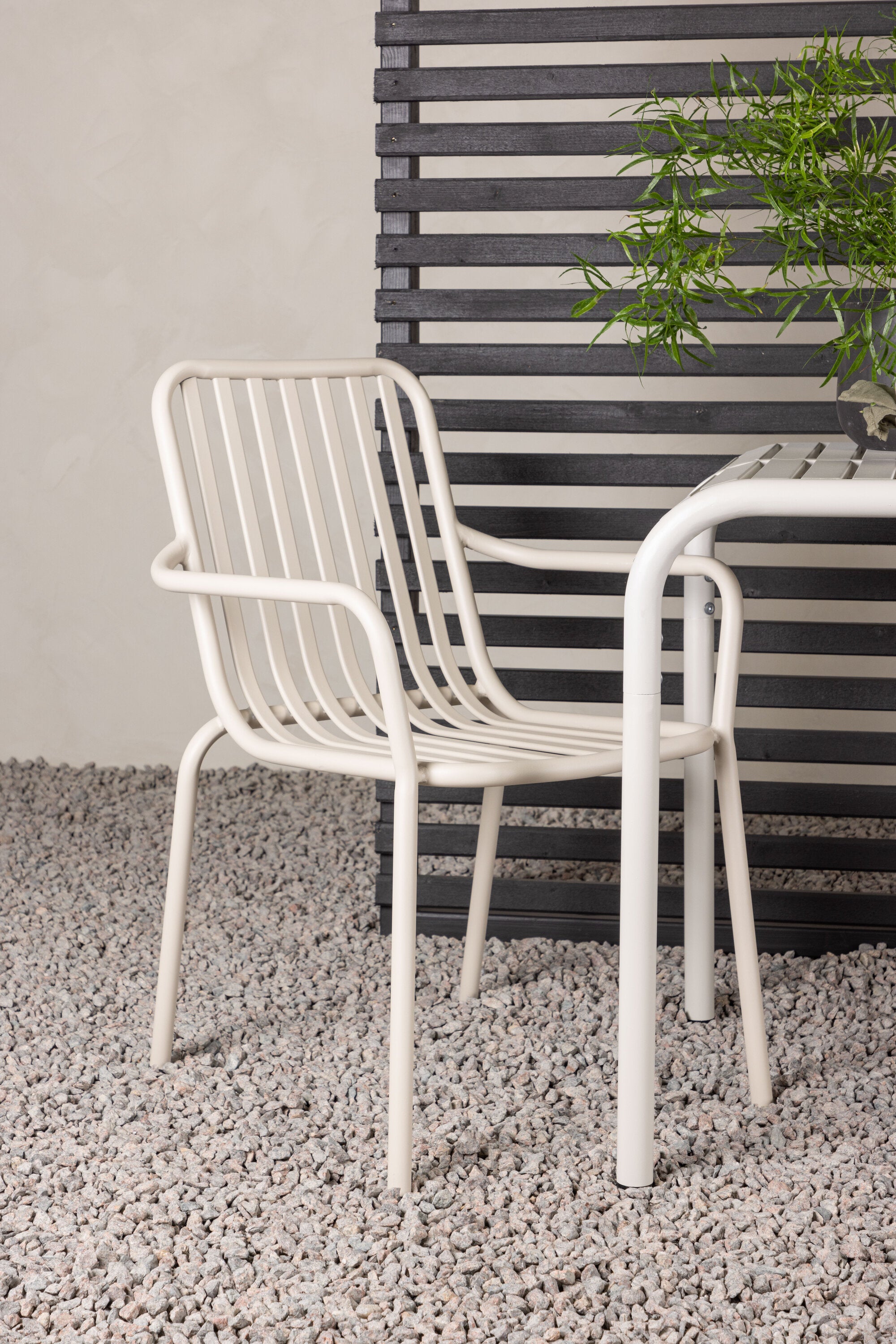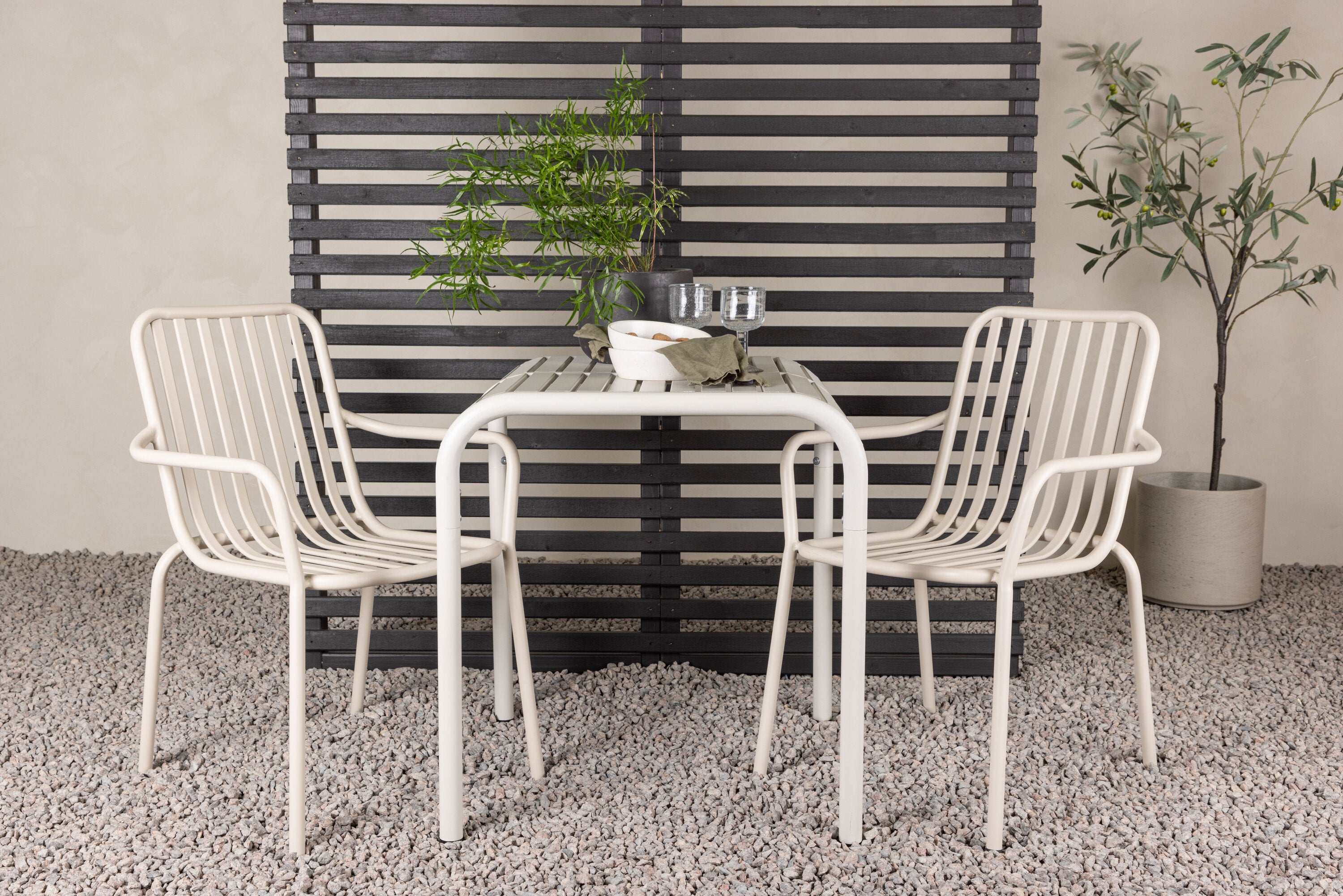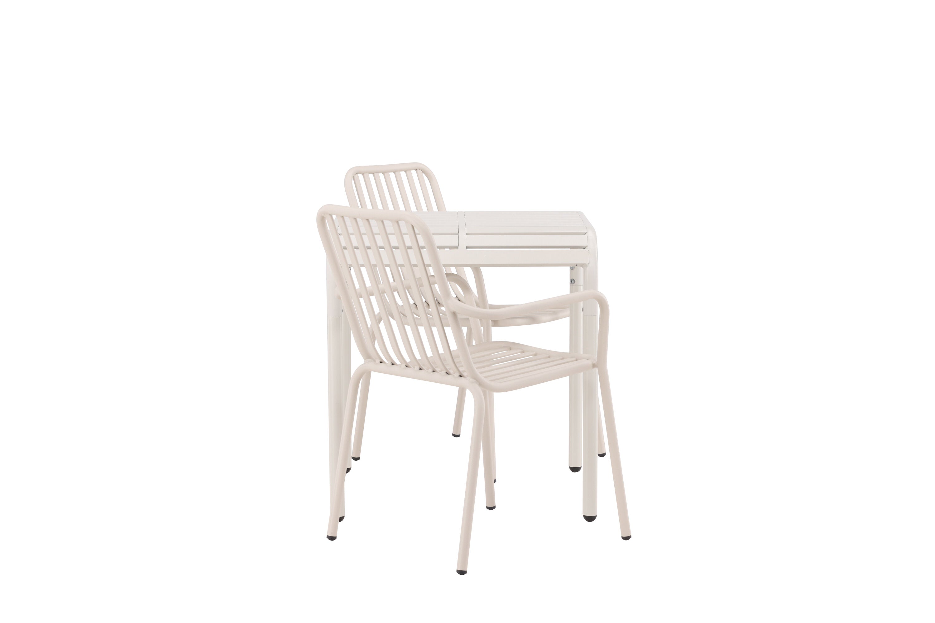Stylová a příjemná kavárenská skupina, která vyzařuje šarm! Stůl ze série Borneo má nadčasový skandinávský design. Deska stolu je žebrovaná a podél okrajů se vlní u nohou. Vše dohromady vyrobeno z béžového hliníku, což vám poskytuje odolný stůl, který lze snadno přemisťovat. Zde ve stylové kombinaci se 2 jídelními židlemi ze série Beijing. Žebrovaný design v hliníku a lichotivá béžová barva působí, že židle působí moderně a nadčasově. Užijte si letošní letní oběd venku! Rozměry stolu: 70 x 70 cm.