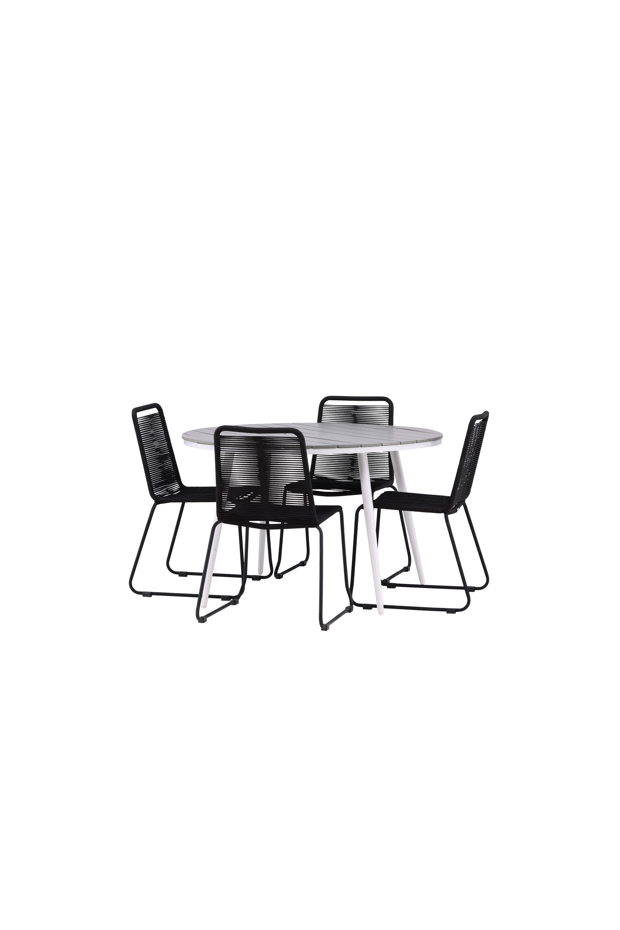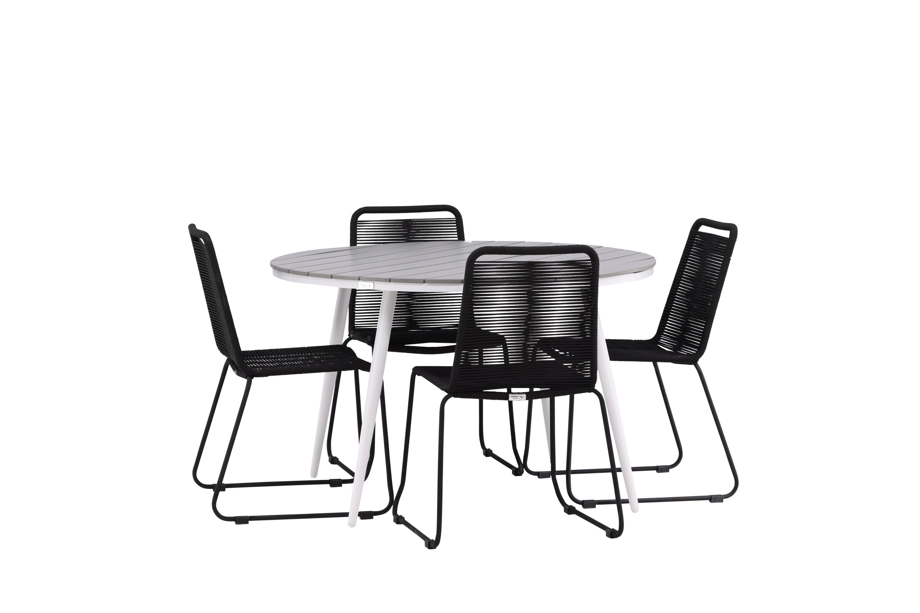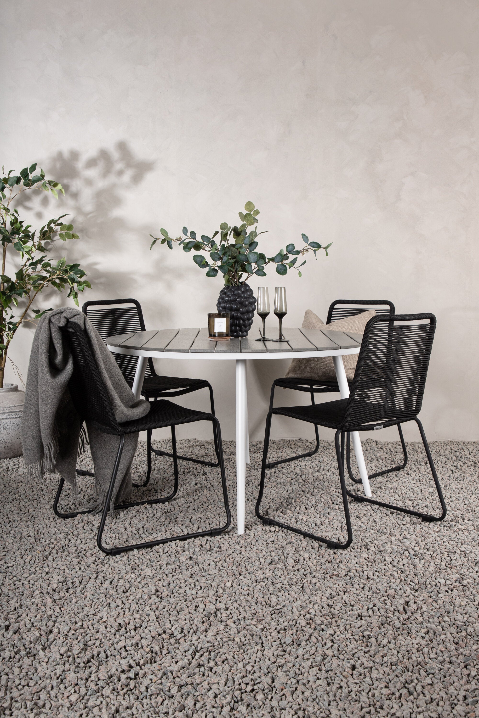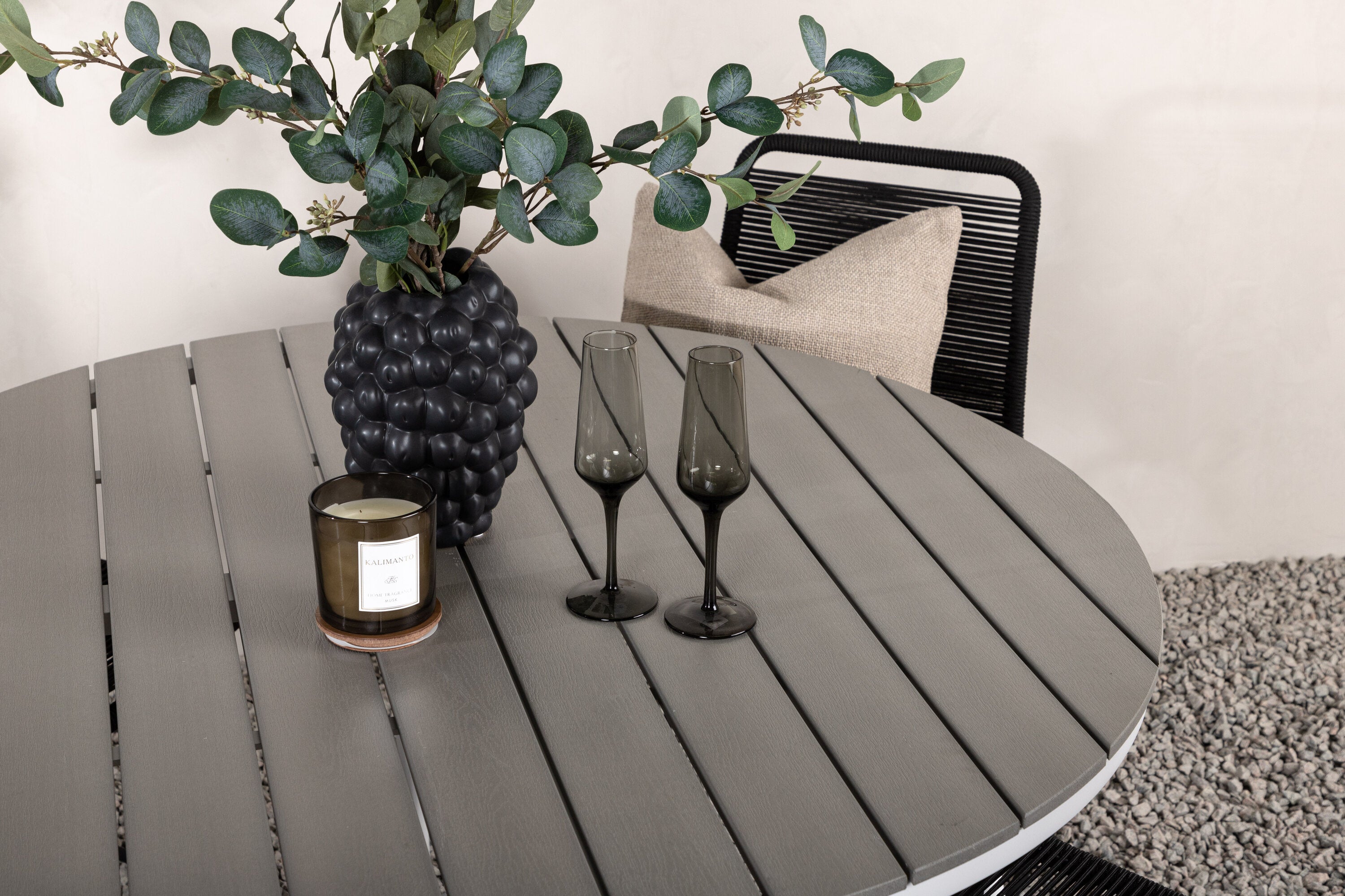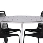 Kulatá skupina jídla je skvělá pro příjemné, příjemné a společenské chvíle! Jídelní stůl Break má kruhovou desku stolu v šedé barvě Aintwood a klasický bílý hliníkový podvozek. Zde spolu s trendy jídelními židlemi ze série Lindos v módním designu. Židle mají stylové úzké nohy z černého hliníku a sedák z odolného černého lana. Zařiďte nádvoří příjemně a vytvořte poutač, který zaujme!