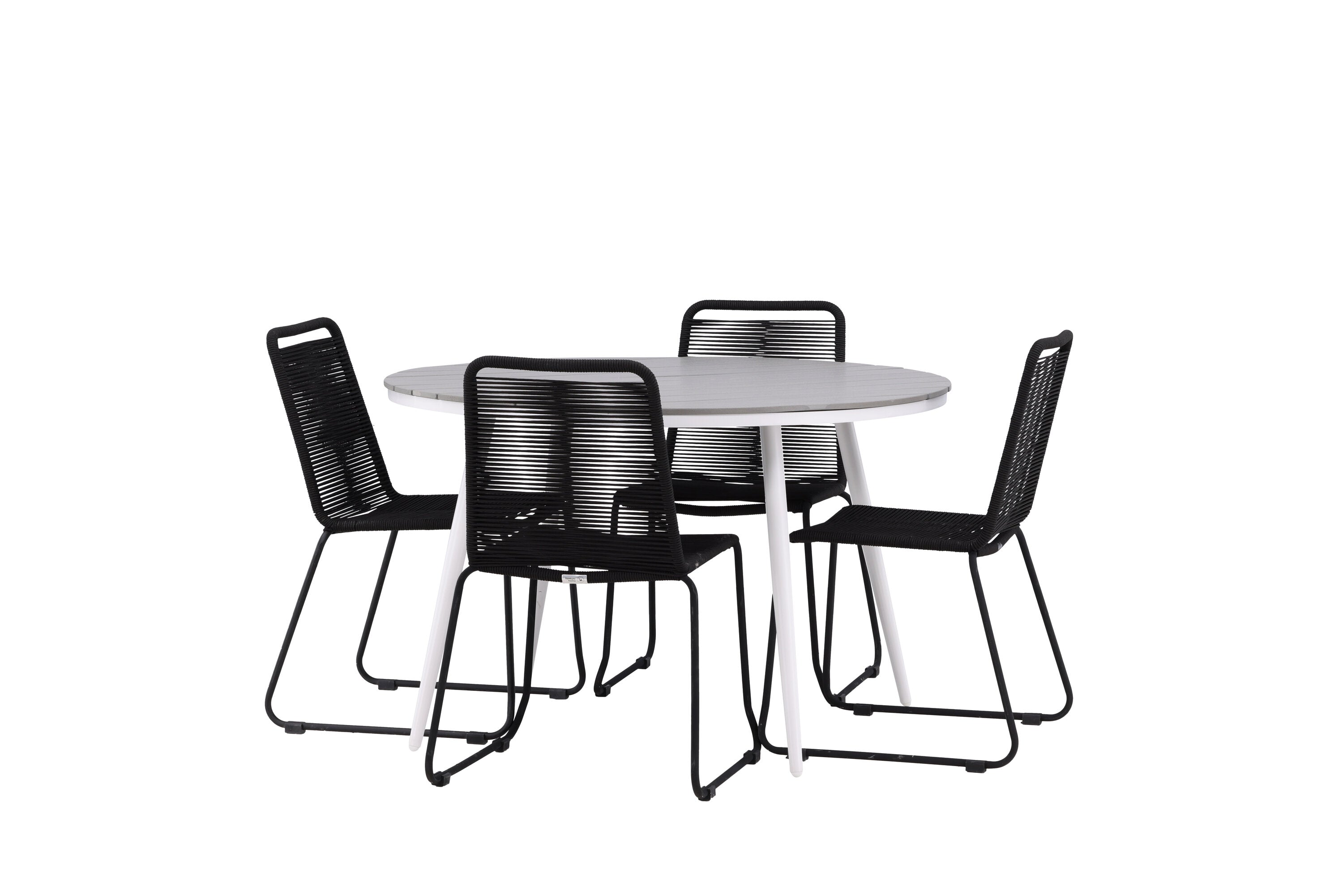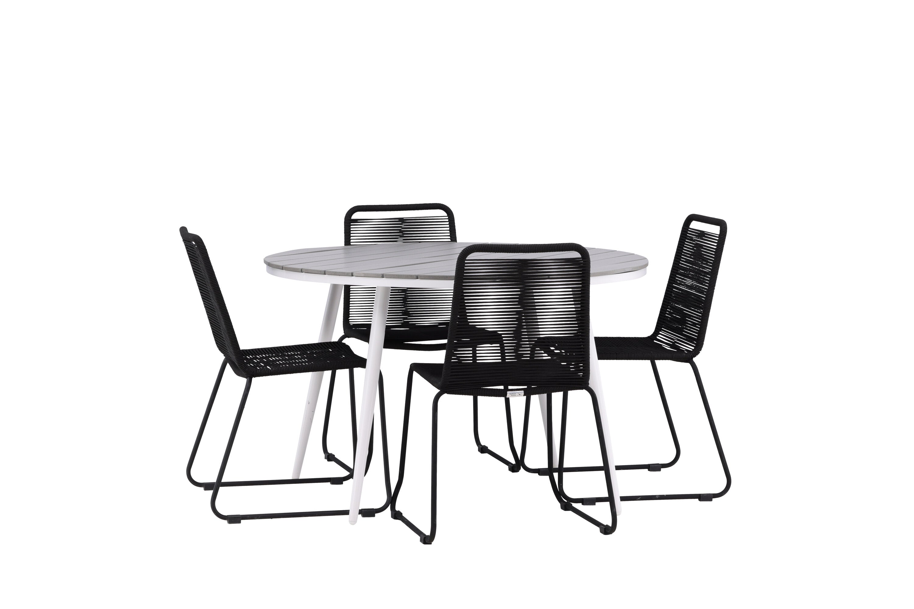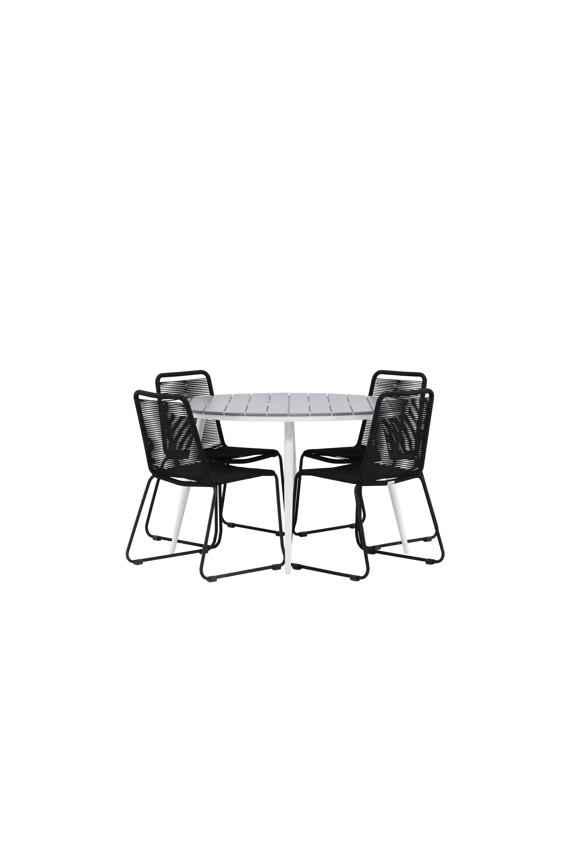 Kulatá skupina jídla je skvělá pro příjemné, příjemné a společenské chvíle! Jídelní stůl Break má kruhovou desku stolu v šedé barvě Aintwood a klasický bílý hliníkový podvozek. Zde spolu s trendy jídelními židlemi ze série Lindos v módním designu. Židle mají stylové úzké nohy z černého hliníku a sedák z odolného černého lana. Zařiďte nádvoří příjemně a vytvořte poutač, který zaujme!