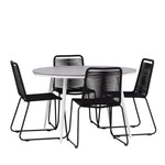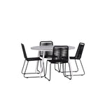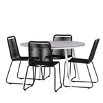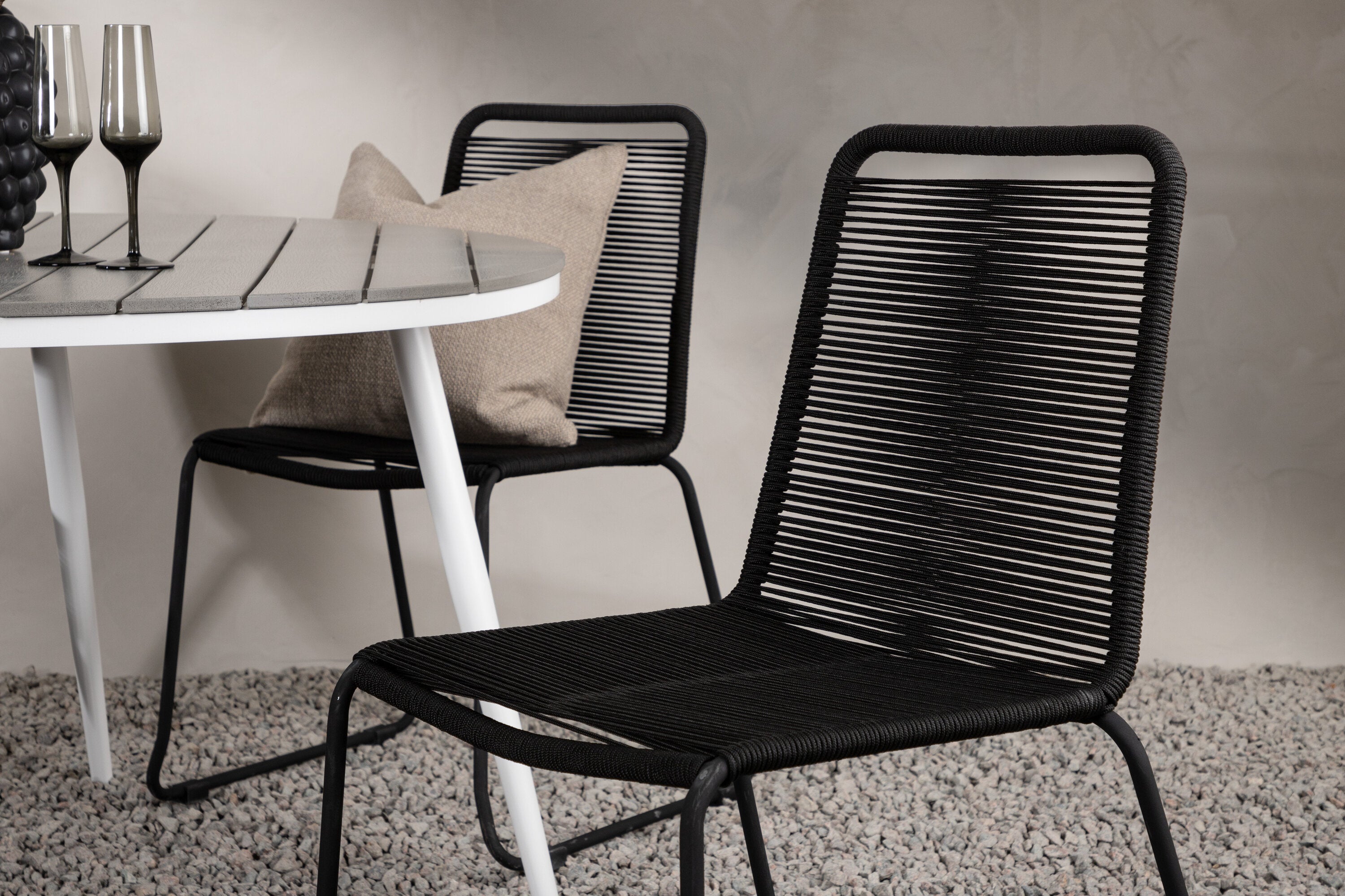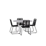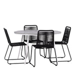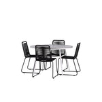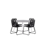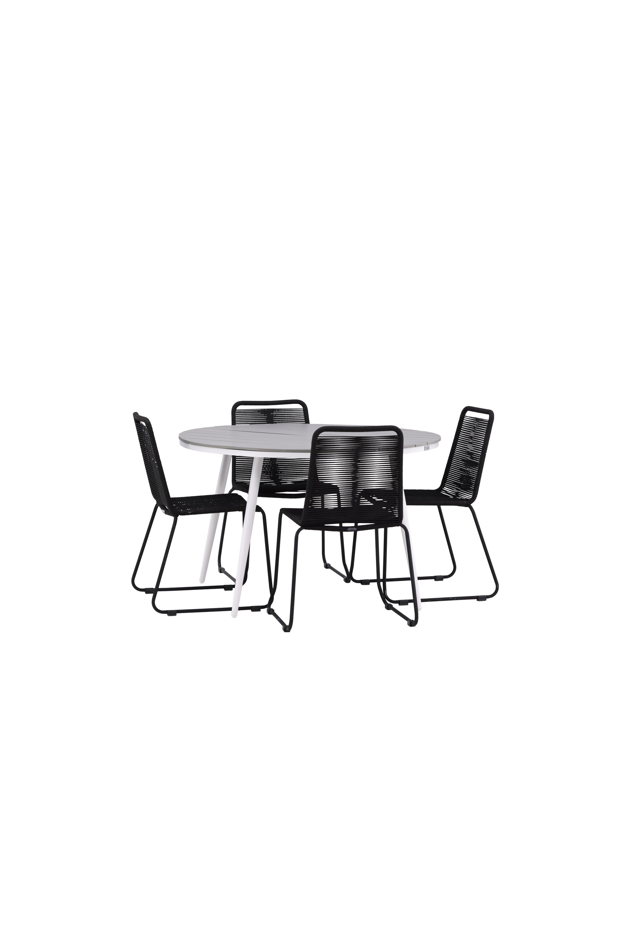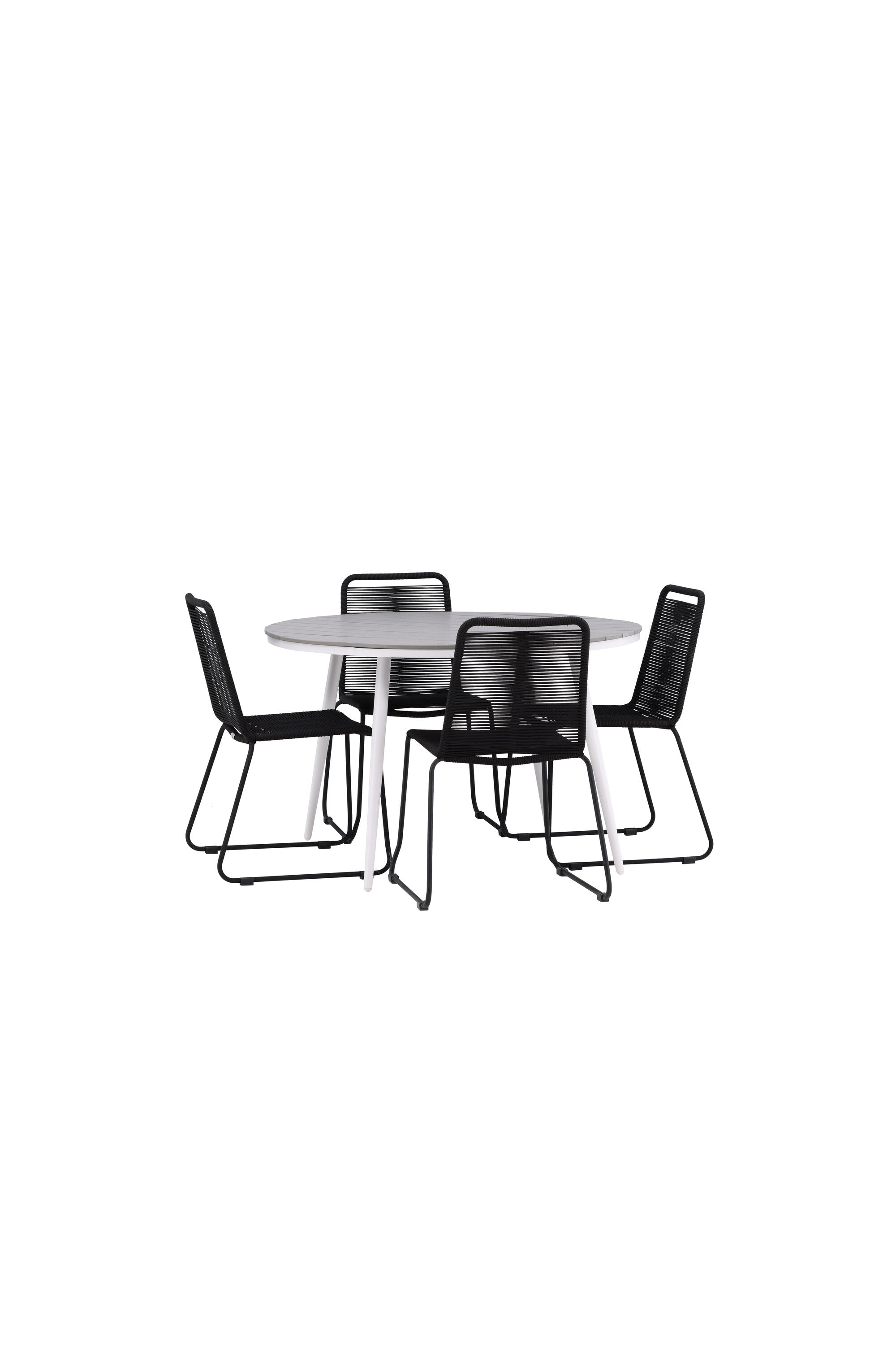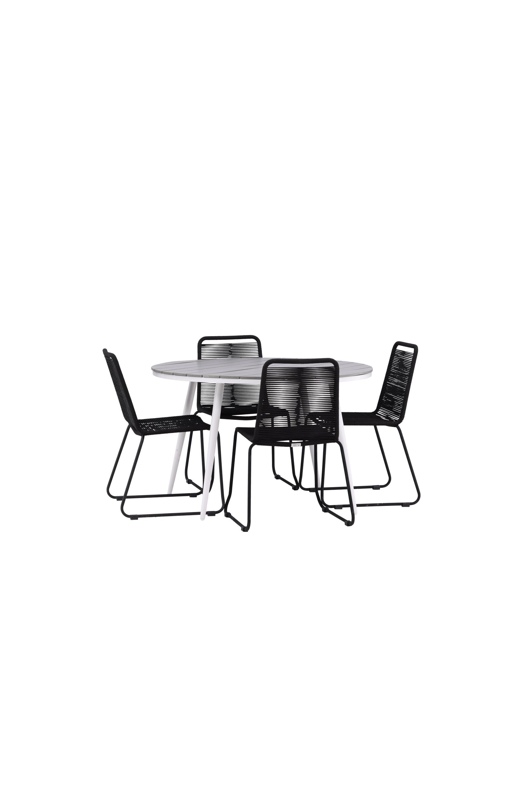Kulatá skupina jídla je skvělá pro příjemné, příjemné a společenské chvíle! Jídelní stůl Break má kruhovou desku stolu v šedé barvě Aintwood a klasický bílý hliníkový podvozek. Zde spolu s trendy jídelními židlemi ze série Lindos v módním designu. Židle mají stylové úzké nohy z černého hliníku a sedák z odolného černého lana. Zařiďte nádvoří příjemně a vytvořte poutač, který zaujme!