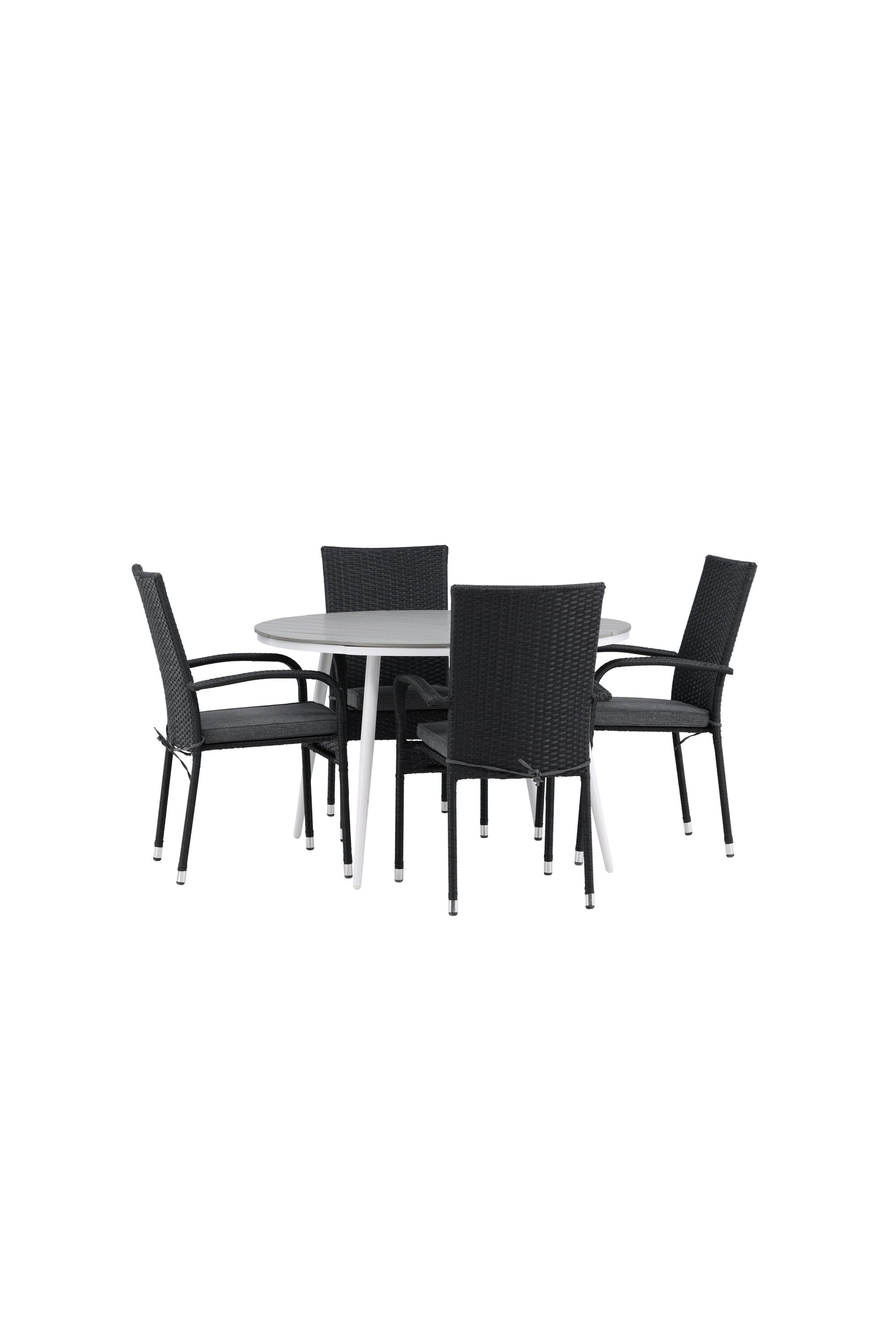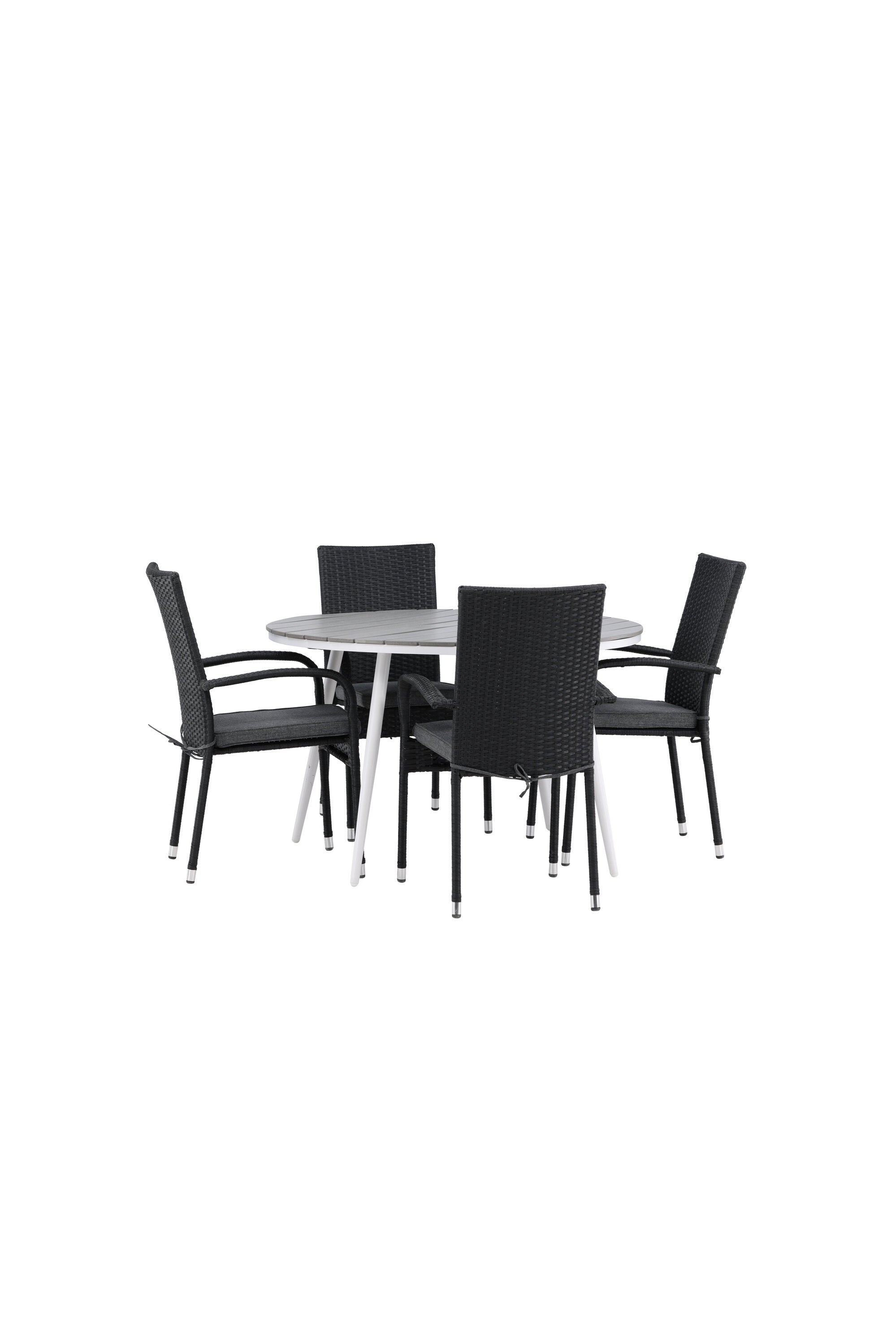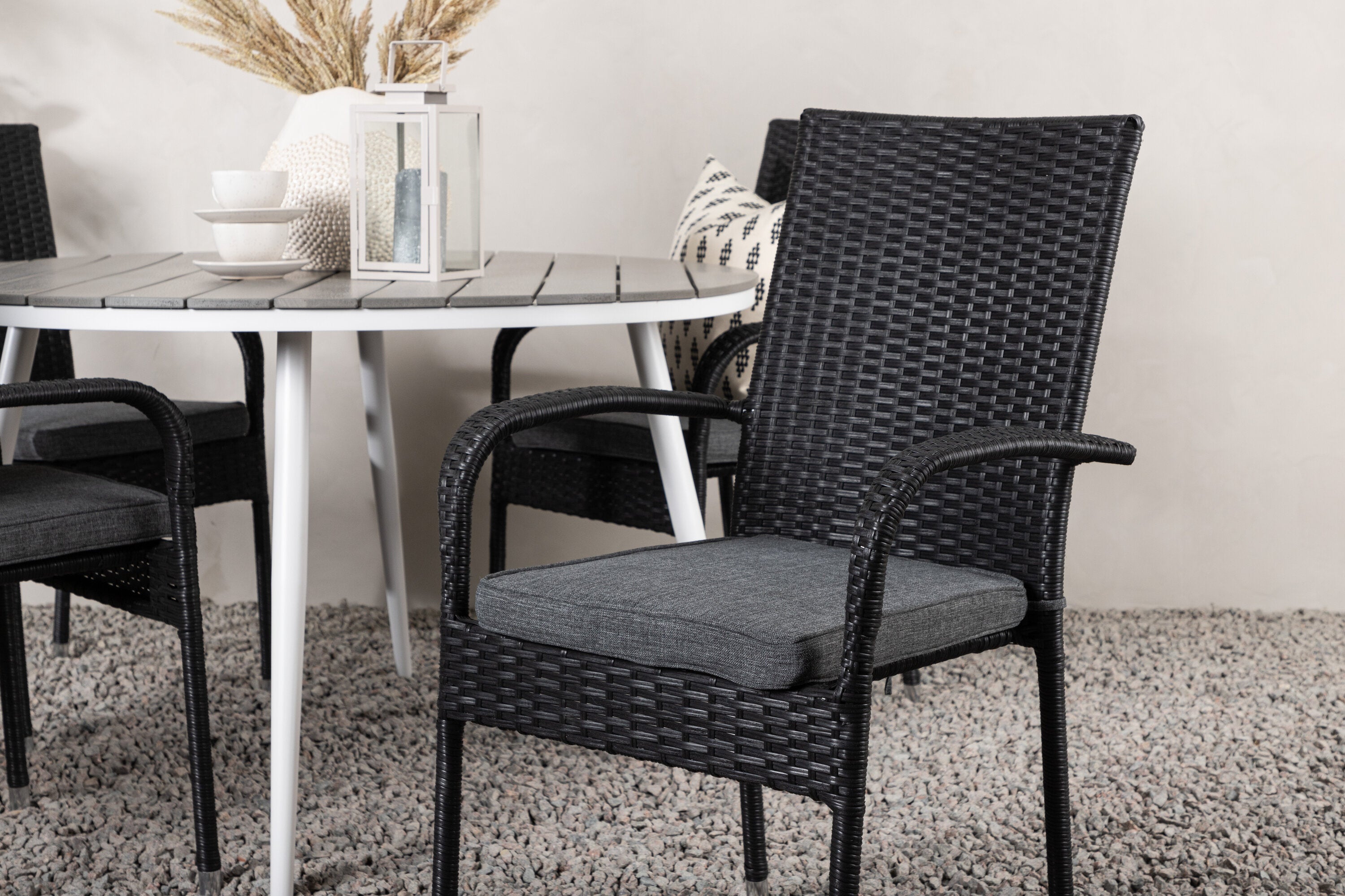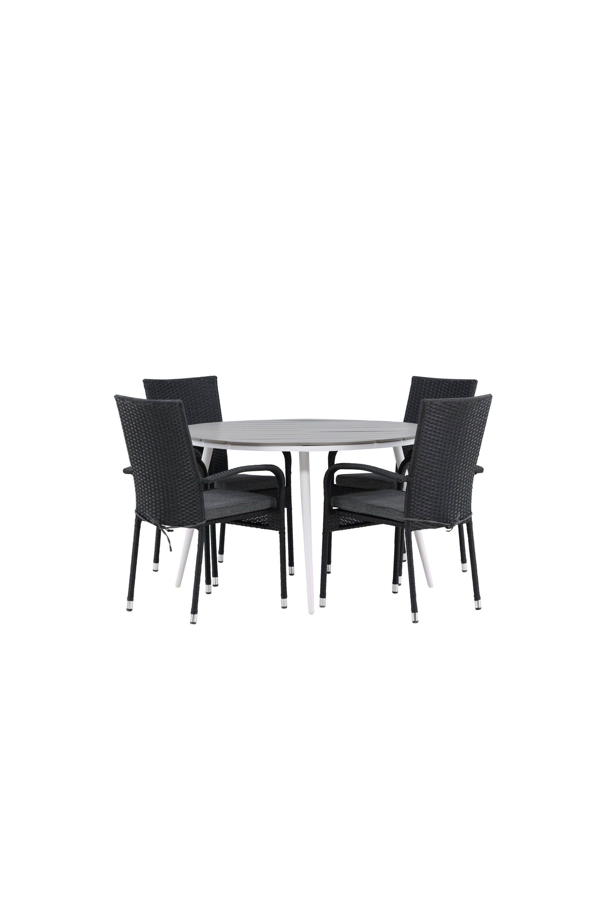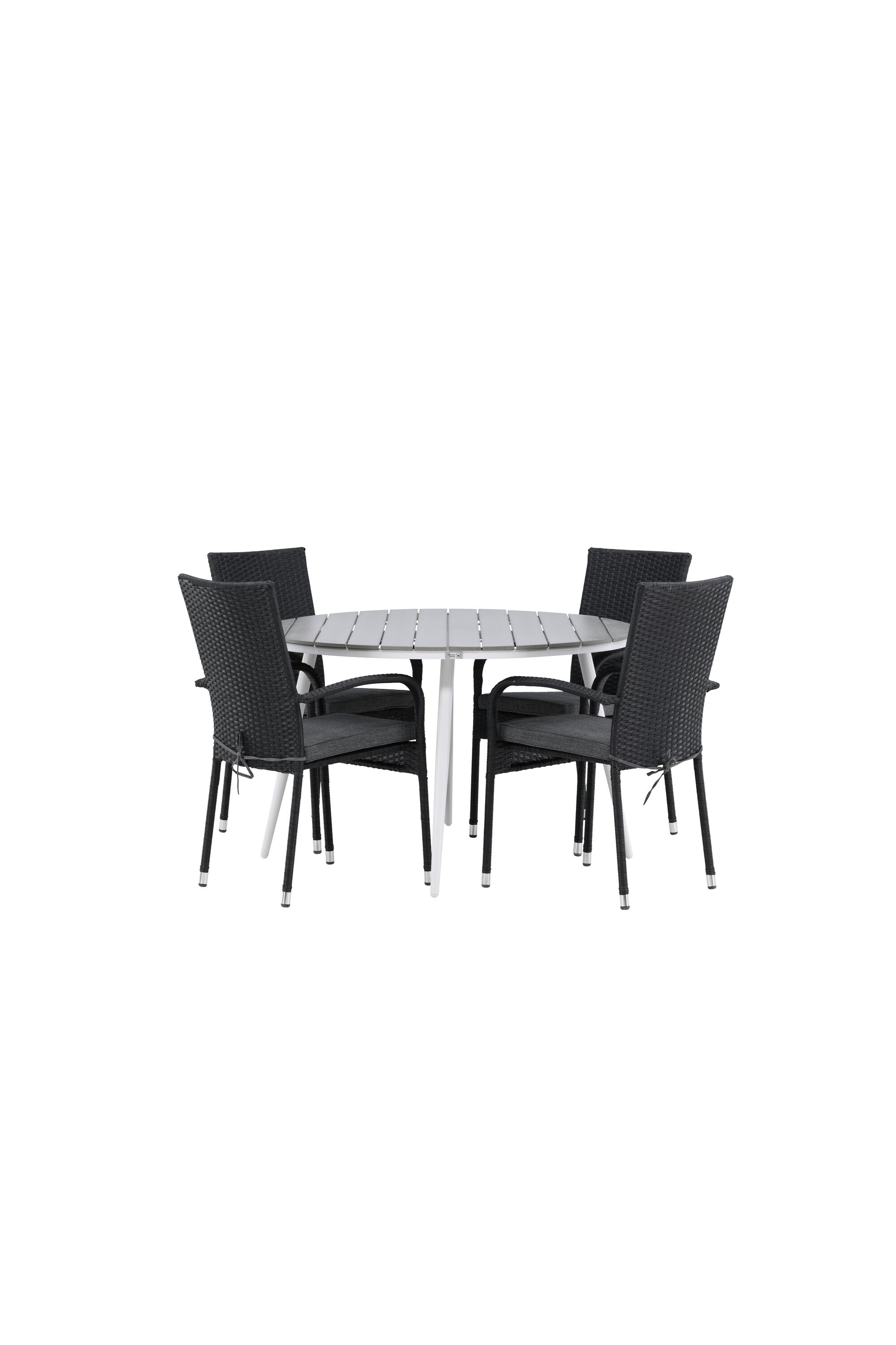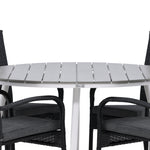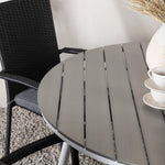 Pohodlně se usaďte v příjemné jídelní skupině, kde nikdo neriskuje, že se dostane na okraj! Jídelní stůl Break má klasický design s kulatou stolní deskou v šedé barvě Aintwood a lehce rozšířenými nohami z bílého hliníku. Rozměry: 120ø cm. Zde v moderní kombinaci s pohodlnými jídelními židlemi ze série Anna. Židle je vyrobena z umělého ratanu, má integrované područky, je stohovatelná a dodává se v lahodné černé barvě, kterou lze snadno sladit s dalším nábytkem. Připravte se letos v létě před nočním životem a vychutnejte si jídlo venku!
