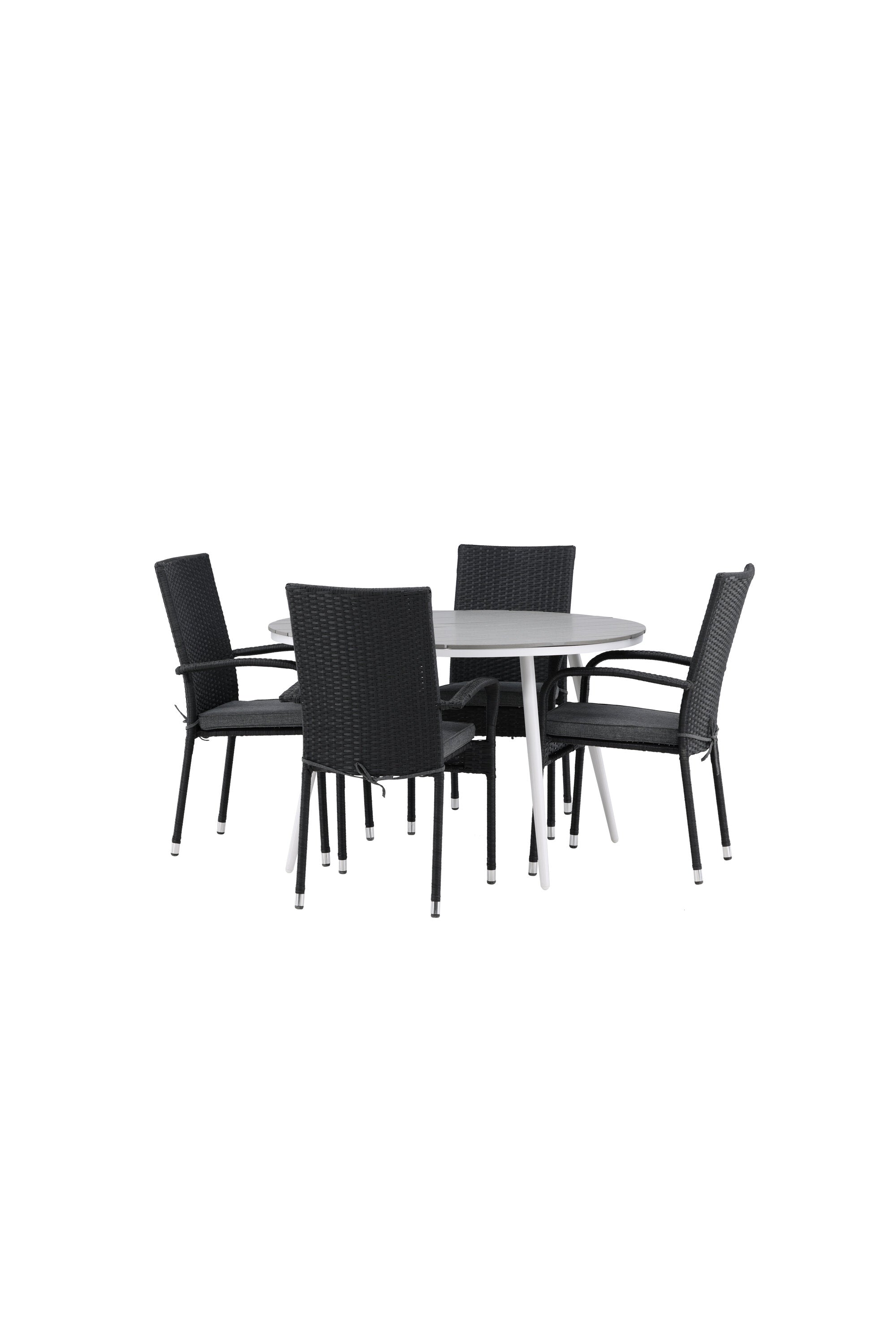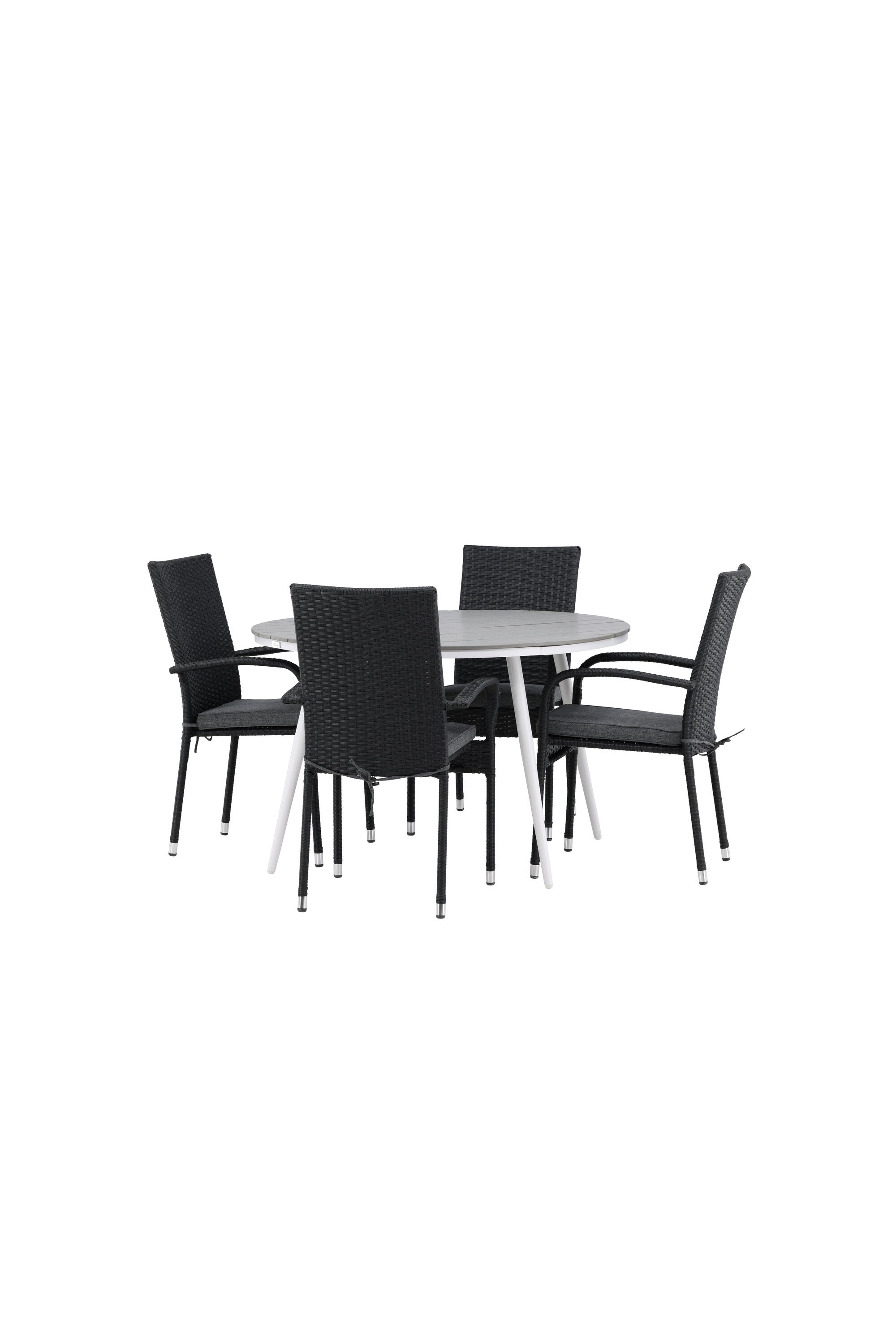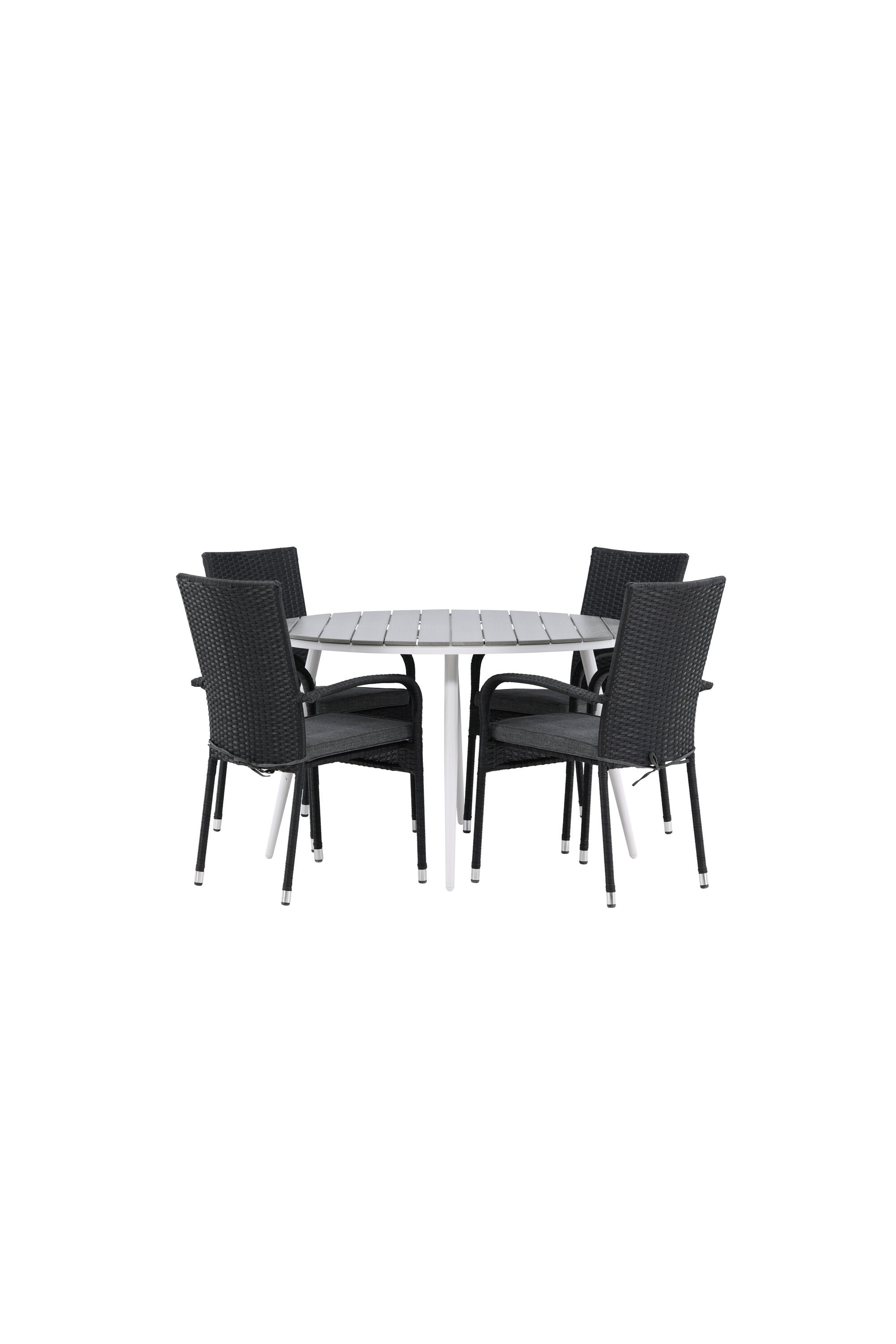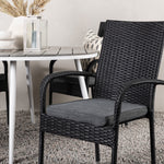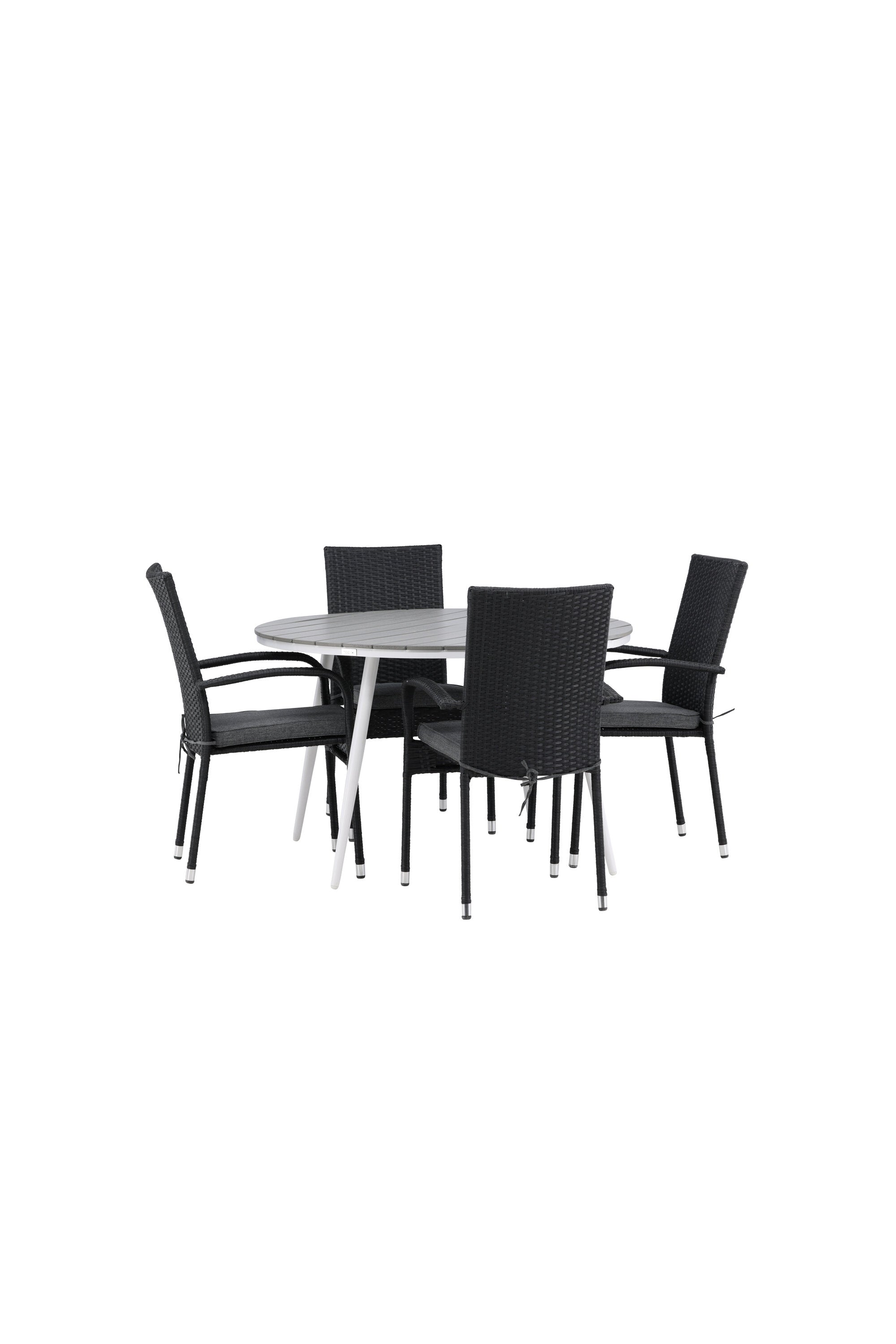 Pohodlně se usaďte v příjemné jídelní skupině, kde nikdo neriskuje, že se dostane na okraj! Jídelní stůl Break má klasický design s kulatou stolní deskou v šedé barvě Aintwood a lehce rozšířenými nohami z bílého hliníku. Rozměry: 120ø cm. Zde v moderní kombinaci s pohodlnými jídelními židlemi ze série Anna. Židle je vyrobena z umělého ratanu, má integrované područky, je stohovatelná a dodává se v lahodné černé barvě, kterou lze snadno sladit s dalším nábytkem. Připravte se letos v létě před nočním životem a vychutnejte si jídlo venku!