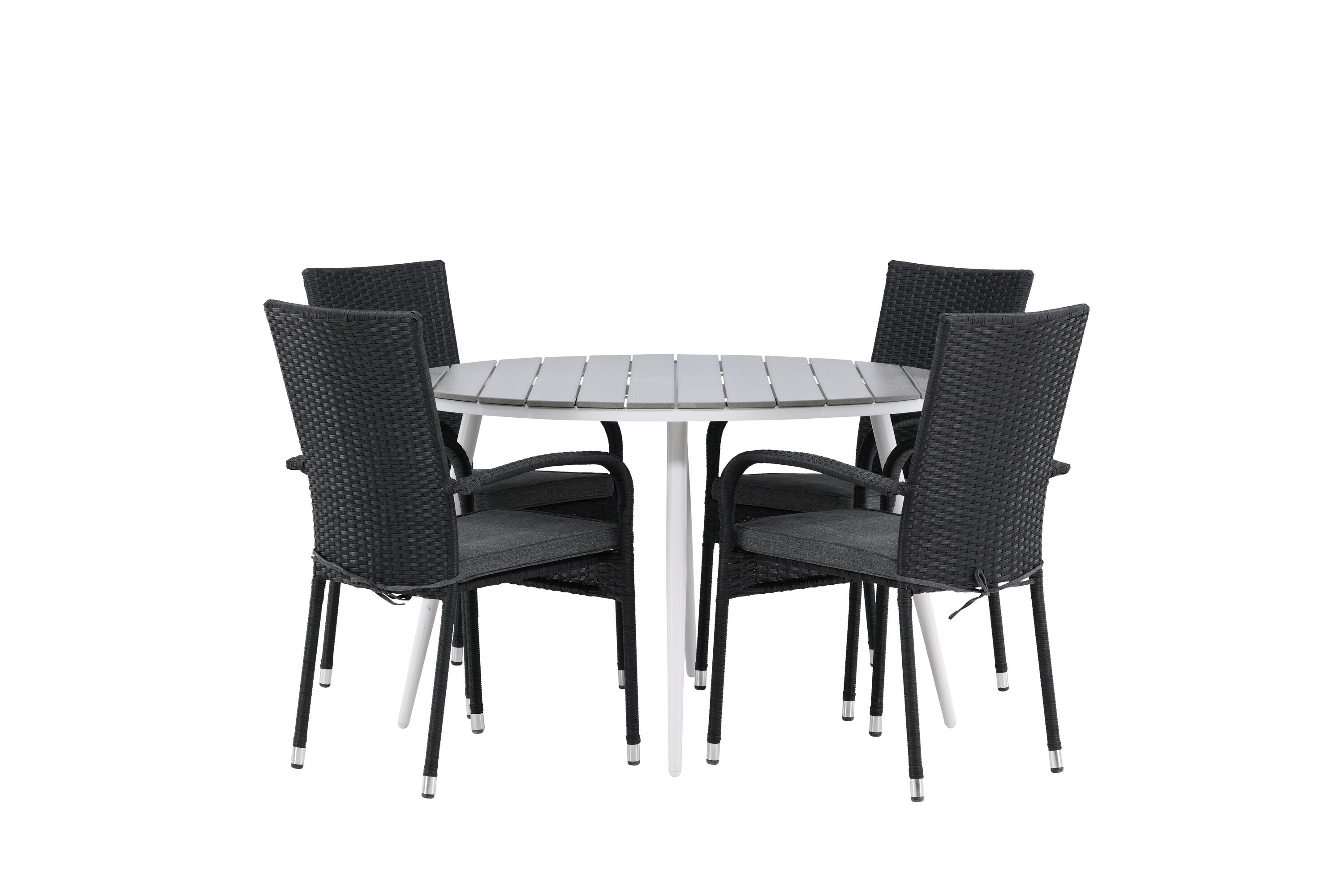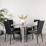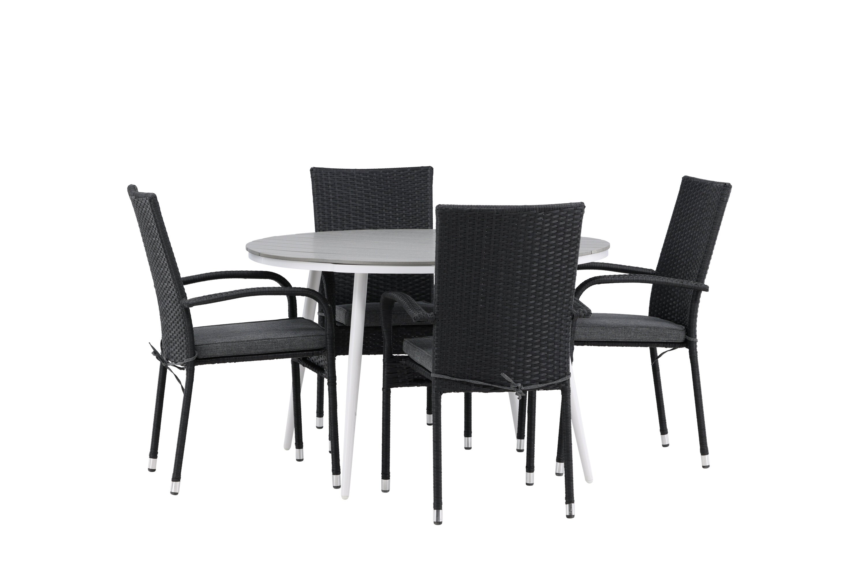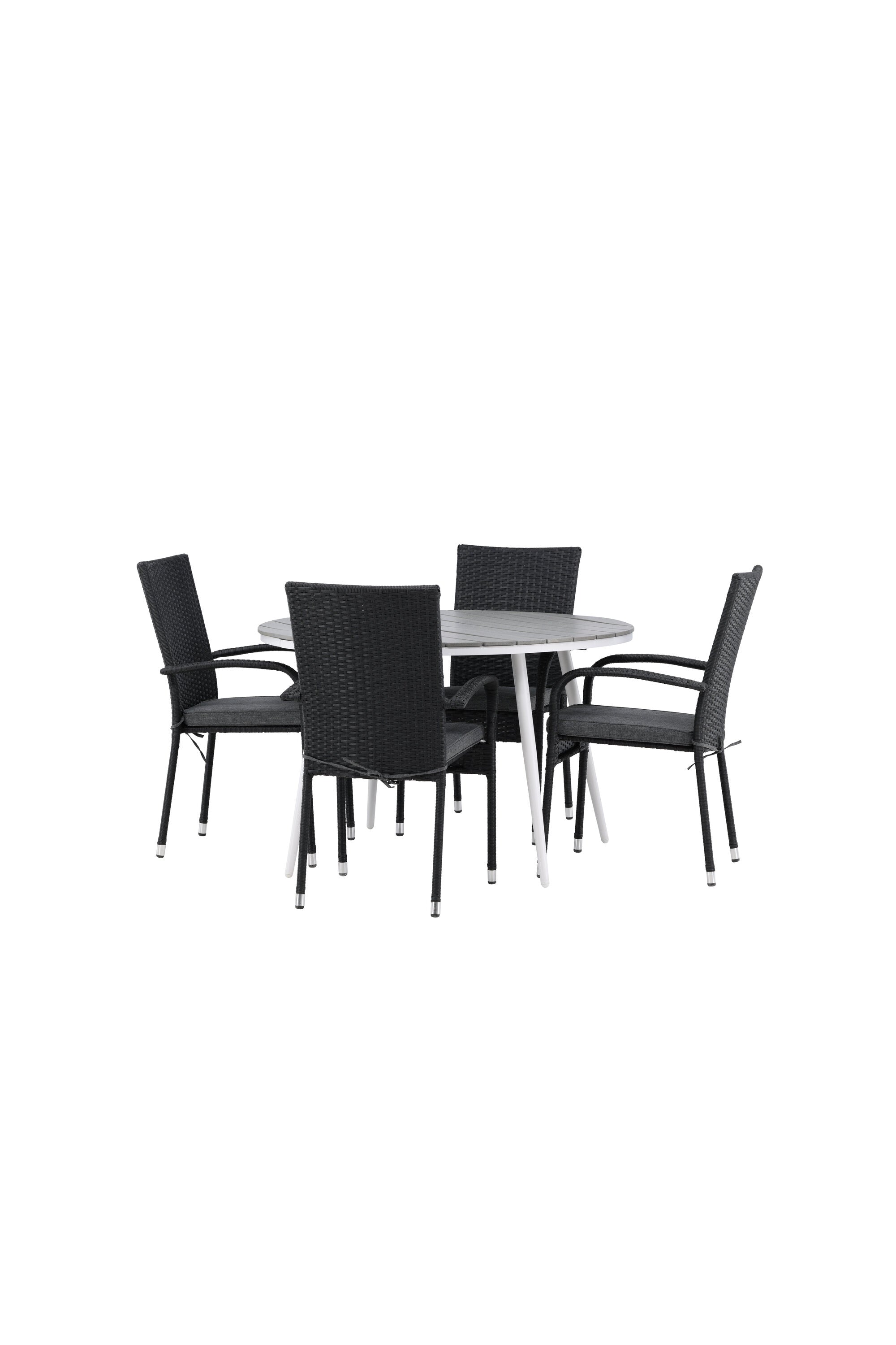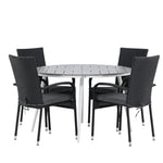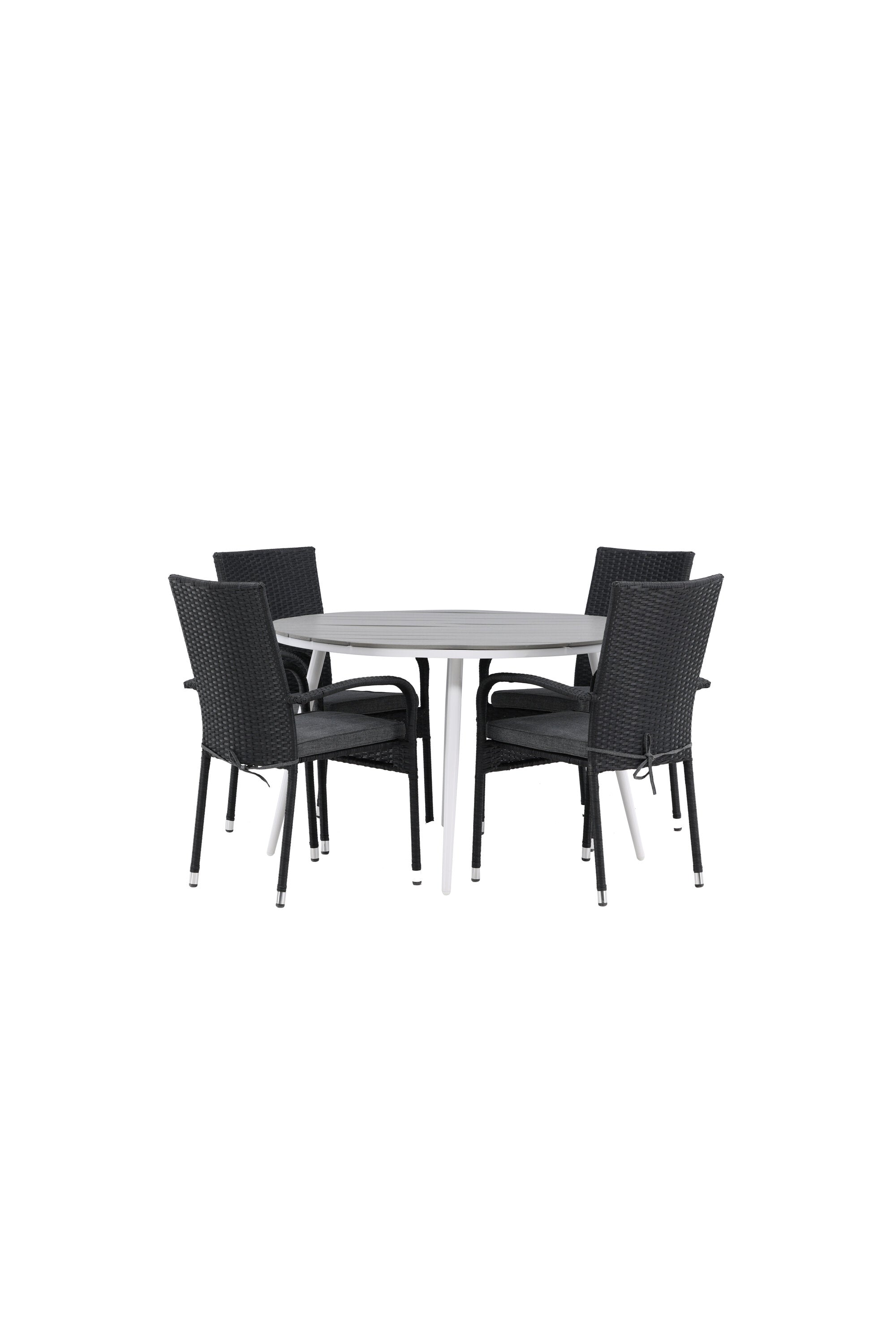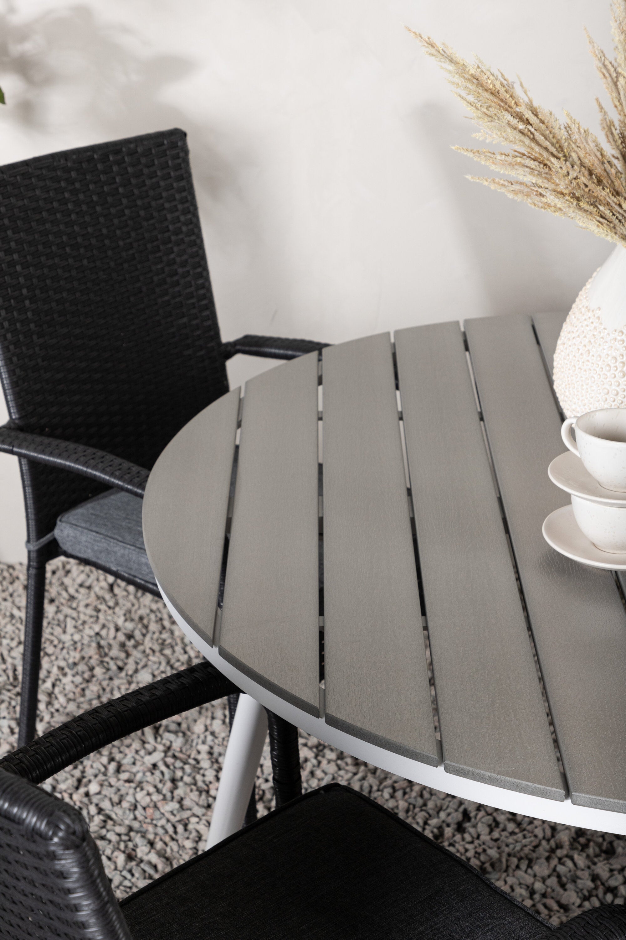 Pohodlně se usaďte v příjemné jídelní skupině, kde nikdo neriskuje, že se dostane na okraj! Jídelní stůl Break má klasický design s kulatou stolní deskou v šedé barvě Aintwood a lehce rozšířenými nohami z bílého hliníku. Rozměry: 120ø cm. Zde v moderní kombinaci s pohodlnými jídelními židlemi ze série Anna. Židle je vyrobena z umělého ratanu, má integrované područky, je stohovatelná a dodává se v lahodné černé barvě, kterou lze snadno sladit s dalším nábytkem. Připravte se letos v létě před nočním životem a vychutnejte si jídlo venku!